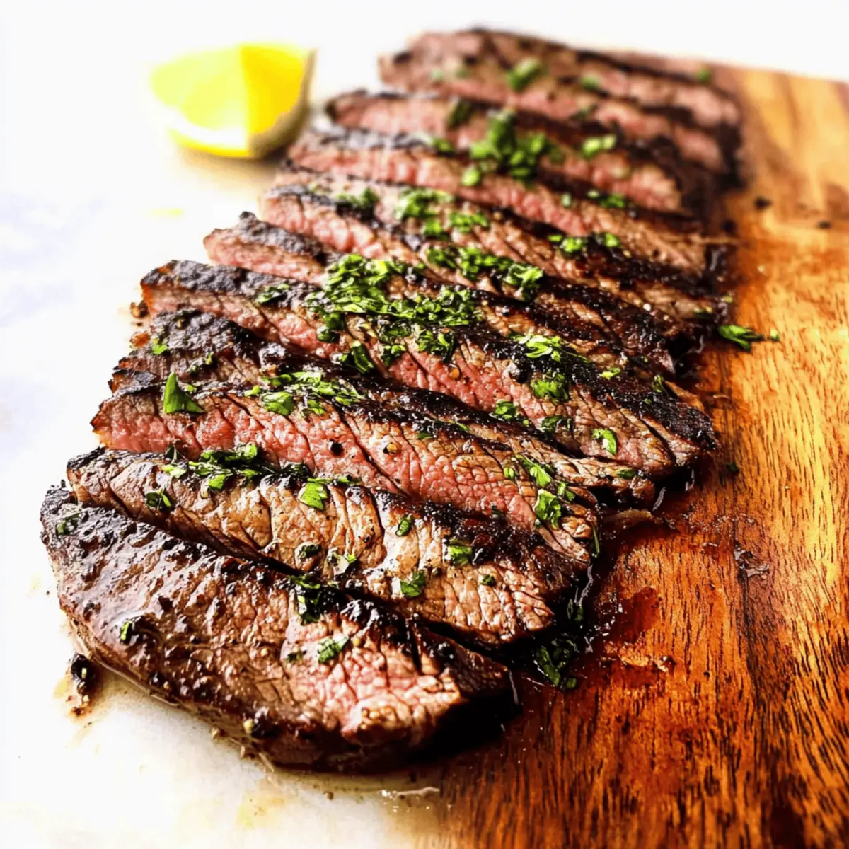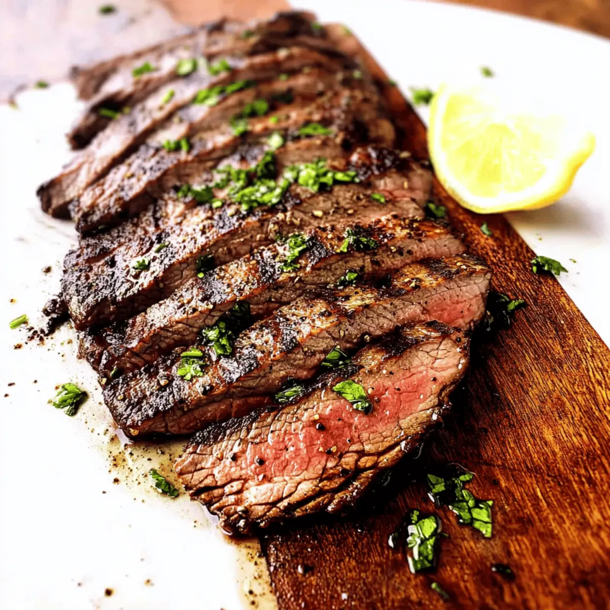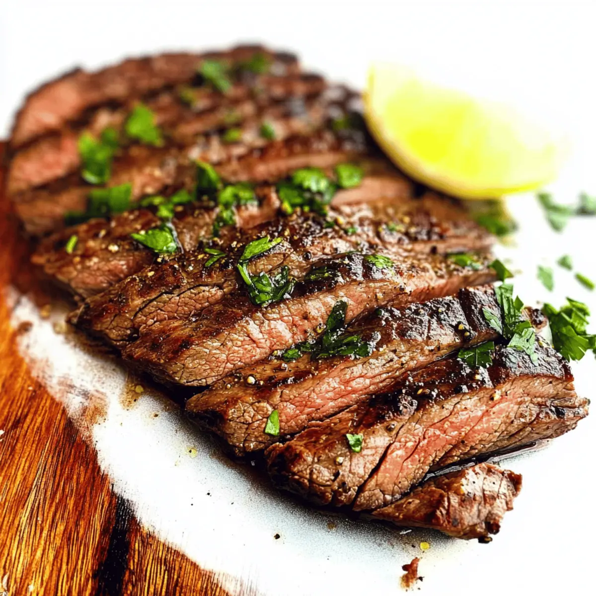 Jump to Recipe Print RecipeAs the sun warms the grill and fills the air with the enticing scent of sizzling meat, my stomach growls in anticipation. There’s nothing quite like enjoying a delectable homemade meal, especially when it’s a savory grilled flank steak that I can whip up in less than 30 minutes. With just a quick 5-minute prep, this protein-rich delight can be your go-to weeknight winner or an impressive centerpiece for your summer gatherings. The beauty of this recipe lies in its versatility—whether you choose to grill, broil, or cook it stovetop, the juicy, tender steak will surely satisfy your cravings. Ready to dive into a flavor-packed feast that requires little cleanup and makes even fast food seem lame? Let’s get grilling! Why is Grilled Flank Steak a Must-Try? Ease of Preparation: With just 5 minutes of prep, you can whip up a dish that looks and tastes gourmet! Flavor Explosion: The marinade combines sweet, tangy, and savory notes, resulting in a steak that bursts with taste in every bite. Cooking Flexibility: Whether grilling, broiling, or using a stovetop, this recipe fits seamlessly into your cooking style – endless possibilities await! Crowd-Pleasing Appeal: Serve it at summer cookouts or family dinners; it’s an impressive centerpiece that everyone will love! Healthy Choice: This protein-rich flank steak is not only delicious but also packed with essential nutrients—making it perfect for a balanced diet! Pair it with some roasted vegetables or a fresh salad for a complete meal, or try it in steak tacos for a fun twist! You won’t be disappointed! Grilled Flank Steak Ingredients For the Marinade • Flank Steak – A rich beefy flavor; aim for 1.5 – 2 pounds for optimal results. • Olive Oil – Adds moisture and tenderness; can substitute with canola or vegetable oil. • Reduced Sodium Soy Sauce – Brings umami and saltiness to the mix; feel free to use regular soy sauce if preferred. • Balsamic Vinegar – Provides acidity with a hint of sweetness; red wine vinegar makes a great alternative. • Lemon Juice – Brightens the marinade and tenderizes the meat; lime juice offers an exciting twist. • Brown Sugar – Balances the marinade with sweetness; white sugar works nicely in a pinch. • Worcestershire Sauce – Enhances depth of flavor and umami. • Dijon Mustard – Aids in emulsifying the marinade while adding extra flavor; switch to yellow mustard if needed. For the Seasonings • Onion Powder – Lends a sweet and savory profile; adjust according to taste. • Garlic Powder – An essential flavor booster; feel free to use fresh garlic instead for a punch. • Paprika – Imparts a mild smokiness; smoked paprika can heighten that depth. • Pepper – Adds a kick; switch to crushed red pepper flakes for a spicier touch. • Dill Weed – Offers a lovely herbaceous note; fresh dill can elevate the dish further. • Oregano – A classic seasoning that complements the marinade; Italian seasoning can be a substitute. • Rosemary – Its earthy flavor pairs beautifully with beef; thyme is a great alternative. • Ground Coriander – Adds a warm, citrusy tone; consider ground cumin for a different flavor depth. This Grilled Flank Steak recipe is bursting with flavor and sure to impress your guests or family! Step‑by‑Step Instructions for Savory Grilled Marinated Flank Steak Step 1: Marinate the Steak In a large Ziploc bag, whisk together the olive oil, reduced sodium soy sauce, balsamic vinegar, lemon juice, brown sugar, Worcestershire sauce, and Dijon mustard until well combined. Add your flank steak, ensuring it’s fully submerged in the marinade. Seal the bag, then refrigerate for 4 to 12 hours to allow the flavors to penetrate the meat. You can even give the bag a gentle massage every so often! Step 2: Prep for Cooking About 30 to 60 minutes before grilling your marinated flank steak, remove it from the refrigerator. This step helps the steak reach room temperature, promoting even cooking. While it rests, you’ll want to prepare your grill for the perfect sear—this method will ensure a beautifully juicy result! Step 3: Grill Preparation Preheat your grill over high heat for 10 to 15 minutes, allowing it to get super hot. As it heats up, clean the grill grates with a brush to remove any residue. For a non-stick finish, grease the grates with a paper towel soaked in oil—this promotes that delightful char and ensures easy flipping of your grilled flank steak. Step 4: Grilling the Steak Place the marinated flank steak directly on the preheated grill, covering it with the lid. Grill for 5–6 minutes on one side without moving it—this allows for those beautiful grill marks to form. Flip the steak just once using tongs, and grill it on the other side for an additional 5–6 minutes for a perfect medium doneness. Step 5: Check Doneness Using an instant-read thermometer, check the internal temperature of your grilled flank steak; aim for 145°F for medium doneness. If it’s not quite there, give it another minute or two on the grill. This step ensures you achieve that tender, juicy texture that makes flank steak such a treat! Step 6: Rest the Steak Once you’ve reached the desired doneness, remove the grilled flank steak from the grill and let it rest on a cutting board for 10 minutes. This resting period allows the juices to redistribute throughout the meat, ensuring each slice is as juicy and tender as possible. After resting, slice the steak against the grain for maximum tenderness. Expert Tips for Grilled Flank Steak Mind the Marinade: Limit marinating time to 4-12 hours; this prevents the meat from becoming mushy due to acidic ingredients. Temperature Matters: Always bring your flank steak to room temperature before grilling. This ensures even cooking and a deliciously juicy result. Flip with Care: Use tongs to flip the steak only once; this retains the juices. Avoid poking the meat with forks to keep all that flavorful 