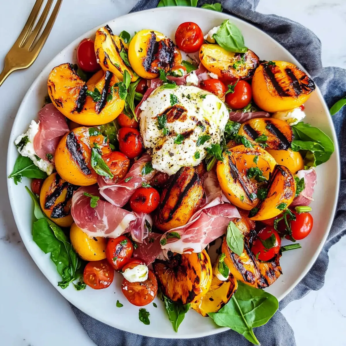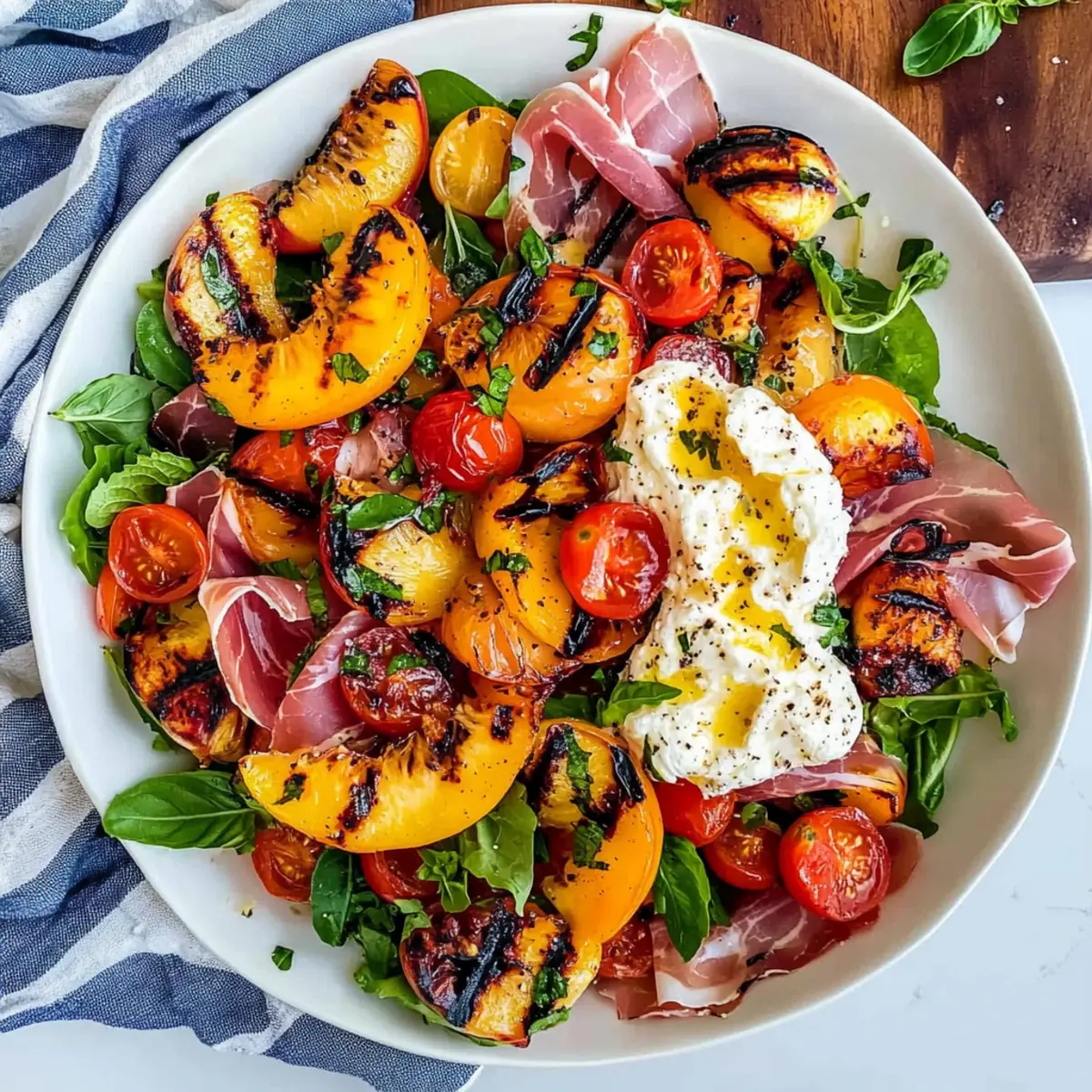 Jump to Recipe Print RecipeAs the grill warms and the sun hangs low, I can’t help but feel that a burst of summer is in the air. Enter the Grilled Nectarine Burrata Prosciutto Salad—a vibrant dish that captures the essence of the season. With beautifully charred nectarines mingling with creamy burrata and the savory touch of prosciutto, this salad is not just a feast for the eyes but also quick to whip up for any occasion. Whether you’re looking to impress guests or simply treat yourself to something refreshing, its blend of fresh ingredients and customizable options makes it a crowd-pleaser. And hey, if you’re leaning toward a vegetarian delight, feel free to skip the prosciutto—your taste buds will thank you! Ready to dive into sunny flavors that scream summer? Let’s discover how easy this delightful salad can be to create! Why is this salad a summer must-try? Vibrant flavors: This salad bursts with the freshness of summer, featuring juicy grilled nectarines that enhance every bite. Light and refreshing: Perfect for warm days, it keeps things breezy while satisfying your hunger. Quick prep: With minimal cooking time, you can go from grill to table in no time—ideal for spontaneous gatherings. Customizable options: Whether you’re adding grilled chicken for a heartier meal or opting for a vegetarian twist by skipping the prosciutto, the possibilities are endless! Perfect pairings: Enjoy alongside a chilled glass of white wine or sparkling water, and feel like you’re dining at a Mediterranean getaway. Dive into summer bliss with this Grilled Nectarine Burrata Prosciutto Salad that’s sure to impress! Grilled Nectarine Burrata Prosciutto Salad Ingredients • Dive into the fresh flavors of summer with this delicious salad! For the Salad Nectarines – Sweetness and juiciness that shine when grilled; peaches or plums can also be used for variation. Burrata Cheese – Creamy texture that enhances the salad’s richness; substitute with fresh mozzarella if needed. Prosciutto – Adds a salty depth to the dish; for a vegetarian option, skip this or use avocado instead. Cherry Tomatoes – Provides freshness and acidity; feel free to swap in any seasonal tomato variety. Heirloom Tomatoes – Adds vibrant color and flavor; regular tomatoes can work in a pinch. Fresh Cherries – Offers a sweet contrast to savory elements; optional and can be substituted with more tomatoes. Mixed Baby Spring Greens – A delightful fresh base; spinach or arugula can be great alternatives. For the Vinaigrette Lemon Juice & Zest – Brightens the flavors beautifully; lime can be a great substitute if desired. White Wine Vinegar – Contributes acidity; can replace with apple cider vinegar as needed. Extra Virgin Olive Oil – Binds the vinaigrette together; avocado oil is a good alternative. Salt & Black Pepper – Enhances the overall flavor; adjust according to taste preferences. For Garnish Fresh Herbs (Oregano, Mint, Lemon Thyme) – Adds aromatic notes that elevate the salad; use your favorite herbs for personalization. Get ready to savor this Grilled Nectarine Burrata Prosciutto Salad, crafted with the freshest ingredients for a memorable summer dish! Step‑by‑Step Instructions for Grilled Nectarine Burrata Prosciutto Salad Step 1: Preheat the Grill Begin by heating your grill or grill pan over medium-high heat, aiming for a temperature around 400°F. Allow it to preheat for about 10 minutes until it’s hot enough to create beautiful sear marks on your nectarines. This step is crucial for achieving that perfect char which elevates the flavor of the Grilled Nectarine Burrata Prosciutto Salad. Step 2: Prepare the Nectarines While the grill is heating, wash and dry your nectarines. Cut them in half, remove the pit, and then slice each half into quarters. Lightly brush the nectarines with extra virgin olive oil, ensuring they’re evenly coated. This oil will help them caramelize beautifully on the grill, adding to the overall taste of the salad. Step 3: Grill the Nectarines Carefully place the oiled nectarines on the grill grates. Grill each piece for 2-3 minutes on one side until nice grill marks appear. Flip and grill for an additional 2-3 minutes. You want them to be softer but still hold some structure; they should have a slight char. Once done, remove them from the grill and let them cool slightly. Step 4: Make the Vinaigrette In a medium-sized bowl, whisk together the fresh lemon juice and zest, white wine vinegar, and your choice of chopped fresh herbs like oregano and mint. Slowly drizzle in about 4 tablespoons of extra virgin olive oil while continuously whisking until combined. Season the vinaigrette with salt and black pepper to taste—this dressing will beautifully tie together the flavors in your Grilled Nectarine Burrata Prosciutto Salad. Step 5: Combine Salad Ingredients In a large serving bowl, add the mixed baby spring greens, halved cherry tomatoes, diced heirloom tomatoes, and any fresh cherries if using. Pour the freshly made vinaigrette over the salad base and gently toss everything together until each component is well-dressed and evenly distributed. This mixture will provide a vibrant and fresh foundation for your salad. Step 6: Assemble the Salad Now it’s time to create the masterpiece! Gently place the grilled nectarines on top of the salad. Tear pieces of burrata cheese and distribute them across the greens, followed by shavings of prosciutto. For added presentation, sprinkle the salad with more fresh herbs and an extra pinch of black pepper, inviting guests to dig into your Grilled Nectarine Burrata Prosciutto Salad. Step 7: Serve and Enjoy For an extra treat, consider serving your salad alongside some lightly grilled baguette slices. This Grilled Nectarine Burrata Prosciutto Salad is best enjoyed fresh, so dig in and delight in the flavors of summer while they’re at their peak! Expert Tips for Grilled Nectarine Burrata Prosciutto Salad Choose Firm Nectarines