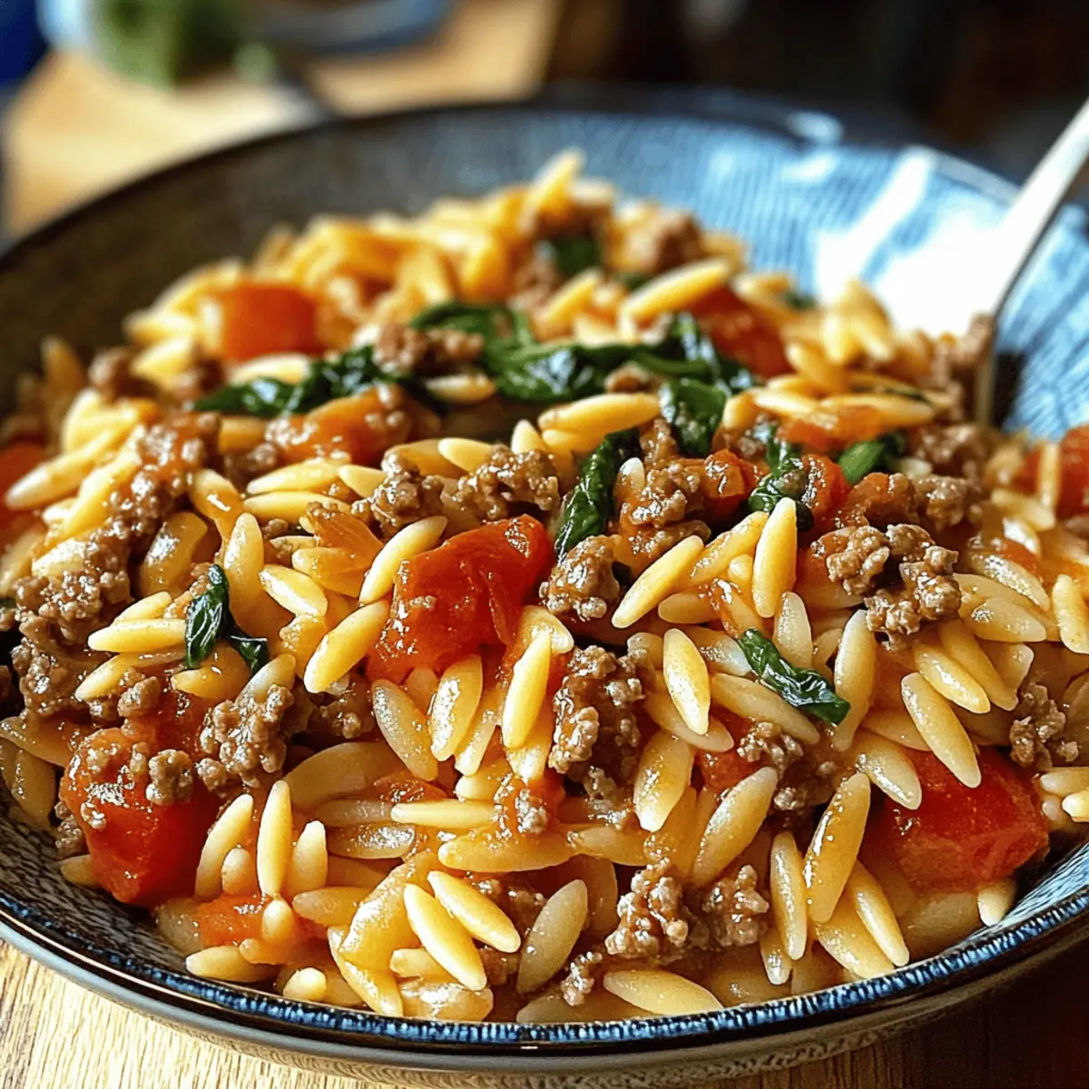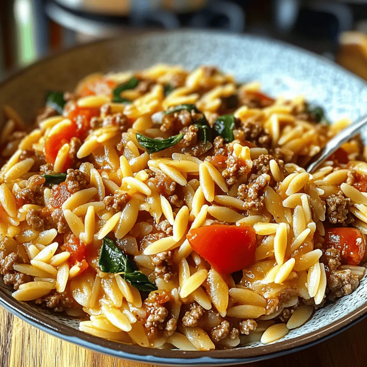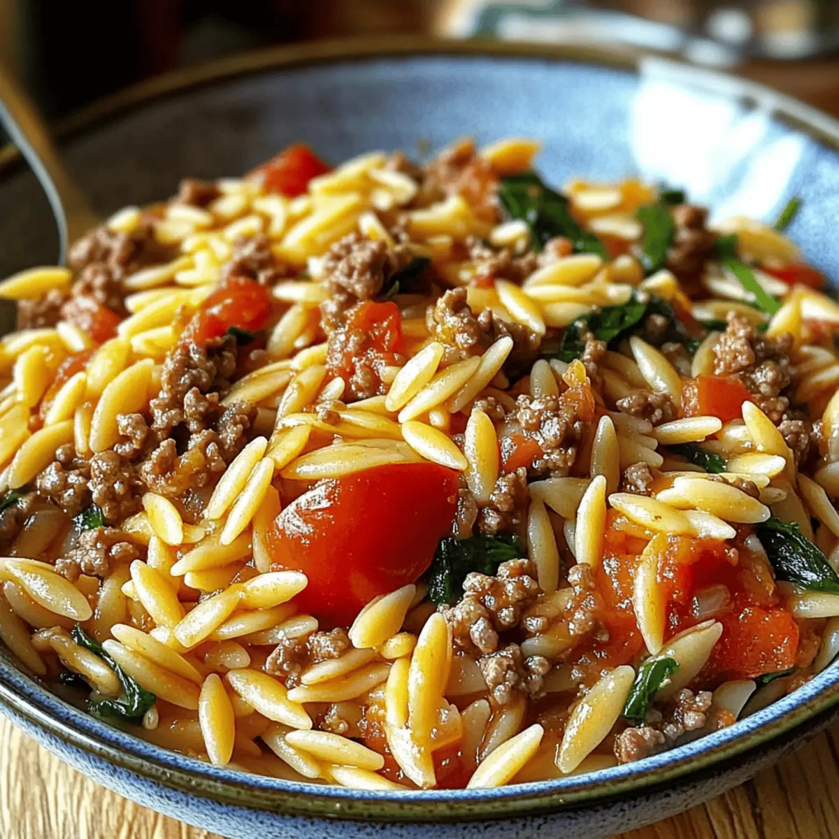 Jump to Recipe Print RecipeAs I stood in my kitchen, the aroma of sizzling garlic and onions filled the air, reminding me of family dinners from my childhood. That’s the magic of this Ground Beef Orzo recipe—it wraps you in warmth like a favorite memory. This delightful one-pan dish merges tender orzo pasta with savory ground beef in a rich, aromatic sauce, creating a comforting meal perfect for a busy weeknight. Not only is it quick to whip up, but it’s also endlessly customizable, allowing you to toss in whatever veggies or spices you have on hand. Whether you’re a seasoned chef or a kitchen novice, this recipe guarantees maximum satisfaction with minimal fuss. Curious about how to bring this delicious comfort food to life? Let’s dive into the details! Why is Ground Beef Orzo a Must-Try? One-Pan Wonder: This recipe simplifies dinner prep, combining everything in one pan for easy clean-up. Rich, Savory Flavor: The blend of savory beef, aromatic garlic, and fresh spinach creates a satisfying flavor profile that’s hard to resist. Customizable Comfort: Whether you prefer a classic taste or a twist, you can easily customize it with any vegetables, like zucchini or bell peppers, or try using ground turkey for a lighter meal. Time-Saving Option: Ready in just around 30 minutes, this dish eliminates the stress of midweek cooking, making it an ideal choice for busy families. Crowd-Pleasing Satisfaction: Perfect for family dinners, it’s a dish that guarantees smiles and full bellies, reminiscent of your favorite comfort foods like Beef Stew Hearty and BBQ Beef Tacos. Enjoy the glorious blend of comfort and convenience! Ground Beef Orzo Ingredients For the Beef Mixture • Lean Ground Beef – Primary protein source; feel free to swap with ground turkey or chicken for a lighter option. • Medium Onion – Adds sweetness and aroma; finely chopped ensures even cooking. • Garlic (3 cloves) – Enhances flavor with its distinct taste; mince for best release of oils. For the Pasta Base • Orzo Pasta – Provides heartiness to the dish; any small pasta shape like ditalini can be substituted. • Canned Diced Tomatoes (14.5 oz) – Adds acidity and moisture; try fire-roasted ones for a smoky flavor. • Low-Sodium Beef Broth (2 cups) – Forms the base liquid for cooking; substitute with vegetable broth for a vegetarian version. For the Greens and Seasoning • Fresh Spinach (2 cups) – Adds nutrients and color; kale or other greens work as alternatives. • Italian Seasoning (1 tsp) – Infuses the dish with traditional herb flavors; adjust based on your preference. For a delightful and comforting meal, these Ground Beef Orzo ingredients set the stage for a delicious one-pan dish that your whole family will love! Step‑by‑Step Instructions for Ground Beef Orzo Step 1: Prep Ingredients Begin by gathering and prepping your ingredients for the Ground Beef Orzo. Finely chop one medium onion and mince three cloves of garlic. This preparation will enhance the dish’s aroma and flavor, making it easier to assemble everything as you cook. Have all your ingredients ready and within reach for a smooth cooking experience. Step 2: Sauté Aromatics In a large skillet, heat two tablespoons of olive oil over medium heat. Once the oil shimmers, add the chopped onion and sauté for about five minutes, stirring occasionally, until the onion becomes translucent and fragrant. This step sets a flavorful base for your Ground Beef Orzo, adding depth to the dish. Step 3: Brown Ground Beef Add one pound of lean ground beef to the skillet, breaking it up with a wooden spoon. Season with salt and pepper, then cook for about 6-8 minutes until the beef is evenly browned and fully cooked. The rich color and sizzling sound will indicate that your beef is ready to meld with the other flavors. Step 4: Combine Garlic and Tomatoes Stir in the minced garlic and a 14.5-ounce can of diced tomatoes (including their juices) to the beef mixture. Let this simmer for 2-3 minutes, allowing the aroma to fill your kitchen and the flavors to combine. You’ll know it’s ready when the garlic is fragrant and the mixture is slightly thickened. Step 5: Cook Orzo Pour in 2 cups of low-sodium beef broth and add 1 cup of orzo pasta to the skillet. Increase the heat to bring everything to a boil, then reduce it to a gentle simmer. Cook uncovered for about 10-12 minutes, stirring occasionally, until the orzo absorbs most of the liquid and becomes tender. Step 6: Add Greens and Seasoning In the final step of your Ground Beef Orzo, stir in 2 cups of fresh spinach along with 1 teaspoon of Italian seasoning. Cook for approximately one minute until the spinach wilts down and the flavors meld beautifully. The vibrant color will enhance the dish, making it not only delicious but visually appealing too. What to Serve with Comforting Ground Beef Orzo A warm bowl of Ground Beef Orzo is just the beginning of a delightful meal experience, one that you can share with loved ones. Garlic Bread: A crispy, buttery slice of garlic bread adds a delightful crunch that pairs beautifully with the creamy orzo. Mixed Green Salad: A refreshing salad dressed in lemon vinaigrette balances the hearty flavors of the orzo, offering a crisp contrast. Roasted Vegetables: Seasonal roasted vegetables bring a sweet, caramelized element, adding color and nutrition that complements the dish perfectly. Parmesan Cheese: A generous sprinkle of freshly grated Parmesan brings a touch of savory richness, enhancing each bite and elevating the meal experience. Red Wine: A glass of full-bodied red wine, like Cabernet Sauvignon, adds depth and warmth, making it a perfect companion to savor alongside your comforting dish. Chocolate Mousse: End your meal on a sweet note with a silky chocolate mousse, providing a light yet indulgent finish to a cozy dinner. Expert Tips for Ground Beef Orzo Brown Beef Right: Properly browning the ground beef enhances flavor. Avoid overcrowding the p