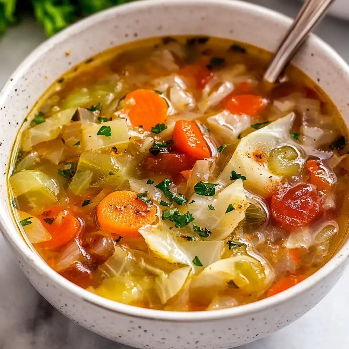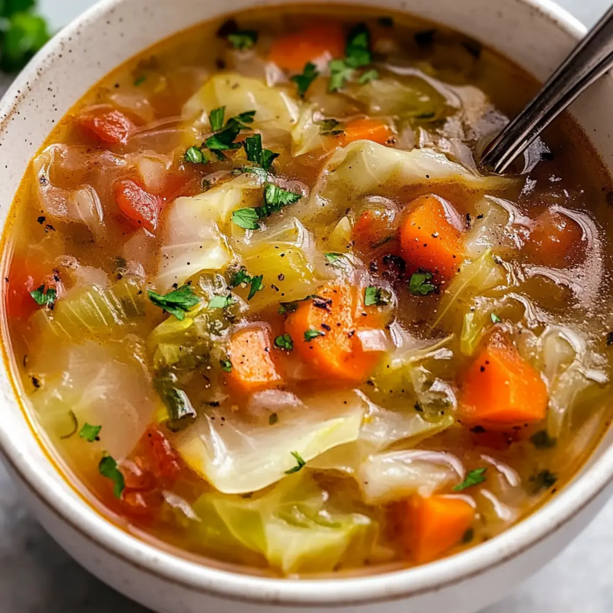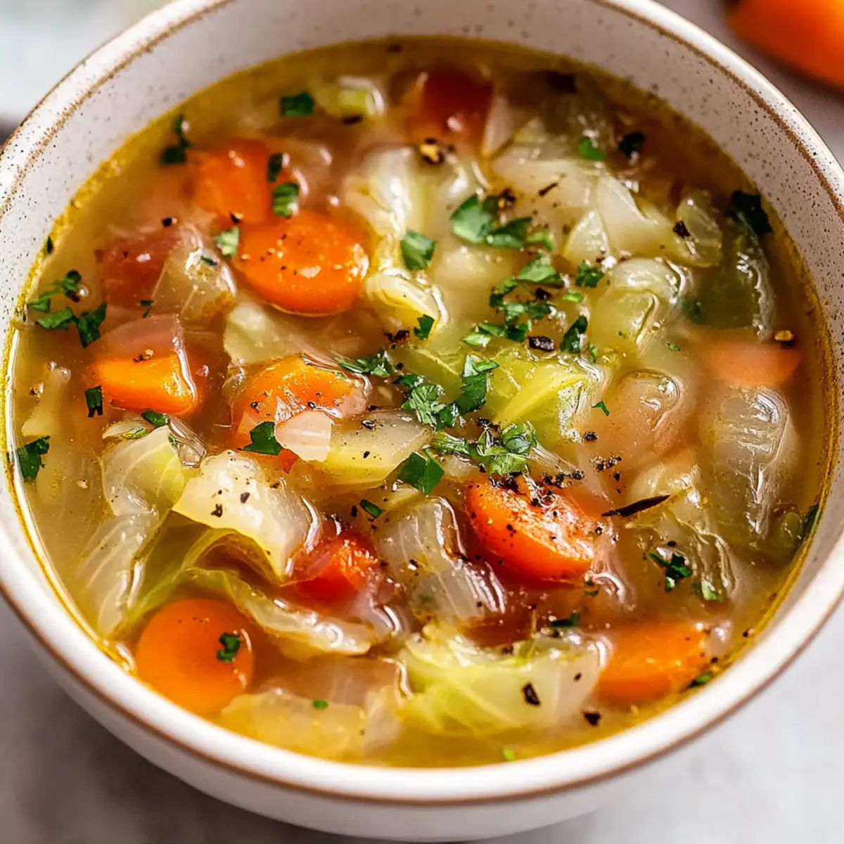 Jump to Recipe Print RecipeAs I diced the vibrant green cabbage, a familiar warmth swept through my kitchen, inviting me to embrace comfort in a bowl. This Gut-Healing Cabbage Soup is my go-to remedy for those hectic weeks when my body craves a reset. Packed with healing ingredients and aromatic spices, this soup not only supports gut health but also tantalizes the senses, making it a winning recipe. What I love most is how quickly it comes together, making it perfect for busy weeknights—and it’s incredibly budget-friendly, too! Whether you’re looking to nourish your body or simply huddle up with a soothing bowl of goodness, this recipe offers endless possibilities for customization. Curious about how this cozy dish could become your latest kitchen favorite? Let’s dive in! Why is Gut-Healing Cabbage Soup a Must-Try? Nutritious and Healing: This soup is packed with gut-friendly ingredients that promote digestive health. Quick Preparation: With straightforward steps, you can whip this up in no time, perfect for those busy weeknights. Budget-Friendly: Using simple, seasonal produce, this dish keeps your wallet happy while feeding your body right. Endless Customization: Feel free to add your favorite proteins or spices, like lentils or cumin, allowing it to fit your personal taste. Cozy Comfort: Each bowl is a warm hug on a chilly day, making it a fail-proof choice for comfort food. I love pairing it with a slice of fresh bread or some Roasted Cauliflower Soup for a complete meal! Gut-Healing Cabbage Soup Ingredients For the Soup Base • Olive Oil – Perfect for sautéing and infusing flavor; can be swapped with any neutral oil if needed. • Onion – Adds depth and sweetness; shallots or leeks can be used as a substitute. • Celery – Offers a crunchy texture and aromatic foundation; can be omitted if unavailable. • Carrots – Provides natural sweetness and nutrition; replace with parsnips for a twist. • Garlic – Enhances overall flavor with aromatic notes; fresh ginger can be used for a zing. • Ginger – Gives a warming spice; consider fresh turmeric for additional anti-inflammatory benefits. • Turmeric Powder – Brings vibrant color and health perks; fresh turmeric can be an alternative if available. • Paprika – Adds warmth and spice depth; smoked paprika is great for extra flavor complexity. • Fresh Thyme – Contributes herbal notes; dried thyme makes a great substitute. • Salt & Pepper – Essential for seasoning; adjust to your own taste preferences. • Cabbage (Green or Red) – The star of the dish, rich in fiber and vitamins; green cabbage offers a classic taste, while red adds color variation. • Low-Sodium Vegetable or Bone Broth – Provides the soup’s rich base; use according to dietary preference. • Lemon Juice or Apple Cider Vinegar – Adds a zesty brightness; vinegar is ideal for those who prefer a tangy burst. • Tomatoes (Optional) – Adds acidity and richness; feel free to omit if your stomach prefers simplicity. For Protein Add-Ins (Optional) • Shredded Chicken – A hearty option to enrich the soup; rotisserie chicken works perfectly. • Lentils – Plant-based protein that adds nutrition; great for a vegetarian twist. • White Beans – Enhance the soup with fiber and creaminess; they complement cabbage beautifully. This Gut-Healing Cabbage Soup not only nourishes your body but also warms your soul! Customize it to suit your preferences and enjoy the delicious benefits of this cozy dish. Step‑by‑Step Instructions for Gut-Healing Cabbage Soup Step 1: Sauté the Vegetables In a large pot, heat 2 tablespoons of olive oil over medium heat. Once shimmering, add 1 chopped onion, 2 diced celery stalks, and 2 sliced carrots. Sauté these vegetables for about 5 minutes, stirring occasionally, until the onions become translucent and fragrant. Step 2: Add Aromatics To the softened vegetables, add 3 minced garlic cloves and 1 tablespoon of freshly minced ginger. Cook these aromatics for another minute, stirring constantly to prevent browning. You’ll know they’re ready when the kitchen fills with a warm, inviting aroma. Step 3: Stir in the Spices Now, sprinkle in 1 teaspoon of turmeric powder, 1 teaspoon of paprika, and a teaspoon of fresh thyme along with salt and pepper to taste. Stir the spices in for about 1 minute, allowing them to bloom and infuse the mixture with their rich flavors, turning the vegetables a warming hue. Step 4: Add Cabbage and Broth Gently fold in half of a shredded green or red cabbage, mixing it well with the sautéed vegetables. Pour in 6 cups of low-sodium vegetable or bone broth, then bring the mixture to a simmer over medium-high heat. Look for small bubbles forming on the surface to indicate it’s nearly boiling. Step 5: Simmer Until Tender Add the remaining cabbage and any optional chopped tomatoes to the pot, then reduce the heat to low. Let the soup simmer gently for 20-25 minutes, stirring occasionally, until the cabbage is tender but still holds its shape—this creates a hearty Gut-Healing Cabbage Soup full of vibrant texture. Step 6: Finish with Brightness Just before serving, squeeze in the juice of half a lemon or add a splash of apple cider vinegar. This step brightens up the flavors beautifully. Taste your soup and adjust the seasoning with more salt and pepper as desired, ensuring every bowl is perfectly balanced! What to Serve with Gut-Healing Cabbage Soup? Warm up your dining experience with comforting side dishes that beautifully complement the soothing flavors of this cozy bowl. Crusty Bread: Perfect for dipping, a warm, homemade loaf adds a delightful crunch that contrasts with the softness of the soup. Fresh Green Salad: A light, crisp salad with a citrus vinaigrette balances the soup’s warmth, offering refreshing flavors to your meal. Roasted Vegetables: Root vegetables roasted until caramelized bring a savory element that pairs wonderfully with the soup’s flavors. Carrots 