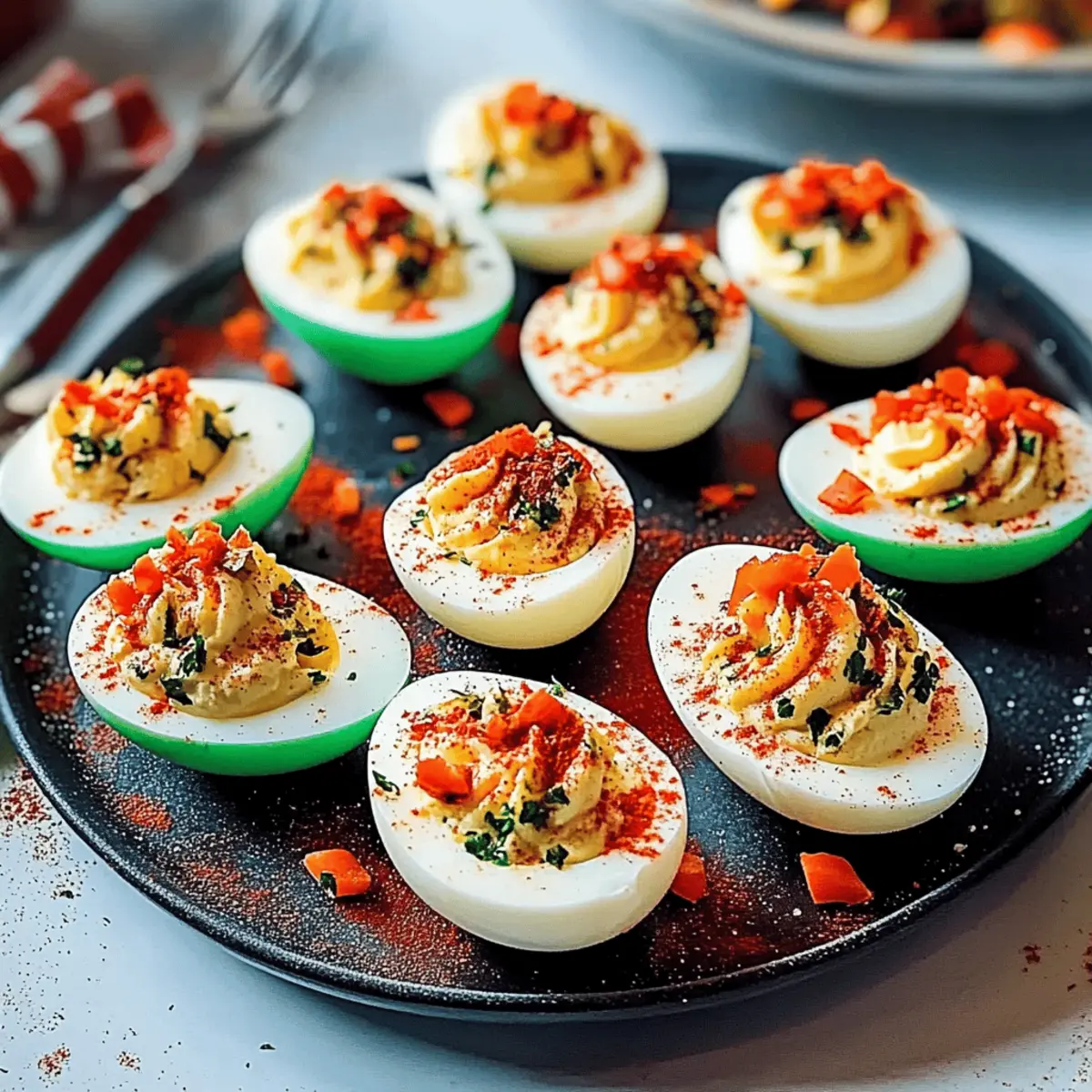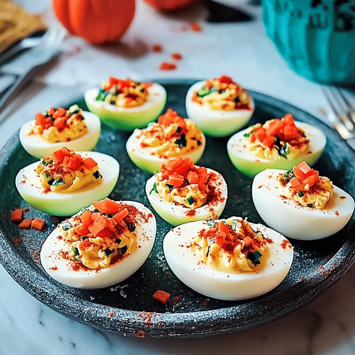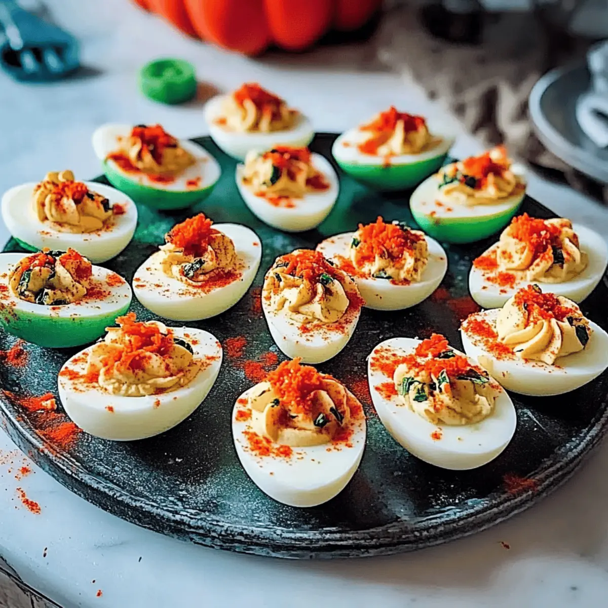 Jump to Recipe Print RecipeThe kitchen echoes with laughter as I pull out the vibrant Halloween devilled eggs, ready to dazzle my family and friends. These colorful treats are not just a feast for the eyes; they elevate the classic devilled egg to a spooktacular level that everyone can enjoy. With a creamy filling of mayonnaise blended with crunchy red pepper, they’re surprisingly easy to whip up and make for a show-stopping centerpiece at any Halloween gathering. Plus, they’re vegetarian-friendly, making them a perfect choice for guests with various dietary preferences. Why settle for boring snacks when you can create something so fun and festive? Are you ready to discover the secret to making these eye-catching Halloween devilled eggs? Why Will You Love These Halloween Devilled Eggs? Festive Fun: These Halloween devilled eggs take a classic dish and turn it into a visually stunning centerpiece for your celebrations. Easy to Make: The recipe is simple, making it perfect for cooks of all skill levels. In no time, you’ll be adding a colorful flair to your table. Crowd-Pleasing Appeal: With a creamy, tangy filling and crunchy red pepper, they cater to both kids and adults alike, ensuring no one can resist. Versatile Options: Customize them with spices or alternative fillings like Greek yogurt for a healthier twist; they’re made to suit your taste. Make-Ahead Magic: Prepare the egg whites and filling a day in advance! This time-saving tip lets you enjoy more moments with your guests. Perfect Presentation: Serve them chilled on a festive platter with vibrant herbs for an Instagram-worthy addition to your Halloween spread. Dive into these spooktacular devilled eggs and watch the smiles multiply! Halloween Devilled Eggs Ingredients Get ready to create some spooky bites! For the Eggs Large eggs – Provide the base and protein for these delightful devilled eggs. Vinegar – Helps set the dye on the eggs and adds a slight tang; use 1 tablespoon per dye bowl. For the Dye Bath Food coloring – Adds a festive and colorful touch; opt for red, orange, green, or black for a spooky effect. For the Filling Mayonnaise – Creates a rich and creamy filling; adjust the quantity based on egg size for your preferred creaminess. Red pepper – Add a crunch and a mild sweetness to the filling; finely chop to ensure even distribution. Tarragon (optional) – Offers a fresh herbal note; feel free to omit it if you’re not a fan. Paprika – Sprinkles a hint of flavor and color on top; use smoked paprika for a deeper taste if desired. Imagine delighting your guests with these vibrant Halloween devilled eggs that are not only a feast for the eyes but also packed with flavor! Step‑by‑Step Instructions for Halloween Devilled Eggs Step 1: Boil Eggs Begin by placing your large eggs in a pot, ensuring they’re covered with water by about 2 cm. Bring the water to a lively boil over medium-high heat, then cover the pot with a lid and remove it from the heat. Let the eggs sit for 12 minutes to perfect the hard-boiled texture, then drain the hot water and cool the eggs in a bowl filled with ice-cold water. Step 2: Prepare Colouring Bath While the eggs cool, set up your dye stations by mixing 1 teaspoon of your chosen food coloring in separate bowls filled with 700 ml of water and 1 tablespoon of vinegar each. Stir well until the color is vibrant and well-distributed. This step adds a spooky flair to your Halloween devilled eggs, so feel free to get creative with the colors. Step 3: Stain Eggs Gently crack the cooled eggshells by tapping them with a spoon, creating small fissures without removing the shells. Submerge the eggs in the prepared coloring baths, allowing them to soak for at least 3 hours for deep saturation. For best results, turn the eggs every hour to ensure even coloring, or leave them overnight for a more intense hue. Step 4: Make Filling Once your eggs have soaked, peel them carefully and slice each egg in half lengthwise. Scoop the yolks into a mixing bowl, then add your creamy mayonnaise, finely chopped red pepper, and optional tarragon. Blend these ingredients together until the mixture is smooth and creamy, adjusting the mayonnaise until you achieve your desired consistency for your Halloween devilled eggs. Step 5: Assemble Now comes the fun part! Use a piping bag or a small spoon to fill the hollowed-out egg whites with your yolk mixture. Take your time to create a nice mound in each egg half. Finish off your masterpiece by sprinkling paprika over each filled egg and adding any remaining diced red pepper as a festive garnish, enhancing the visual appeal of your Halloween devilled eggs. What to Serve with Spooktacular Halloween Devilled Eggs? Create a memorable Halloween feast with these delicious and playful egg bites as your centerpiece. Crispy Spinach Salad: A refreshing salad with crispy spinach and a tangy vinaigrette perfectly balances the creamy texture of the eggs. Enjoy the vibrant greens, as they brighten up the table and provide a delightful crunch alongside your spooky spread. Cheesy Garlic Breadsticks: Soft, doughy breadsticks with garlic and melted cheese add warmth and comfort, enticing guests with every bite. Pairing these with the devilled eggs creates a homely feast that’s congenial and inviting, perfect for sharing and indulging. Roasted Vegetable Platter: Seasonal roasted vegetables like carrots, bell peppers, and Brussels sprouts bring earthy flavors that complement the eggs. Their natural sweetness will contrast beautifully with the savory filling, enhancing the overall taste experience. Mini Pumpkin Soup Shots: Serve warm servings of creamy pumpkin soup in shooter glasses for a festive touch. The smoothness of the soup adds a comforting element that guests will appreciate, especially in the chill of autumn. Spicy Potato Wedges: Crispy, golden potato wedges seasoned with a hint of spice offer a satisfying crunch alongside the ghostly devilled eggs. This combo provi