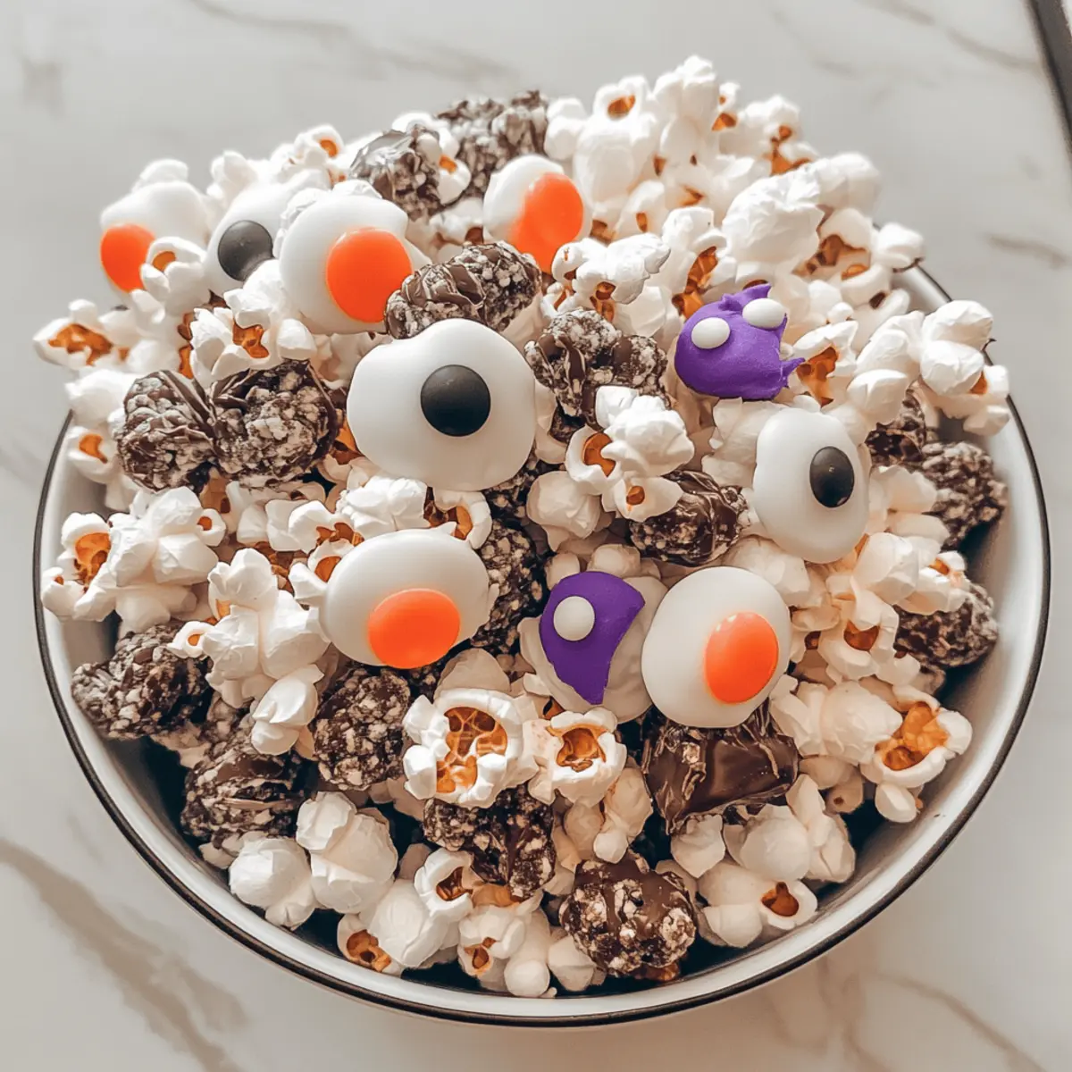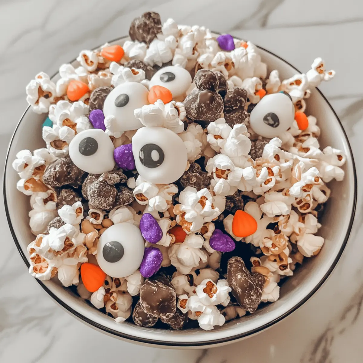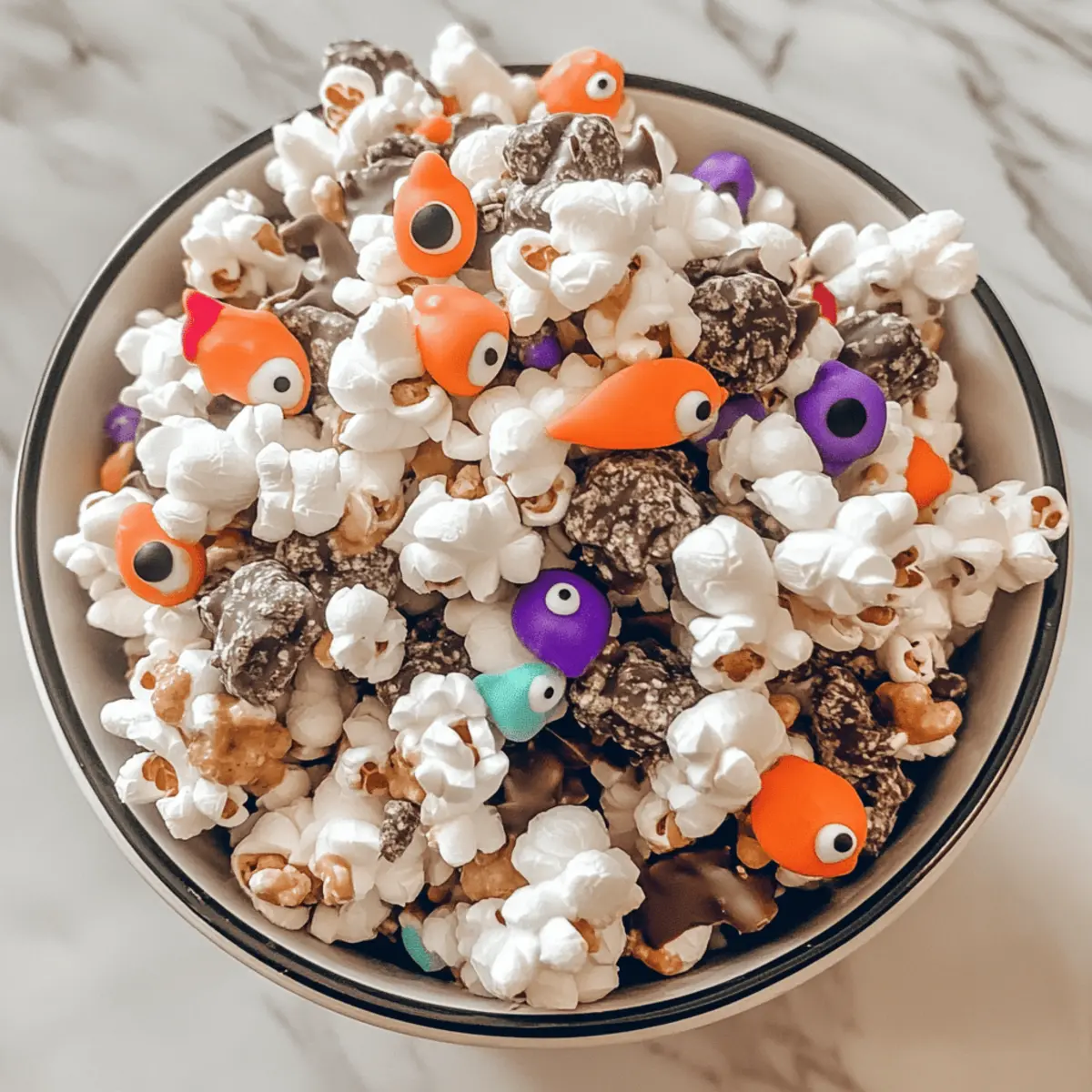 Jump to Recipe Print RecipeAs I stood in my kitchen, the aroma of melted chocolate and peanut butter filled the air, instantly transporting me back to my childhood. I couldn’t help but smile knowing that I was about to whip up a batch of Halloween Muddy Buddies Popcorn Mix—a fun and festive concoction that’s sure to delight both kids and adults alike. This delightful snack, with its perfect crunch and creamy sweetness, is not only quick to prepare but also encourages a little family bonding in the process. Plus, you can easily swap in healthier ingredients, making it the ideal treat for those who want a guilt-free indulgence. Want to learn how to make this wickedly delicious mix that promises to be the star of your next movie night or Halloween gathering? Let’s dive in! Why is this Halloween Snack a Must-Try? Festive Fun: This Halloween Muddy Buddies Popcorn Mix is a playful treat that brings festive spirit to any gathering, making it perfect for parties or cozy movie nights. Easy to Make: With just a few simple steps, you can whip up a delicious snack that even the kids can help with, turning cooking into a fun family activity. Healthy Adaptations: Want to make it a bit healthier? You can easily substitute with natural peanut butter or dark chocolate, allowing for guilt-free indulgence. Crowd-Pleasing Delight: The irresistible combination of popcorn, chocolate, and peanut butter guarantees to please everyone, from kids to adults, making it an ideal snack for any gathering. Versatile Treat: Customize the mix with your favorite candies or sprinkles; it’s perfect for other holidays too—just change the decorations! Check out our tips on healthy substitutions to keep it nutritious. Elevate your next Halloween celebration with this delightful treat that combines nostalgia and excitement, making for memorable moments shared with loved ones! Halloween Muddy Buddies Popcorn Mix Ingredients • To create this ghoulishly delightful snack, gather the following ingredients to ensure your Halloween Muddy Buddies Popcorn Mix turns out perfectly! For the Popcorn Mix Chex Cereal – A sturdy base for your mix; any variety works perfectly. Popcorn – The crunchy star of the show; pop your own for freshness or use a pre-popped kind like Skinny Pop. For the Coating Peanut Butter – Adds a creamy, nutty flavor; choose natural for a healthier twist. Chocolate Chips – Essential for sweetness; opt for high-quality brands like Ghirardelli for richer flavor. White Chocolate Chips / Almond Bark – Drizzle on top for added sweetness and visual appeal; Ghirardelli is a fantastic choice. Butter – Enhances flavor and helps your chocolate melt smoothly; using grass-fed butter is a great health-conscious swap. For the Sweetness Powdered Sugar – Coats the mix in sweetness; organic brands elevate your treats’ quality. For the Fun Garnish Eye Sprinkles – Perfect for Halloween aesthetics, adding a playful decoration to your mix. Candy Coated Chocolate / Reese’s Pieces – Optional but fun—these add an extra pop of sweetness. With these delectable ingredients, you’re ready to impress friends and family with your Halloween Muddy Buddies Popcorn Mix! Step‑by‑Step Instructions for Halloween Muddy Buddies Popcorn Mix Step 1: Prepare the Popcorn Begin by popping your popcorn according to the package instructions or using an air popper for a healthier option. Aim for about 8 cups of light, fluffy popcorn that’s free of unpopped kernels. Once popped, place the popcorn in a large mixing bowl and set it aside, allowing it to cool slightly, which will help with blending later. Step 2: Mix the Chex Cereal In a separate large bowl, pour in 6 cups of Chex cereal, ensuring you gently break apart any clumps for an even coating later. This will be the base for your Halloween Muddy Buddies Popcorn Mix. It’s important to use a sturdy cereal variety, as it will hold up against the additions of melted chocolate and coatings. Step 3: Melt the Chocolate and Peanut Butter In a microwave-safe bowl, combine 1 cup of chocolate chips and 1/2 cup of peanut butter. Microwave the mixture in 30-second intervals, stirring in between until both the chocolate and peanut butter are completely melted and smooth, which usually takes about 1 to 1.5 minutes. This delicious blend creates the gooey base for your mix. Step 4: Coat the Cereal Pour the melted chocolate-peanut butter mixture over the Chex cereal and gently fold using a spatula until all the pieces are well-coated. This process should take about 2-3 minutes, ensuring an even and luscious coating that will make your Halloween Muddy Buddies Popcorn Mix incredibly tasty. Step 5: Add Powdered Sugar Transfer the coated cereal to a large resealable bag, adding 1-2 cups of powdered sugar. Seal the bag tightly, then shake it vigorously for about 30 seconds to 1 minute, allowing the sugar to coat all the cereal. This step adds a delightful sweetness and makes the mixture wonderfully festive. Step 6: Combine with Popcorn In your large bowl, gently combine the powdered sugar-coated Chex cereal with the popped popcorn. Use a large spatula to fold them together carefully, ensuring each kernel of popcorn gets a sprinkle of that sweet coating. This mixture will provide a lovely crunch to your Halloween Muddy Buddies Popcorn Mix. Step 7: Drizzle with White Chocolate Melt 1 cup of white chocolate chips or almond bark using the same method as before. Once melted and smooth, drizzle the white chocolate over the popcorn and Chex mixture, allowing it to create a beautiful design. A light drizzle should take about 1-2 minutes, and you’ll want to work quickly before the chocolate sets. Step 8: Add Decorations Immediately sprinkle your Halloween mix with eye sprinkles and additional candy-coated chocolates or Reese’s Pieces if desired. Do this while the white chocolate is still gooey, as this helps the decorations stick nicely to your Halloween Muddy Buddies Popcorn Mix, adding to it