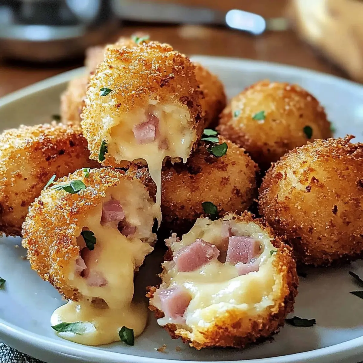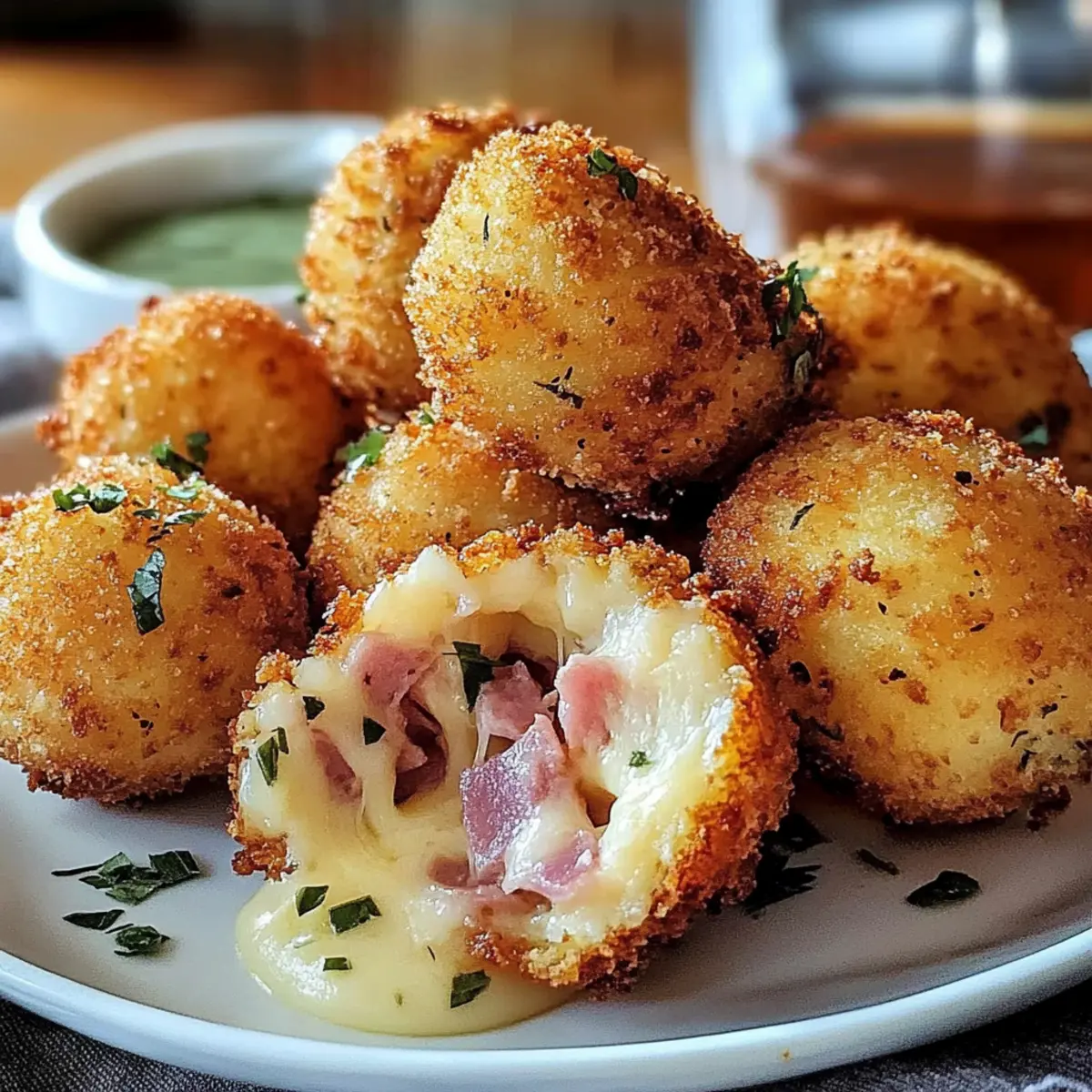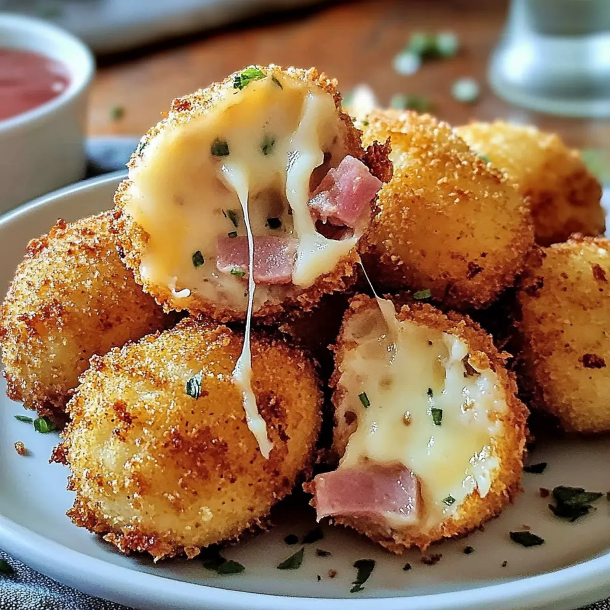 Jump to Recipe Print RecipeAmid the hustle of daily life, there’s something undeniably satisfying about creating a perfect bite of comfort. Enter my Crispy Halal Ham and Cheese Croquettes—a delightful fusion of golden, crunchy exterior and a creamy, cheesy center that makes every crunch a celebration. By using Halal chicken or turkey ham, this recipe ensures everyone can enjoy it, making it a wonderful addition to parties or family gatherings. These croquettes are not only a crowd-pleaser but also quick to prepare, freeing you up to savor moments with loved ones. As you dive into this irresistible treat, you’ll discover a world of flavor and texture that might just become your new favorite homemade snack. Ready to impress your friends and family with this delicious creation? Let’s get cooking! Why are these croquettes a must-try? Crispy Goodness: Each croquette features a perfectly golden-brown crust that delivers a satisfying crunch. Creamy Center: Loaded with gooey cheese and savory Halal ham, they make for an indulgent snack. Quick Prep: Ready in under an hour, these delights are ideal for busy weeknights or surprise guests. Versatile Flavors: Feel free to experiment with different cheeses or spices to create variations that suit every palate. Crowd Pleaser: Whether at a party or family dinner, these croquettes are bound to impress your guests, just like my Blackberry Cream Cheese or Grilled Cheese Burrito! Ham and Cheese Croquettes Ingredients These Croquettes promise flavor and satisfaction with every single bite! For the Filling Cooked Halal Chicken or Turkey Ham – Add a savory kick that pairs perfectly with the cheese; any cooked ham works if Halal isn’t a concern. Grated Cheese (cheddar, mozzarella, or blend) – This ingredient provides the gooey, melty core; feel free to mix cheeses according to your taste. Unsalted Butter – Essential for creating a smooth roux that enriches the filling. All-Purpose Flour – Used for both the roux and dredging, it adds structure and that irresistible crunch. Milk (whole recommended) – Creates a wonderfully creamy filling; plant-based milk can be used for a dairy-free alternative. Mustard Powder (optional) – Adds a subtle depth of flavor; omit for a milder taste. Salt and Pepper – Essential seasonings to enhance the overall taste. Nutmeg (optional) – Provides an aromatic touch to the filling if desired. For the Coating Eggs – Acts as a binder to keep breadcrumbs adhered to the croquettes. Breadcrumbs (preferably panko) – Creates a perfectly crunchy texture; regular breadcrumbs will do in a pinch. For Frying Vegetable Oil – Needed for frying to achieve that deliciously crispy exterior on your Ham and Cheese Croquettes. Step‑by‑Step Instructions for Crispy Halal Ham and Cheese Croquettes Step 1: Prepare Ingredients Start by finely chopping the cooked Halal chicken or turkey ham and grating your choice of cheese, such as cheddar or mozzarella. Set these aside while you gather your other ingredients. This preparation is crucial for a smooth assembly process as you dive into creating your delicious Ham and Cheese Croquettes. Step 2: Make the Roux In a medium saucepan, melt 3 tablespoons of unsalted butter over medium heat. Once melted, whisk in 3 tablespoons of all-purpose flour, cooking for about 2-3 minutes until it forms a smooth paste and turns a light golden color. This roux will be the savory base of your filling, providing rich flavor and structure to your croquettes. Step 3: Add Milk Gradually whisk in 1 cup of whole milk to the roux mixture, stirring continuously. Cook the mixture for approximately 4-5 minutes until it thickens to a creamy consistency, resembling a sauce. This step is key to achieving that luscious filling in your Ham and Cheese Croquettes, so be patient and watch for it to bubble gently. Step 4: Season Remove the saucepan from heat and stir in salt, pepper, and an optional pinch of mustard powder or nutmeg for extra flavor. Taste the mixture to adjust the seasoning as desired. This is your opportunity to infuse the filling with a delightful kick that will elevate your croquettes to the next level. Step 5: Combine Filling Once seasoned, incorporate the chopped ham and grated cheese into the thickened mixture, stirring until evenly combined. Transfer the filling to a shallow dish and allow it to cool in the refrigerator for about 15 minutes. Cooling will help the mixture firm up, making it easier to form into croquettes. Step 6: Form Croquettes After chilling, take spoonfuls of the filling and roll them into small balls or oval shapes, roughly 1-2 inches in size. Make sure they are compact so they hold together well during frying. This shaping step is essential for your Ham and Cheese Croquettes to maintain their form and ensure a perfect bite. Step 7: Coating Prepare a dredging station by setting out three shallow bowls: one with all-purpose flour, another with beaten eggs, and the last with breadcrumbs (preferably panko). Coat each croquette in flour first, dip it into the egg, and finally roll it in the breadcrumbs, ensuring an even, generous coating for an irresistible crunch. Step 8: Heat Oil In a large frying pan, heat about 2 inches of vegetable oil to 350°F (175°C) over medium-high heat. Use a thermometer for accuracy; the oil should shimmer but not smoke. This precise temperature is crucial for achieving the delightfully crispy exterior of your Ham and Cheese Croquettes while keeping the filling perfectly melted. Step 9: Fry Croquettes Carefully add the coated croquettes to the hot oil in batches, avoiding overcrowding the pan. Fry for 3-4 minutes per side or until they turn a beautiful golden-brown color. Ensure they are cooked evenly by gently flipping them with a slotted spoon. This frying technique will yield an appetizing crunch that complements the creamy filling. Step 10: Drain and Serve Once golden, transfer the fried croquettes to a plate lined with paper towels to drain ex