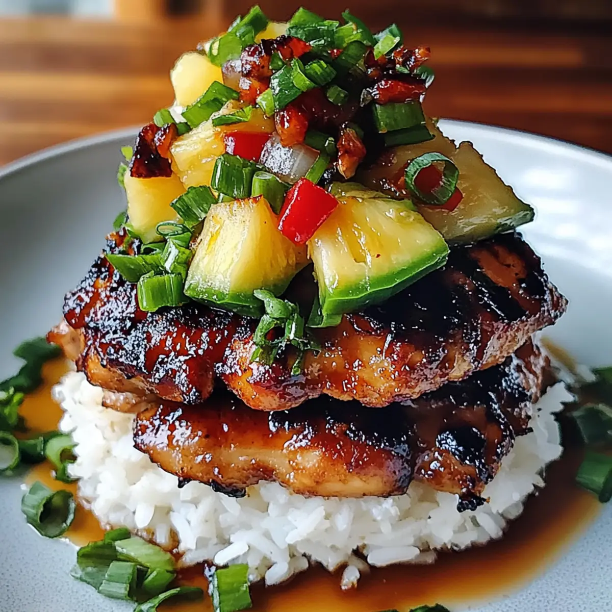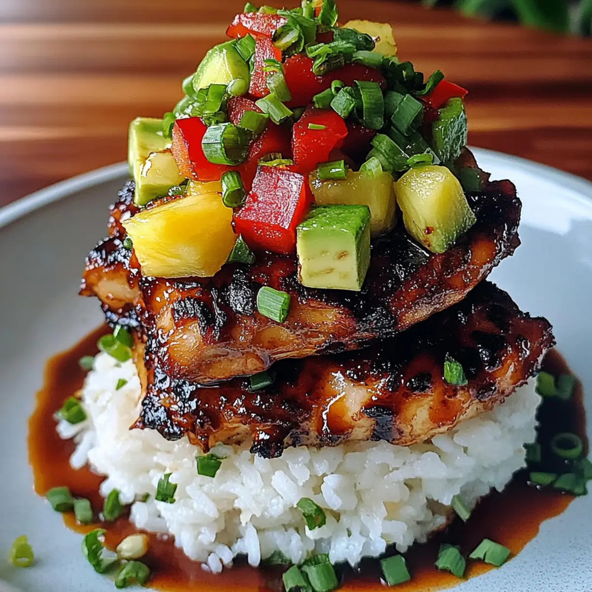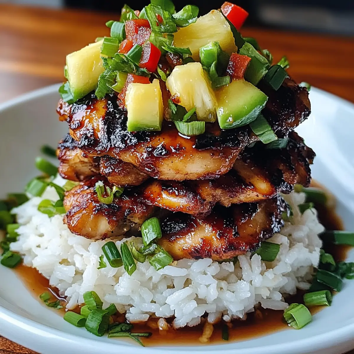 Jump to Recipe Print RecipeAs the scent of grilled chicken wafts through the air, I can’t help but feel transported to the lush islands of Hawaii. This Hawaiian Huli Huli Chicken Stack is more than just a meal—it’s a tropical experience that brings sunshine to your dinner table. Marinated in a vibrant combination of pineapple juice and soy sauce, the chicken becomes perfectly tender and packed with flavor, while creamy avocado and fragrant jasmine rice layer in a delightful texture. Not only is this dish a showstopper for dinner parties, but it also caters to those busy weeknights with its quick prep time. Let’s dive into making a meal that promises to delight your senses and whisk you away to paradise with every delicious bite! Ready to stack some tropical goodness? Why will you love this stack? Tropical Flavor Explosion: From the sweet pineapple marinade to the vibrant toppings, every bite of this Hawaiian Huli Huli Chicken Stack is like a mini-vacation in your mouth. Easy Prep: With simple ingredients and straightforward steps, this dish goes from kitchen to table in no time—perfect for busy weeknights. Crowd-Pleaser: Its colorful presentation and delightful flavors make it an instant hit, whether you’re hosting friends or enjoying a family meal. Versatile: Customize the ingredients to suit your taste; swap chicken for shrimp or use quinoa instead of rice for a nutritious twist! Texture Harmony: The combination of juicy grilled chicken, creamy avocado, and fluffy rice creates a satisfying bite that will keep you coming back for more. Pair this dish with a refreshing side like Garlic Chicken Zucchini for a complete meal option! Hawaiian Huli Huli Chicken Stack Ingredients Dive into the vibrant world of flavors with this Hawaiian Huli Huli Chicken Stack! For the Chicken Marinade Boneless, skinless chicken thighs – Tender and flavorful; chicken breasts can be substituted for a leaner option. Soy sauce – Provides essential umami; tamari is a great gluten-free alternative. Brown sugar – Balances the soy’s saltiness; honey or coconut sugar works as a substitute. Pineapple juice – Sweetens and tenderizes the chicken; fresh juice is best but canned works too. Ketchup – Adds richness and sweetness; consider a homemade barbecue sauce for a different kick. Rice vinegar – Brightens flavors with acidity; substitute with apple cider vinegar if needed. Garlic – Infuses depth and aroma; fresh minced garlic is ideal, but you can use garlic powder in a pinch. Fresh ginger – Offers warmth and spice; ground ginger is suitable but fresh is recommended for vibrancy. For the Stack Vegetable oil – Prevents the chicken from sticking; any neutral oil, such as canola, will do. Jasmine rice – Fragrant and slightly sticky base; basmati or brown rice can be used instead. Fresh pineapple – Adds a refreshing touch; swap with mango for an alternate tropical flavor. Red bell pepper – Adds sweetness and crunch; other peppers or cucumbers can be used for variety. Green onions – Provides color and a mild onion flavor for garnish. Avocado – Brings creaminess and healthy fats; guacamole can be a delicious alternative. Fresh cilantro – Brightens the plate; parsley makes a good substitute if you prefer. Lime wedges – Kick up the acidity; adding these is optional but highly recommended for extra freshness. With every ingredient working together, this Hawaiian Huli Huli Chicken Stack promises a delicious taste of the tropics! Step‑by‑Step Instructions for Hawaiian Huli Huli Chicken Stack Step 1: Prepare Marinade In a mixing bowl, whisk together soy sauce, brown sugar, pineapple juice, ketchup, rice vinegar, minced garlic, and grated fresh ginger until the mixture is smooth and well combined. This vibrant marinade will add incredible depth to your Hawaiian Huli Huli chicken. Set it aside while you prepare the chicken, allowing the flavors to meld beautifully. Step 2: Marinate Chicken Place the boneless, skinless chicken thighs into a resealable plastic bag. Pour the prepared marinade over the chicken, seal the bag tightly, and massage the marinade into the meat. Refrigerate for at least 2 hours, or overnight if possible, to let the flavors penetrate deeply, ensuring your chicken is flavorful and tender. Step 3: Preheat Grill Get your grill or grill pan ready by preheating it to medium-high heat, about 375°F (190°C). You’ll know it’s hot enough when you can feel the heat radiating off the grill grate. This step is crucial for achieving those beautiful grill marks on your Hawaiian Huli Huli chicken and helps caramelize the marinade. Step 4: Oil Chicken Before placing the chicken on the grill, brush each side with vegetable oil to prevent sticking and to enhance the grilling process. This simple step will help your Hawaiian Huli Huli chicken sear nicely and yield a delicious caramelized exterior. Step 5: Grill Chicken Place the marinated chicken thighs on the preheated grill. Cook for 6-7 minutes per side until the chicken is charred and the internal temperature reaches 165°F (75°C). Use tongs to flip the chicken halfway through grilling, ensuring an even cook. Once done, let the chicken rest for about 5 minutes to lock in juices. Step 6: Cook Rice While the chicken is resting, prepare the jasmine rice according to the package instructions. This typically involves rinsing the rice, bringing water to a boil, adding the rice, and simmering until fluffy. The warm rice will serve as the delightful base for your Hawaiian Huli Huli Chicken Stack. Step 7: Slice Chicken Once the chicken has rested, slice it into bite-sized strips. This process ensures each piece will be tender and easy to layer into your stack. Make sure to cut against the grain for maximum tenderness, enhancing every delicious bite of your Hawaiian Huli Huli chicken. Step 8: Assemble Stack Start your Hawaiian Huli Huli Chicken Stack by placing a generous portion of fluffy jasmine rice at the bottom of your plate o