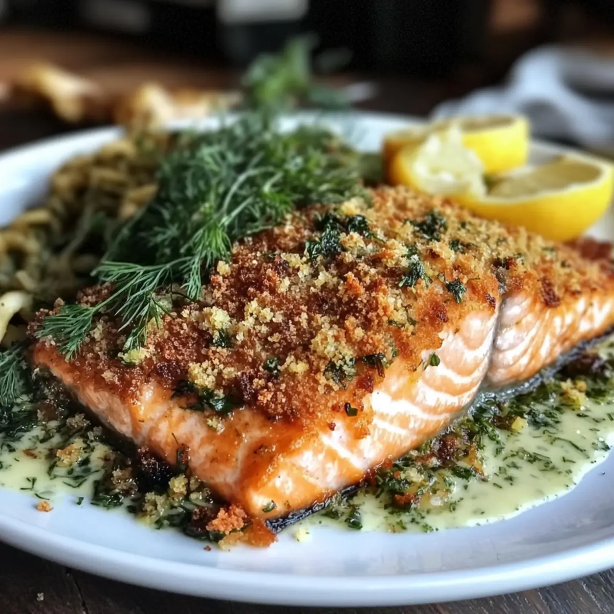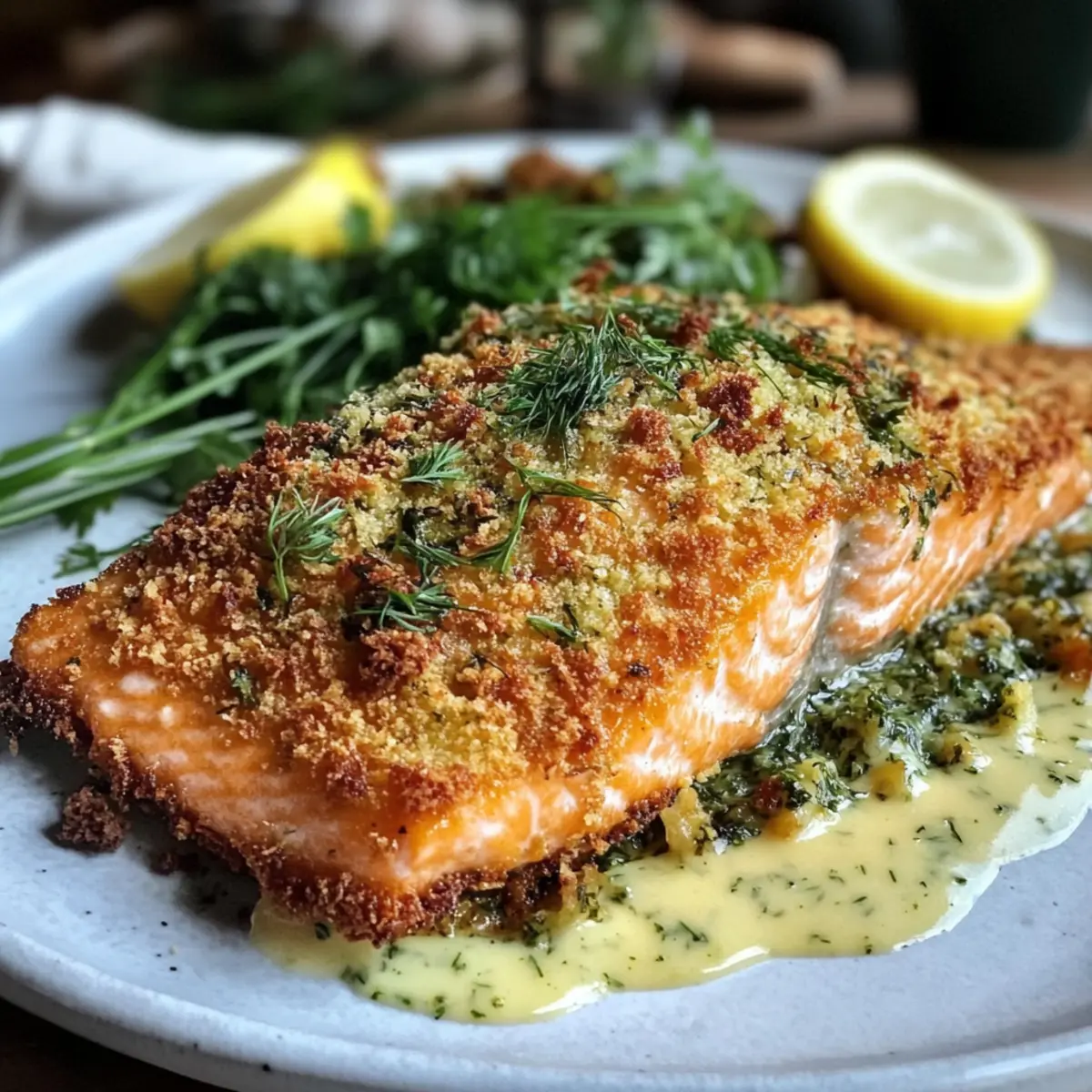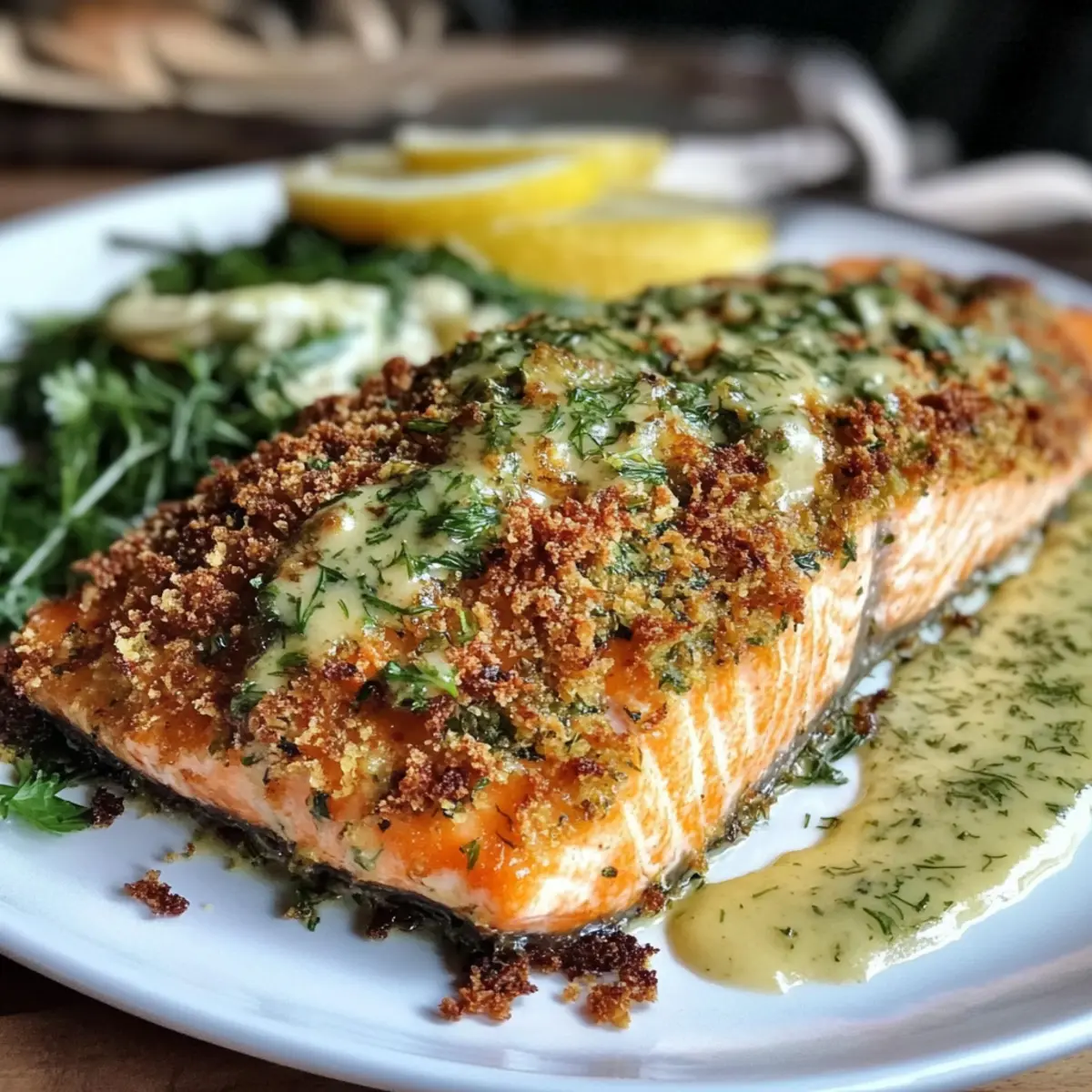 Jump to Recipe Print RecipeAs I stood in the kitchen, the tantalizing aroma of herbs danced in the air, sparking memories of family gatherings where seafood stole the show. Today, I’m thrilled to share my Crispy Herb-Crusted Salmon with Easy Lemon Dill Sauce—a dish that marries simplicity with sophistication. This recipe is a quick dinner dream come true, perfect for those busy weeknights when you crave a nourishing meal without the fuss. Packed with protein and healthy fats, this salmon also brings a satisfying crunch that’s sure to impress your dinner guests. Plus, it’s versatile! You can easily customize the herbs or adjust the sauce to suit your palate. Are you ready to create this delightful seafood sensation that will elevate your dinner table? Why Is This Salmon So Special? Crispy, Crunchy Texture: The panko breadcrumbs yield an irresistibly crunchy coating, making every bite delightful. Fresh, Vibrant Flavors: A harmonious blend of herbs and lemon brightens up your meal, keeping it light yet satisfying. Quick & Easy: Perfect for busy nights, this recipe comes together in under 30 minutes, allowing you to enjoy gourmet flavors without wasting time. Customizable Options: Feel free to switch up the herbs or adjust the lemon sauce based on your preferences—endless possibilities await! Impressive Presentation: The stunning golden crust paired with a creamy sauce will have your guests raving about your culinary skills. For more seafood magic, check out my Honey Sriracha Salmon or Garlic Butter Salmon. Herb-Crusted Salmon Ingredients • Get ready to elevate your weeknight dinners with these simple yet essential components! For the Salmon Salmon Fillet – A protein-rich base providing healthy omega-3 fatty acids; wild-caught enhances flavor. Panko Breadcrumbs – Creates a crunchy coating; opt for gluten-free panko to keep it gluten-free! Fresh Herbs (e.g., dill, parsley) – Add fresh flavor and aroma; dried herbs can work in half the amount. For the Lemon Dill Sauce Lemon Zest and Juice – Brightens the dish and adds zest; always go for fresh to elevate acidity. Greek Yogurt (or dairy-free alternative) – Forms a creamy, tangy base for the sauce; coconut yogurt is a great substitute. For Cooking Olive Oil (or high smoke-point oil) – Essential for searing the salmon; helps create that delicious crispy crust. Salt and Pepper – Necessary seasonings that enhance the dish’s overall flavor; don’t skip them! Step‑by‑Step Instructions for Crispy Herb-Crusted Salmon with Easy Lemon Dill Sauce Step 1: Prepare the Salmon Start by patting the salmon fillet dry with paper towels to ensure a crispy crust. This crucial first step removes excess moisture, allowing the herb crust to adhere better. Place the fillet on a clean cutting board, and let it rest while you prepare the panko mixture. Step 2: Mix the Herb Crust In a mixing bowl, combine panko breadcrumbs with your choice of finely chopped fresh herbs, like dill and parsley. Stir well to ensure an even distribution of flavors. To add an aromatic touch, include the zest of a lemon. This mixture will form the delicious coating for your crispy herb-crusted salmon. Step 3: Season and Coat the Salmon Generously season the salmon fillet on both sides with salt and pepper to enhance the flavors. Then, take your herb and panko mixture and press it evenly onto the top of the fillet, ensuring it sticks well. This herb crust will give your salmon a wonderful crunchy texture, making the dish even more delightful. Step 4: Heat the Skillet In a large skillet, heat a couple of tablespoons of olive oil over medium heat until it shimmers. This is the perfect time to ensure your pan is hot enough for searing. Carefully place the salmon fillet crust-side down in the skillet, pressing down slightly to create a good seal between the fish and the herb crust. Step 5: Cook Until Golden Brown Allow the salmon to cook for about 6-8 minutes, or until the crust turns a beautiful golden brown and crispy. Resist the urge to move the fillet; letting it sit will help create that perfect crunch. You can peek underneath to check for that lovely golden hue. Step 6: Flip the Salmon When the crust is golden and crispy, carefully flip the salmon fillet using a spatula. Cook for an additional 1-3 minutes. The salmon should feel firm to the touch when it’s cooked through and should be opaque in color. This step is essential to make sure your crispy herb-crusted salmon is perfectly cooked. Step 7: Prepare the Lemon Dill Sauce While the salmon is cooking, whisk together the lemon juice and Greek yogurt in a small bowl to create a creamy lemon dill sauce. Adjust the tanginess according to your taste by adding more lemon juice if desired. This refreshing sauce will complement your crispy salmon wonderfully. Step 8: Serve and Enjoy Once the salmon is cooked to perfection, remove it from the skillet and serve immediately. Pair it with fresh lemon slices and a sprinkle of extra dill for added flavor. The combination of crispy herb-crusted salmon, zesty lemon, and creamy dill sauce is sure to impress! How to Store and Freeze Herb-Crusted Salmon Fridge: Store leftover herb-crusted salmon in an airtight container for up to 2 days. Ensure it’s cooled before sealing to maintain freshness and prevent sogginess. Freezer: To freeze, wrap the salmon tightly in plastic wrap and place it in a freezer-safe bag. It can last up to 3 months; just make sure to label it with the date! Reheating: For the best results, reheat in a non-stick skillet over medium heat. This method helps restore the crispy texture of the coating without drying out the salmon. Serving Tip: Always enjoy the herb-crusted salmon hot for maximum flavor, paired with your favorite sides. Make Ahead Options These Crispy Herb-Crusted Salmon fillets are perfect for meal prep! You can prepare the herb and panko mixture up to 24 hours in advance; simply store it in an airtight container in the refrigerator to main