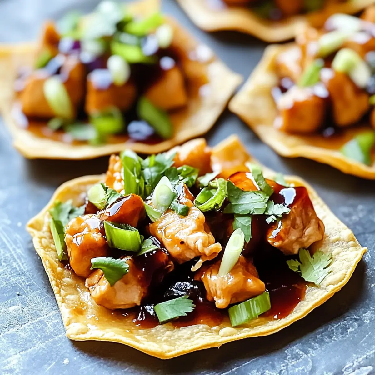 Jump to Recipe Print RecipeThere’s something magical about a dish that effortlessly marries crunch and flavor in a matter of minutes. My Hoisin Chicken Wonton Tostadas do just that, transforming everyday ingredients into a delightful treat perfect for weeknight dinners or gatherings. With a crisp base made from golden-baked wonton wrappers, juicy chicken tossed in a tangy Hoisin glaze, and a vibrant topping of fresh veggies, this recipe is a celebration of textures and tastes. Plus, you can whip these up in only 20 minutes—making them a fantastic choice for those busy evenings when takeout feels too easy. Whether you’re looking to impress guests or satisfy a craving, these tostadas are sure to hit the spot. What toppings will you choose to make them your own? Why Are These Tostadas So Irresistible? Quick and Easy: With just 20 minutes of prep time, you’ll have a stunning dish that rivals your favorite takeout! Crispy Delight: The golden-baked wonton wrappers create a satisfying crunch that perfectly complements the tender, glazed chicken. Bold Flavors: The rich Hoisin sauce adds a savory-sweet twist, elevating each bite to a whole new level of deliciousness. Customizable: Feel free to mix up the toppings; add shredded carrots or diced jalapeños for a personal touch, making this recipe truly yours! Perfect for Any Occasion: Whether it’s an impromptu gathering or a cozy family dinner, these tostadas are guaranteed to impress. Pair them with a refreshing cucumber salad or a drizzle of sriracha for extra zing, just like in my Thai Peanut Chicken recipe! Hoisin Chicken Wonton Tostadas Ingredients For the Tostadas • Wonton Wrappers – The crunchy base of the tostadas; ensure they are fresh and pliable for best results. • Sesame Oil – Used for brushing the wonton wrappers to achieve a golden color; can be substituted with any neutral oil if needed. For the Chicken Filling • Boneless Skinless Chicken Breast – Main protein cut into ½ inch cubes for even cooking; the heart of your Hoisin Chicken Wonton Tostadas! • Hoisin Sauce – Provides a savory-sweet glaze for the chicken; can substitute with an allergy-friendly sauce if necessary. • Rice Vinegar – Adds a tangy note to the sauce; apple cider vinegar is a suitable alternative if rice vinegar is unavailable. For the Toppings • Napa Cabbage – Adds fresh crunch; shred it for optimal texture. • Cilantro – Provides a vibrant herbal flavor; can be swapped with parsley for a different twist. • Green Onion – Offers color and a mild onion flavor; slice thin for easy topping. • Toasted Sesame Seeds – Optional garnish that enhances the texture and adds a nutty flavor. Step‑by‑Step Instructions for Hoisin Chicken Wonton Tostadas Step 1: Preheat and Prepare Preheat your oven to 350°F (175°C) and line a baking sheet with parchment paper. Arrange the wonton wrappers on the baking sheet, ensuring they don’t overlap. This step is crucial for achieving those perfectly crispy Hoisin Chicken Wonton Tostadas later. Step 2: Brush and Bake Wontons Brush each wonton wrapper lightly with sesame oil, encouraging a beautiful golden color and crispness. Place the baking sheet in the oven and bake for 7-8 minutes, or until the wrappers are bubbling and golden brown. Keep an eye on them to prevent burning, as oven conditions can vary. Step 3: Mix Sauce Ingredients While the wontons are baking, gather a small bowl and combine the Hoisin sauce, rice vinegar, and a pinch of sesame oil. Stir until smooth, reserving half for serving alongside your tostadas. This mixture will add a tangy, sweet coating to your chicken, elevating your Hoisin Chicken Wonton Tostadas. Step 4: Cook the Chicken In a skillet, heat a tablespoon of sesame oil over medium heat. Add the cubed boneless skinless chicken breast and sauté for about 10 minutes, stirring occasionally until the pieces are golden brown and cooked through. Make sure to avoid overcrowding the pan, as this ensures even cooking. Step 5: Glaze the Chicken Once the chicken is beautifully golden, pour the reserved sauce into the skillet. Stir well to coat each piece of chicken and allow it to cook for another 2 minutes, letting the flavors meld together. This step will create a mouthwatering glaze for your Hoisin Chicken Wonton Tostadas. Step 6: Prepare the Toppings In a mixing bowl, combine the shredded Napa cabbage and chopped cilantro. This fresh topping will provide a delightful crunch and herbal flavor to your tostadas, balancing the rich glaze of the chicken. Toss the mixture lightly to evenly distribute the ingredients. Step 7: Assemble the Tostadas Once the wonton wrappers are crispy, remove them from the oven and begin assembling your Hoisin Chicken Wonton Tostadas. Start by placing a generous amount of the cabbage mixture on each wrapper, followed by a scoop of the glazed chicken, and finish with a sprinkle of sliced green onion on top. Step 8: Serve Serve the tostadas immediately while the wonton wrappers are still crisp. Drizzle any remaining reserved sauce on top or serve it on the side for dipping. These tasty Hoisin Chicken Wonton Tostadas are perfect for sharing, but you might just want to keep them all for yourself! Hoisin Chicken Wonton Tostadas Variations Feel free to get creative with your Hoisin Chicken Wonton Tostadas and customize them to match your taste buds! Tofu Substitute: Swap chicken for diced tofu for a delicious vegetarian option. Just marinate the tofu in the Hoisin sauce before cooking for extra flavor. Shrimp Delight: For a seafood twist, use shrimp instead of chicken. Sauté until pink and tender, then glaze in the same savory sauce for an ocean-inspired treat. Crunchy Carrots: Add shredded carrots on top of your tostadas for a pop of color and an extra crunch. The natural sweetness complements the savory chicken perfectly. Radish Kick: Thinly slice radishes for a peppery bite that brightens up the topping mix. Their crispiness adds another layer of