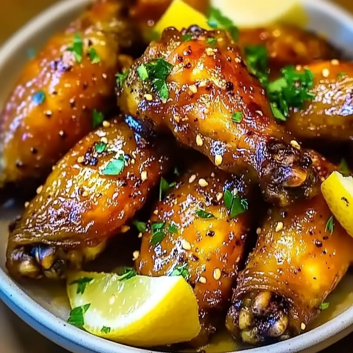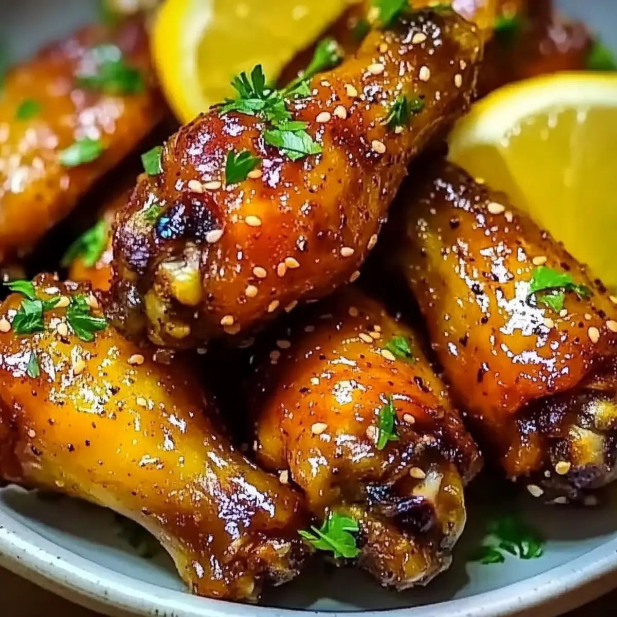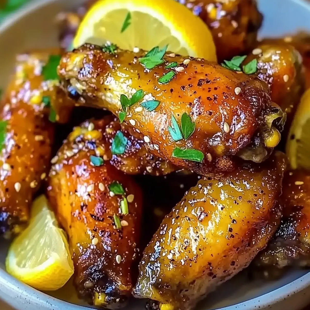 Jump to Recipe Print RecipeAs the aroma of golden, crispy wings fills my kitchen, I can’t help but feel a wave of excitement wash over me. It’s time for Honey Lemon Pepper Wings Super Crispy—my ultimate cooking obsession! These wings are perfect for any gathering, whether it’s a cozy family dinner or a lively game day bash. The delightful combination of sweet honey, zesty lemon, and a hint of black pepper creates an irresistible glaze that transforms ordinary wings into a crowd-pleasing feast. Plus, with minimal prep and baking time, you’ll have plenty of time to enjoy your friends and family. Curious about how to get your wings perfectly crispy and packed with flavor? Let’s dive into this mouthwatering recipe together! How to Achieve Super Crispy Wings? Irresistible Texture: These Honey Lemon Pepper Wings are baked to perfection, achieving a delightful crispiness that rivals fried wings, making them a guilt-free indulgence. Flavor Burst: Expect a tantalizing explosion of flavors from the sweet honey and zesty lemon paired with the subtle kick of black pepper, appealing to all taste buds at your gathering. Easy to Make: With simple steps and minimal effort, this dish proves that delicious homemade food doesn’t require hours in the kitchen. Perfect for Gatherings: Whether it’s a game day party or a cozy dinner, these wings are sure to impress and satisfy your guests, becoming the star of the show. Customizable Spice: Make it your own by adding a dash of cayenne or opting for spicy variations, ensuring everyone at your table is happy. Honey Lemon Pepper Wings Super Crispy Ingredients • Get ready to create the most delicious Honey Lemon Pepper Wings Super Crispy with this essential ingredient list! For the Wings Chicken Wings – These are the star of the dish, offering tender meat and the perfect skin for crispiness. Olive Oil – A spoonful helps in achieving that golden crunch; can be swapped with melted butter for richness. Salt – The essential seasoning that enhances the overall flavor profile. Cornstarch – This is your secret weapon for achieving extra crispiness; don’t skip it for the best texture. For the Seasoning Garlic Powder – Adds a warm depth; if you love fresh flavors, substitute with minced garlic. Onion Powder – Enhances savory notes, but can be omitted if it’s not on hand. Paprika – Provides mild sweetness and color; feel free to use smoked paprika for a smoky twist. Ground Black Pepper – Adds a kick to the wings; lemon pepper seasoning can enhance the flavor even more. For the Glaze Honey – The base for your glaze, bringing sweetness galore; agave nectar works well for a vegan option. Unsalted Butter – Contributes richness and luxurious texture; olive oil can be an alternative if desired. Lemon Zest – A must-have to intensify the lemon flavor, bringing brightness to the glaze. Lemon Juice – The fresh tanginess cuts through the sweetness; always opt for fresh for the best flavor. Lemon Pepper Seasoning – For an extra flavor boost; adjust to taste based on your preference. Cracked Black Pepper – Offers an additional layer of heat; consider cayenne pepper for more spiciness. For Garnish Chopped Fresh Parsley – An optional yet lovely touch for color and a hint of freshness on your wings. Now that you’ve gathered the ingredients, get ready to indulge in the crispy, flavorful delight that is Honey Lemon Pepper Wings! Step‑by‑Step Instructions for Honey Lemon Pepper Wings Super Crispy Step 1: Prep the Wings Start by patting your chicken wings dry with paper towels to ensure they crisp up beautifully. In a large bowl, drizzle the wings with olive oil, then sprinkle with salt, garlic powder, onion powder, paprika, ground black pepper, and cornstarch. Toss everything until the wings are evenly coated and every wing is glistening with seasoning. Step 2: Bake Preheat your oven to 425°F (220°C) while you prepare your baking sheet. Line a large baking sheet with foil for easy cleanup, and place a wire rack on top. Spread the seasoned wings in a single layer on the rack, ensuring they aren’t touching. Bake for 20 minutes, then flip the wings and continue baking for another 20-25 minutes, until they are golden brown and have a crackly skin. Step 3: Prepare the Glaze While the wings are baking, it’s time to make the luscious glaze that will elevate your Honey Lemon Pepper Wings. In a small saucepan over medium heat, combine honey, unsalted butter, lemon zest, and freshly squeezed lemon juice. Stir as it comes to a gentle bubble, allowing the mixture to thicken slightly, about 2-3 minutes. Add lemon pepper seasoning and cracked black pepper, stirring to blend the flavors. Step 4: Coat the Wings Once the wings are out of the oven and crispy, transfer them to a large mixing bowl. Pour the warm glaze over the wings and toss until every wing is perfectly coated in that sweet and tangy goodness. The glaze will create a beautiful, sticky sheen that complements the crunch of the wings. Step 5: Serve To finish, transfer your beautiful Honey Lemon Pepper Wings to a serving platter. For a pop of color and freshness, garnish with chopped fresh parsley. Serve them immediately while hot to enjoy the crunch and warm, flavorful glaze. Your guests will be eager to dig in! Expert Tips for Honey Lemon Pepper Wings Dry Thoroughly: Ensure wings are completely dry before seasoning; moisture will prevent crispiness. Pat them down well with paper towels! Cornstarch Control: Don’t skip the cornstarch! It’s essential for achieving that Honey Lemon Pepper Wings super crispy texture. Uniform Baking: Arrange wings in a single layer on the rack without overcrowding; this promotes even baking and crispiness. Glaze Timing: For the best results, toss the glaze with wings immediately after baking; adding later may soften the crispy skin. Flavor Customization: Feel free to adjust the level of black pepper and lemon seasoning according to your spice preference,