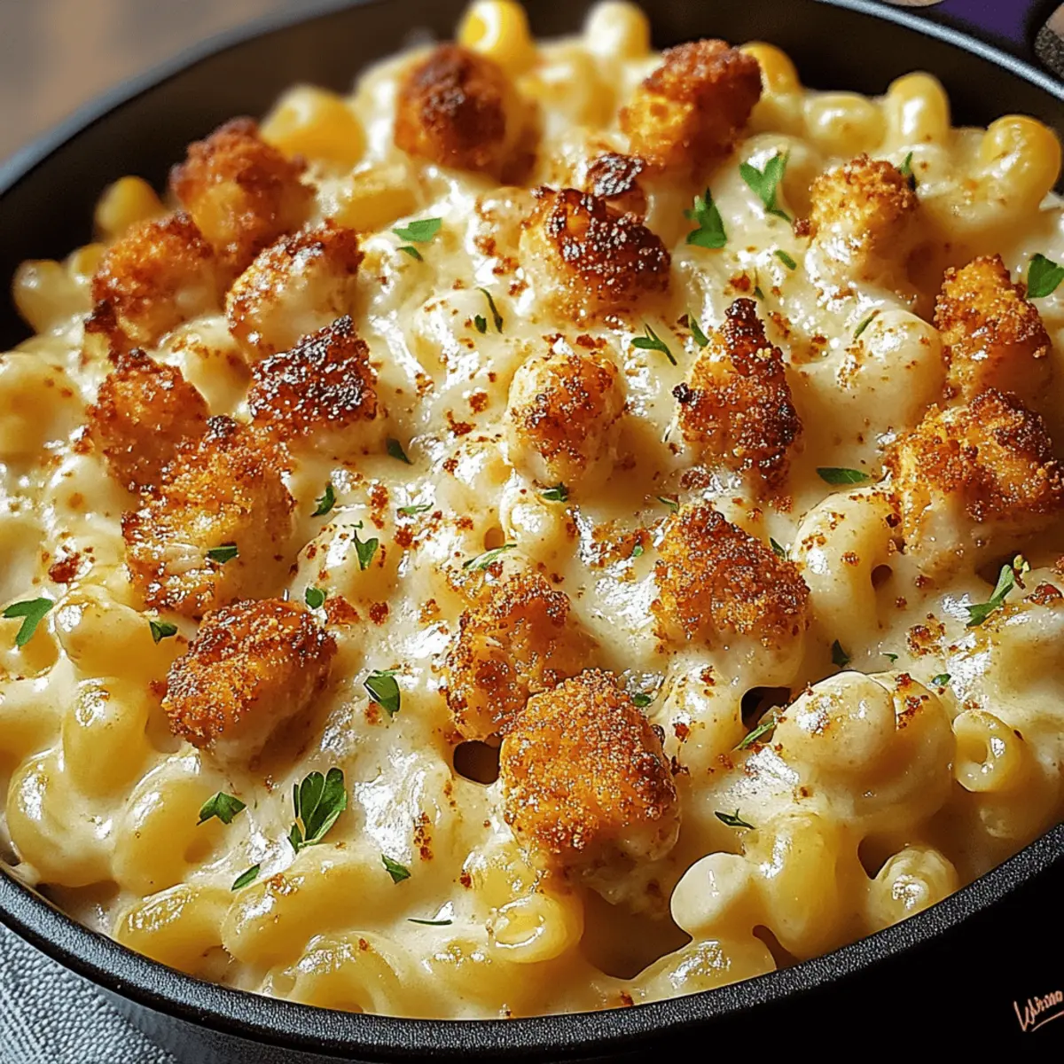 Jump to Recipe Print RecipeAs I stood in my kitchen, the aroma of sizzling chicken filled the air, igniting a playful nostalgia for cozy family meals. That’s when I decided to elevate the classic comfort food with my Creamy Honey Pepper Chicken Mac and Cheese—a delightful twist that combines rich, gooey cheese with the enticing sweetness of honey and a hint of spice. This dish not only brings comfort to busy weeknights but also impresses at gatherings, making it an instant family favorite. With its quick prep and the option for healthier substitutions, it invites you to indulge without any guilt. Curious about how to whip up this creamy revelation? Let’s dive in and discover the magic behind this modern classic together! Why is Honey Pepper Chicken Mac and Cheese special? Irresistible Flavor Fusion: This recipe combines sweet honey with spicy pepper for a unique twist on a classic. Comfort Food Joy: Mac and cheese is the ultimate comfort food, and adding chicken amplifies the heartiness, perfect for family gatherings. Quick and Easy: Simplified steps mean you can serve this creamy delight on busy weeknights without hassle. Customizable: Swap in whole grain pasta for extra fiber, or toss in your favorite veggies to make it fit your nutrition goals. For an extra treat, consider pairing it with our Honey Butter Chicken for an unforgettable feast! Crowd-Pleaser: Guaranteed to impress both kids and adults, this dish has a way of bringing everyone to the table. With such vibrant flavors and cozy satisfaction, it’s hard to resist this modern mac and cheese classic! Honey Pepper Chicken Mac and Cheese Ingredients • When you gather these ingredients, you’re on your way to creating a delightful dinner that everyone will love! For the Pasta Elbow Macaroni – The classic pasta choice; opt for whole wheat for extra nutrition. For the Chicken Boneless Skinless Chicken Breasts – The star protein; cut into bite-sized pieces for faster cooking. Olive Oil – Ideal for sautéing; can be swapped with butter for added richness. Salt & Black Pepper – Essential for seasoning; consider sea salt for a more flavorful taste. For the Sweet and Spicy Flavor Honey – Brings a touch of sweetness that perfectly balances the savory; swap for maple syrup if desired. Crushed Red Pepper Flakes – Adds the necessary kick; adjust to your spice preference or replace with fresh jalapeños. For the Creamy Sauce Butter – The foundation for your cheese sauce; use light butter for a healthier option. All-Purpose Flour – Thickens the sauce; gluten-free? Cornstarch works beautifully! Milk & Heavy Cream – Creates that luxurious texture; plant-based milk is a great dairy-free substitute. Garlic Powder – Infuses delicious flavor; fresh garlic adds a lovely touch if available. Onion Powder – Complements the garlic; sautéing fresh onion can enhance the richness. Shredded Mozzarella & Sharp Cheddar Cheese – The ultimate cheese combo for gooeyness; low-fat options are available if you’d like to lighten it up. For Garnish Chopped Parsley (optional) – Adds a fresh finish; feel free to replace with chives or skip if you want. Gather these ingredients, and you’ll be one step closer to serving up an incredible Honey Pepper Chicken Mac and Cheese that your family will adore! Step‑by‑Step Instructions for Honey Pepper Chicken Mac and Cheese Step 1: Cook the Pasta Begin by boiling a large pot of salted water and adding elbow macaroni. Cook according to package instructions until al dente, usually around 8-10 minutes. Once done, drain the pasta in a colander and set it aside, allowing it to steam off excess moisture while you prepare the other components of your Honey Pepper Chicken Mac and Cheese. Step 2: Sauté the Chicken In a large skillet, heat 2 tablespoons of olive oil over medium heat. Season your bite-sized pieces of boneless skinless chicken breasts with salt and black pepper, then add them to the hot skillet. Sauté the chicken for about 6-8 minutes or until it turns golden brown and is no longer pink in the center. Stir occasionally to ensure even cooking and prevent sticking. Step 3: Add Sweetness and Spice Once the chicken is thoroughly cooked, reduce the heat and stir in ¼ cup of honey along with 1 teaspoon of crushed red pepper flakes. Toss the chicken until it’s evenly coated in the sweet, spicy mixture. Let it simmer for an additional 1-2 minutes to warm through before removing the skillet from heat. Step 4: Prepare the Cheese Sauce In a separate saucepan over medium heat, melt 3 tablespoons of butter. Once melted, whisk in 3 tablespoons of all-purpose flour and cook for about 1-2 minutes until it turns a light golden color, creating a roux. This crucial base will thicken your cheese sauce for the Honey Pepper Chicken Mac and Cheese. Step 5: Make it Creamy Gradually whisk in 2 cups of milk and 1 cup of heavy cream into the roux, stirring continuously to avoid lumps. Keep cooking the mixture, bringing it to a gentle simmer for about 3-4 minutes until it thickens. Add 1 teaspoon each of garlic powder and onion powder, incorporating them well for a rich, flavorful base. Step 6: Add the Cheeses Lower the heat to medium-low and stir in 1 cup of shredded mozzarella cheese and 1 cup of sharp cheddar cheese. Mix continuously until the cheeses melt completely and the sauce is smooth and creamy. It should have a thick and luscious consistency, perfect for enveloping the pasta in your Honey Pepper Chicken Mac and Cheese. Step 7: Combine Pasta and Chicken Toss the drained macaroni into the creamy cheese sauce, stirring to coat every piece evenly. Next, gently fold in the honey-glazed chicken, ensuring they’re well distributed throughout the pasta. This step melds the comforting elements of the dish together, creating a deliciously indulgent experience. Step 8: Broil for a Crunchy Top Transfer the mixture to a greased baking dish and sprinkle a little extra mozzarella on top for added gooeyness. 