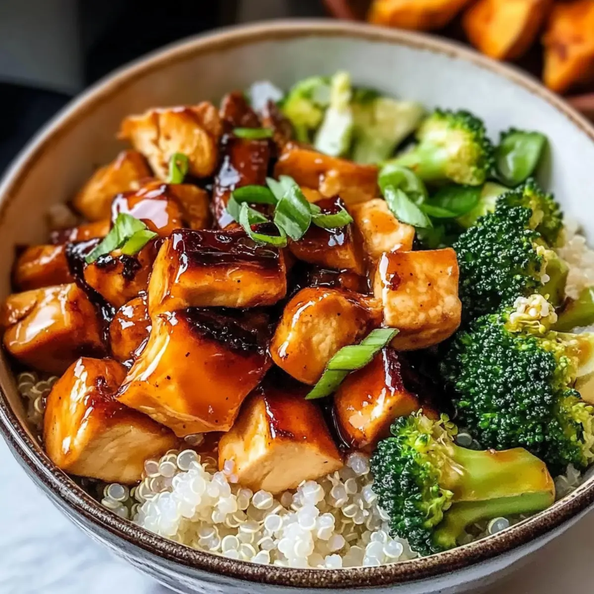 5. Assemble the bowls with grains, glazed chicken, steamed broccoli, and roasted sweet potatoes.