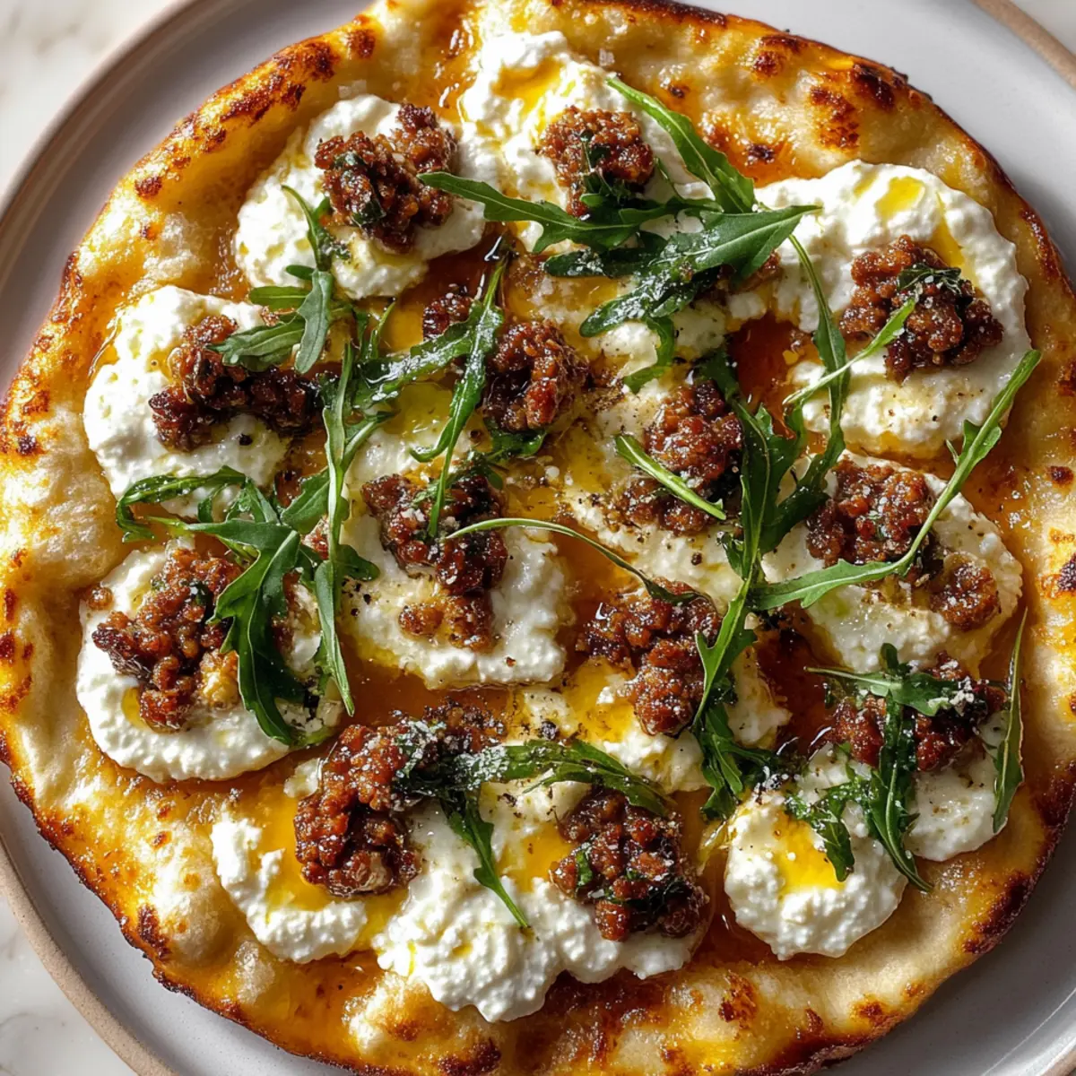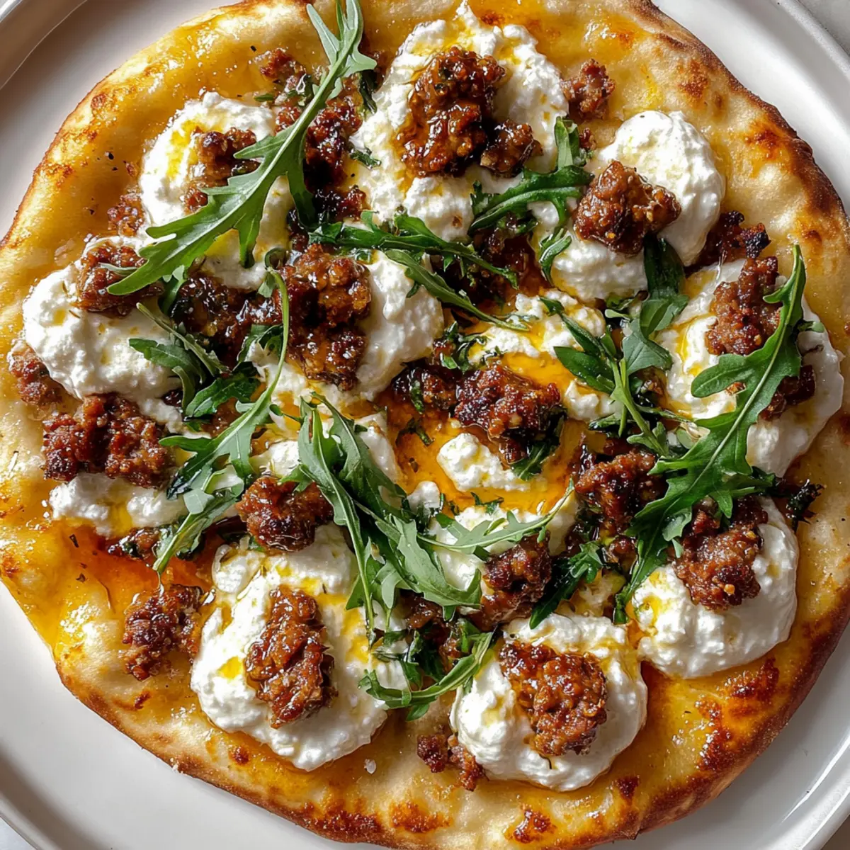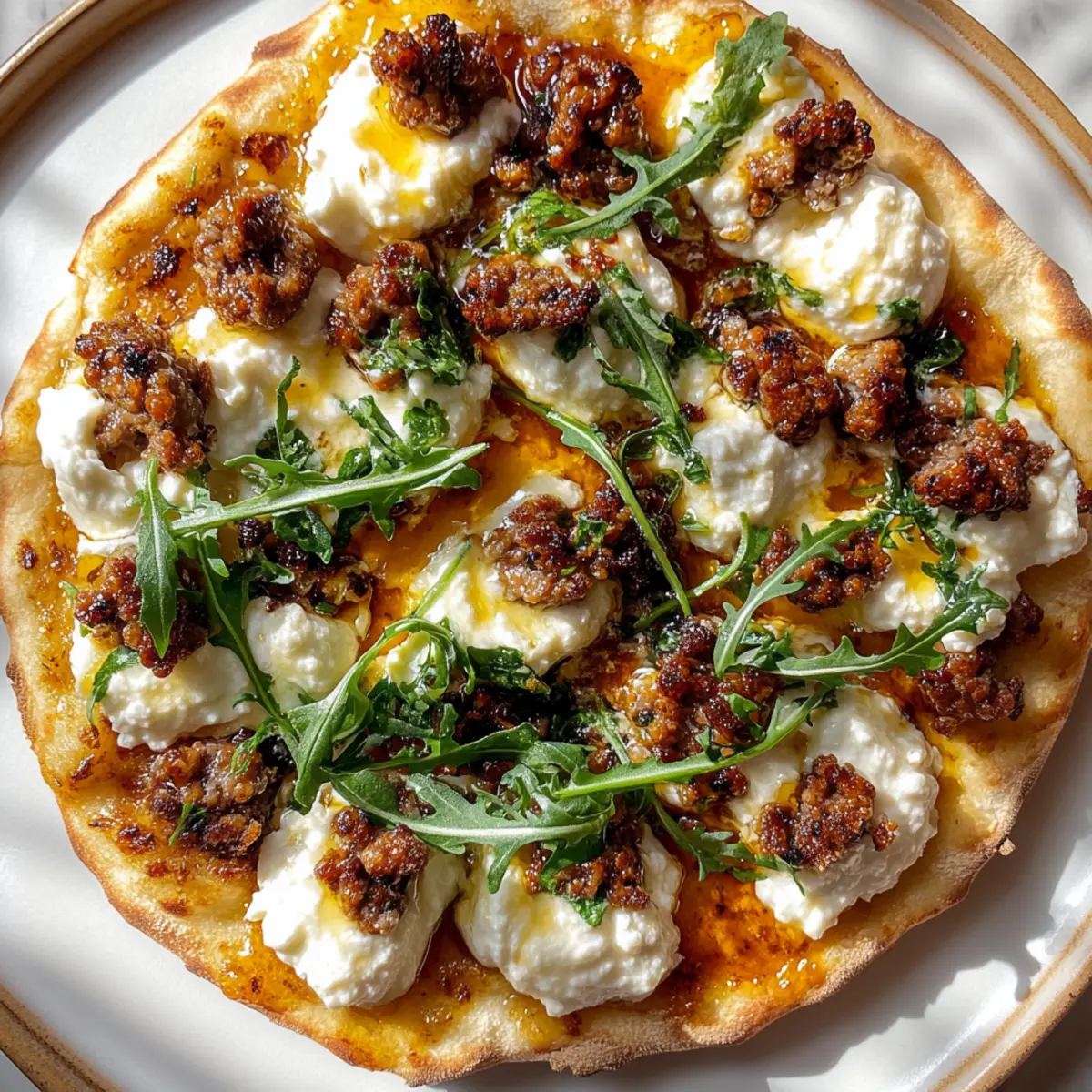 Jump to Recipe Print RecipeAs I pulled the crispy flatbread from the oven, the comforting aroma of melting cheese and savory sausage wrapped around me like a warm hug. This Hot Honey Ricotta Sausage Flatbread is my go-to recipe for those nights when the last thing I want to do is settle for takeout. With its quick prep and customizable spice levels, it’s perfect for anyone craving flavorful comfort without hours in the kitchen. The creamy ricotta paired with a sweet and spicy hot honey drizzle transforms this simple dish into an unforgettable experience. Trust me, it’s a crowd-pleaser at any gathering! Are you ready to elevate your weeknight dinners? Why Is This Flatbread So Amazing? Quick and Easy: This recipe comes together in under 30 minutes, making it ideal for busy weeknights. Customizable Flavors: With options for spice levels and toppings, everyone can enjoy their perfect bite. Crowd-Pleaser: Guests will rave about the delightful smoky sausage and creamy ricotta combination. Savory and Sweet: The hot honey drizzle brings a unique sweet-and-spicy twist that elevates every mouthful. Whether you’re enjoying it as a main dish or an appetizer, this flatbread is sure to impress! If you’re looking for more crowd-pleasers, check out my Hot Honey Chicken or Sloppy Hot Italian recipes! Hot Honey Ricotta Sausage Flatbread Ingredients For the Flatbread Base • Large naan or flatbreads – Perfect for holding all the delicious toppings; consider using store-bought pita or pizza dough for a quicker option. • Olive oil – Adds richness and aids in achieving a golden-brown crust. For the Cheese Mixture • Whole milk ricotta cheese – This creamy, mild cheese is a key component; you can swap it for goat cheese or cottage cheese for a different twist. • Minced garlic – Infuses aromatic flavor; garlic powder can work in a pinch. • Dried oregano – Brings in herbaceous notes; Italian seasoning can be a great substitute. For the Toppings • Italian sausage (mild or hot) – Promises savory depth; crumbled bacon or sautéed mushrooms work well for a non-pork alternative. • Shredded mozzarella cheese – Melts beautifully for that gooey texture; feel free to replace it with provolone or fontina if desired. • Grated Parmesan cheese – Adds a salty kick and enhances umami; Pecorino Romano is a suitable alternative. For the Drizzle • Honey – Acts as the essential base for the hot honey drizzle, balancing the flavors wonderfully; using store-bought hot honey can simplify the preparation. • Red pepper flakes – Provides the essential heat; adjust according to your desired spice level. For Garnish • Fresh arugula or basil – Adds a pop of freshness and color; you can substitute with spinach or parsley if preferred. This ingredient list is your roadmap to crafting the irresistible Hot Honey Ricotta Sausage Flatbread. With just a few quality ingredients and some simple prep, you’ll be on your way to a gourmet meal that’s sure to please any crowd! Step‑by‑Step Instructions for Hot Honey Ricotta Sausage Flatbread Step 1: Preheat Oven Begin by preheating your oven to 425°F (220°C) and place a baking sheet inside to heat up. This will help achieve that perfectly crispy base for your Hot Honey Ricotta Sausage Flatbread. While the oven warms, prepare your other ingredients so you can assemble everything quickly once the cooking starts. Step 2: Prepare Honey In a small saucepan, gently heat ¼ cup of honey over low heat for about 2 minutes, just until warm. Stir in a pinch of red pepper flakes to infuse the honey with heat. This step adds a delicious sweet-and-spicy element to the flatbread, ensuring each bite is as flavorful as possible. Step 3: Cook Sausage In a medium skillet, cook 1 pound of crumbled Italian sausage over medium heat for about 5–7 minutes, stirring frequently until it’s browned and cooked through. Make sure to break up any large chunks with a spatula. Once done, drain excess fat to keep your Hot Honey Ricotta Sausage Flatbread from becoming greasy. Step 4: Mix Ricotta In a mixing bowl, combine 1 cup of whole milk ricotta cheese with 2 minced garlic cloves, 1 teaspoon of dried oregano, and a pinch of salt and pepper. Mix thoroughly until it’s creamy and well blended. This ricotta mixture will serve as a luscious base for your flatbread, adding creamy richness to every delicious slice. Step 5: Assemble Flatbreads Take the heated naan or flatbreads and brush both sides lightly with olive oil. Spread an even layer of the ricotta mixture on top, then generously sprinkle the cooked sausage, followed by 1 cup of shredded mozzarella and ¼ cup of grated Parmesan cheese. The layering technique ensures that the flavors meld beautifully together during baking. Step 6: Bake Carefully transfer the assembled flatbreads onto the preheated baking sheet using a spatula. Bake in the oven for 10–12 minutes, or until the edges are golden-brown and the cheese is bubbling. Keep an eye on them during the last few minutes to prevent over-browning and achieve that irresistible crispy texture. Step 7: Drizzle and Garnish Once baked, remove the flatbreads from the oven and drizzle the hot honey over the top generously. Finish with a handful of fresh arugula or basil for a vibrant touch. The combination of the sweet honey and fresh greens elevates the flavors of your Hot Honey Ricotta Sausage Flatbread, making it not only a feast for the palate but also for the eyes. Expert Tips for Hot Honey Ricotta Sausage Flatbread Perfectly Crispy Base: Preheat your oven with the baking sheet inside; this ensures a crispy, golden crust right from the start. Flavor Infusion: Warm the honey before mixing in red pepper flakes; this helps to better infuse the flavors for a delightful drizzle. Sausage Safety: Always cook the sausage until it’s thoroughly browned to ensure food safety and enjoy the best flavor. Layer Wisely: When assembling, spread the ricotta mixture evenly and layer to