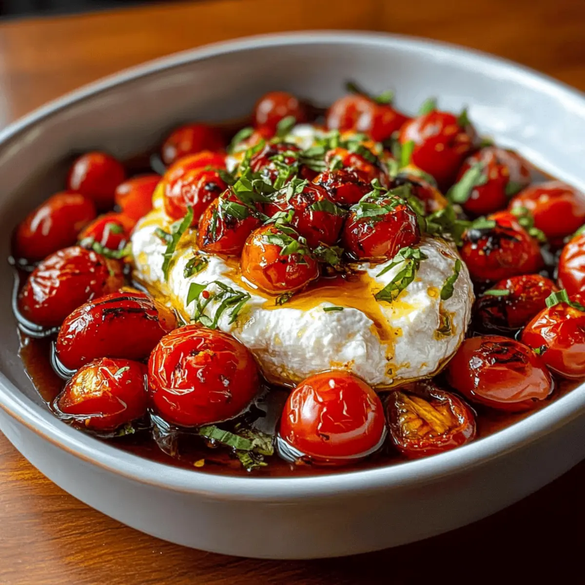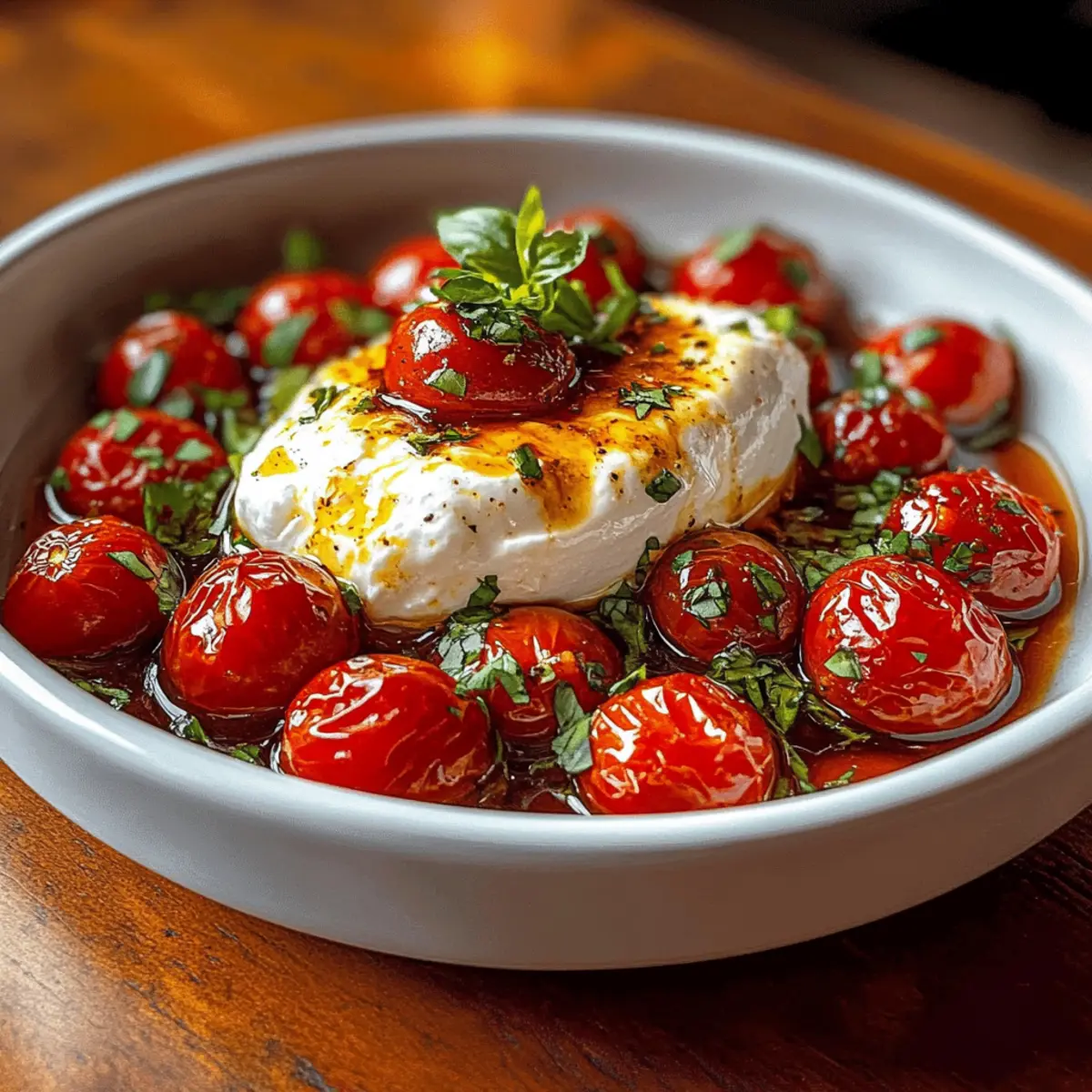 Once the tomatoes are roasted, carefully remove the dish from the oven. Create a small well in the center and place the burrata cheese there. The warmth of the roasted tomatoes will gently melt the cheese for a creamy texture that complements the dip beautifully.