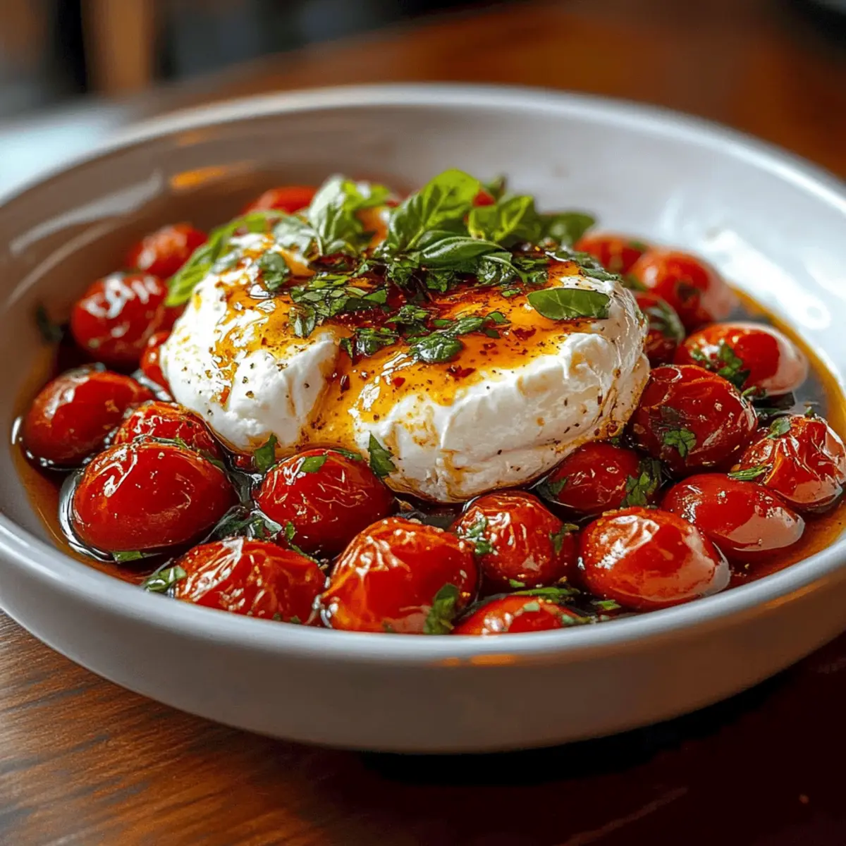 This Hot Honey Tomato Burrata Dip combines creamy burrata with blistered tomatoes and a sweet-spicy drizzle, making it the perfect vegetarian appetizer for gatherings.