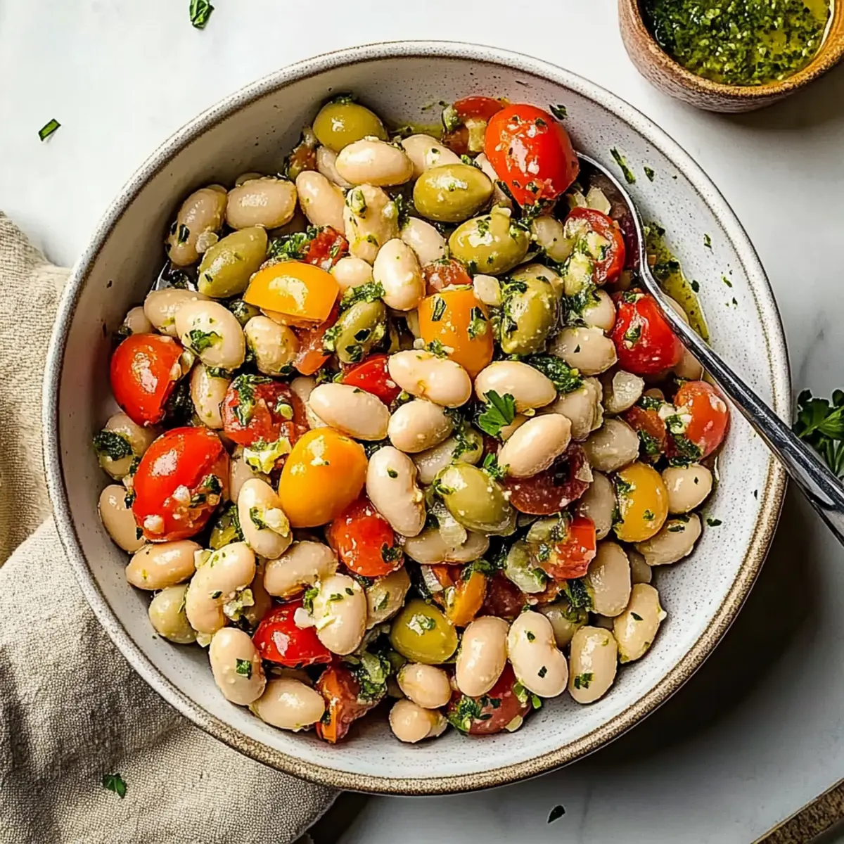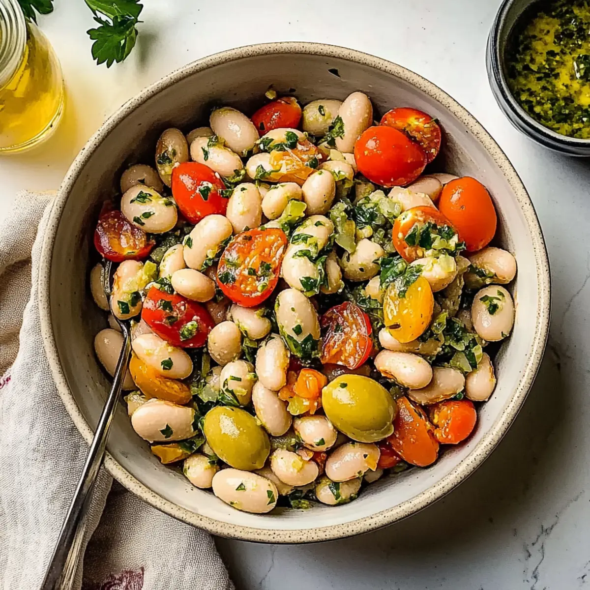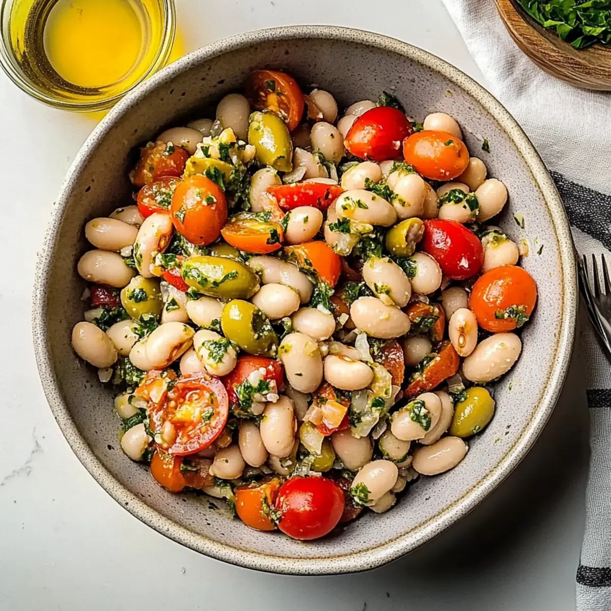 Jump to Recipe Print RecipeAs I tossed together the ingredients for this Italian White Bean Salad, the vivid colors of fresh cherry tomatoes and vibrant green herbs instantly brightened my kitchen. This quick and zesty Italian White Bean Salad recipe comes together in just under 20 minutes, making it the perfect answer to those busy afternoons when you want something light yet satisfying. With creamy cannellini beans as the base, complemented by tangy olives and a punchy salsa verde, this dish not only provides a delightful medley of flavors but also fits beautifully within gluten-free and vegetarian diets. Plus, it’s a no-cook delight—ideal for those evenings when the oven can stay off. Ready to freshen up your meal routine with this refreshing recipe? Let’s dive in! Why is this salad a must-try? Simplicity at its finest: This Italian White Bean Salad comes together in under 20 minutes, making it a lifesaver for busy weekdays. Rich, vibrant flavors: The creamy cannellini beans, fresh cherry tomatoes, and briny olives create a delightful medley that excites your palate. No-cook convenience: Perfect for those hot days when you want a refreshing meal without turning on the stove. Versatile: Feel free to add extras like tuna or some fresh veggies for a personalized twist. For other no-cook options, check out our delicious Mediterranean Chickpea Salad. Nutritious: Packed with plant-based protein and fiber, this salad is not only satisfying but also fits gluten-free and vegetarian diets! Crowd-pleasing: Whether served as a light lunch or a hearty side, this salad is sure to impress at gatherings. Italian White Bean Salad Ingredients For the Salad • Cannellini Beans – A creamy and soft base providing plant-based protein; can use any white bean if cannellini is unavailable. • Cherry Tomatoes – Adds sweetness and freshness, crucial for vibrant color; use any ripe tomato, chopped, in a pinch. • Nocellara or Castelvetrano Olives – Offers briny richness for a mild taste; any green olives could work depending on your preference. • Red Onion – Provides a sharpness and crunch to the mix; shallots can be substituted for a milder flavor. • Kosher Salt – Enhances all flavors; adjust based on the saltiness of the olives used. • Parmesan Shavings – Contributes nutty flavor and texture; replace with nutritional yeast for a vegan option. • Fresh Parsley and Basil – Essential for the herbaceous salsa verde that brightens the dish; other herbs like cilantro or mint can also work. For the Salsa Verde • Capers – Brings a salty, briny element to the dressing, elevating the flavor. • Garlic – Adds depth and aroma to the dish. • Anchovy Paste – Provides umami flavor; can be omitted or replaced with kosher salt for a vegan version. • Red Pepper Flakes – Delivers a gentle heat; adjust according to spice preference. • Black Pepper – Enhances the overall flavor profile. • Extra Virgin Olive Oil – Gives richness and is crucial in the salsa verde; use high-quality oil for the best taste. • Red Wine Vinegar – Adds acidity to balance the richness of the salad. Let’s get ready to whip up this Italian White Bean Salad recipe that’s not just a treat for your taste buds but also a breeze to prepare! Step‑by‑Step Instructions for Italian White Bean Salad Recipe Step 1: Prepare the Salsa Verde In a small bowl, mix together the fresh parsley and basil, capers, minced garlic, and anchovy paste if using. Drizzle in a generous amount of extra virgin olive oil and splash in red wine vinegar. Add a pinch of red pepper flakes and black pepper, whisking the mixture until it melds into a vibrant, aromatic dressing, ready to elevate your Italian White Bean Salad. Step 2: Combine the Main Ingredients In a medium mixing bowl, gently combine the drained cannellini beans, quartered cherry tomatoes, torn olives, and thinly sliced red onion. Sprinkle the mixture with kosher salt, ensuring even coverage, and toss lightly to distribute the ingredients while keeping the beans intact. This colorful blend will form the hearty base of your Italian White Bean Salad. Step 3: Dress the Salad Drizzle the prepared salsa verde over the colorful salad ingredients in the bowl. Using a rubber spatula, toss everything gently to coat without mashing the beans, allowing the creamy texture to harmonize with the vibrant flavors. The mixture should appear glossy and well-combined, showcasing the freshness of the salad. Step 4: Add Finishing Touches Once the salad is dressed, add freshly shaved parmesan on top, folding it in gently to incorporate while preserving the salad’s beautiful texture. If desired, add canned tuna for a protein boost, layering additional flavor complexity into your Italian White Bean Salad. Step 5: Serve or Chill For the best results, serve your salad immediately with crusty bread, or let it chill in the fridge for about 30 minutes to meld the flavors even more thoroughly. The refreshing taste will be enhanced as it sits, making it perfect for gatherings or a light lunch on those busy days. Expert Tips for the Italian White Bean Salad Chill for Flavor: Allow the salad to chill for at least 30 minutes before serving. This helps the flavors meld beautifully for a tastier dish. Quality Ingredients: Use ripe tomatoes and high-quality extra virgin olive oil for the best taste. Freshness makes your Italian White Bean Salad shine! Gentle Tossing: When mixing the salad, toss gently to keep the cannellini beans intact. Mashing them can change the salad’s delightful texture. Customize Wisely: Feel free to add extras like tuna or bell peppers, but be cautious not to overpower the original flavors of your Italian White Bean Salad. Keep It Fresh: If making ahead, hold off on adding parmesan and any proteins until just before serving to maintain freshness and texture. What to Serve with Quick and Zesty Italian White Bean Salad This colorful, no-cook salad pairs beautifully with vario