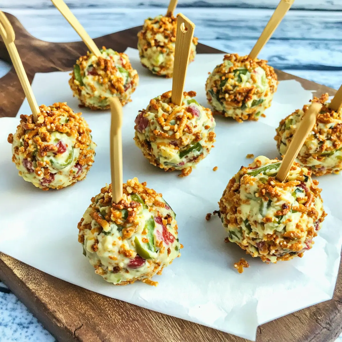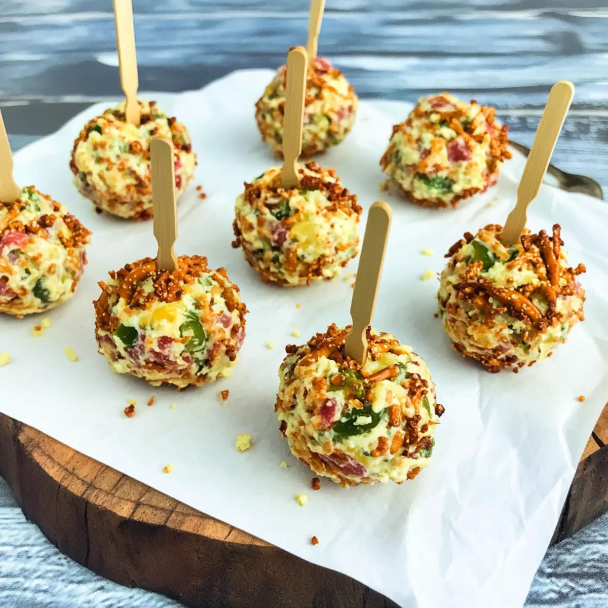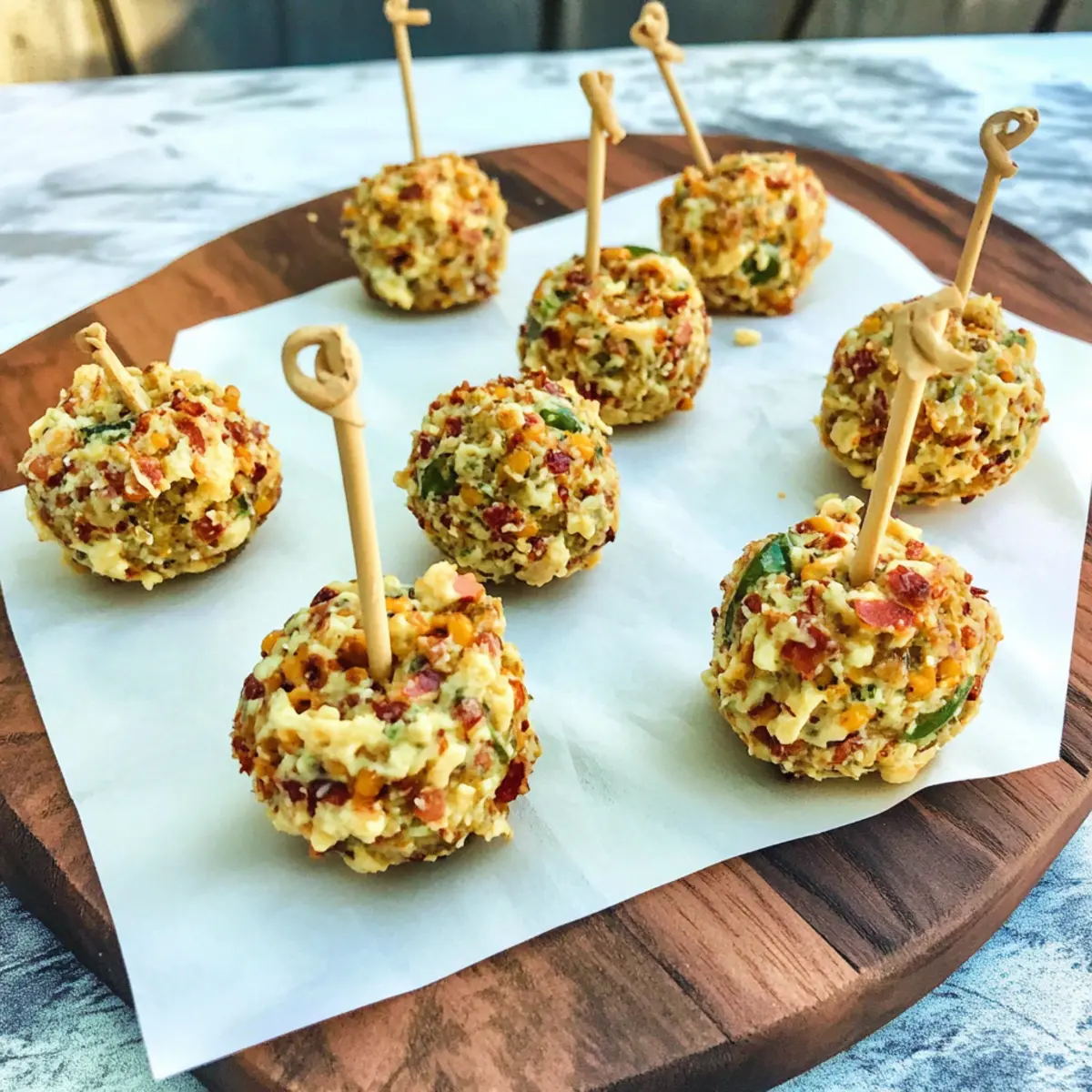 Jump to Recipe Print RecipeAs I rummaged through my fridge, I stumbled upon a lonely block of cream cheese just begging to be transformed into something delightful. That’s when I thought of these irresistible Jalapeno Cheese Ball Bites. These no-bake wonders are not only a breeze to prepare but are sure to steal the spotlight at your next gathering. With a creamy and savory filling that packs a punch, these bites marry the smoky flavor of bacon with the fiery kick of jalapenos, all encased in a crunchy pretzel coating. Perfect as a finger food and a guaranteed crowd-pleaser, they take just minutes to whip up, making them a go-to for last-minute parties or casual get-togethers. Ready to impress your friends and family with a dish that’s as fun to make as it is to eat? Let’s dive into this cheesy adventure! Why Are These Cheese Ball Bites So Irresistible? Unmatched Flavor: The blend of creamy cheese, smoky bacon, and zesty jalapenos creates an explosion of taste that keeps guests coming back for more. Simple Preparation: With no baking required, you’ll spend less time in the kitchen and more time enjoying your gathering! Versatile Appetizer: Pair these with an array of dips or serve alongside fresh veggie sticks for colorful and tasty options—just like with my Garlic Chili Bites! Crowd-Pleaser: These bites are perfect for all occasions, from game days to holiday parties, ensuring that everyone leaves satisfied. Easy Storage: Prepare them ahead of time and store for later, making unexpected guests a breeze. Can’t wait to whip up something fun? Try these delicious bites and make a lasting impression! Jalapeno Cheese Ball Bites Ingredients For the Filling • Cream Cheese – Provides a creamy base for these indulgent bites; low-fat options work great too. • Bacon – Adds a savory, smoky flavor; turkey bacon is a lighter alternative. • Jalapenos – Introduces spice and vibrant flavor; adjust the amount based on your heat preference. • Shredded Cheddar Cheese – Offers a sharp flavor that complements the other ingredients; pepper jack adds an extra kick. • Pecans – Adds crunch and richness; walnuts can be substituted or omitted for a nut-free version. For Coating and Serving • Pretzel Sticks – Used for coating and serving, providing a delightful crunch; crushed crackers or tortilla chips work too! • Seasonings (spices blend) – Essential for flavor enhancement; use garlic powder, onion powder, and smoked paprika to elevate your Jalapeno Cheese Ball Bites. Step‑by‑Step Instructions for Jalapeno Cheese Ball Bites Step 1: Mix the Filling In a large mixing bowl, combine the softened cream cheese, crispy bacon, finely chopped jalapenos, shredded cheddar cheese, and chopped pecans. Use a sturdy spatula or a hand mixer to blend everything until smooth and creamy; aim for a uniform consistency. This should take about 2-3 minutes, and you’ll know it’s ready when you no longer see lumps of cream cheese. Step 2: Form the Cheese Balls Once the filling is mixed, it’s time to create the Jalapeno Cheese Ball Bites. Using your hands, grab a small portion of the mixture (about 1-2 tablespoons) and roll it into a compact ball. Make sure the balls are tightly packed to avoid them falling apart. Continue this process until you have formed all the bites, which should yield around 12-16 pieces, depending on your ball size. Step 3: Coat the Cheese Balls To add that satisfying crunch, prepare your coating station. In a shallow dish, crush the pretzel sticks into small pieces. Carefully roll each cheese ball in the crushed pretzels, ensuring they are completely covered. This step adds flavor and texture to your Jalapeno Cheese Ball Bites, making them irresistible right from the start! Step 4: Chill to Set After coating the cheese balls, place them on a parchment-lined baking sheet. Cover them with plastic wrap and chill in the refrigerator for at least 1 hour. Chilling allows the cheese balls to firm up, making them easier to handle and enhancing their flavors. You’ll know they’re ready when they feel solid and the coating is set. Step 5: Serve and Enjoy Once your Jalapeno Cheese Ball Bites have chilled, arrange them on a serving platter and pair them with assorted crackers or fresh vegetable sticks for a colorful presentation. This delightful appetizer is perfect for sharing at parties, ensuring everyone can enjoy this creamy, spicy treat! Jalapeno Cheese Ball Bites Variations Feel free to get creative and make these bites your own with delightful twists and swaps! Dairy-Free: Use a plant-based cream cheese alternative and nutritional yeast for a cheesy flavor without the dairy. For a vegan option, adding a sprinkle of herbs can enhance the profile beautifully. Spicy Kick: Mix in finely diced habaneros or a dash of hot sauce for an extra layer of heat. This will take your cheese ball bites to the next level, ensuring every bite tantalizes your taste buds. Herbed Delight: Incorporate fresh herbs like cilantro or chives into your cheese mixture for a fresh burst of flavor. The vibrant colors and taste will elevate your appetizer, making it even more enticing. Crunchy Coating: Swap out pretzel sticks for crushed tortilla chips for a different crunchy texture. This could add a delightful crunch that pairs wonderfully with the creamy filling, making every bite more interesting. Sweet & Savory: Add some finely chopped dried cranberries or raisins to the filling for a sweet contrast to the savory elements. This unique combination will surprise your guests and leave them wanting more! Cheese Lovers: Try different cheese varieties, like blue cheese or goat cheese, for an unexpected twist. Each cheese offers its own unique flavor profile, resulting in an unforgettable snack you’ll love. Bacon-Free: Replace bacon with sautéed mushrooms for a hearty vegetarian option. The umami richness will still provide that savory depth, ensuring everyone can enjoy the bites! Garnish Inspired: 