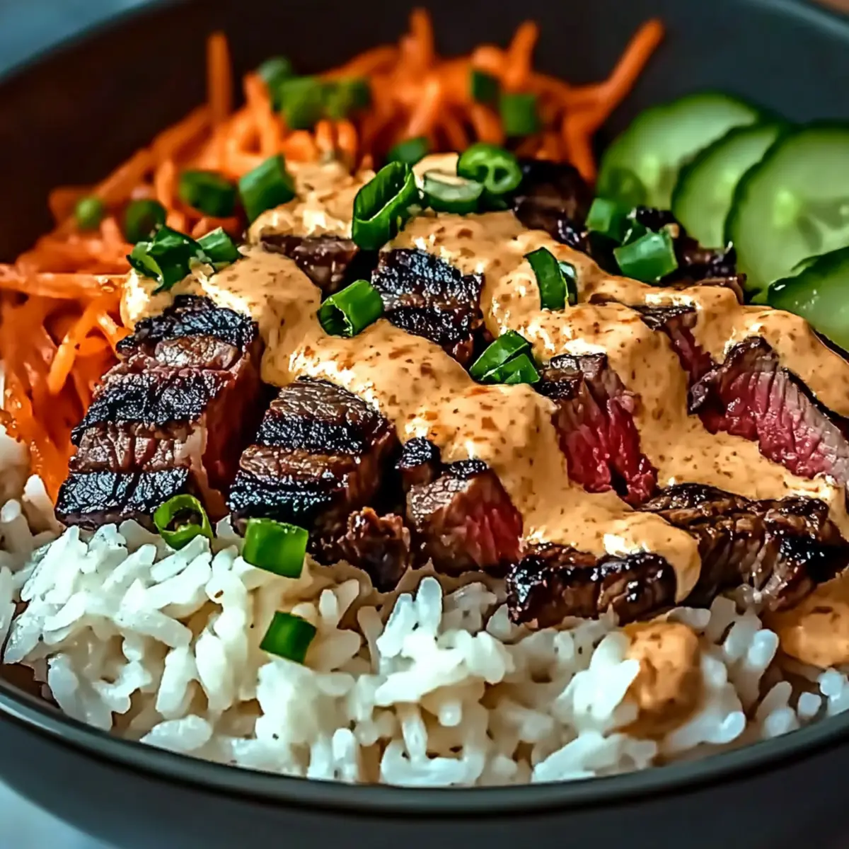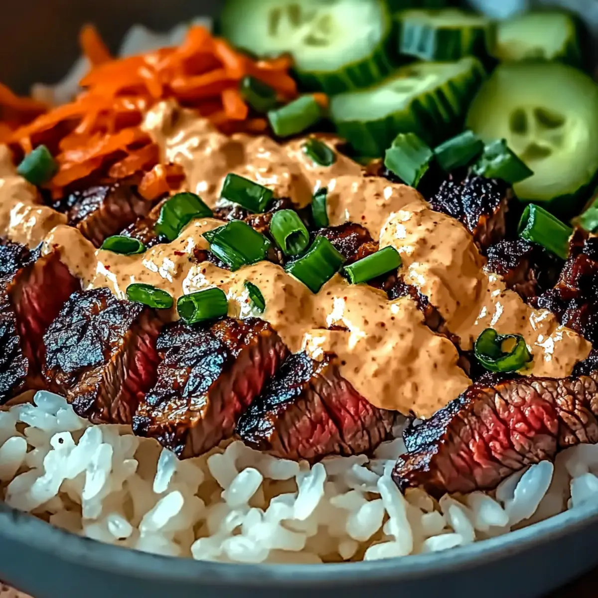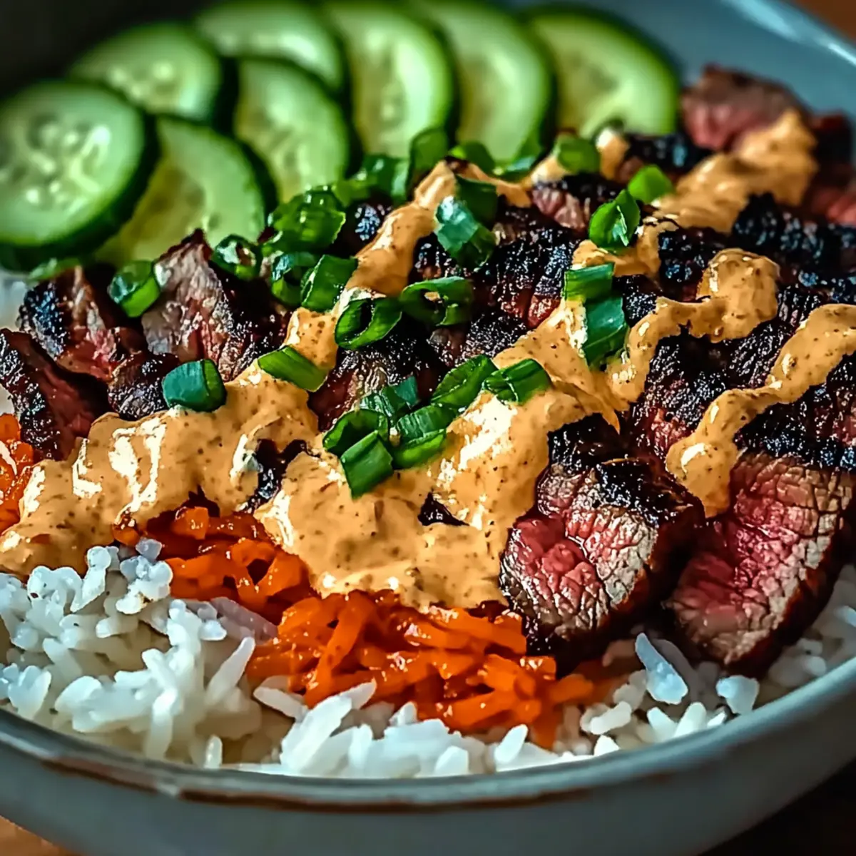 Jump to Recipe Print RecipeAs the enticing aroma of marinated flank steak wafts through the kitchen, I can’t help but feel a wave of excitement. My latest culinary adventure? Irresistibly Easy Korean BBQ Steak Rice Bowls with Spicy Cream Sauce! In just 25 minutes, you can whip up this quick meal that balances savory steak, vibrant veggies, and a creamy, spicy sauce, making it a showstopper for busy weeknights. The beauty of this dish lies in its incredible customization potential—swap in marinated tofu for a vegetarian option or toss on your favorite toppings to create a personal touch. Plus, it’s gluten-free if you opt for gluten-free soy sauce! So, are you ready to turn your dinner routine into something extraordinary? Let’s dive into this delicious recipe! Why are these rice bowls a must-try? Quick and Easy: You can enjoy these Korean BBQ Steak Rice Bowls in just 25 minutes, perfect for those hectic weeknights. Customizable: Use marinated tofu for a vegetarian delight or your favorite toppings for a unique spin. Incredible Flavor: The spicy cream sauce adds a rich, zesty touch that will impress any guest. Nutritionally Balanced: With around 600 calories per bowl, it’s a wholesome meal that pleases your palate. Crowd-Pleaser: This dish is sure to become a family favorite, reminiscent of dining at a trendy restaurant. After you try these, consider pairing them with a refreshing side like Asian slaw or even a Baked Cod Sauce for a complete meal experience! Korean BBQ Steak Rice Bowls Ingredients For the Steak Marinade Flank Steak – Main protein that provides a rich flavor; substitute with sirloin or ribeye if desired. Vegetable Oil – Used for marinating, adding moisture; olive oil is a good alternative. Sesame Oil – Enhances flavor with a nutty aroma; adjust according to your taste preferences. Soy Sauce – A source of umami essential for the marinade; use gluten-free soy sauce for a gluten-free version. Brown Sugar – Adds sweetness to balance savory and spicy elements; honey can also be used. Garlic – Provides depth to the marinade; minced garlic works best for flavor. Ginger – Adds warmth and spice, complementing the soy sauce; fresh grated ginger is ideal. Black Pepper – Adds mild heat and seasoning. For the Rice Bowls Cooked Jasmine Rice – Serves as the base; substitute quinoa or cauliflower rice for a low-carb option. Green Onions – Fresh flavor and crunch; perfect for topping. Shredded Carrots – Adds texture and sweetness; bell peppers or snap peas can be used as substitutes. Cucumber – Provides crispness and a cooling element. For the Spicy Cream Sauce Mayonnaise – Base for the sauce that adds creaminess; Greek yogurt is a healthy alternative. Sriracha Sauce – Adds the desired heat; adjust to taste for your spice preference. Lime Juice – Brightens flavors with acidity; lemon juice can be used as a substitute. Honey – Sweetens the sauce and balances the spice; agave syrup serves for a vegan option. Salt – Essential for seasoning; adjust to taste as needed. These Korean BBQ Steak Rice Bowls are not just a meal—they’re a delightful experience waiting to happen! Step‑by‑Step Instructions for Korean BBQ Steak Rice Bowls with Spicy Cream Sauce Step 1: Marinate the Steak In a mixing bowl, whisk together vegetable oil, sesame oil, soy sauce, brown sugar, minced garlic, grated ginger, and black pepper to create a luscious marinade. Coat the flank steak fully, cover with plastic wrap, and let it sit in the refrigerator for at least 30 minutes or up to 2 hours, allowing those flavors to penetrate beautifully. Step 2: Prepare Spicy Cream Sauce In a separate bowl, combine mayonnaise, sriracha, lime juice, honey, and salt. Whisk until smooth, and adjust the sriracha according to your preferred spice level. Let the spicy cream sauce rest for a few moments, allowing the flavors to meld, creating a creamy, zesty condiment that perfectly complements the Korean BBQ Steak Rice Bowls. Step 3: Cook the Steak Preheat a grill pan over medium-high heat for about 5 minutes. Once hot, place the marinated flank steak on the pan and grill for 4-5 minutes per side, aiming for a medium-rare doneness at 130°F. You’ll know it’s ready when a delicious, smoky aroma fills the kitchen. Let the steak rest for a few minutes before slicing it against the grain for maximum tenderness. Step 4: Assemble Bowls In individual bowls, start with a generous layer of cooked jasmine rice as the base. Top the rice with slices of the grilled flank steak, then add a vibrant mix of green onions, shredded carrots, and crunchy cucumber. This colorful assembly will not only look appetizing but also provide a beautiful balance of flavors and textures in your Korean BBQ Steak Rice Bowls. Step 5: Top and Serve Drizzle the prepared spicy cream sauce generously over the assembled rice bowls. For an extra touch, consider garnishing with toasted sesame seeds. Serve immediately, enjoying the mix of savory steak, fresh veggies, and the creamy, spicy sauce that elevates your Korean BBQ Steak Rice Bowls to a delectable dining experience. Make Ahead Options These Korean BBQ Steak Rice Bowls with Spicy Cream Sauce are fantastic for meal prep, allowing you to savor homemade goodness on your busy weeknights! You can marinate the flank steak up to 24 hours in advance, enhancing the flavors. For the spicy cream sauce, prepare it ahead of time and refrigerate—this allows the flavors to meld beautifully. Chop your veggies, like green onions and cucumbers, and store them in airtight containers for up to 3 days. To maintain freshness, assemble the bowls right before serving, keeping the sauce separate until you’re ready to dig in. This way, you’ll enjoy delicious, hassle-free dinners with just a little preparation! Korean BBQ Steak Rice Bowls Variations Feel free to get creative with these rice bowls and make them your own taste adventure! Vegetarian Option: Swap flank steak for marinated tofu or 