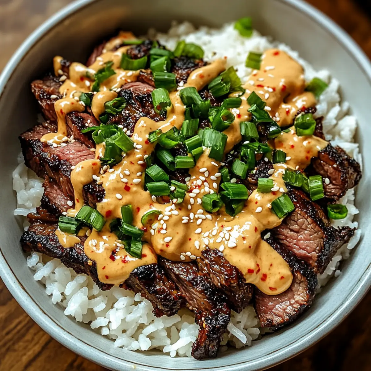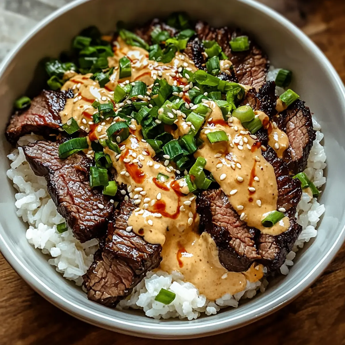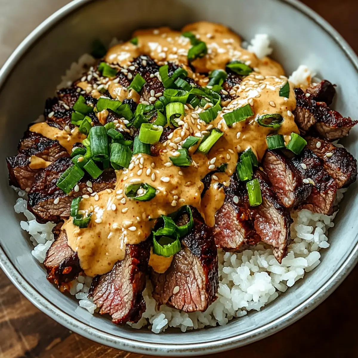 6. Assemble bowls by placing rice, sliced steak, drizzling sauce, and garnishing with green onions and sesame seeds.