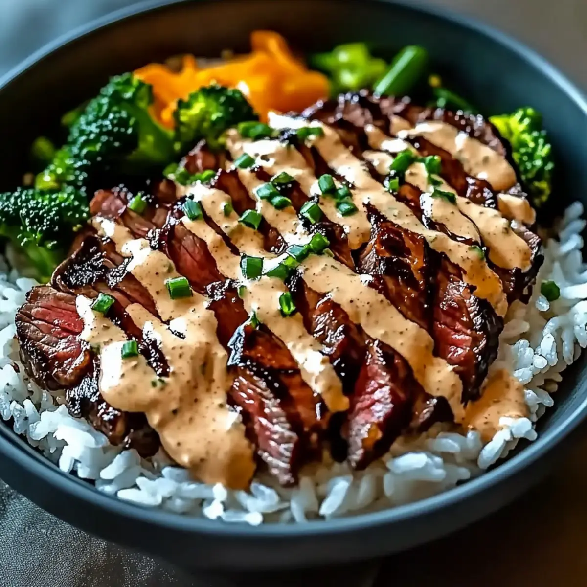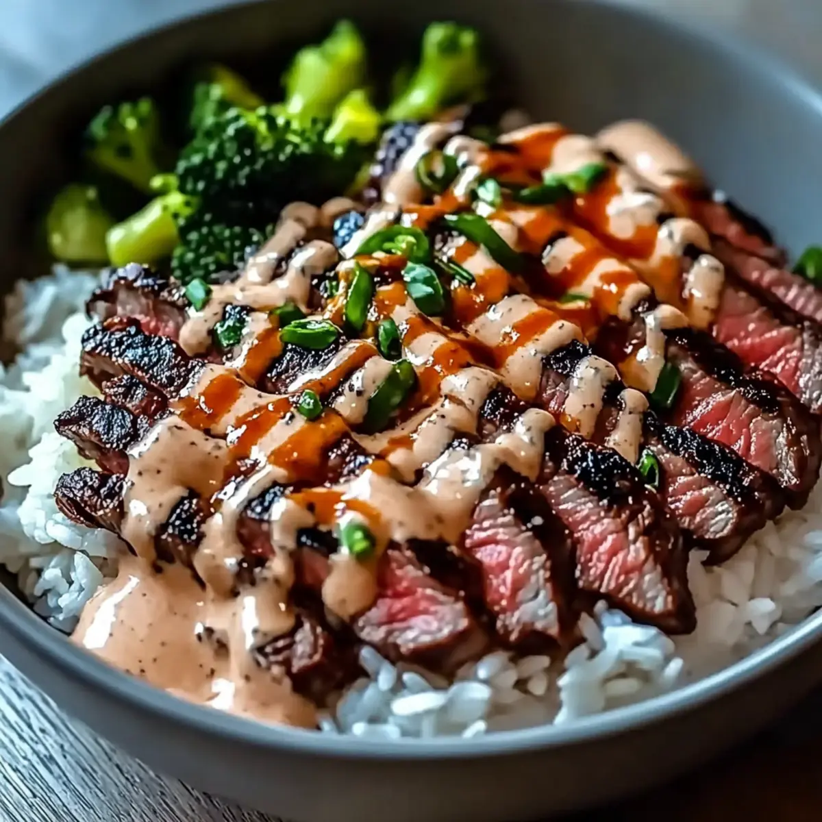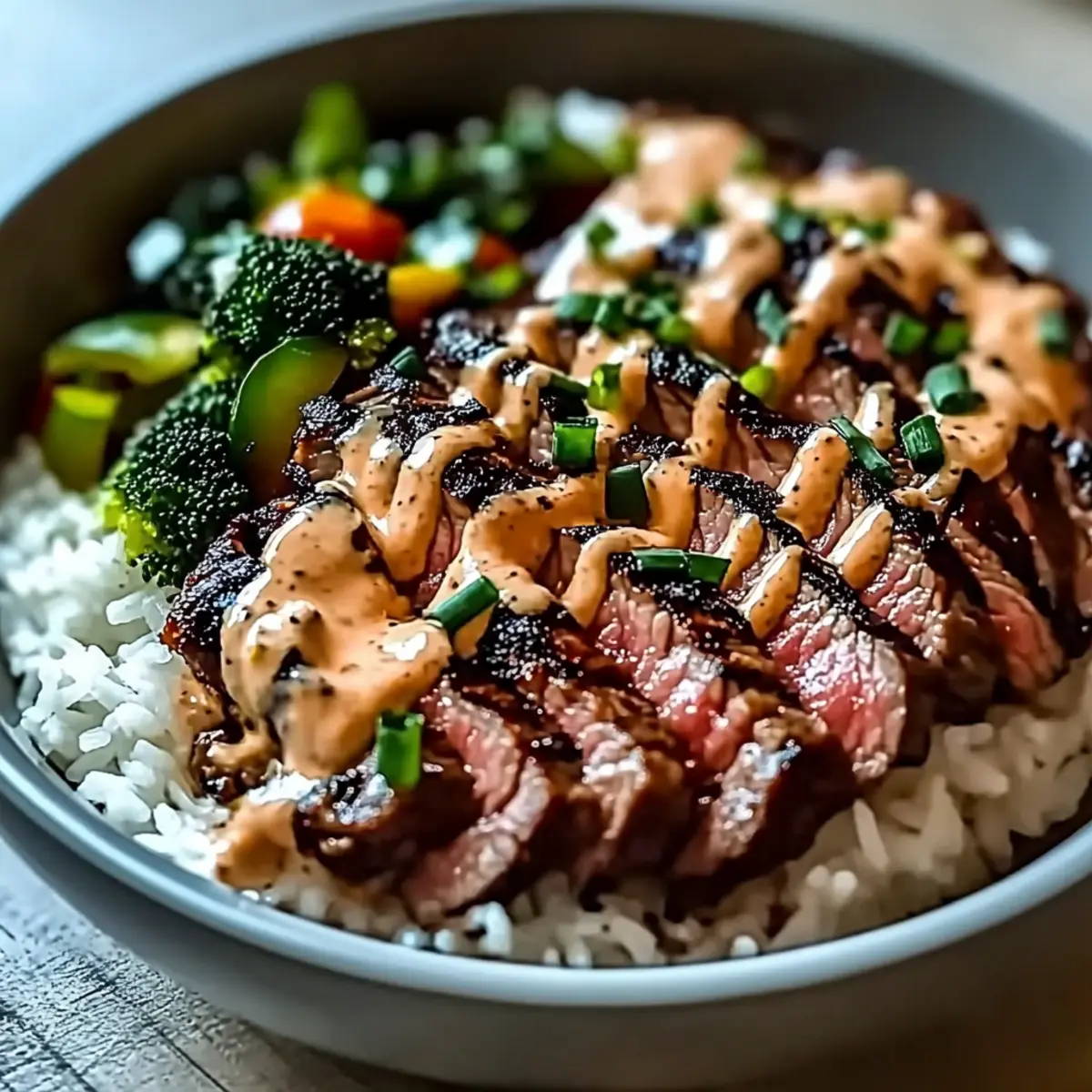 Jump to Recipe Print RecipeAs I stood over the sizzling pan, the aroma of marinated flank steak filled my kitchen, taking me straight to the vibrant streets of Seoul. Korean BBQ Steak Rice Bowls with Spicy Cream Sauce are my secret weapon for busy weeknights, combining savory marinated steak, fluffy rice, and a creamy sauce that’s as customizable as it is satisfying. Not only does this dish come together in no time, but it’s also visually stunning, making it an instant crowd-pleaser for family and friends. Whether you’re craving a hearty meal or simply want to elevate your weeknight dinner routine, these rice bowls deliver comfort and style. Ready to discover the magic of Korean BBQ in your own home? Let’s dive in! Why Are These Rice Bowls So Special? Explosive flavors: Each bite bursts with the rich umami of marinated flank steak and the creamy heat of the spicy sauce. Quick & Easy: Perfectly suited for busy weeknights, you can whip this up in about 30 minutes. Customizable options: Swap ingredients based on your preferences—try chicken or tofu for a twist! Nutritionally balanced: With protein, healthy fats, and carbs, these bowls offer a wholesome meal without sacrificing taste. Visual appeal: The vibrant colors of the ingredients make this dish not just delicious but a true feast for the eyes! Don’t miss out on making these delightful Korean BBQ Steak Rice Bowls; they’re sure to become a family favorite! Korean BBQ Steak Rice Bowls Ingredients Get ready to create a dining experience straight from your kitchen with these essential ingredients! For the Steak Marinade Flank Steak – The star of the dish, providing a tender, rich flavor; feel free to substitute with sirloin or ribeye. Soy Sauce – Adds a savory umami depth; opt for low-sodium soy sauce for a healthier alternative. Brown Sugar – Balances the saltiness with a touch of sweetness; coconut sugar makes for a great swap. Sesame Oil – Infuses a nutty aroma; switch to olive oil for a lighter flavor. Minced Garlic – Enriches the marinade with authentic taste; fresh garlic is preferable, but garlic powder works in a pinch. Grated Ginger – Adds a zesty kick to the marinade; ground ginger is a fine substitute if used sparingly. For the Base Cooked Rice – The perfect bed for the steak and veggies; white or brown rice works well, or try jasmine rice for added flavor. Vegetables – Brighten up your bowl with your favorites, like bell peppers, broccoli, or carrots. For the Creamy Spicy Sauce Sour Cream – Forms the creamy base of the sauce; Greek yogurt can be a lighter substitute. Gochujang – Provides a kick of heat and depth to the sauce; if you prefer more spice, sriracha is a fantastic alternative. Honey – Adds a sweet kick to balance the spice; maple syrup can replace it for a vegan option. Lime Juice – Introduces a refreshing acidity; lemon juice can also be swapped in. For Serving Sesame Seeds – Enhances garnishing and adds a nutty crunch; optional but adds authenticity. Green Onions – Offers a fresh finish as a garnish; use chives as a substitute if needed. Equip yourself with these flavorful ingredients to embark on a culinary adventure with Korean BBQ Steak Rice Bowls; your taste buds will thank you! Step‑by‑Step Instructions for Korean BBQ Steak Rice Bowls Step 1: Marinate the Steak In a mixing bowl, combine soy sauce, brown sugar, sesame oil, minced garlic, and grated ginger to create a flavorful marinade. Coat the flank steak evenly with this mixture, ensuring every inch is covered. Allow the steak to marinate for at least 30 minutes at room temperature or refrigerate for up to 2 hours to enhance the flavors. Step 2: Cook the Rice While the steak marinates, prepare the rice according to package instructions. Typically, this involves rinsing the rice under cold water, then boiling it in a pot with water. For fluffy, perfectly cooked rice, allow it to simmer for about 15-20 minutes. Once done, remove from heat and let it sit covered for another 5 minutes before fluffed with a fork. Step 3: Make the Spicy Cream Sauce In a small bowl, mix together sour cream, gochujang, honey, and lime juice until smooth and creamy. Taste the sauce and adjust the spice level by adding more gochujang if desired. Set the sauce aside, as it will complement the flavors of the Korean BBQ Steak Rice Bowls beautifully. Step 4: Prepare the Vegetables Wash and chop your chosen vegetables into bite-sized pieces. This could include vibrant bell peppers, fresh broccoli, or colorful carrots. Aim for a mix that will add color, crunch, and nutrition to your Korean BBQ Steak Rice Bowls and set them aside in a bowl. Step 5: Cook the Steak In a large skillet, heat vegetable oil over medium-high heat until shimmering. Carefully add the marinated flank steak and cook for about 4-5 minutes on each side for medium-rare. Look for a beautifully browned exterior while ensuring the internal temperature reaches around 130°F (54°C) for perfect tenderness. Step 6: Sauté the Vegetables Using the same skillet, after removing the steak, add the chopped vegetables. Stir-fry them over medium heat for 3-5 minutes, or until they are tender-crisp. You want them vibrant and slightly tender, which will provide a delightful contrast to the creamy sauce and savory steak. Step 7: Slice the Steak Once cooked, transfer the steak to a cutting board and let it rest for 5 minutes. This step is vital to keep the juices locked in and maintain tenderness. After resting, slice the steak against the grain into thin, manageable pieces that will perfectly fit atop your rice. Step 8: Assemble the Bowls Take serving bowls and layer with a generous portion of fluffy rice. Top each bowl with the sliced steak and the sautéed vegetables. Arrange them artfully for a stunning presentation that highlights the colorful ingredients of your Korean BBQ Steak Rice Bowls. Step 9: Drizzle the Sauce Finish off by drizzling the spicy cream sauce generously over the assemb