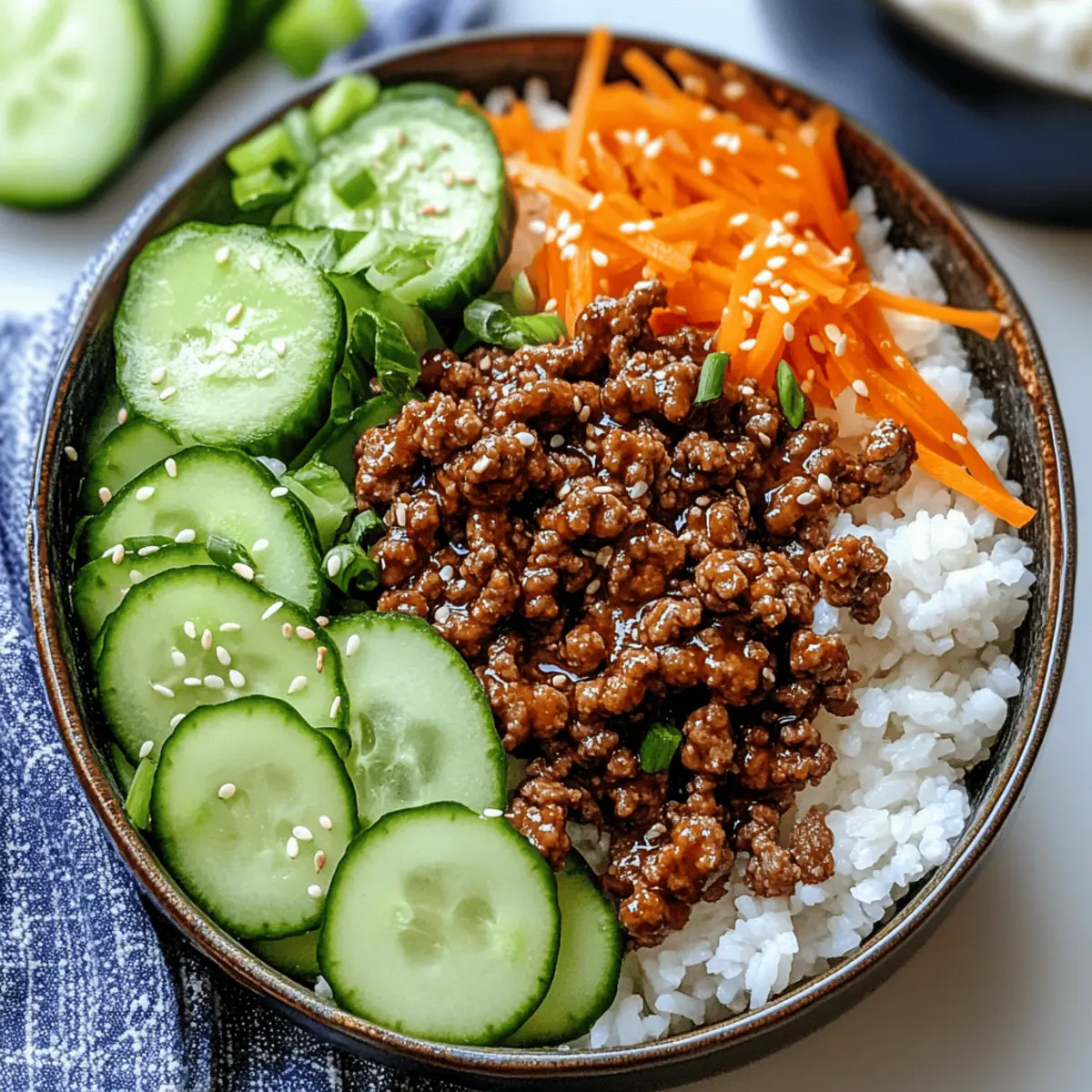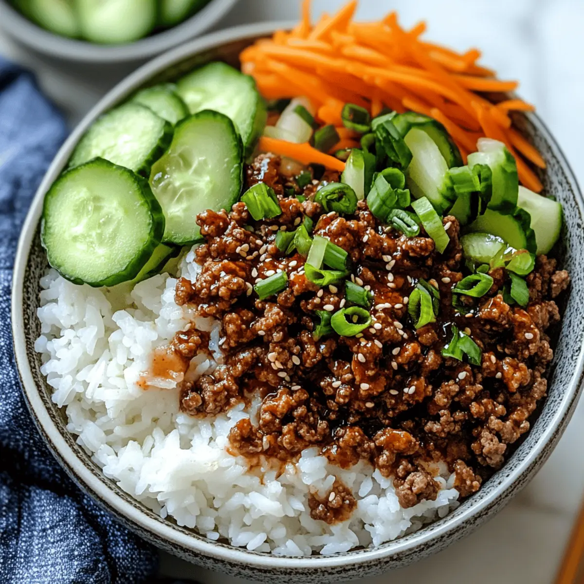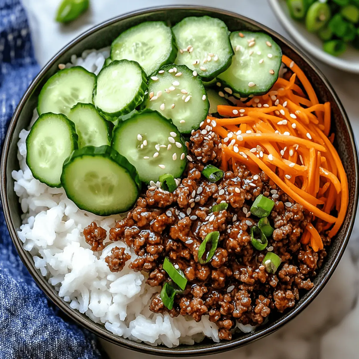 Jump to Recipe Print RecipeThe aroma of sizzling garlic and ginger fills the kitchen, transporting me straight to a bustling Korean street market, where the air is rich with the promise of delicious flavors. Today, I’m excited to share my Quick & Easy Korean Ground Beef Bowl, a dish that takes just 20 minutes to whip up, making it a perfect choice for busy weeknights. With its comforting blend of savory ground beef, fluffy rice, and crunchy vegetables, this recipe offers a fantastic homemade alternative to your favorite takeout, minus the mystery ingredients. Plus, it’s protein-rich and can easily be customized with whatever veggies you have on hand. I can’t wait for you to dive into this simple yet satisfying meal—what’s your favorite topping to add for that extra pop? What makes this bowl so irresistible? Quick cooking time: You can have this delicious meal ready in just 20 minutes, making it a go-to for busy weeknights. Flavors that pop: The combination of caramelized garlic, ginger, and savory soy sauce creates an incredibly enticing aroma and flavor that you’ll love! Customizable: Feel free to swap in your favorite veggies or proteins, whether that’s ground turkey or even tofu for a vegetarian twist. Homemade goodness: Say goodbye to fast food; this dish offers a healthier alternative with fresh ingredients you control. Crowd-pleaser: Perfect for family dinners or meal prep, this bowl is sure to satisfy everyone’s cravings. If you’re interested in more comforting recipes, check out this delicious Beef Stew Hearty that also brings warmth to your table. Korean Ground Beef Bowl Ingredients For the Beef • Ground Beef – Opt for lean cuts for a healthier protein boost. • Soy Sauce – Adds a rich umami flavor; low-sodium options are great for health-conscious cooks. • Brown Sugar – Balances savory notes; you can substitute with honey or maple syrup for a natural sweetness. • Garlic – Use fresh minced garlic to enhance flavor; it’s a crucial aromatic in our Korean Ground Beef Bowl. • Ginger – Fresh grated ginger brings warmth and spice; it’s best for keeping that authentic taste. For the Rice Base • Rice – Choose white, brown, or jasmine rice as your hearty base for this delightful bowl. For the Veggies • Vegetables (e.g., cucumbers, carrots, spinach) – These provide color, crunch, and nutrition; feel free to mix in your favorites! Optional Toppings • Sesame Seeds – Sprinkle for added crunch and nuttiness. • Green Onions – Freshly chopped enhances flavor and gives your bowl a vibrant look. Dive into these wonderful ingredients and get ready to create your very own comforting Korean Ground Beef Bowl! Step‑by‑Step Instructions for Quick & Easy Korean Ground Beef Bowl Step 1: Brown the Beef In a large skillet, heat over medium-high heat and add the ground beef. Cook for about 5 minutes, breaking it apart with a wooden spoon until browned and no longer pink. As the beef cooks, it should become nicely caramelized, indicating it’s ready for the next step. Step 2: Sauté Aromatics Carefully drain any excess fat from the skillet, ensuring you retain the rich flavor. Then, add minced garlic and freshly grated ginger to the skillet. Stir constantly for about 1 minute, allowing the aromatic ingredients to cook and release their enticing fragrances. You’ll know they’re ready when the garlic becomes golden and fragrant. Step 3: Combine Ingredients Next, pour in the soy sauce and sprinkle in the brown sugar, stirring well to combine everything. Let the mixture cook for an additional 2-3 minutes, allowing the flavors to meld together beautifully. You should see a slight bubbling in the sauce as it thickens, enveloping the ground beef in a savory glaze. Step 4: Prepare the Rice While the beef mixture is cooking, prepare your rice according to package instructions. Aim for fluffy, warm rice that will serve as the comforting base of your Korean Ground Beef Bowl. This typically takes about 15 minutes, so you can start this step to overlap with cooking the beef. Step 5: Assemble the Bowl Once you have your rice ready and the beef mixture is well combined, it’s time to assemble your Korean Ground Beef Bowl. Spoon a generous portion of warm rice into each bowl, then top with the savory ground beef mixture. The vibrant colors should start to come together beautifully, making your dish visually appealing. Step 6: Add Fresh Veggies Top your bowl with sliced cucumbers, shredded carrots, or sautéed spinach for a refreshing crunch and a splash of color. These fresh vegetables not only enhance the dish’s appeal but also add a nutritious element. Make sure to arrange them artistically for that perfect presentation! Step 7: Garnish and Serve Finally, add your choice of optional toppings, such as a sprinkle of sesame seeds or freshly chopped green onions. These garnishes will elevate the flavors and presentation of your Quick & Easy Korean Ground Beef Bowl. Serve immediately while it’s hot, and let the comforting aromas fill your home! Storage Tips for Korean Ground Beef Bowl Fridge: Store leftovers in an airtight container for up to 3 days to maintain freshness and flavor. Freezer: For longer storage, place the beef mixture in a freezer-safe container for up to 3 months. Thaw in the fridge overnight before reheating. Reheating: Reheat individual portions in the microwave or on the stovetop, adding a splash of water or broth to keep the beef moist. Rice Storage: Keep cooked rice separate in another airtight container, as it can become sticky when stored with the beef mixture. Enjoy the Korean Ground Beef Bowl fresh for best results! Make Ahead Options These Quick & Easy Korean Ground Beef Bowls are a fantastic option for meal prep, making your busy weeknights much smoother! You can cook the ground beef mixture up to 3 days in advance; simply let it cool, then refrigerate in an airtight container. To maintain the best quality, ensure the mixture is w