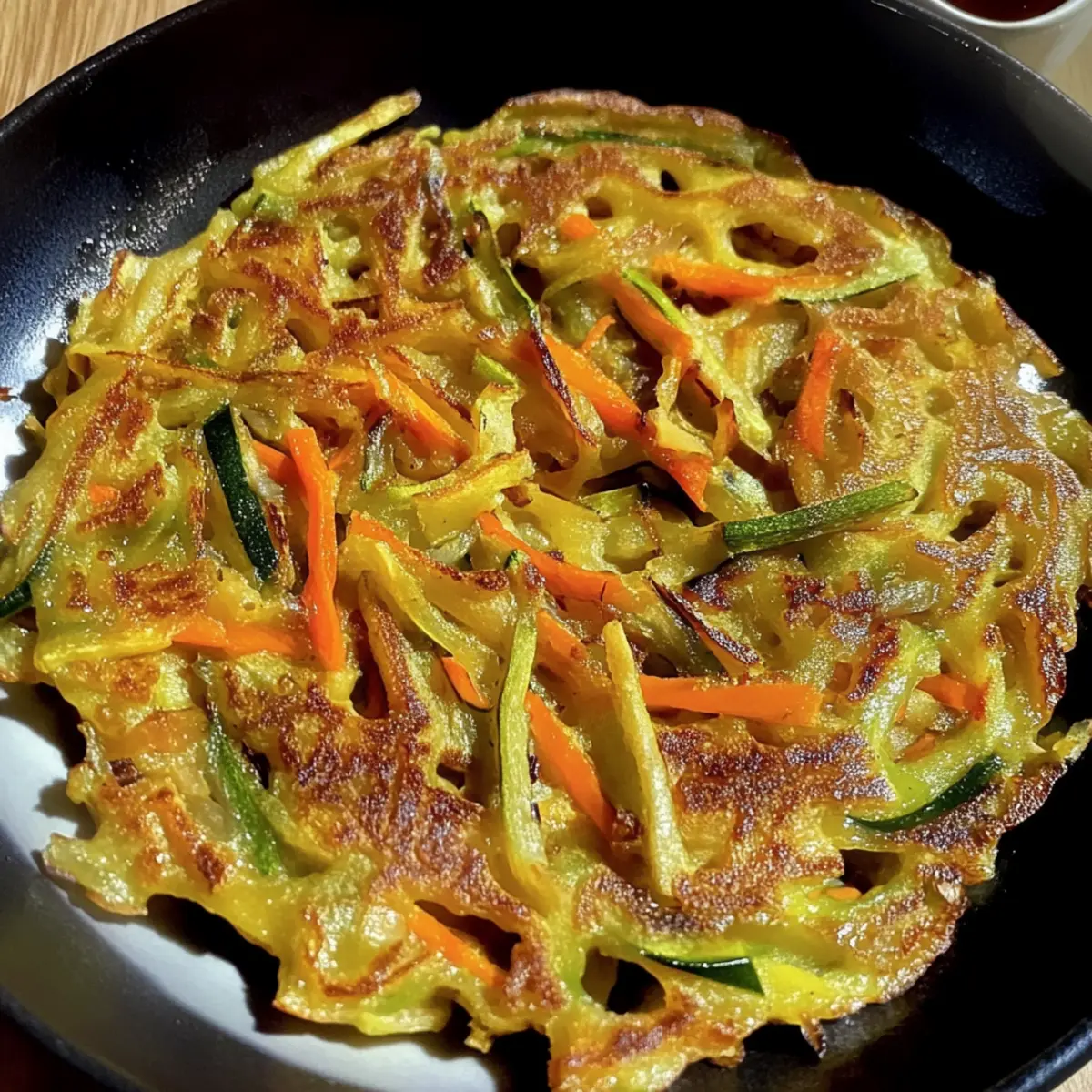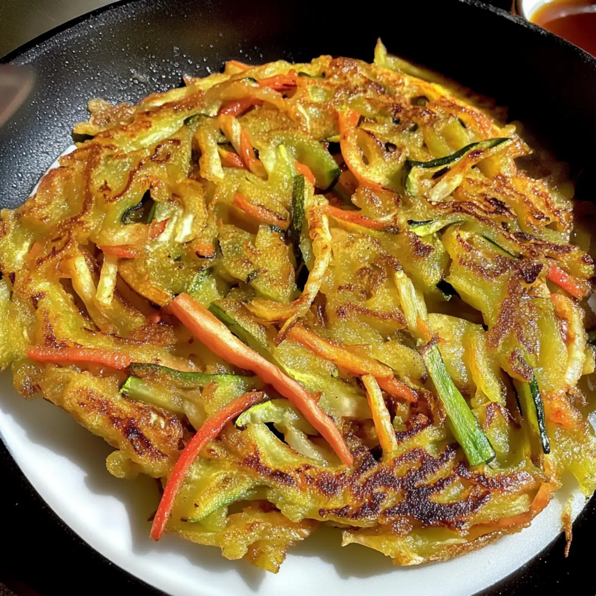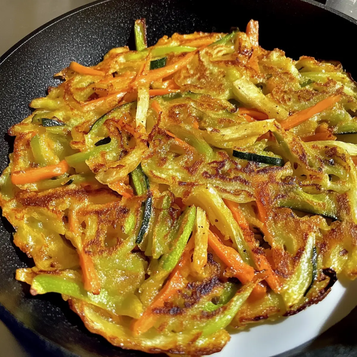 Spoon a ladleful of the vegetable batter into the skillet, spreading it thinly with the back of the ladle. Cook for about 3-4 minutes on one side, or until the edges turn golden brown and crispy. Carefully flip the pancake using a spatula, and cook for an additional 2-3 minutes or until the second side is also golden and crispy.