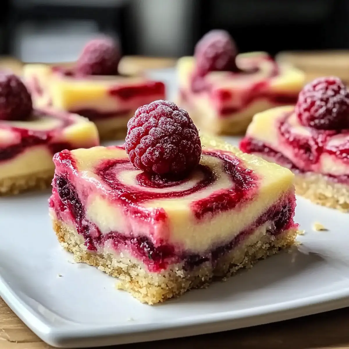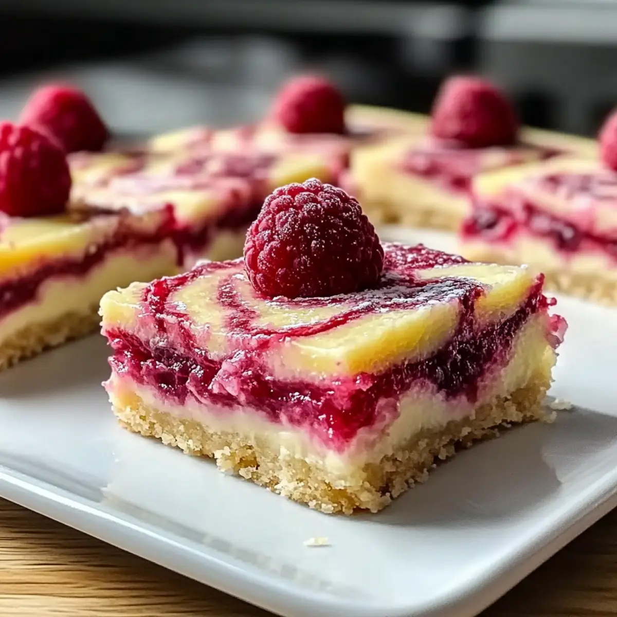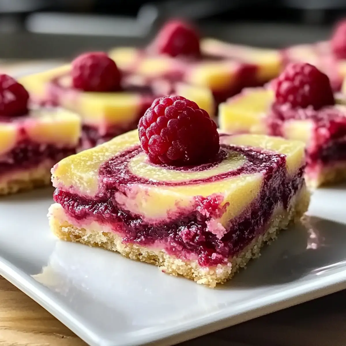 Jump to Recipe Print RecipeAs I pulled the warm Lemon Raspberry Swirl Bars from the oven, the zesty aroma danced through my kitchen, instantly brightening my mood. These delightful bars are not just a treat for the taste buds; they are a quick dessert that even the busiest home chef can whip up with ease. The combination of tart lemon and sweet raspberry creates a refreshing experience that’s perfect for any occasion—whether you’re hosting friends or simply indulging in a cozy night in. Plus, with a gluten-free adaptation available, everyone can join in on the fun! Curious to see how these vibrant, mouthwatering bars come together? Let’s dive into the recipe! Why Make Lemon Raspberry Swirl Bars? Simplicity: This quick dessert requires minimal effort, making it ideal for busy schedules. Versatility: Feel free to switch out raspberries for blueberries or create a gluten-free version—all delicious options! Flavor Explosion: The blend of tangy lemon and sweet berries creates a refreshing burst that will delight your palate. Crowd-Pleaser: Perfect for gatherings, these bars are sure to impress friends and family alike. Pair them with a cup of tea or coffee for an afternoon treat! Make-Ahead Friendly: Easily store in an airtight container for snacks throughout the week, just like my Banana Split Bars! Lemon Raspberry Swirl Bars Ingredients For the Batter • All-purpose flour – Provides structure for the bars. Substitute with a gluten-free flour blend for a gluten-free version. • Granulated sugar – Sweetens the bars and balances the tartness of the raspberries. • Salt – Enhances the flavor. • Unsalted butter (melted) – Adds richness and moisture. • Large egg – Binds the ingredients together and helps the bars set. • Vanilla extract – Introduces warmth and depth of flavor. For the Swirl • Fresh raspberries (or frozen, thawed) – Imparts tartness and vibrant color; ensure frozen raspberries are thawed and drained to prevent excess moisture. • Fresh lemon juice – Provides the necessary acidity and zestiness for lemon raspberry swirl bars. • Lemon zest – Enhances the lemon flavor and adds aromatic oils. For Garnishing • Powdered sugar – Ideal for dusting the top, adding a sweet finish to your delightful bars. Step‑by‑Step Instructions for Lemon Raspberry Swirl Bars Step 1: Preheat and Prepare Begin by preheating your oven to 350°F (175°C). While the oven warms up, prepare an 8×8-inch baking dish by greasing it with butter or lining it with parchment paper, allowing easy removal later. This will create a perfect base for your Lemon Raspberry Swirl Bars, ensuring they bake evenly and release beautifully. Step 2: Combine Dry Ingredients In a medium mixing bowl, whisk together the all-purpose flour, granulated sugar, and salt until well combined. This is an important step, as it helps to evenly distribute the ingredients and ensure a consistent texture. Once mixed, it’s time to add the melted butter, egg, and vanilla extract, stirring until everything is fully incorporated and you see a smooth batter forming. Step 3: Pour and Spread the Batter Next, pour the batter into your prepared baking dish, using a spatula to spread it evenly into the corners. Make sure the surface is as level as possible for uniform baking. You’ll want to see a nice, smooth layer of batter that will become the delightful foundation for your lemon raspberry swirl bars. Step 4: Prepare the Raspberry Mixture In a separate bowl, take your fresh (or thawed) raspberries and gently mash them with a fork until they become a chunky puree. Add in the fresh lemon juice and lemon zest, stirring to combine. This mixture will add a vibrant pop of flavor and color to your bars, creating a beautiful swirl that contrasts perfectly with the batter. Step 5: Create the Swirl Drop spoonfuls of the raspberry mixture over the batter in the baking dish. Use a knife or toothpick to gently swirl the raspberry mixture into the batter, being careful not to over-mix. You want to create a gorgeous marbled effect on the surface of your Lemon Raspberry Swirl Bars, allowing those vibrant colors to peek through. Step 6: Bake to Perfection Place the baking dish in the preheated oven and let the bars bake for 25 to 30 minutes. As they bake, look for the edges to turn a lovely golden brown, and a toothpick inserted in the center should come out clean. This is how you know that your lemon raspberry swirl bars are done and ready to cool. Step 7: Cool and Serve Once baked, remove the dish from the oven and allow it to cool in the pan for about 10 minutes. Afterward, carefully lift the bars out using the edges of the parchment paper and place them on a wire rack to cool completely. Before serving, dust with powdered sugar for a touch of sweetness, creating a delightful finish for your refreshing Lemon Raspberry Swirl Bars. How to Store and Freeze Lemon Raspberry Swirl Bars Room Temperature: Keep the bars in an airtight container at room temperature for up to 3 days. Enjoy them fresh and flavorful during this time! Fridge: For longer freshness, store in the refrigerator for up to a week. Ensure they are covered properly to maintain their taste and texture. Freezer: Freeze the Lemon Raspberry Swirl Bars in an airtight container for up to 3 months. Wrap them individually in plastic wrap for easy portioning. Reheating: Before enjoying frozen bars, let them thaw in the fridge overnight. You can also microwave a single bar for 10-15 seconds for a warm, delightful treat! Make Ahead Options These Lemon Raspberry Swirl Bars are perfect for meal prep enthusiasts looking to save time! You can prepare the batter up to 24 hours in advance by mixing the dry and wet ingredients separately and storing them in the fridge. Furthermore, the raspberry swirl can be prepped and refrigerated as well, so all you need to do is combine them for baking right before serving. When ready to enjoy these delightful bars, simply pour the batte