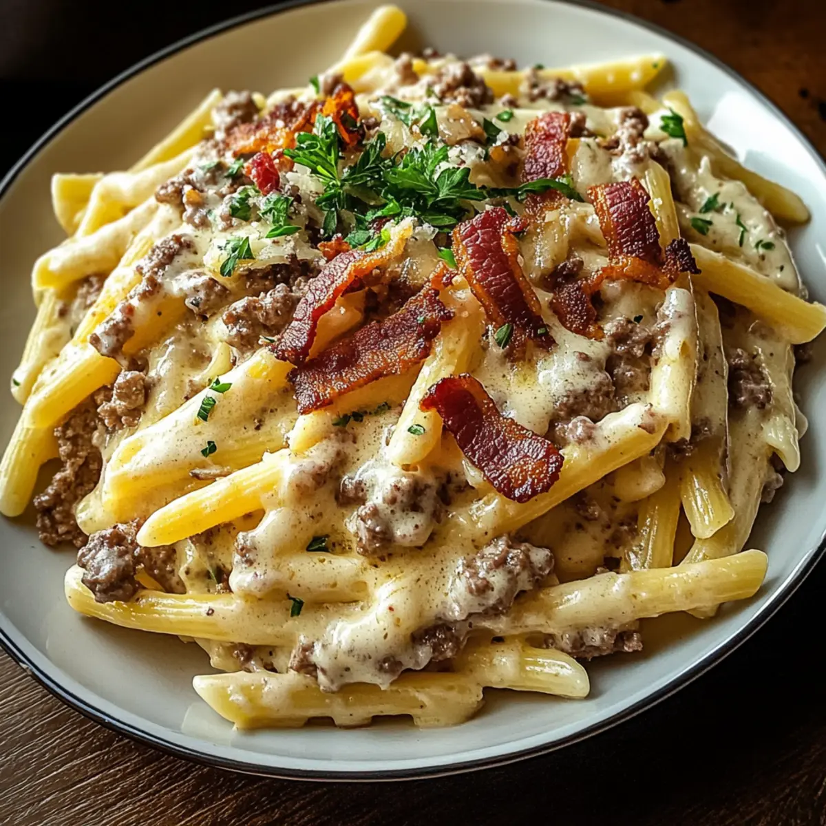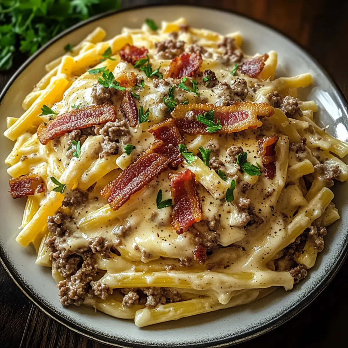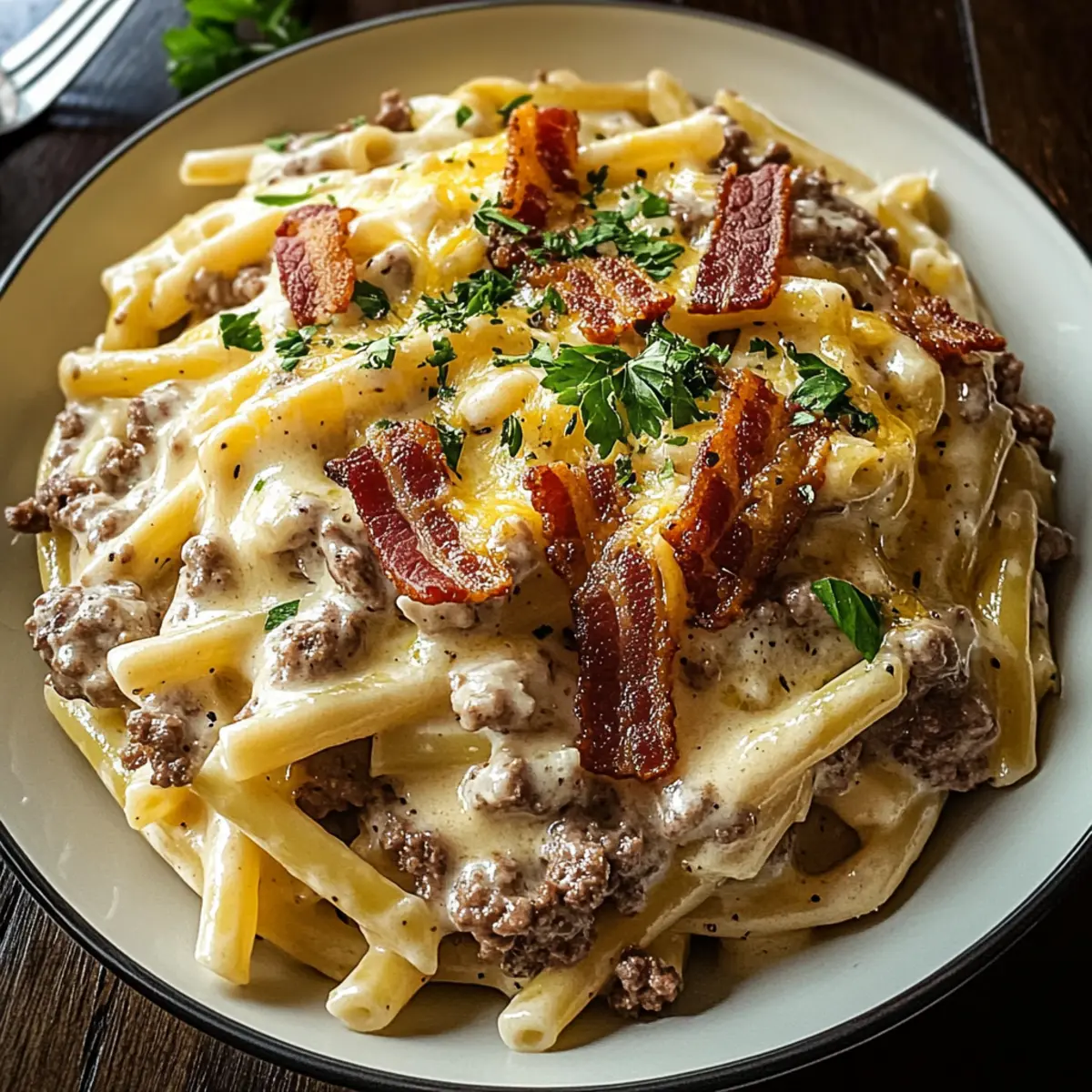 Jump to Recipe Print RecipeAs the scent of crispy bacon fills my kitchen, I can’t help but smile—there’s just something magical about creating a hearty dish that marries beloved comfort foods. Enter my Loaded Bacon Cheeseburger Alfredo Pasta, a creamy, cheesy masterpiece that’s perfect for those who crave indulgence without spending hours in the kitchen. This dish seamlessly blends the rich flavors of a classic cheeseburger with the satisfying texture of pasta, making it a sure hit for both family dinners and casual gatherings. With its quick preparation and delightful mix of savory elements, you’ll find this meal not only easy to whip up but also deeply comforting. Ready to dive into a plateful of deliciousness? Let’s explore how to make this mouthwatering dish! Why is this dish a must-try? Creamy Comfort: This Loaded Bacon Cheeseburger Alfredo Pasta is the ultimate comfort food that brings warmth and satisfaction in every bite. Indulgent Flavors: The rich, cheesy sauce echoing classic cheeseburger flavors is a game-changer for dinner. Quick and Easy: With simple ingredients and straightforward steps, you’ll have a delicious meal ready without fuss. Crowd Pleaser: Perfect for gatherings, it appeals to both kids and adults alike. Whether you’re serving it alongside a refreshing Lemon Arugula Pasta Salad or pairing with Street Corn Pasta, you’ll impress your guests effortlessly. Dive into comfort with this dish tonight! Loaded Bacon Cheeseburger Alfredo Pasta Ingredients For the Pasta • Pasta – A sturdy type like fettuccine or penne holds the rich Alfredo sauce beautifully; feel free to swap in any pasta shape you prefer. For the Meat Sauce • Ground Beef – Provides a hearty, meaty foundation that captures the essence of a cheeseburger; ground turkey is a great lean substitute. • Bacon – Adds a smoky crunch and depth of flavor; chop and cook until crispy before tossing with the sauce. • Onion – Finely chopped for delightful sweetness and savory depth; sauté until soft and translucent for best results. • Garlic – Minced to infuse fragrant flavor into the dish; cook just until fragrant to avoid browning, preserving its freshness. For the Creamy Sauce • Heavy Cream – The essential base for a luscious, creamy Alfredo sauce; it creates the rich texture everyone loves. • Parmesan Cheese – Grated for nuttiness and extra creaminess; Pecorino Romano is an excellent choice for those seeking a sharper flavor. • Cheddar Cheese – Shredded to add a gooey, melty texture; gradually mix in for optimal creaminess. • Beef Broth – Enhances the savory flavor and depth of the sauce; chicken broth provides a lighter option if desired. • Worcestershire Sauce – Contributes tangy, savory notes reminiscent of a classic cheeseburger that elevate the dish. • Tomato Paste – Intensifies the tomato flavor in the beef mixture, tying all flavors together beautifully. For Seasoning & Garnish • Olive Oil – For sautéing aromatics without burning, ensuring a perfect flavor base for your dish. • Salt & Pepper – Essential to enhance all other flavors; adjust to taste for a well-balanced dish. • Fresh Parsley – Chopped for garnish, adding a herbal brightness that lifts the dish; sprinkle it on just before serving. • Optional: Red Pepper Flakes – Add a touch of heat to complement the creaminess and make your dish pop! This Loaded Bacon Cheeseburger Alfredo Pasta is a comforting, cheesy triumph that’s quick to prepare, ensuring you spend more time enjoying and less time cooking! Step‑by‑Step Instructions for Loaded Bacon Cheeseburger Alfredo Pasta Step 1: Cook the Pasta Begin by bringing a large pot of salted water to a rolling boil over high heat. Add your sturdy pasta, such as fettuccine or penne, and cook until al dente, typically about 8-10 minutes. Once cooked, drain the pasta and drizzle it with a bit of olive oil to prevent sticking, setting it aside while you prepare the sauce. Step 2: Prepare the Bacon In a large skillet, over medium heat, cook the chopped bacon until it’s crispy and golden, which should take about 6-8 minutes. Once finished, use a slotted spoon to transfer the bacon to a paper towel-lined plate, leaving about 1 tablespoon of bacon fat in the skillet to enhance the flavor of your Loaded Bacon Cheeseburger Alfredo Pasta. Step 3: Sauté the Aromatics To the remaining bacon fat in the skillet, add a splash of olive oil and sauté the finely chopped onion over medium heat until soft and translucent, about 3-4 minutes. Stir in minced garlic, cooking for an additional 30 seconds until fragrant, ensuring the mixture is aromatic without browning, which will preserve its fresh flavor. Step 4: Brown the Beef Add the ground beef to the skillet, breaking it up with a spatula as it cooks. Brown the beef for about 5-7 minutes until no longer pink. If there’s excess fat, drain it from the pan. This savory beef forms the hearty foundation of your Loaded Bacon Cheeseburger Alfredo Pasta, capturing all the rich flavors. Step 5: Incorporate the Tomato and Worcestershire Stir in tomato paste and Worcestershire sauce, mixing thoroughly to combine, and cook for 1-2 minutes. This step adds depth to your sauce, reminiscent of classic cheeseburger flavors. Scrape any browned bits from the pan—these enhance the overall taste of the dish, making each bite exceptional. Step 6: Simmer with Broth Pour in beef broth and bring your mixture to a gentle simmer, allowing it to meld together over medium-low heat for about 5 minutes. As the flavors combine, the sauce will start to thicken slightly, creating a rich base for your Loaded Bacon Cheeseburger Alfredo Pasta. Step 7: Create the Alfredo Sauce Lower the heat to a simmer, then stir in heavy cream, mixing well to incorporate. Gradually whisk in the grated Parmesan cheese, stirring continuously until the sauce is smooth and creamy. This luxurious Alfredo sauce is the heart of your dish, enveloping 