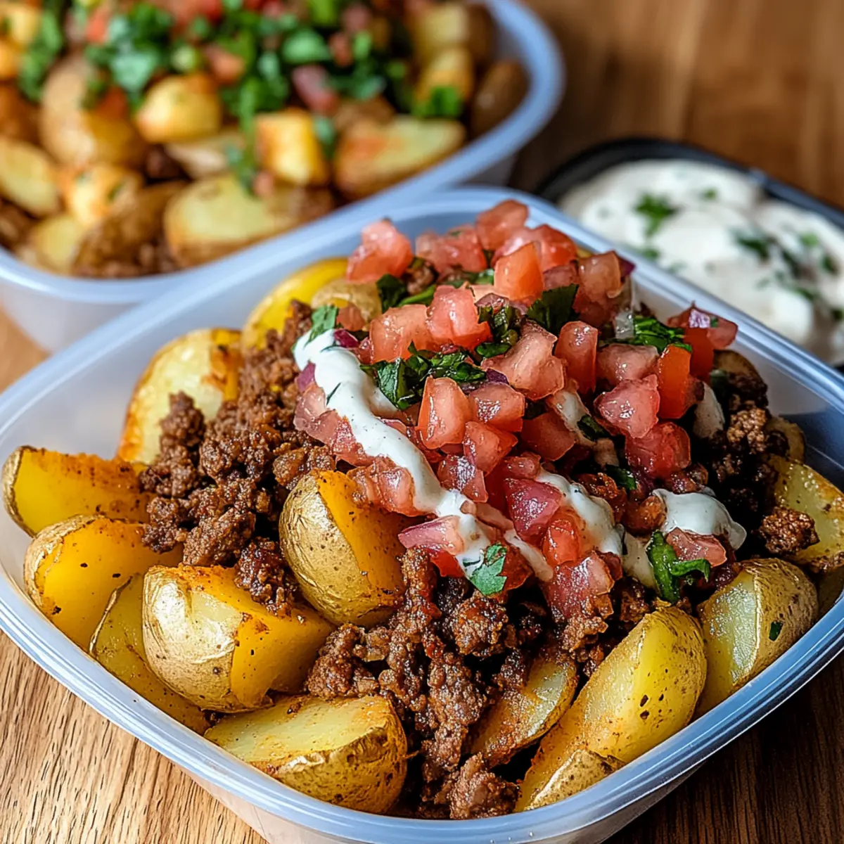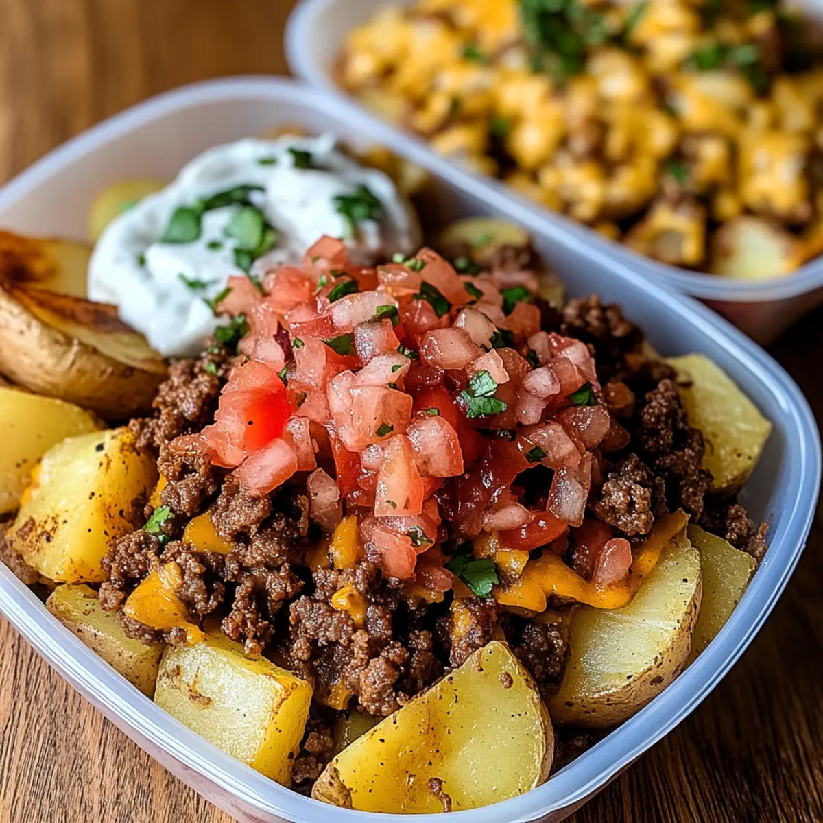 Jump to Recipe Print RecipeAs I rummaged through my pantry, I stumbled upon a curious blend of ingredients that sparked a delightful idea: Loaded Potato Taco Bowls! This dish is a fantastic way to savor the comforting warmth of crispy roasted potatoes mingling harmoniously with seasoned ground beef and vibrant toppings. It’s not just a meal; it transforms into a quick dinner solution that anyone can customize to their taste buds. Perfect for busy weeknights or those meal prep sessions, these bowls are high in protein and packed with the savory goodness we crave. Trust me, this recipe is both nourishing and a guaranteed crowd-pleaser. What creative toppings will you add to your own bowl? Why Are Loaded Potato Taco Bowls a Must-Try? Versatile and Customizable: These bowls allow you to mix and match ingredients based on your preferences, making every meal uniquely yours. High Protein Power: Packed with lean ground beef, they serve as a protein-rich dish perfect for keeping you satisfied throughout the day. Quick and Easy: With a straightforward preparation and minimal cooking time, you can whip these up in no time, ideal for busy weekdays or unexpected guests. Comfort Food Classic: The combination of crispy potatoes and savory beef offers a comforting texture that rivals your favorite takeout meals. Meal Prep Friendly: Easily store leftover bowls for a nutritious lunch option, ensuring you stay on track with your meal planning goals. Elevate your dinner game with our guide to meal prep strategies, even if you only have limited time. Loaded Potato Taco Bowls Ingredients For the Potato Base 5-6 medium-large potatoes (Yukon Gold or preferred variety) – The foundation of your dish, providing comforting texture and substance. Feel free to swap in sweet potatoes for a delightful twist. 1 tbsp olive oil – Essential for roasting, helping to achieve that golden, crispy finish. Coconut oil is a fantastic alternative for a different flavor profile. For the Beef Filling 1 lb lean ground beef – The star protein of this meal, laden with savory goodness. If desired, substitute with turkey or plant-based alternatives for a lighter or vegetarian option. ½ tsp Creole seasoning – Infuses the beef with a delightful kick and depth of flavor. Adjust based on your spice tolerance for the perfect balance. ½ tsp cumin – Enhances the dish with earthy undertones that complement the other spices. Chili powder can be used in its place for a different flair. 1 tbsp taco seasoning – Adds an authentic taco flavor to the beef mix. Making your own taco seasoning allows you to customize the spice level to your taste. For the Toppings Fresh toppings (Pico de Gallo, Sriracha Mayo) – These not only bring a splash of vibrant color but also freshness to balance the richness of the potatoes and beef. Customize your toppings; avocado or shredded cheese make delightful additions. Dive into your kitchen and make these tantalizing Loaded Potato Taco Bowls today! Step‑by‑Step Instructions for Loaded Potato Taco Bowls Step 1: Preheat the Oven Begin by preheating your oven to 425°F (220°C). This temperature ensures that your potatoes will turn perfectly golden and crispy as they roast. While the oven heats, gather a large baking sheet and line it with parchment paper for easy cleanup. Step 2: Prepare the Potatoes Dice 5-6 medium-large Yukon Gold potatoes into even pieces to ensure uniform cooking. Toss the diced potatoes in a large bowl with 1 tablespoon of olive oil, salt, oregano, garlic powder, and smoked paprika until coated. Spread the seasoned potatoes evenly on the prepared baking sheet and bake for 25-30 minutes, flipping halfway through, until they are golden brown and crispy. Step 3: Cook the Ground Beef While the potatoes are roasting, heat a skillet over medium heat and add 1 pound of lean ground beef. Break the meat apart with a wooden spoon, cooking for about 7-10 minutes until it’s browned all the way through. Mix in ½ teaspoon of Creole seasoning, ½ teaspoon of cumin, and additional salt and pepper to taste, allowing the spices to meld and enhance the hearty flavor. Step 4: Make the Pico de Gallo In a separate bowl, prepare the Pico de Gallo by combining diced tomatoes, jalapeños, red onion, lime juice, and fresh cilantro. Season this mix with salt and pepper to taste, stirring well. This fresh topping will add a delightful contrast to the savory flavors of your Loaded Potato Taco Bowls. Step 5: Prepare the Sriracha Mayo In a small bowl, whisk together mayonnaise, Sriracha, lemon juice, and a pinch of black pepper to create a creamy Sriracha Mayo. Adjust the Sriracha amount based on your preferred spice level. This sauce will bring a zesty kick and a smooth finish to your bowls. Step 6: Assemble the Bowls Once the potatoes are crispy and the beef is perfectly seasoned, it’s time to assemble your Loaded Potato Taco Bowls. Start by layering the roasted potatoes at the bottom of each bowl, followed by a generous portion of ground beef. Top it off with the homemade Pico de Gallo and drizzle with Sriracha Mayo. Enjoy your delicious creation! Make Ahead Options These Loaded Potato Taco Bowls are perfect for busy home cooks looking to save time during the week! You can prep the roasted potatoes and seasoned ground beef up to 3 days in advance. Just roast the potatoes as usual and let them cool before storing them in an airtight container in the fridge. Similarly, cook the ground beef and allow it to cool before refrigerating. To maintain the quality, reheat the potatoes and beef separately in the oven for a few minutes before serving, adding fresh toppings like Pico de Gallo and Sriracha Mayo just before enjoying. This way, you’ll have a delightful, hassle-free meal waiting for you! Storage Tips for Loaded Potato Taco Bowls Fridge: Store assembled Loaded Potato Taco Bowls in airtight containers for up to 4 days. Reheat in the microwave or oven until heated through. Freezer: For longer storage, yo