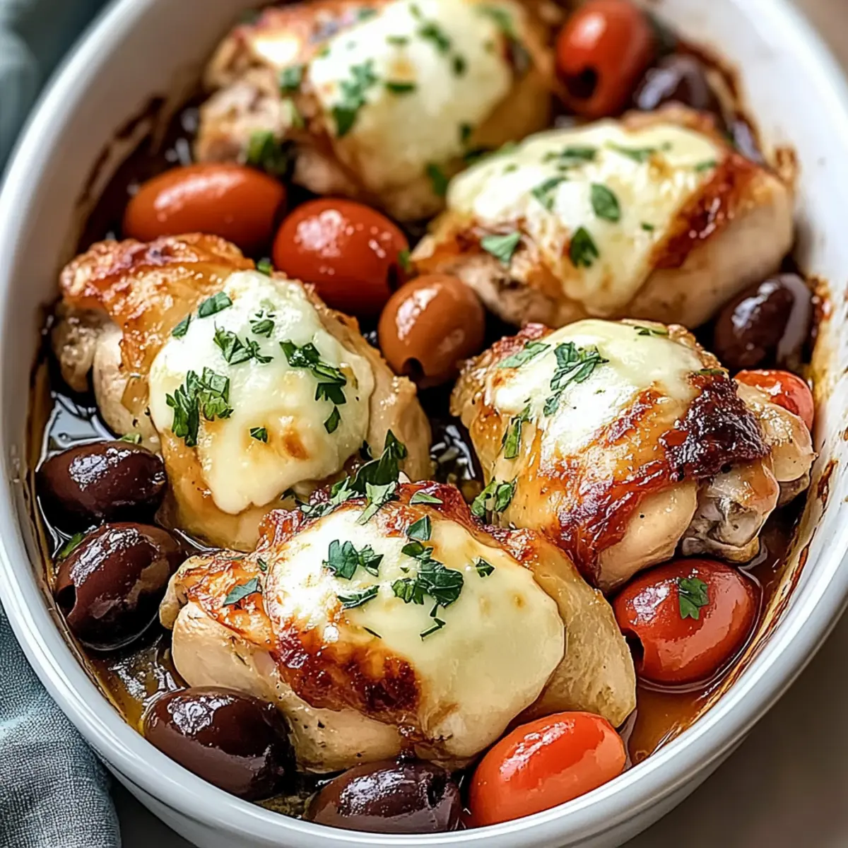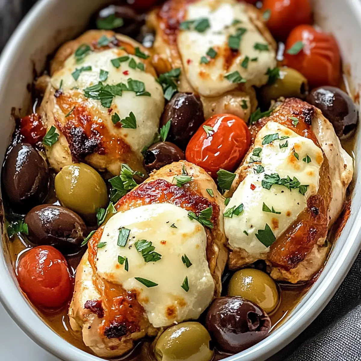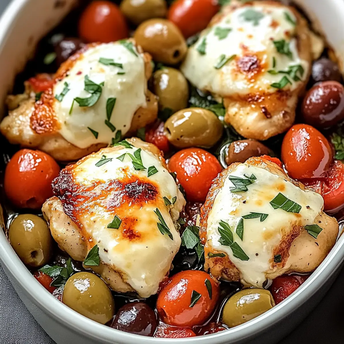 Jump to Recipe Print RecipeAs I pulled the Mediterranean Chicken Bake from the oven, the warm, inviting aromas filled my kitchen, instantly transporting me to sun-drenched shores and bustling markets. This dish is a weeknight lifesaver, effortlessly pairing juicy chicken thighs with vibrant bell peppers, salty olives, and creamy feta—all roasted in one pan for ultimate ease. Not only is it a quick and easy comfort meal, but it also brings the delightful, fresh flavors of the Mediterranean right to your table, making it perfect for feeding the whole family without a fuss. The best part? It’s packed with goodness and can easily be prepped ahead, allowing you to savor those cozy, joyful moments with loved ones. Ready to dive into a culinary journey that transforms your dinner routine? Let’s get cooking! Why is this Mediterranean Chicken Bake a must-try? Simplicity at its Best: With just one pan, you’ll enjoy a flavorful meal without the hassle of multiple dishes to clean up. Vibrant Flavors: Each ingredient—from the juicy chicken to the tangy feta—brings a fresh taste that will impress your family and friends. Crowd-Pleaser: This dish is designed for everyone! Whether you’re a busy parent or a culinary enthusiast, it caters to all taste buds. Quick Prep Time: In under 15 minutes, you can have everything ready to go into the oven, making it a perfect choice for quick weeknight dinners. Customizable Options: Feel free to switch up the veggies or protein; it’s as versatile as it is delicious! For more inspiration, check out our Chicken Zucchini Bake or Keto Chicken Bake. Mediterranean Chicken Bake Ingredients Dive into this delicious Mediterranean Chicken Bake! For the Chicken Chicken Thighs – A succulent choice that stays juicy during roasting; breasts can be used but watch for dryness. Dijon Mustard – Adds a zesty kick to the marinade; substitute with honey mustard for a sweeter twist. For the Vegetables Red Bell Pepper – Offers sweetness and a bright pop of color; yellow or orange peppers work well as substitutes. Yellow Onion – Adds savory depth; you can use shallots for a milder profile. Kalamata Olives – Briny bites that elevate the dish; green olives are a good swap but may need salt adjustments. Garlic – Fresh minced garlic enhances flavor; garlic powder can be a quick alternative in a pinch. For the Seasoning Dried Oregano – This herb gives off that classic Mediterranean aroma; fresh oregano is a fantastic and doubled substitute. Dried Thyme – Delivers earthy notes; Italian seasoning can be a good alternative. Red Pepper Flakes – Optional for a hint of heat; feel free to skip if you prefer a milder dish. Smoked Paprika – Imparts subtle smokiness; regular paprika can replace smoked if needed. Salt and Black Pepper – Essential for seasoning; adjust based on your taste preferences. For the Marinade Olive Oil – This key ingredient enriches the flavors during roasting; choose the best quality for a robust taste. Lemon Juice – Brightens up the whole dish; vinegar is a good substitute in a pinch. For the Topping Feta Cheese – A creamy finish that adds texture; goat cheese makes a delightful alternative. Parsley – For garnish; consider fresh basil for a different herbaceous note. Now that you have everything ready, let’s embark on this tasty Mediterranean journey! Step‑by‑Step Instructions for Mediterranean Chicken Bake Step 1: Preheat the Oven Begin by preheating your oven to 400°F (200°C). This ensures that your Mediterranean Chicken Bake cooks evenly and reaches that perfect golden-brown finish. While the oven heats up, you can start preparing the marinade and the other ingredients, setting the stage for this flavorful meal. Step 2: Prepare the Marinade In a large mixing bowl, whisk together olive oil, lemon juice, Dijon mustard, dried oregano, dried thyme, red pepper flakes, smoked paprika, salt, and black pepper. Blend these ingredients well for about 1-2 minutes until combined, creating a fragrant marinade that will beautifully infuse the chicken and vegetables with Mediterranean flavors. Step 3: Combine Ingredients Add the chicken thighs, red bell pepper strips, sliced yellow onion, and Kalamata olives into the bowl with the marinade. Using clean hands or a spatula, toss everything together thoroughly until all pieces are evenly coated. This process takes about 2-3 minutes and ensures that every bite of your Mediterranean Chicken Bake will be bursting with vibrant flavors. Step 4: Transfer to Baking Dish Generously grease a large baking dish with olive oil to prevent sticking. Pour the marinated chicken and vegetable mixture into the dish, spreading it out evenly. This step ensures that everything roasts beautifully, allowing the chicken to caramelize while the veggies soften. Take a moment to arrange the ingredients into a single layer for optimal cooking. Step 5: Bake the Dish Place the baking dish in your preheated oven and bake for 25-35 minutes. Keep an eye on it; you’ll know it’s done when the chicken reaches an internal temperature of 165°F (74°C) and the vegetables are fork-tender, showcasing a lovely caramelized color. The aroma wafting through your kitchen will be simply irresistible! Step 6: Add Feta Cheese Once the chicken and vegetables are roasted to perfection, remove the dish from the oven. Sprinkle crumbled feta cheese generously over the top of the Mediterranean Chicken Bake. Return it to the oven for an additional 5 minutes, allowing the feta to melt and slightly brown, enhancing the dish’s creamy texture and flavor. Step 7: Rest and Serve After the final bake, let your Mediterranean Chicken Bake rest for about 5 minutes. This allows the juices to redistribute, ensuring every bite is juicy and flavorful. Before serving, garnish with freshly chopped parsley for a pop of color and a hint of freshness, making it an inviting dish for your family and friends to enjoy. Expert Tips for Mediterranean Chicken Bake 