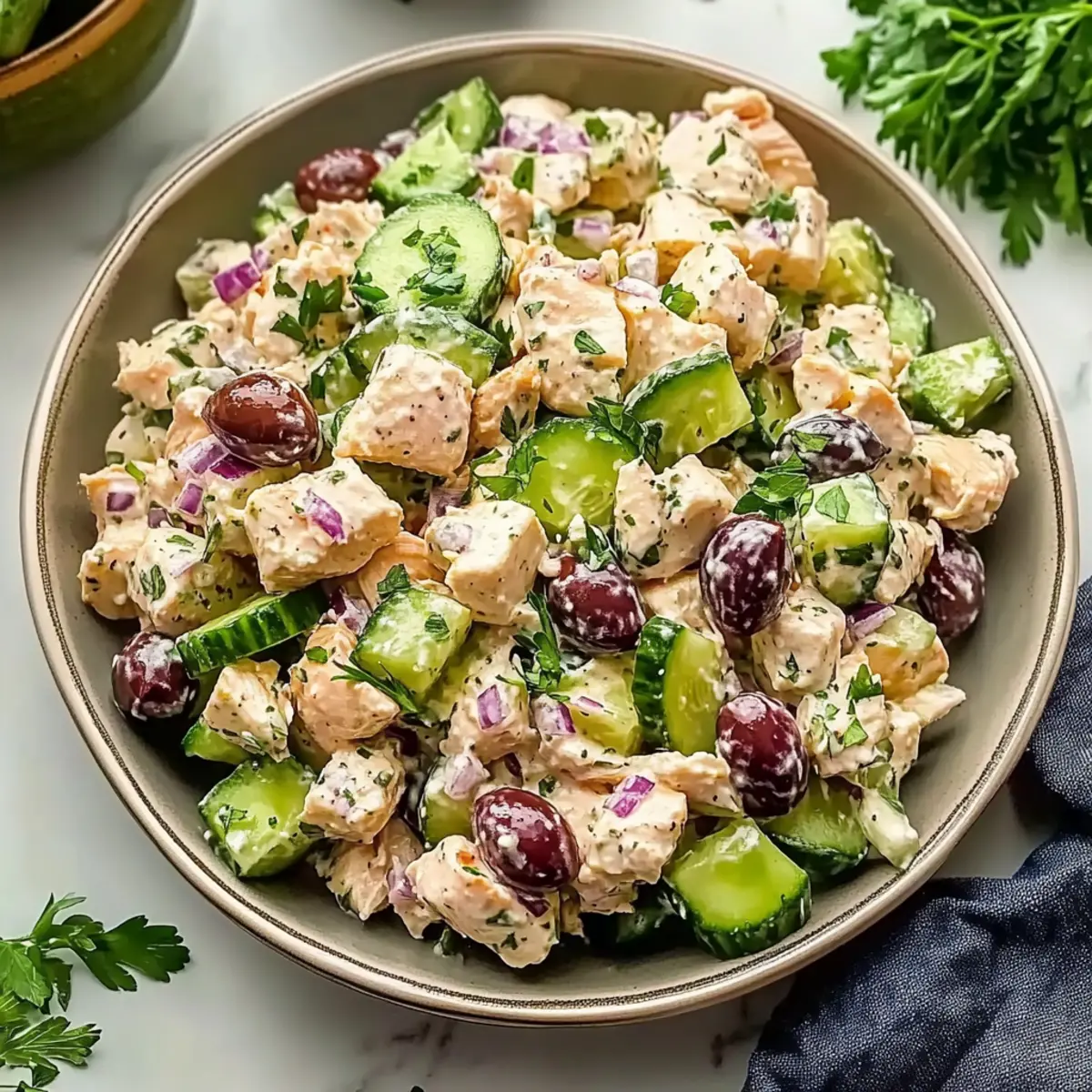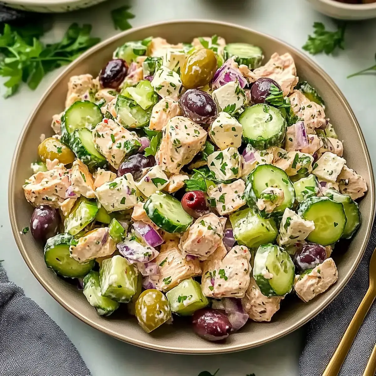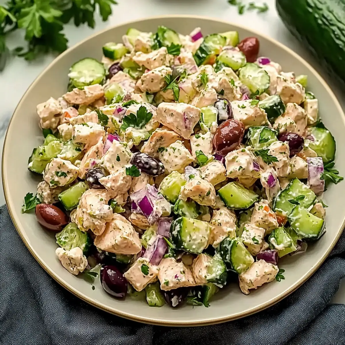 Jump to Recipe Print RecipeAs I wandered through the vibrant markets of the Mediterranean last summer, the colors and aromas were simply irresistible. This inspiration led me to create the High Protein Mediterranean Chicken Salad, a dish that captures the essence of those sun-drenched days. Bursting with the zing of tangy feta, refreshing cucumber, and savory olives, it’s not just a salad; it’s a celebration on a plate! Perfect for a quick and satisfying lunch, this keto-friendly gem takes minimal time to whip up and makes for excellent meal prep. When you let it chill in the fridge, the flavors only get better, creating a dish that’s even more delicious the next day. Curious about the secrets of making this delightful salad? Let’s dive in! Why is this salad a must-try? Vibrant, Fresh Ingredients: This High Protein Mediterranean Chicken Salad bursts with colors and flavors that transport you straight to the Mediterranean coast. Low-Carb Satisfaction: Perfect for anyone on a keto diet, it’s low in carbs but high in protein, making it a guilt-free indulgence. Easy Meal Prep: Whip this salad up in no time, and enjoy it as a quick lunch or dinner option throughout the week! Flavor Enhancer: The blend of tangy feta, savory olives, and fresh dill offers a unique flavor profile that will keep you coming back for more. For more meal ideas, check out our delicious Thai Chicken Salad or Keto Chicken Alfredo. Crowd-Pleaser: Whether you’re serving it at a cookout or enjoying it solo, this salad is sure to impress family and friends alike! Mediterranean Chicken Salad Ingredients Get ready to gather everything you need for a delicious Mediterranean Chicken Salad that transforms your lunch! For the Salad Canned Chicken – Provides lean protein; use drained chunk white meat for the best texture. Cucumber – Adds refreshing crunch; be sure to remove seeds before dicing to avoid excess moisture. Feta Cheese – Brings tangy creaminess; crumble it just before mixing to preserve its texture. Olives – Enhance the Mediterranean flavor; feel free to use your favorite variety for added taste. Red Onion – Offers sharpness and color; finely mince for a milder flavor. Fresh Dill – Imparts a fresh herbaceous note; opt for freshly chopped over dried for the best flavor. For the Dressing Mayonnaise – Serves as the creamy base; a quality brand like Hellmann’s will give you rich texture. Greek Yogurt – Adds tang and lightness; Fage 5% is the go-to for richness. Lemon Juice – Brightens flavors; add it gradually to balance the dressing perfectly. Garlic Powder – Provides depth of flavor; it adds taste without being overwhelming. Dijon Mustard – Introduces a slight tang; vital for achieving the right flavor balance. Greek Seasoning – A blend of Mediterranean herbs; adjust according to your preference for seasoning. Step‑by‑Step Instructions for Mediterranean Chicken Salad Step 1: Prep Ingredients Begin by preparing your fresh ingredients for the Mediterranean Chicken Salad. Dice the cucumber into 1/4-inch pieces, ensuring you remove the seeds to maintain that delightful crunch. Finely mince the red onion and chop a handful of fresh dill. Lastly, crumble the tangy feta cheese into smaller pieces to keep its creamy texture intact, setting the stage for a vibrant salad. Step 2: Make Dressing In a large mixing bowl, whisk together the creamy base of mayonnaise and Greek yogurt until smooth and well combined. Gradually incorporate the bright lemon juice, Dijon mustard, garlic powder, and a sprinkle of Greek seasoning to enhance flavors. The dressing should be silky and well-blended, creating a perfect foundation for your Mediterranean Chicken Salad. Step 3: Combine Chicken and Dressing Next, add the drained canned chicken to the dressing mixture, gently folding it in until the chicken is completely coated. Use a spatula to ensure each piece is enveloped in the creamy goodness of the dressing, making every bite flavorful. This step infuses the chicken with the Mediterranean essence right from the start. Step 4: Mix in Vegetables Now it’s time to introduce color and texture! Gently fold in the diced cucumber, minced red onion, crumbled feta, and your choice of olives into the chicken mixture. Continue folding until all ingredients are well combined, making sure not to mash the feta. This delightful combination captures the essence of a Mediterranean Chicken Salad. Step 5: Chill For the best flavor, allow your Mediterranean Chicken Salad to chill in the refrigerator for at least 30 minutes. This resting time allows the flavors to meld beautifully, creating a savory and refreshing dish that’s even more delightful once served. Store it in an airtight container if you’re preparing in advance, and consider enjoying it over the next few days for optimal freshness. Mediterranean Chicken Salad Variations Feel free to customize your Mediterranean Chicken Salad to make it uniquely yours and enhance its deliciousness! Rotisserie Chicken: Use leftover rotisserie chicken for added flavor and convenience; it pairs beautifully with the salad’s ingredients. Goat Cheese: Swap feta for creamy goat cheese to introduce a tangy twist; it will give your salad a delightful depth of flavor. Cherry Tomatoes: Toss in halved cherry tomatoes for a burst of sweetness and color; they offer a refreshing contrast to the tangy dressing. Bell Peppers: Add diced bell peppers for an extra crunch and bright color; they’ll bring even more Mediterranean vibrancy to the dish. Spicy Kick: If you enjoy a little heat, throw in some sliced jalapeños or a sprinkle of red pepper flakes; it’s a fun way to elevate the flavor profile! Herbal Infusion: Experiment with fresh herbs like parsley or basil alongside dill; this elevates the fresh flavors and adds a new layer of aroma. Zucchini Noodles: For a fun texture twist, serve the salad over spiralized zucchini noodles; it creates a lovely, low-carb alternative. Tzatziki Drizzl