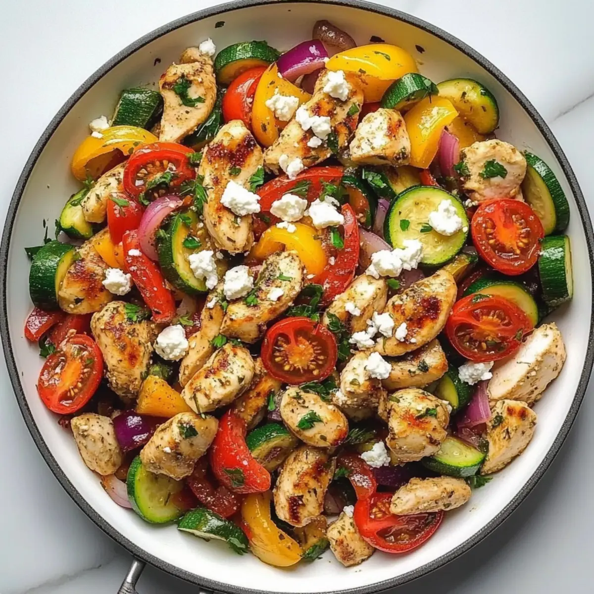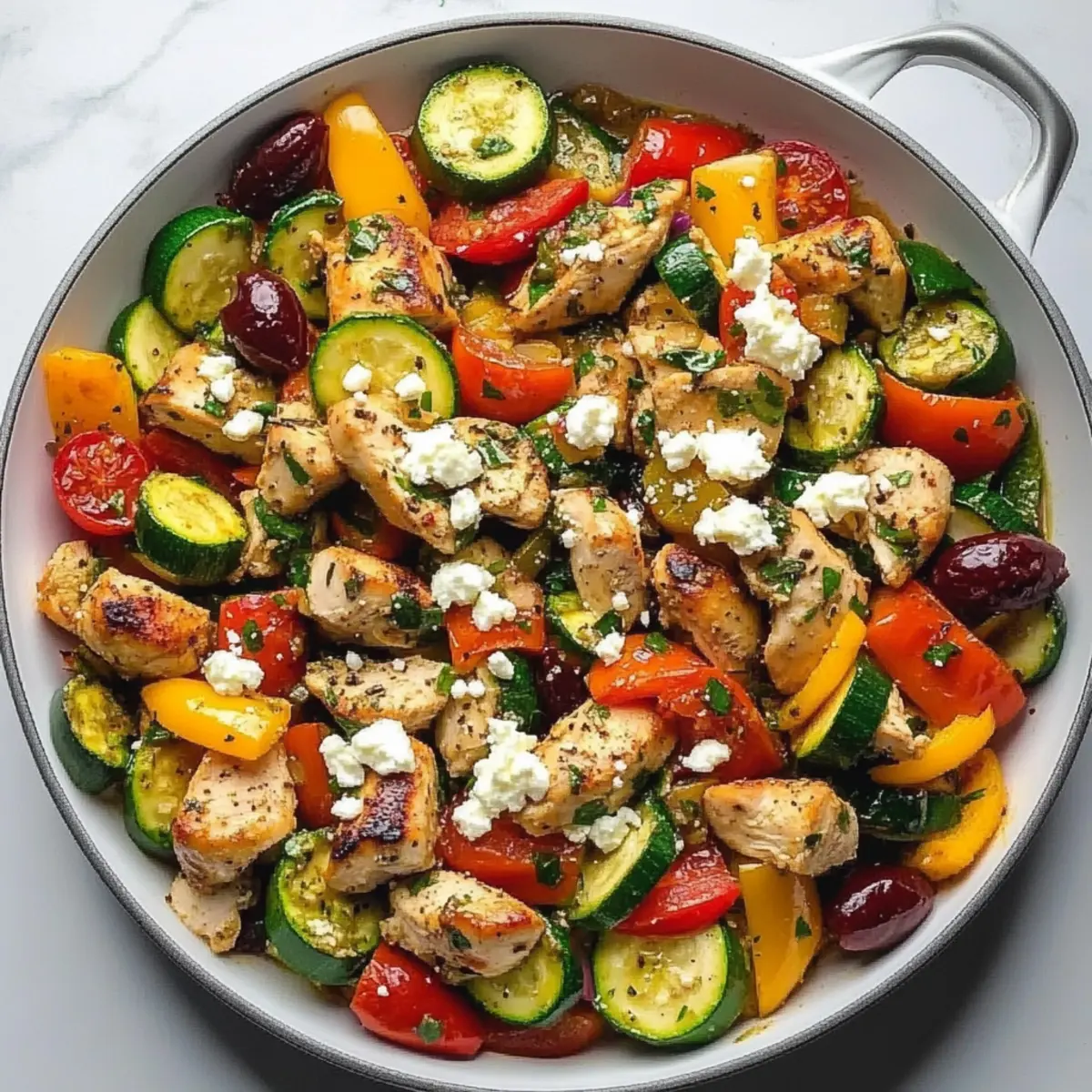 Jump to Recipe Print RecipeThe aroma of sizzling garlic and fresh herbs wafts through my kitchen as I prepare a dish that brings a taste of the Mediterranean right to my dinner table. This Mediterranean Chicken Stir Fry is a delightful marriage of tender chicken, vibrant vegetables, and bold flavors, all whipped up in just 30 minutes! It’s the perfect solution for busy weeknights, embracing the wholesome, healthy Mediterranean diet while also being low-carb for those looking to keep things light. With enticing variations like spinach and marinated artichokes, this dish keeps it exciting and customizable for any palate. Are you ready to immerse yourself in this quick culinary adventure that will leave your family asking for seconds? Why is Mediterranean Chicken Stir Fry special? Bursting with flavors, this dish effortlessly combines tender chicken with fresh veggies for a taste sensation. Quick and easy to prepare, you can have dinner on the table in just 30 minutes—perfect for busy weeknights! Healthy at its core, it embraces the Mediterranean diet and offers low-carb options, making it guilt-free. Customizable with vibrant variations, such as adding spinach or marinated artichokes, you won’t tire of this classic. Crowd-pleasing delight, it’s sure to impress family and friends, leaving everyone wanting more! If you love quick meals, check out our meal prep tips for added efficiency. Mediterranean Chicken Stir Fry Ingredients • Are you ready to gather everything for a delightful dinner? For the Chicken Chicken breasts (1.5 lbs) – The main protein source, cut into bite-sized pieces for even cooking. Substitution: Use boneless turkey for a leaner option. Extra virgin olive oil (3 tbsp) – Essential for cooking and flavor enhancement. Substitution: Regular olive oil may be used at higher temps, but it lacks the fruity flavor. Salt & black pepper – Adds essential seasoning to taste. For the Vegetables Zucchini (2 medium) – Adds texture and nutrients, sliced into half-moons. Prep Note: Add later in cooking as they cook quickly. Red bell peppers (2) – Provide sweetness and color, diced into chunks. Red onion (1 large) – Adds sweetness and aroma, sliced into strips. Cherry tomatoes (2 cups) – For juiciness and brightness, halved. Substitution: Canned diced tomatoes can be used when fresh aren’t available. Kalamata olives (1 cup) – Adds briny flavor, pitted and halved. Garlic (4 cloves) – Essential for depth of flavor, minced. For the Flavoring Sun-dried tomatoes (¼ cup) – Introduces concentrated flavor. Optional: Use fresh tomatoes but reduce liquid in the recipe. Dried oregano (2 tsp) – Key herb for Mediterranean flavor. Dried basil (1 tsp) – Complements other herbs. Dried thyme (½ tsp) – Adds an earthy note. Lemon juice (from 1 lemon) – Brightens flavors; add at the end for brightness. Feta cheese (½ cup) – Creamy topping that enhances the dish. Fresh parsley (2 tbsp, optional) – Fresh garnish for added flavor. This Mediterranean Chicken Stir Fry is not just a dish; it’s an experience waiting to be savored! Embrace the quick, healthy goodness and let your taste buds dance with every bite! Step‑by‑Step Instructions for Mediterranean Chicken Stir Fry Step 1: Prepare Ingredients Begin by thoroughly washing and chopping all your ingredients. Cut the chicken breasts into bite-sized pieces for even cooking and slice the zucchini, red bell peppers, and red onion as specified. Halve the cherry tomatoes and kalamata olives, and mince the garlic. Having everything prepped will ensure a smooth cooking process for your Mediterranean Chicken Stir Fry. Step 2: Sear Chicken In a large skillet or wok, heat 3 tablespoons of extra virgin olive oil over medium-high heat. Once shimmering, add the chicken pieces, seasoning them with salt and black pepper. Sear the chicken for about 6-7 minutes or until golden brown and cooked through, reaching an internal temperature of 165°F. Stir occasionally to prevent sticking and ensure even cooking. Step 3: Sauté Vegetables With the chicken cooked, reduce the heat slightly. Add the sliced red onion and minced garlic to the skillet, sautéing for about 2 minutes until fragrant. Then, toss in the diced red bell peppers and zucchini. Cook these vegetables for an additional 3-4 minutes until they are tender-crisp, adding a pop of color to your Mediterranean Chicken Stir Fry. Step 4: Combine Return the seared chicken to the skillet and mix well with the sautéed vegetables. Add the sun-dried tomatoes, halved cherry tomatoes, and kalamata olives, along with the dried oregano, basil, and thyme. Toss everything together for 2-3 minutes until well combined and heated through, allowing the flavors to meld beautifully. Step 5: Finish Remove the skillet from the heat and squeeze the juice from one lemon over the stir fry, stirring gently. Finally, sprinkle the feta cheese and fresh parsley on top for a delicious, creamy finish. Serve your Mediterranean Chicken Stir Fry immediately, and enjoy the vibrant, fresh flavors that this quick dish has to offer. How to Store and Freeze Mediterranean Chicken Stir Fry Fridge: Store leftovers in an airtight container for up to 3-4 days. This Mediterranean Chicken Stir Fry tastes great reheated and retains its delightful flavor! Freezer: If freezing, place the stir fry in a freezer-safe container where it can last for up to 3 months. Allow to cool completely before sealing to prevent ice crystals. Reheating: To enjoy your stir fry after freezing, thaw overnight in the fridge. Reheat in a skillet over medium heat, stirring occasionally until heated through for the best texture. Airtight Storage: Make sure to use airtight containers for both fridge and freezer storage to maintain freshness and flavor in your Mediterranean Chicken Stir Fry. Expert Tips for Mediterranean Chicken Stir Fry Uniform Chicken Pieces: Ensure chicken is cut evenly to guarantee thorough cooking, preventing any pieces from bein