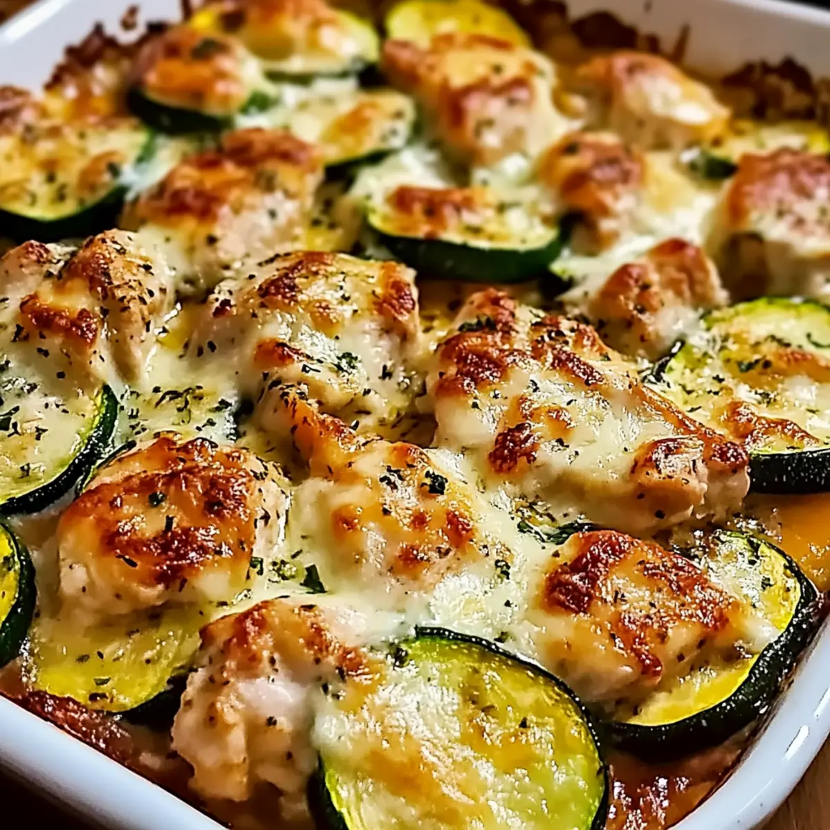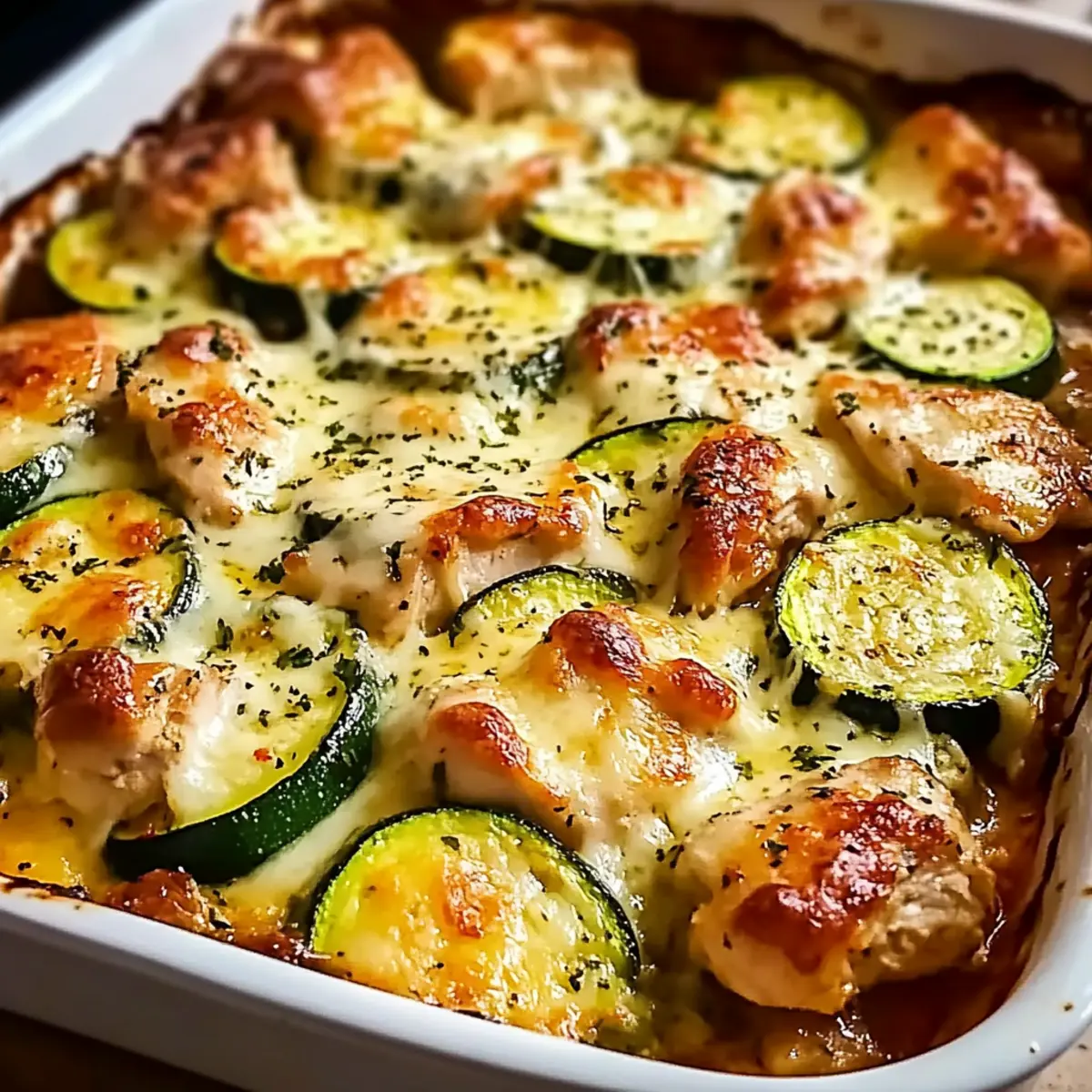 Jump to Recipe Print RecipeThe moment I pulled the Mediterranean Chicken Zucchini Bake from the oven, my kitchen transformed into a sun-drenched terrace overlooking the azure sea. The tantalizing aroma of baked chicken mingled with fresh zucchini and the sweetness of cherry tomatoes wafted through the air, instantly lifting my spirits. This delightful dish is not only gluten-free and low-carb, but it’s also ready in just 35 minutes, making it an effortless weeknight winner. Imagine a nourishing meal that combines tender chicken, gooey cheese, and vibrant vegetables, all in one pan! It’s the perfect blend of convenience and comfort, gathering your loved ones around the table to savor each bite together. So, are you ready for a flavor-packed dinner that will sweep everyone off their feet? Let’s dive into this delicious recipe! Why is this recipe a weeknight winner? Simplicity reigns supreme with this one-pan dish, requiring minimal prep and clean-up. Flavors burst with Mediterranean goodness as chicken, zucchini, and cherry tomatoes meld beautifully. Healthy and satisfying, it’s gluten-free and low-carb, catering to various dietary preferences. Plus, perfect for meal prep, you can assemble it ahead and bake when ready! For a complete dinner experience, pair with a side salad or herbed quinoa to round out the meal.Time-saving and delicious, this Mediterranean Chicken Zucchini Bake will quickly become a family favorite. Mediterranean Chicken Zucchini Bake Ingredients For the Chicken and Veggies Chicken Breasts – Use boneless, skinless for best results, ensuring juicy, tender meat. Zucchini – Opt for fresh zucchini; avoid frozen to prevent mushiness in your bake. Cherry Tomatoes – Halve for even cooking and to enhance their natural sweetness. Red Onion – Thinly sliced for quick cooking, adding depth to your flavors. Garlic – Minced for even distribution, enhancing the wonderful aroma of the dish. For the Seasoning and Oils Olive Oil – Coats ingredients for cooking; can substitute with avocado oil if preferred. Dried Oregano – Essential for that authentic Mediterranean flavor—don’t skip it! Dried Basil – Complements oregano beautifully with fragrant herbal notes. Smoked Paprika – Adds a subtle smokiness; regular paprika can be a suitable alternative. Salt and Black Pepper – Enhances flavor—adjust according to taste, with freshly ground pepper preferred. Red Pepper Flakes – Optional for a little heat—add according to your spice preference. For the Cheesy Topping Mozzarella Cheese – Provides creaminess and stretch; mixing with feta can elevate the flavors. Parmesan Cheese – Adds salty, umami depth to enhance the cheesy topping. For Garnish Fresh Parsley – For a pop of color and freshness; basil can be a great substitute if desired. Step‑by‑Step Instructions for Mediterranean Chicken Zucchini Bake Step 1: Preheat the Oven Begin by preheating your oven to 375°F (190°C). While the oven warms up, grab a 9×13-inch baking dish and lightly grease it with olive oil. This will prevent sticking and help achieve a beautifully golden finish on your Mediterranean Chicken Zucchini Bake. Step 2: Prepare the Ingredients In a large mixing bowl, combine the boneless chicken breasts, sliced zucchini, halved cherry tomatoes, thinly sliced red onion, and minced garlic. Drizzle the mixture with olive oil, then sprinkle in the dried oregano, basil, smoked paprika, salt, and pepper. Toss everything together until the chicken and vegetables are evenly coated, allowing those flavors to meld beautifully. Step 3: Arrange in the Baking Dish Carefully spread the chicken and vegetable mixture into the greased baking dish, ensuring it’s evenly distributed. This step is crucial for even cooking. Once arranged, generously top the mixture with mozzarella and Parmesan cheese, creating a lovely cheesy layer that will melt deliciously during baking. Step 4: Bake the Dish Cover the baking dish with aluminum foil and place it in the preheated oven. Bake for 20 minutes, allowing the chicken to cook through while the flavors develop. After 20 minutes, remove the foil and continue baking for an additional 10-15 minutes, until the cheese is bubbly and the chicken reaches an internal temperature of 165°F (75°C). Step 5: Rest and Garnish Once baked to perfection, remove the Mediterranean Chicken Zucchini Bake from the oven and let it rest for a few minutes. This resting period allows juices to redistribute, enhancing flavor. Sprinkle with freshly chopped parsley before serving for a vibrant final touch, and enjoy this delightful dish warm! Mediterranean Chicken Zucchini Bake Variations Dive into creative twists on this delightful recipe and let your culinary imagination run wild! Dairy-Free: Substitute mozzarella and Parmesan with cashew cheese or a dairy-free blend for a creamy texture without the dairy. Low-Carb Veggies: Swap zucchini for yellow squash or eggplant, providing a robust and ultra-low-carb base perfect for your keto diet. Spicy Kick: Add jalapeño slices or increase the red pepper flakes for a fiery twist that’ll tantalize the taste buds with heat. Each delicious bite will awaken your senses. Add Olives: Toss in sliced black or green olives for a briny flavor boost that enhances the Mediterranean essence of the dish. Protein Swap: Use ground turkey or extra-firm tofu instead of chicken for a hearty, flavorful option that caters to varied palates. The texture of both alternatives will blend beautifully with the fresh veggies. Flavorful Herbs: Absolutely elevate the recipe by substituting dried oregano with fresh herbs like thyme or rosemary, bringing a fresh garden taste into your kitchen. Extra Crunch: Adding almonds or pine nuts before baking will bring delightful texture and crunch while complementing the Mediterranean flavor profile. Mixed Cheeses: Try replacing mozzarella with feta cheese for a tangier flavor and creamier texture that pairs perfectly with the other 