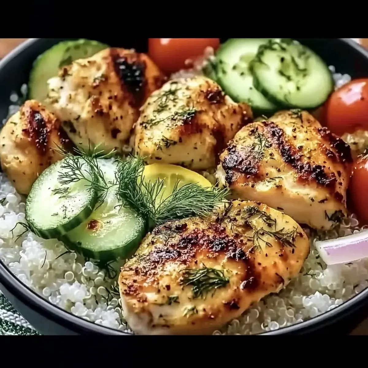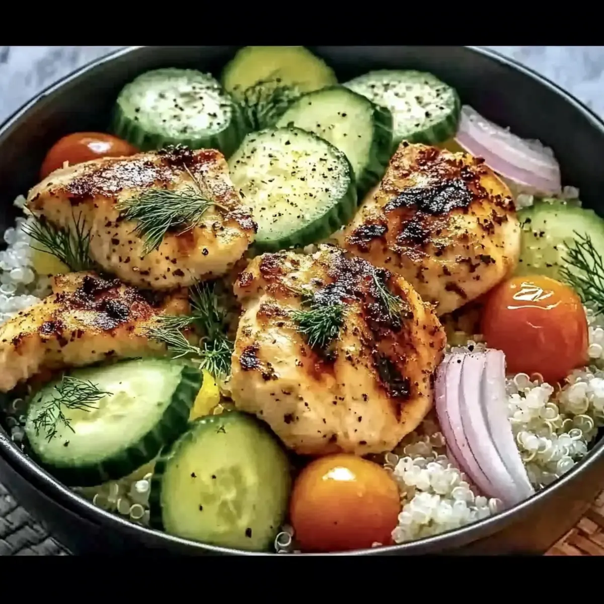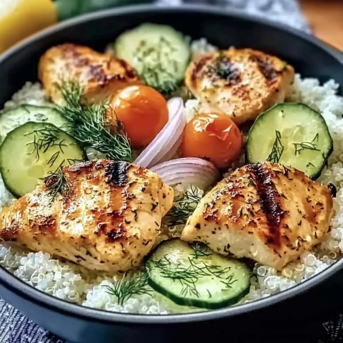 Jump to Recipe Print RecipeAs I stood in my kitchen, the zest of fresh lemon filled the air, igniting a lightness that instantly brightened my day. That’s when I knew I was on the verge of creating something spectacular: Mediterranean Lemon-Dill Chicken Bowls! This dish is not just a meal; it’s a vibrant escape into the sun-soaked shores of the Mediterranean, showcasing juicy grilled chicken nestled on a bed of fluffy quinoa, adorned with crisp summer veggies. Perfect for busy weeknights or meal prep, these bowls are both a feast for the eyes and a delight for the taste buds. With minimal prep time and a bounty of healthy ingredients, you owe it to yourself to savor this satisfying recipe. Ready to sprinkle some deliciousness into your week? Let’s dive into what makes this bowl a must-try! Why are Mediterranean Lemon-Dill Chicken Bowls a must-try? Freshness at your fingertips: Bright lemon and fragrant dill elevate the flavor profile, making each bite a burst of sunshine. Healthy and hearty: With lean grilled chicken and nutritious quinoa, this bowl is a fulfilling meal that supports your wellness goals. Weekend-friendly meal prep: Prepare ahead, and you’ll have delicious dinners ready to go all week! Just like our Thai Peanut Chicken recipe, it’s all about smart planning. Crowd favorite: Delight your family or friends with colors and textures that are as appealing as they are delicious. Versatile options: Customize your bowl with everything from a savory tzatziki drizzle to a spicy kick—perfect for experimenting! Mediterranean Lemon-Dill Chicken Bowls Ingredients For the Chicken Marinade Chicken breasts – the star of the show; boneless and skinless for quick cooking and tenderness. Lemon juice – fresh is best; it provides a zesty brightness that elevates your Mediterranean Lemon-Dill Chicken Bowls. Fresh dill – this herb adds a fragrant and fresh flavor; if you don’t have it, dried dill can work (use 1/3 the amount). Olive oil – essential for tenderizing the chicken and adding some healthy fats; you can use a neutral oil if preferred. Garlic ( minced) – enhances the overall flavor beautifully; fresh garlic is recommended for the best taste. Salt & Pepper – key seasoning elements; feel free to adjust according to your personal preferences. For the Base Quinoa or rice – your choice of base; they add texture and nutrients, simply cook per package instructions. For the Fresh Veggies Cucumber (chopped) – adds crunch and freshness; cut into bite-sized pieces for easy eating. Cherry tomatoes (halved) – juicy and sweet; they complement all the other flavors wonderfully. Red onion (thinly sliced) – provides sharpness and vibrant color; soak in water if you prefer a milder flavor. For Serving Lemon-dill dressing – this optional drizzle can enhance the flavor; simply add before serving for a zesty finish. Step‑by‑Step Instructions for Mediterranean Lemon-Dill Chicken Bowls Step 1: Marinate the Chicken In a mixing bowl, combine fresh lemon juice, chopped dill, olive oil, minced garlic, and a generous sprinkle of salt and pepper. Add the boneless, skinless chicken breasts to the mixture, making sure they are well-coated. Cover and let it marinate in the refrigerator for at least 30 minutes, although allowing it to soak for up to 12 hours will intensify the flavors. Step 2: Cook the Grains While the chicken marinates, prepare your base for the Mediterranean Lemon-Dill Chicken Bowls by cooking quinoa or rice according to the package instructions. Typically, quinoa requires about 15 minutes and should be fluffed with a fork once done. Keep the grains warm on the stove or cover them with a clean towel while preparing the rest of the ingredients. Step 3: Grill the Chicken Preheat your grill to medium heat, around 350°F to 400°F. Once heated, remove the chicken from the marinade and place it on the grill grates. Grill the chicken for approximately 6-7 minutes per side or until the internal temperature reaches 165°F. You’ll know it’s done when it has nice grill marks and is no longer pink in the center. Step 4: Prepare the Fresh Veggies While the chicken is grilling, wash and chop the fresh veggies. Dice the cucumber into bite-sized pieces, halve the cherry tomatoes, and thinly slice the red onion. If the raw onion’s flavor is too strong for your taste, soak the slices in cold water for 10 minutes to mellow them out. Set the prepped veggies aside in a bowl. Step 5: Assemble the Bowls Once the chicken is grilled and slightly cooled, slice it into strips. In serving bowls, create a base using the fluffy quinoa or rice, then arrange the chicken slices on top. Add a generous helping of the fresh veggies: cucumber, cherry tomatoes, and red onion for color and crunch, making your Mediterranean Lemon-Dill Chicken Bowls visually appealing. Step 6: Serve and Enjoy Finally, if desired, drizzle the bowls with your homemade lemon-dill dressing for an extra zesty kick. These Mediterranean Lemon-Dill Chicken Bowls can be served warm or at room temperature, perfect for sharing with family or enjoying as a satisfying meal prep option throughout the week. Make Ahead Options Mediterranean Lemon-Dill Chicken Bowls are a fantastic choice for busy home cooks looking to save time without sacrificing flavor! You can marinate the chicken up to 24 hours in advance, ensuring those zesty flavors permeate every bite. Additionally, you can prepare the quinoa or rice and chop the veggies (cucumber, tomatoes, and red onion) up to 3 days prior. Just store the grains and chopped vegetables separately in airtight containers in the refrigerator to maintain their freshness and texture. When you’re ready to serve, simply grill the marinated chicken, slice it, and assemble your bowls with the prepped ingredients. Voila! A delicious meal with minimal last-minute effort awaits you. Expert Tips for Mediterranean Lemon-Dill Chicken Bowls Marinate Wisely: Aim for 2-4 hours of marinating for the bes
