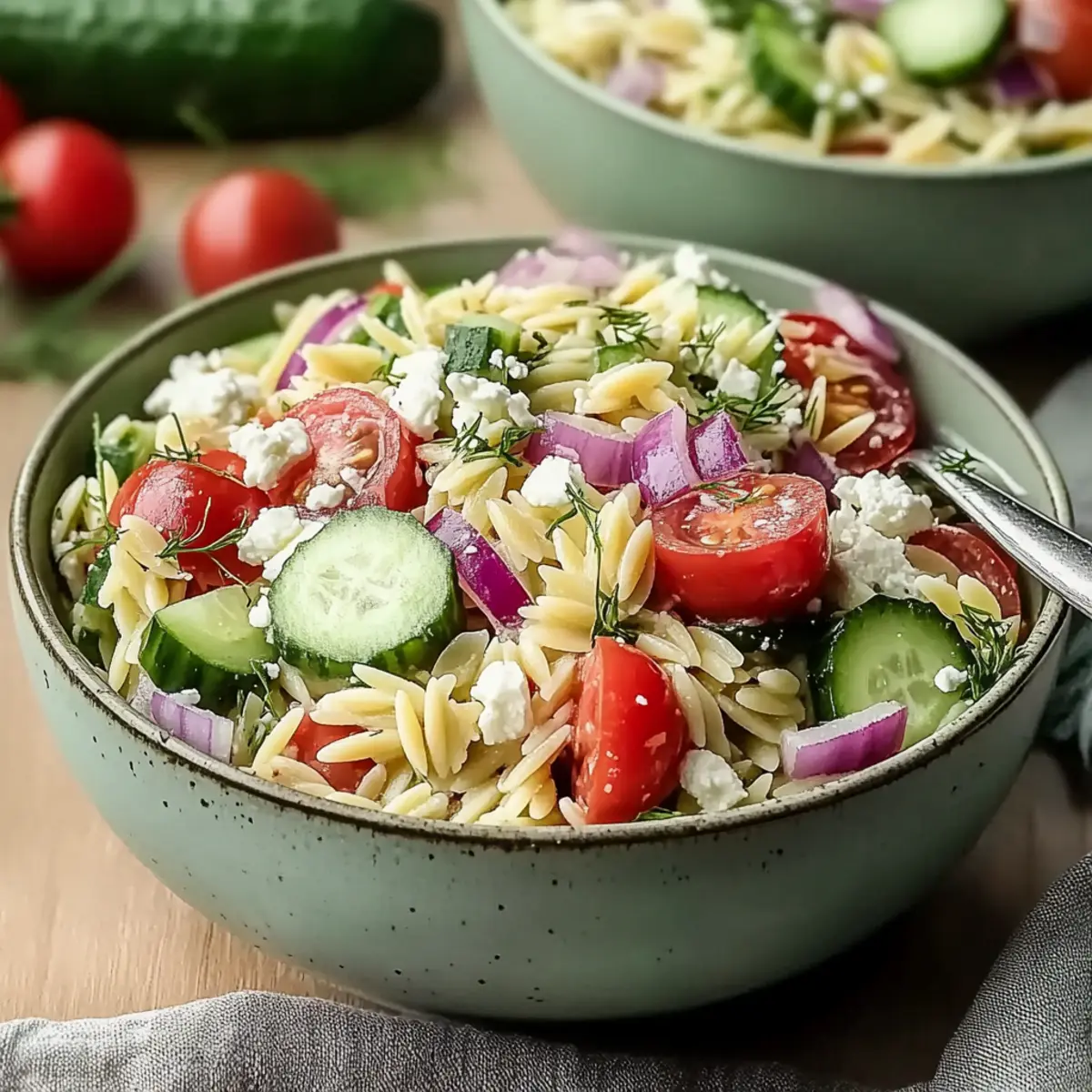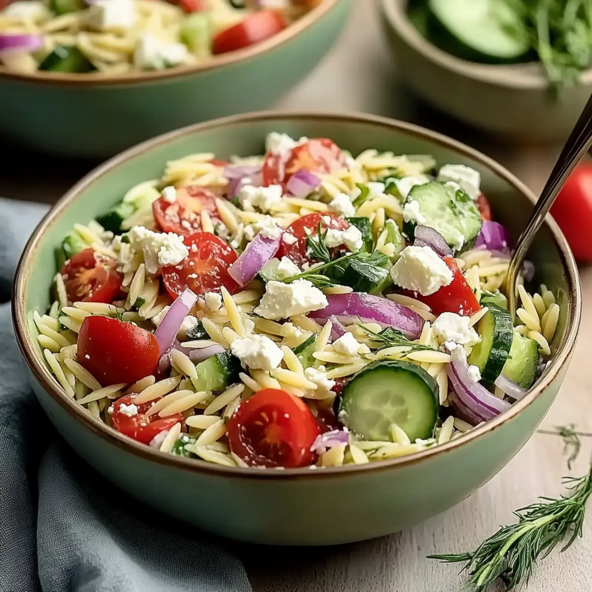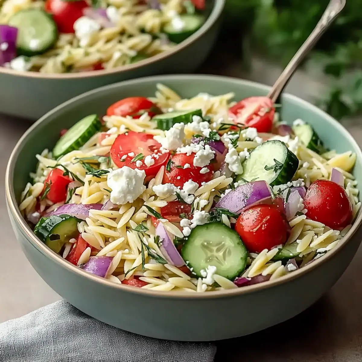 Jump to Recipe Print RecipeThe sun kissed my skin as I savored the last bites of a delightful Mediterranean Orzo Pasta Salad at a vibrant summer picnic. This dish—perfect for warm weather gatherings—comes together in under 30 minutes, allowing you to spend less time in the kitchen and more time enjoying the outdoors. Bursting with a medley of colorful veggies and creamy feta, this make-ahead salad is not only a feast for the eyes but also vegetarian-friendly and oh-so-refreshing. Imagine serving it alongside grilled chicken or as a satisfying standalone dish that brightens any meal. Tempted to try your hand at this easy recipe? Let’s jump in and create something delicious together! Why is This Salad a Must-Try? Quick and Easy: In less than 30 minutes, you can whip up this delightful Mediterranean Orzo Pasta Salad, making it perfect for busy weeknights or impromptu gatherings. Vibrant Flavors: This salad combines fresh vegetables, tangy feta, and a zesty vinaigrette that bursts with Mediterranean flavors, offering a refreshing bite any time of year. Make-Ahead Goodness: Prepare it in advance for picnics or potlucks—just let the flavors meld in the fridge for an irresistible taste sensation. Versatile Ingredients: Choose your favorite veggies! Mix in bell peppers or zucchini, or swap orzo for quinoa for a gluten-free option that meets everyone’s preferences. Crowd-Pleaser: Whether served as a side dish alongside grilled proteins or as a main event, this salad is a guaranteed hit at summer cookouts and family dinners. For more delicious salad ideas, check out this Chickpea Salad Grilled or a fresh Thai Chicken Salad. Mediterranean Orzo Pasta Salad Ingredients • Perfect for quick prep! For the Salad Orzo – Base of the salad; provides a chewy texture. Use whole wheat or tri-color orzo for added nutrients or visual appeal. Tomatoes – Freshness and sweetness; diced to retain their shape. Substitute with cherry tomatoes halved for a sweeter flavor. Cucumbers – Add crunch and flavor; diced to ensure even distribution. English cucumbers can be used for less moisture. Red Onion – Provides a sharp flavor; finely diced for subtlety. Use green onions for a milder profile. Olives – Adds saltiness and richness. Kalamata or green olives work well for variety. Feta Cheese – Introduces creaminess and tang. Could substitute with goat cheese for a different flavor or omit for a vegan option. Dill – Fresh herb flavor; enhances Mediterranean taste. Substitute parsley or mint for a different herbal touch. For the Dressing Olive Oil – Base of the dressing; provides richness. Avocado oil can be used for a lighter option. Lemon Juice – Adds brightness and acidity to the dish. Vinegar can substitute for a different tang. Oregano, Garlic Powder, Salt, Pepper – Seasoning blend; enhances overall flavor. Fresh garlic can replace garlic powder for a bolder taste. Step‑by‑Step Instructions for Mediterranean Orzo Pasta Salad Step 1: Prep Vegetables Begin by dicing the tomatoes and cucumbers into 1/2-inch pieces to maintain their shape and freshness. Finely chop the red onion to add a subtle sharpness to the salad. Arrange your colorful veggies on a cutting board for easy access, and prepare to create a refreshing Mediterranean Orzo Pasta Salad. Step 2: Cook Orzo In a large pot, bring salted water to a boil over high heat. Once boiling, add the orzo and cook for 8-10 minutes, stirring occasionally, until it reaches an al dente texture. Keep an eye on the pasta, as overcooking can lead to a mushy salad. Drain the orzo in a colander and set it aside to cool. Step 3: Make Dressing While the orzo is cooking, take a small bowl and whisk together the olive oil, fresh lemon juice, oregano, garlic powder, salt, and pepper. This zesty vinaigrette will enhance the Mediterranean Orzo Pasta Salad’s flavors. Aim for a balanced, tangy dressing that not only brings the ingredients together but also complements the vibrant vegetables. Step 4: Cool Pasta Once the orzo has finished cooking, drain it and quickly rinse it under cold running water to stop the cooking process. This cooling step ensures the pasta remains firm and prevents stickiness. If the orzo looks slightly shiny, you’ve rinsed it well enough. Set it aside until it reaches room temperature. Step 5: Combine Ingredients In a large mixing bowl, combine the cooled orzo with your diced tomatoes, cucumbers, finely chopped red onion, olives, feta cheese, and dill. Stir gently to incorporate all the colorful ingredients without breaking the feta. This vibrant mix is the heart of your Mediterranean Orzo Pasta Salad, full of wholesome goodness. Step 6: Dress Salad Pour the prepared dressing over the combined ingredients and toss gently until everything is evenly coated. Be careful not to overdo it, as you want the vegetables to maintain their integrity. This step infuses each bite of the Mediterranean Orzo Pasta Salad with flavor and richness. Step 7: Chill and Serve Cover the mixing bowl with plastic wrap or transfer the salad to an airtight container. Let it chill in the fridge for at least 30 minutes to allow the flavors to meld beautifully. Chilling also enhances the refreshing experience when serving your delightful Mediterranean Orzo Pasta Salad, making it simply irresistible. What to Serve with Mediterranean Orzo Pasta Salad Elevate your meal with delightful sides and pairings that harmonize beautifully with this refreshing dish. Grilled Chicken: Tender, juicy chicken complements the salad’s fresh flavors while adding protein for a satisfying meal. Lamb Skewers: The rich, savory taste of grilled lamb pairs exquisitely with the zesty orzo, transporting your taste buds to the Mediterranean. Pita Bread: Soft and warm pita is perfect for scooping up salad, providing a delightful contrast in texture that’s too good to resist. Serve with a side of hummus to elevate the experience! Tzatziki Sauce: This tangy yogurt sauce enhances the salad’