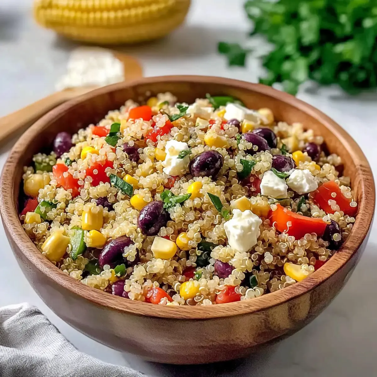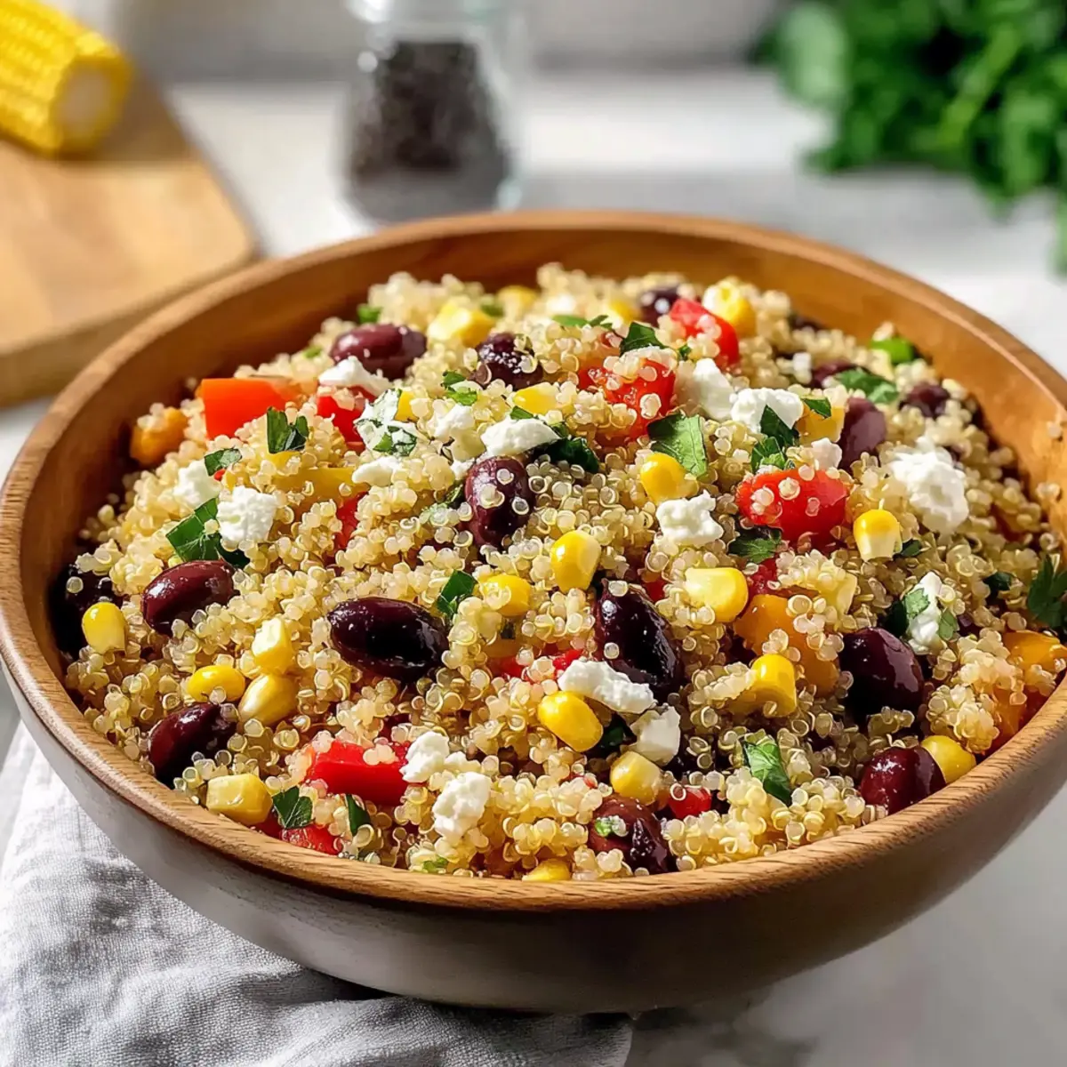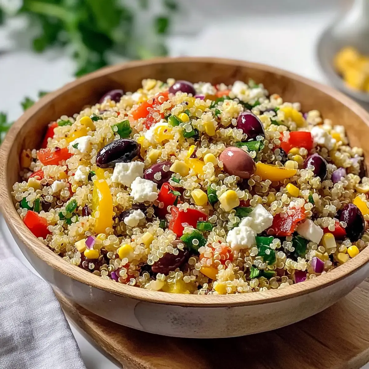 Jump to Recipe Print RecipeA vibrant splash of colors and flavors awaits in my kitchen as I toss together this Mediterranean Quinoa Salad. The combination of fluffy quinoa, briny olives, and crunchy peppers creates a delightful texture that dances on the palate. What I love most about this recipe is its versatility; it’s not only a healthy and gluten-free option, but it’s also a brilliant make-ahead dish that truly improves in flavor as it sits. Perfect for summer barbecues or a quick meal prep, this salad embodies the essence of Mediterranean freshness, making it a go-to for both casual lunches and festive gatherings. Are you ready to savor every delicious bite? Let’s dive into this easy-to-follow recipe! Why is Mediterranean Quinoa Salad a Must-Try? Vibrant Colors: This salad is a feast for the eyes, blending bright veggies and creamy feta for an appealing dish. Healthy Ingredients: Packed with nutrients from quinoa and fresh vegetables, it’s a guilt-free choice perfect for wholesome eating. Make-Ahead Convenience: Prepare it in advance for effortless meals, as the flavors get even better after marinating. Crowd-Pleasing Flavor: With a delightful mix of textures and tangy dressing, it’s sure to impress at potlucks or family gatherings. Versatile Base: Swap in your favorite veggies or proteins for a personalized twist, just like in my Chickpea Salad Grilled or the refreshing Quinoa Crunch Salad. Mediterranean Quinoa Salad Ingredients For the Salad • Quinoa – a nutritious base that becomes fluffy when cooked; rinse well to avoid bitterness. • Olives – add a salty, briny flavor; feel free to choose your favorite variety such as Kalamata or green. • Peppers – offer sweetness and crunch; any color will do (red, yellow, or green) to brighten the dish. • Corn – a touch of natural sweetness; fresh or canned works beautifully. • Red Onion – provides a sharp bite; use to your taste or omit for a milder flavor. • Cilantro – adds a fresh herbaceous note; don’t forget to use the tender stems for extra flavor. • Feta Cheese – creamy and tangy, a perfect complement that can be swapped out for a vegan alternative if desired. • Olive Oil – the star of your dressing, enhancing overall flavor; avocado oil can substitute for a different twist. • Red Wine Vinegar – brings the essential acidity; if you prefer, lemon juice is a great substitute. • Dried Oregano – infuses the salad with Mediterranean aroma; crush it before use to release all the wonderful oils. • Salt – enhances flavor; adjust the amount to suit your preferences. • Black Pepper – adds a mild heat; freshly cracked is best for maximum flavor. • Fresh Parsley – brightens the salad with freshness and color; feel free to experiment with other herbs like dill. Optional Additions • Chickpeas – try adding these for a protein boost and extra heartiness. • Grilled Chicken – for a delicious non-vegetarian option, grilled chicken pairs perfectly with the flavors. • Cucumbers or Cherry Tomatoes – swap any veggies you prefer for a personalized touch. Step‑by‑Step Instructions for Mediterranean Quinoa Salad Step 1: Rinse Quinoa Start by rinsing 1 cup of quinoa under cold running water for about 30 seconds in a fine-mesh strainer to remove its natural bitterness. Make sure to drain it thoroughly before cooking to ensure perfect fluffy grains in your Mediterranean Quinoa Salad. Step 2: Cook Quinoa In a medium saucepan, bring 2 cups of water to a rolling boil. Add the rinsed quinoa along with a pinch of salt, then reduce the heat to low. Cover and let it simmer for 15 minutes or until the quinoa absorbs all the liquid. Afterward, remove it from heat and let it sit covered for an additional 5 minutes before fluffing it with a fork. Step 3: Cool Quinoa Spread the cooked quinoa evenly on a large baking sheet to cool quickly. Allow it to sit for about 10-15 minutes, making sure it completely cools down. This step is crucial to prevent wilting your fresh vegetables when you mix them into the Mediterranean Quinoa Salad. Step 4: Prepare Vegetables While the quinoa is cooling, take this time to dice your choice of colorful peppers, slice the olives, and finely chop the red onion, cilantro, and parsley. These fresh ingredients will bring vibrant flavors and textures to your Mediterranean Quinoa Salad, ensuring every bite is delightful. Step 5: Make Vinaigrette In a small mixing bowl, whisk together 1/4 cup of olive oil, 2 tablespoons of red wine vinegar, 1 teaspoon of dried oregano, and a pinch of salt and black pepper. Let the vinaigrette sit for a minute to meld the flavors, creating a delicious dressing that will elevate your Mediterranean Quinoa Salad. Step 6: Combine Ingredients In a large mixing bowl, combine the cooled quinoa with your prepared vegetables, freshly chopped herbs, and crumbled feta cheese. Drizzle the vinaigrette over the mixture and gently toss until everything is well coated and evenly distributed, ensuring every ingredient shines in your Mediterranean Quinoa Salad. Step 7: Taste and Adjust Before serving, take a moment to taste the salad and adjust the seasoning as needed. If you find it lacking, add a pinch of salt or a dash more of the vinaigrette. Perfecting the flavor enhances the overall experience of the Mediterranean Quinoa Salad, ensuring it’s both delicious and satisfying. Step 8: Let it Rest Allow your Mediterranean Quinoa Salad to sit for 15-30 minutes at room temperature or in the fridge. This resting period lets the flavors meld beautifully, ensuring that every bite bursts with the essence of the Mediterranean when you serve it. What to Serve with Irresistible Mediterranean Quinoa Salad? Transform your Mediterranean experience into a full meal by pairing it with delightful sides and treats that enhance its vibrant flavors. Grilled Lemon Chicken: Juicy, tangy chicken adds protein and a zesty contrast to the fresh salad. Perfect for outdoor gatherings! 