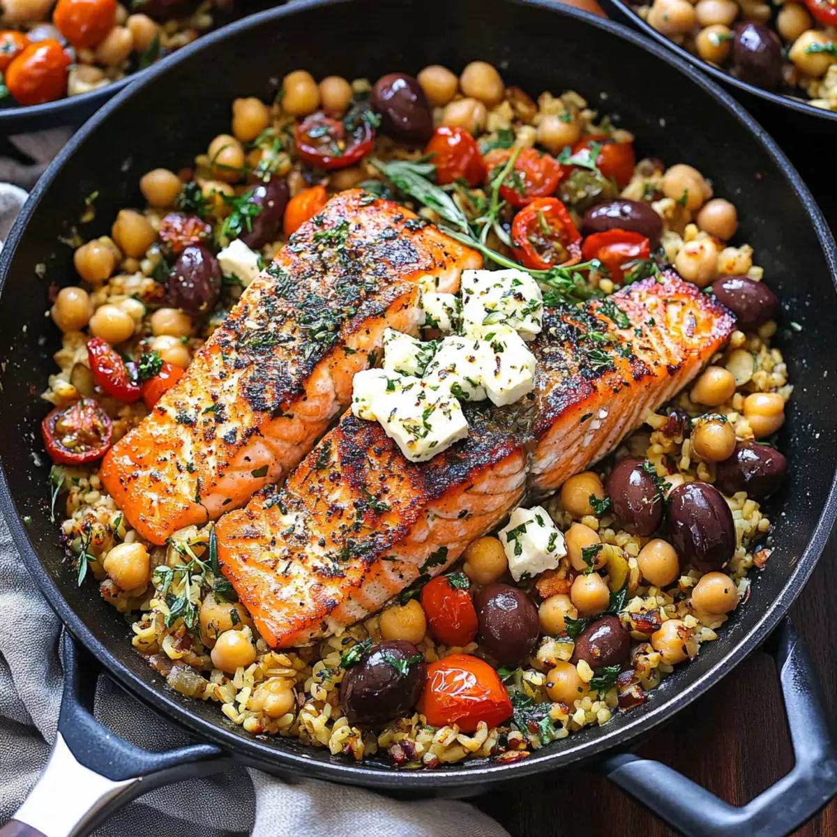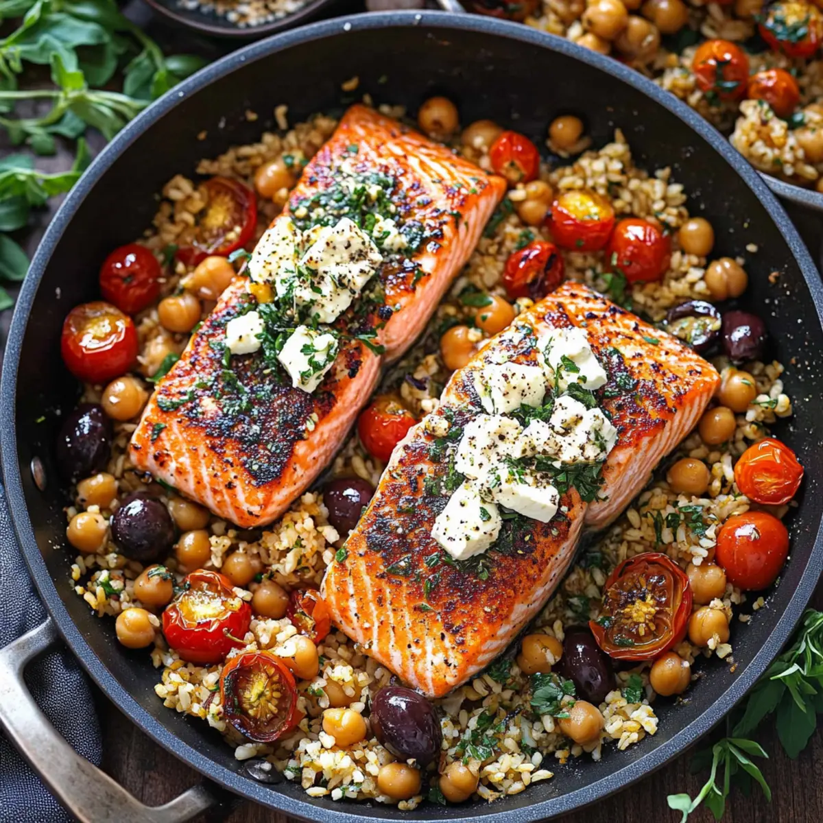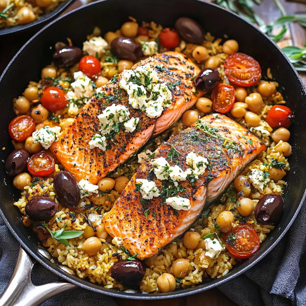 Jump to Recipe Print RecipeAs the sun dips low, painting the kitchen in golden hues, the enticing aroma of Mediterranean Salmon starts to fill the air. This one-pan wonder cooks up in just 30 minutes, effortlessly merging juicy salmon with zesty chickpeas and vibrant cherry tomatoes. Not only is this dish gluten-free and high in protein, making it a wholesome choice for any meal, but it’s also a feast for the senses, bringing the warmth and cheer of the Mediterranean right to your table. Whether you’re looking for a quick weeknight dinner or a showstopper for your next gathering, this Mediterranean Salmon recipe will leave your loved ones craving more. What will your favorite part of this dish be—the tender flaky salmon or the creamy feta? Why is Mediterranean Salmon a Must-Try? Easily Crafted: This one-pan meal is ready in just 30 minutes, perfect for busy weeknights when you crave wholesome flavor without the fuss. Rich Mediterranean Flavors: The delightful combination of tender salmon, zesty chickpeas, and fresh cherry tomatoes creates a dish that bursts with vibrant taste. Crowd-Pleasing Appeal: Whether you’re cooking for family or hosting friends, this dish is sure to impress with its beautiful presentation and mouthwatering aromas. Nutrient-Packed Delight: Enjoy a meal that’s not only delicious but also rich in omega-3 fatty acids and protein, catering to your health-conscious lifestyle. Versatile Ingredients: Feel free to swap salmon for chicken or tofu and customize with herbs like dill or basil for a personal touch. Don’t forget to check out my other favorites, like Garlic Butter Salmon and Honey Sriracha Salmon, for even more inspiration! Mediterranean Salmon Ingredients For the Salmon • Salmon Fillets – Choose high-quality fillets like Scottish or Sockeye for unmatched freshness. • Smoked Paprika – Adds depth and smokiness; regular paprika works in a pinch. • Salt – Essential for enhancing the overall flavor during cooking. For the Rice Base • Cooked Jasmine Rice – Serves as a hearty base; brown rice or quinoa can boost nutrition. • Chickpeas (canned) – Adds fiber and protein; lentils are a great alternative if desired. • Cherry Tomatoes – Contributes sweetness and acidity; any ripe tomato can be substituted. • Kalamata Olives – Brings a salty, briny flavor; green olives can also work. Herbs and Spices • Dried Oregano – Offers traditional Mediterranean flair; fresh oregano will pack a stronger punch. • Dried Parsley – Adds a mild flavor and a pop of color; fresh parsley is a lovely swap. • Red Chili Flakes – Provides a touch of heat; adjust to your preference or omit for a milder version. For the Finish • Olive Oil – A flavor-rich cooking fat; opt for extra virgin for the best taste. • Fresh Lemon Juice – Brightens the dish with its acidity; always use freshly squeezed for optimal flavor. • Feta Cheese – Delivers creaminess and saltiness; non-dairy feta is a great option for a dairy-free choice. Get ready to savor this Mediterranean Salmon dish that will surely elevate your dinner experience! Step‑by‑Step Instructions for Mediterranean Salmon Step 1: Cook the Salmon Begin by heating a large skillet over medium-high heat and adding a drizzle of olive oil. Season the salmon fillets generously with smoked paprika, salt, and pepper. Place the salmon in the pan skin-side up and sear for 4 minutes without moving it, until the surface is golden brown. Carefully flip the fillets to cook for an additional 5 minutes, or until the salmon is opaque and flakes easily. Step 2: Remove the Salmon Skin Once the salmon has finished cooking, carefully transfer the fillets onto a plate. Allow them to rest for a moment, then gently peel off the skin while the salmon is still warm. This will reveal the beautifully cooked fish ready to be paired with the Mediterranean flavors in this delightful dish. Step 3: Prepare Mediterranean Rice In the same skillet, add the cooked jasmine rice, drained chickpeas, sliced cherry tomatoes, and kalamata olives. Stir everything together, ensuring the ingredients are fully combined. Squeeze fresh lemon juice over the mixture and heat it through, stirring continuously for about 3-4 minutes, until the tomatoes soften and the flavors meld together. Season with additional salt and pepper to taste. Step 4: Make Feta Mixture In a separate bowl, combine cubed feta cheese with a drizzle of olive oil, extra lemon juice, and dried oregano. Mix well until the feta is evenly coated in the oil and herbs, creating a creamy and flavorful topping to enhance your Mediterranean Salmon dish. Step 5: Combine and Serve Gently fold half of the prepared feta mixture into the rice skillet for added creaminess. Once combined, place the cooked salmon fillets back into the skillet, allowing them to warm for about a minute. Top the dish with the remaining feta mix and garnish with fresh oregano leaves for a pop of color. Serve hot to enjoy a delightful and satisfying dinner. Mediterranean Salmon Variations & Substitutions Feel free to explore the enticing possibilities with these variations, making each dish your own personal masterpiece! Dairy-Free: Use non-dairy feta to keep the creamy texture while making it suitable for dairy-free diets. You’ll still enjoy all the Mediterranean goodness without the dairy. Protein Swap: Replace salmon with chicken or tofu for a different protein option. Each alternative brings its unique texture, enhancing the overall meal experience. A marinade can work wonders here! Grain Alternative: Swap out jasmine rice for quinoa or brown rice to up the nutritional value. Both options offer delightful texture and flavor, making your base just as satisfying! Extra Veggies: Toss in some spinach or asparagus for added nutrients and color. They’ll cook beautifully with the rice, bringing a bright freshness to each bite. Herb Infusion: Experiment with dill or basil instead of oregano for distinct flavo