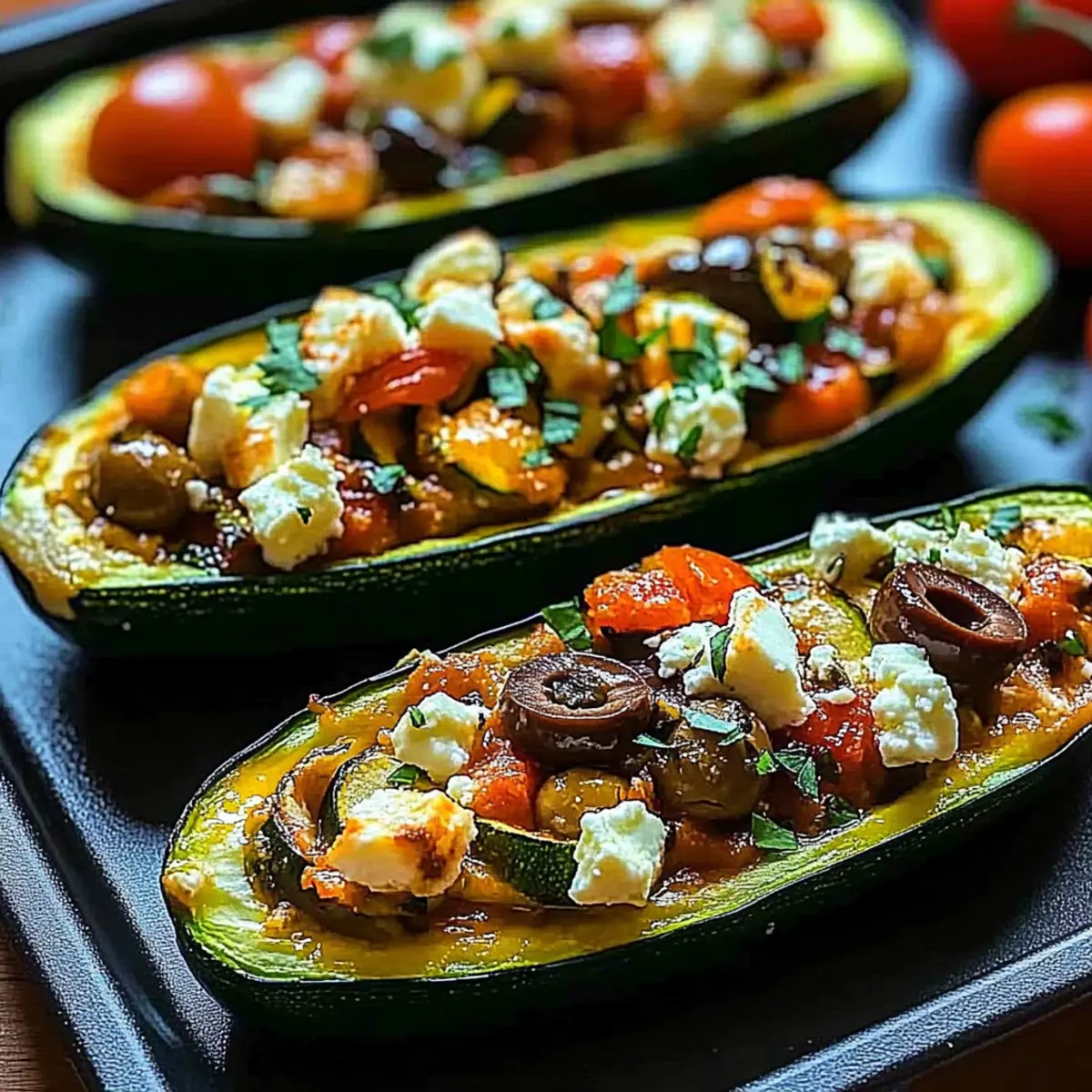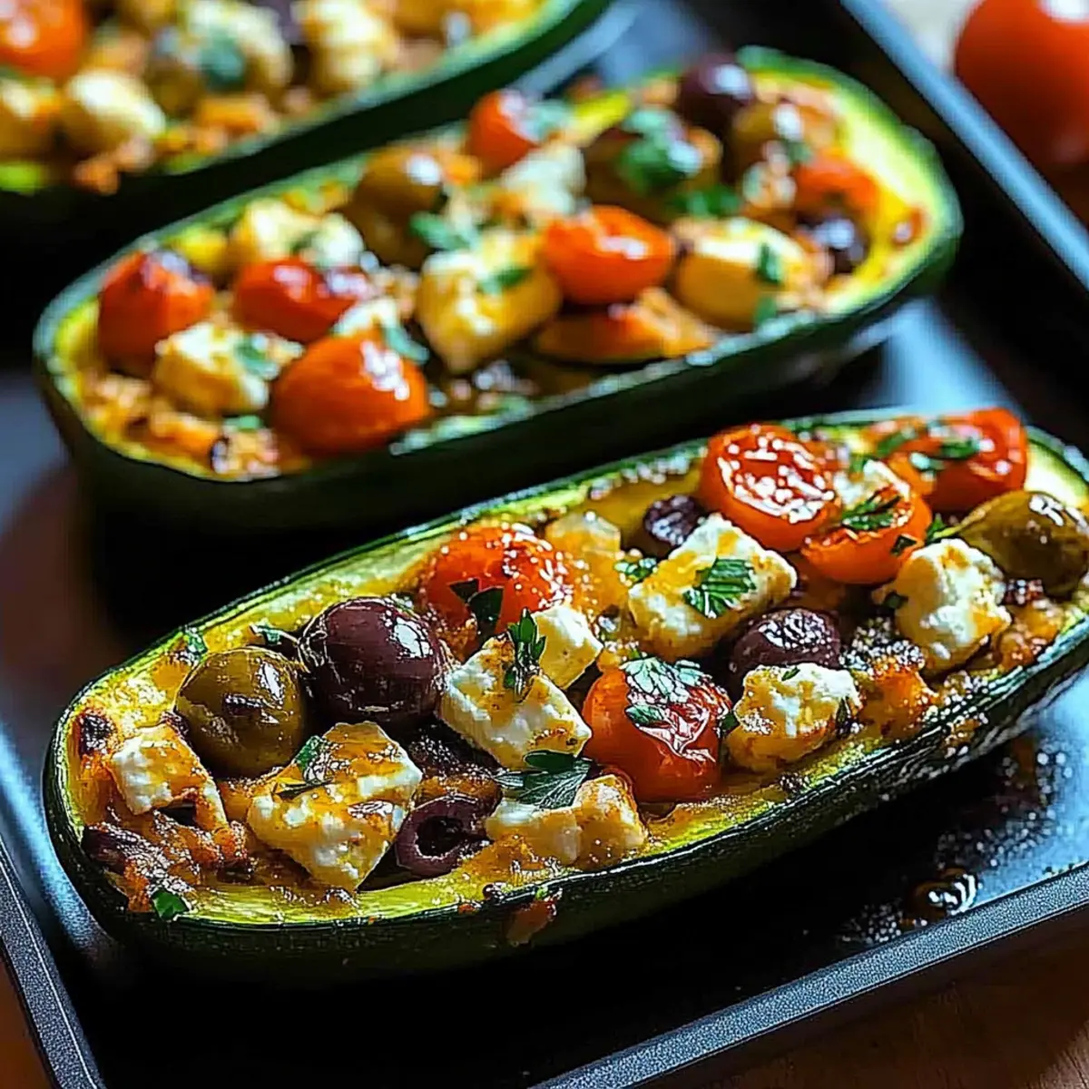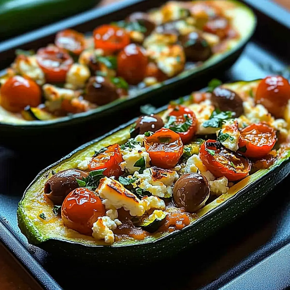 Jump to Recipe Print RecipeAs I stood in my kitchen surrounded by colorful, fresh vegetables, I couldn’t help but feel transported to the sun-drenched shores of the Mediterranean. That’s when the idea for my Mediterranean Stuffed Zucchini Recipe hit me! This dish not only brightens up any dinner table but also showcases the nutritious goodness of zucchini filled with a delightful mix of feta, tomatoes, and aromatic herbs. What I love most about these stuffed zucchini boats is how simple they are to prepare and how they can easily transform into a hearty main dish or a vibrant side, perfect for any occasion. Plus, they’re vegetarian and incredibly satisfying, making them a great fit for meal prep too. Ready to explore this healthy and delicious recipe that brings a taste of summer into your home? Let’s dive in and start cooking! Why is this Mediterranean Dish a Must-Try? Vibrant Flavors: Each bite offers a delightful explosion of fresh herbs, tangy tomatoes, and creamy feta, transporting your taste buds straight to the Mediterranean coast. Nutritious Goodness: Packed with health benefits, this dish is low in calories but rich in vitamins C and A, making it a fantastic choice for a wholesome meal. Quick and Easy: Perfect for busy weeknights, it takes minimal prep time and can be whipped up in under an hour! Endless Variations: Feel free to switch things up—try adding grains like quinoa or replacing feta with a goat cheese for a unique twist. Crowd-Pleasing Appeal: Whether hosting friends or enjoying a quiet dinner for two, these stuffed zucchini boats are sure to impress and satisfy everyone at the table. Plus, if you’re looking for more delicious vegetarian options, check out my recipes for Greek Stuffed Onions and Chicken Zucchini Bake for more inspiration! Mediterranean Stuffed Zucchini Ingredients For the Zucchini Boats • Zucchini – the star of this dish, hollowed to create a healthy, low-calorie base. For the Filling • Tomatoes – add sweetness and moisture; cherry tomatoes work wonderfully for extra flavor. • Red Onion – brings sweetness; substitute with shallots for a milder taste. • Garlic – enhances overall flavor; fresh minced garlic is best for a vibrant kick. • Feta Cheese – provides creaminess; goat cheese can be a delightful substitute or leave it out for vegan options. • Olives – offer a salty contrast; Kalamata olives are traditional, but green olives work in a pinch. • Fresh Herbs (Parsley, Basil) – add freshness and aroma; feel free to mix and match with dill or mint. • Lemon Juice/Zest – brightens the filling; lime juice can also be a zesty alternative. • Olive Oil – essential for moisture and flavor; melted coconut oil can give a different twist. • Breadcrumbs (optional) – adds a lovely crunch on top; try gluten-free breadcrumbs if desired. These ingredients come together to create a delicious Mediterranean stuffed zucchini recipe that dazzles your taste buds. Happy cooking! Step‑by‑Step Instructions for Mediterranean Stuffed Zucchini Recipe Step 1: Preheat the Oven Begin by preheating your oven to 375°F (190°C). This ensures that your Mediterranean stuffed zucchini will cook evenly and achieve the perfect tender texture. While the oven heats up, you can prepare the zucchini, making the most of your time in the kitchen. Step 2: Prepare the Zucchini Carefully slice the zucchinis in half lengthwise and scoop out the flesh, leaving a ¼ inch border to form sturdy boats. Set the hollowed zucchini halves aside and chop the scooped-out flesh. This preparation will create the ideal base for your flavorful filling. Step 3: Season the Zucchini Boats Drizzle the prepared zucchini halves with olive oil and season generously with salt and pepper. This simple seasoning elevates the overall flavor of your Mediterranean stuffed zucchini. Place the zucchini boats cut side up on a parchment-lined baking sheet, ready for stuffing. Step 4: Sauté Aromatics In a skillet over medium heat, add a splash of olive oil and sauté the chopped red onion and minced garlic for 3–4 minutes. Stir continuously until the onion becomes translucent and fragrant, filling your kitchen with inviting aromas. This step forms a delicious foundation for your stuffing. Step 5: Cook Zucchini Flesh Add the chopped zucchini flesh to the skillet and cook for an additional 2–3 minutes. This helps reduce moisture in the filling, ensuring your Mediterranean stuffed zucchini won’t become soggy. Stir frequently until the mixture is well combined and slightly softened. Step 6: Integrate Filling Ingredients Stir in the quartered tomatoes and chopped olives, along with salt and pepper to taste. Cook for about 5 minutes until the tomatoes release their juices, creating a savory mixture brimming with Mediterranean flavors. Remove from heat when everything is well-cooked and blend harmoniously. Step 7: Mix in Cheese and Herbs Carefully fold in the crumbled feta, oregano, cumin (if using), parsley, basil, lemon zest, and half of the lemon juice into the mixture. This step brings in the tangy and fresh elements that truly define your Mediterranean stuffed zucchini. Make sure all ingredients are evenly combined. Step 8: Stuff the Zucchini Boats Evenly fill each zucchini boat with the prepared mixture, packing it lightly to ensure a hearty serving. If you wish, top each stuffed zucchini with breadcrumbs for an added crunch. This not only enhances texture but also adds a beautiful golden finish during baking. Step 9: Bake the Stuffed Zucchini Drizzle a little olive oil over the filled zucchini boats and transfer them to your preheated oven. Bake for 25–30 minutes, or until the zucchini is tender and the tops are golden brown. You’ll know they’re done when a fork easily pierces the zucchini, and the filling looks invitingly crisp. Step 10: Finish and Serve Once baked to perfection, remove the Mediterranean stuffed zucchini from the oven and give them a final squeeze