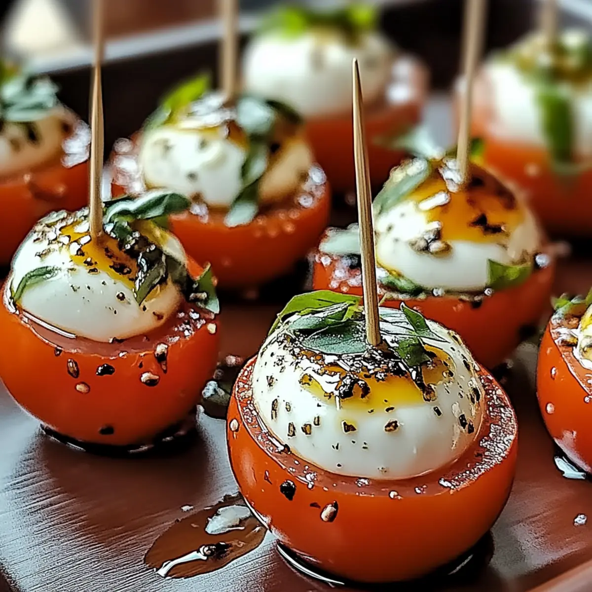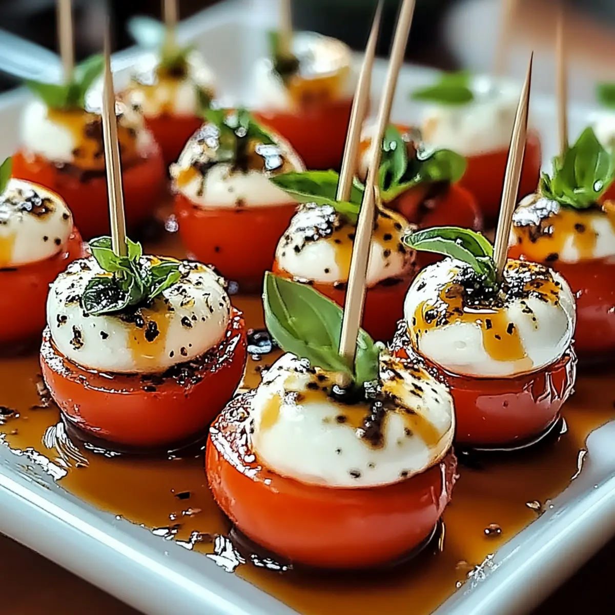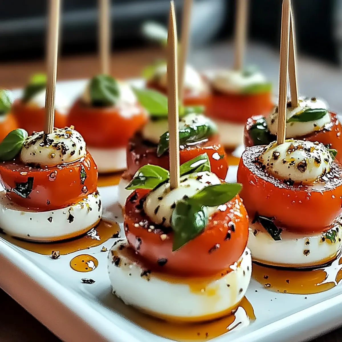 Jump to Recipe Print RecipeAs I stood in my kitchen, the summer sun pouring through the window, the vibrant colors of fresh produce sparked a moment of inspiration. Enter Mini Caprese Bites—a bright and delightful no-cook appetizer that captures the essence of sun-kissed days. With sweet cherry tomatoes, creamy mozzarella, and fragrant basil dancing together on a toothpick, these bites are not just easy to assemble; they are a health-conscious treat as they fit seamlessly into gluten-free and low-carb diets. Perfectly suited for backyard gatherings or an afternoon picnic, their charm lies in their simplicity and refreshing taste. Are you ready to embrace a bit of Italian flavor in your next snack? Let’s dive into this delicious recipe! Why Are Mini Caprese Bites Perfect? Ease of Preparation: These delightful bites require no cooking—simply assemble and enjoy, making them great for busy days or last-minute gatherings. Bursting with Freshness: Each bite combines juicy tomatoes, creamy mozzarella, and aromatic basil for a refreshing flavor explosion, reminiscent of summer. Health-Conscious Choice: Naturally gluten-free and low-carb, they are a guilt-free option, ideal for anyone looking to impress without the heavy calories. Versatile Appeal: Customize with various herbs or add prosciutto for a savory twist, offering something for everyone. Pair them with a side of Garlic Chili Bites for a complete appetizer platter! Crowd-Pleasing: These flavorful bites are sure to be a hit whether at casual picnics or elegant dinner parties, ensuring all guests leave satisfied. Mini Caprese Bites Ingredients For the Bites • Cherry Tomatoes – Adds sweetness and juiciness; substitute with grape tomatoes for a different size. • Fresh Basil – Provides aromatic freshness; experiment with mint or parsley for a unique twist. • Small Mozzarella Balls (Bocconcini) – Creamy texture and richness; part-skim mozzarella can lighten the dish. For the Dressing • Balsamic Glaze – Complements flavors with sweetness and acidity; a homemade reduction of balsamic vinegar can be used as a substitute. • Olive Oil – Enhances richness and flavor; choose high-quality extra virgin olive oil for the best results. • Salt & Pepper – Essential for seasoning; adding Italian herbs can enhance flavor depth. For Assembly • Toothpicks or Small Skewers – Necessary for assembly, ensuring they are sturdy enough to hold ingredients together. Step‑by‑Step Instructions for Mini Caprese Bites Step 1: Prepare the Tomatoes Start by washing and drying your cherry tomatoes thoroughly. If you prefer a roasted flavor, slice them in half and drizzle with olive oil. Place the tomatoes on a baking sheet and roast them in a preheated oven at 400°F (200°C) for 15-20 minutes until they become tender and slightly caramelized. This step enhances their natural sweetness, making your Mini Caprese Bites even more delightful. Step 2: Drain the Mozzarella Open the package of small mozzarella balls, known as bocconcini, and carefully drain the liquid. Pat the mozzarella dry with a paper towel to remove excess moisture. This will help prevent your Mini Caprese Bites from becoming soggy and ensures that each bite maintains its perfect texture. Set the mozzarella aside while you get ready for assembly. Step 3: Assemble the Bites Grab your toothpicks or small skewers and begin layering your Mini Caprese Bites. Start by threading a cherry tomato onto the skewer, followed by a fresh basil leaf, and then add a mozzarella ball. Repeat this process until all the ingredients are used up. Arrange them artistically on a platter for a vibrant presentation. Step 4: Dress and Season Once your Mini Caprese Bites are assembled, it’s time to dress them up. Drizzle a generous amount of high-quality olive oil and balsamic glaze over the bites. Season lightly with salt and freshly cracked pepper to enhance the flavors. The combination of these dressings will elevate your bites, adding a gourmet touch to this simple appetizer. Step 5: Chill Before Serving For optimal flavor melding, cover your assembled Mini Caprese Bites with plastic wrap and refrigerate them for 10-15 minutes. This chilling period allows the flavors to blend beautifully and gives the bites a refreshing coolness. Once ready, simply remove them from the fridge and present them to your guests for an irresistible treat! Mini Caprese Bites Variations Feel free to personalize these delightful bites for your gatherings or quiet evenings at home. Add Prosciutto: Layer with thin slices for a savory contrast that complements the sweetness of the tomatoes. This addition elevates the bites, making them a bit more indulgent and perfect for meat lovers. Herb Swaps: Use fresh mint or dill instead of basil for a different flavor profile. Both add a refreshing note that takes your Mini Caprese Bites in a unique and exciting direction. Use Heirloom Tomatoes: Switch to heirloom tomatoes for a colorful presentation and richer taste. Their variety in color and flavor will beautify your platter and tantalize your guests’ taste buds, making each bite a visual delight. Creamy Avocado: Incorporate slices of creamy avocado for a richer texture and a heart-healthy twist. This swap introduces a smoothness that pairs wonderfully with the other flavors, creating a delightful mouthfeel. Spice It Up: Drizzle with spicy balsamic glaze or sprinkle with crushed red pepper for an extra kick of heat. This fiery twist elevates the flavor profile and adds a surprising element that spice lovers will appreciate. Vegan Option: Substitute mozzarella with vegan cheese or marinated tofu for a plant-based take. This keeps your bites dairy-free and just as enjoyable, ensuring everyone at the table can partake. Add Nuts: Toss in some slivered almonds or pine nuts for an interesting crunch. The added texture introduces a delightful surprise that complements the creaminess of the mozzarella and the juiciness of the tomatoes. 