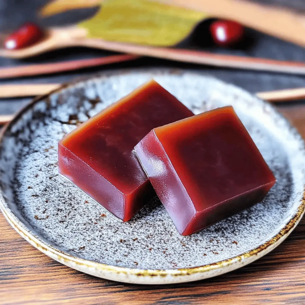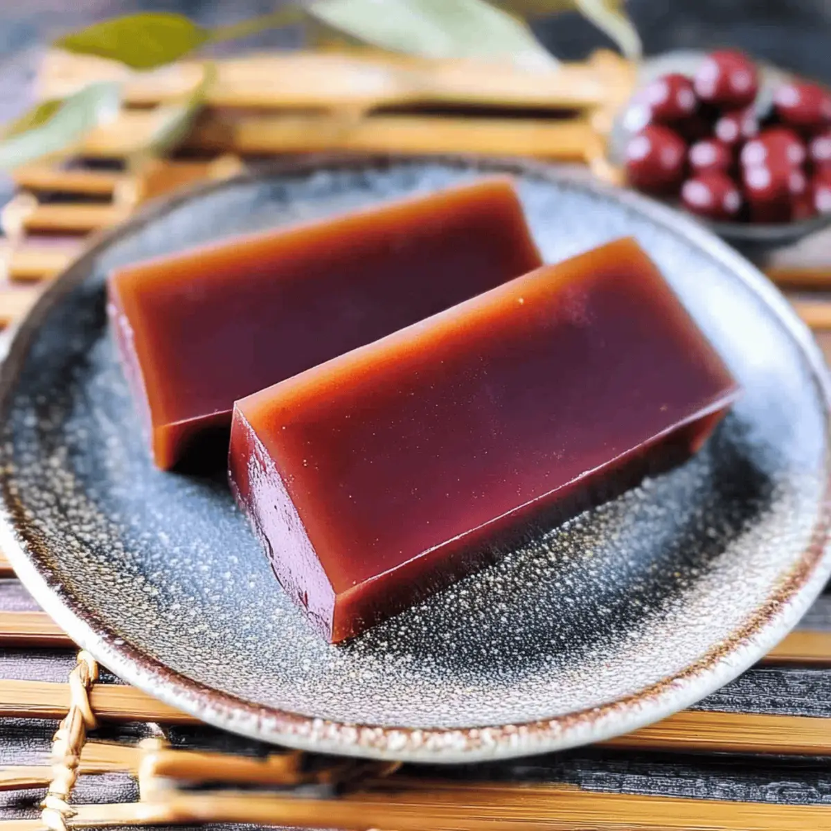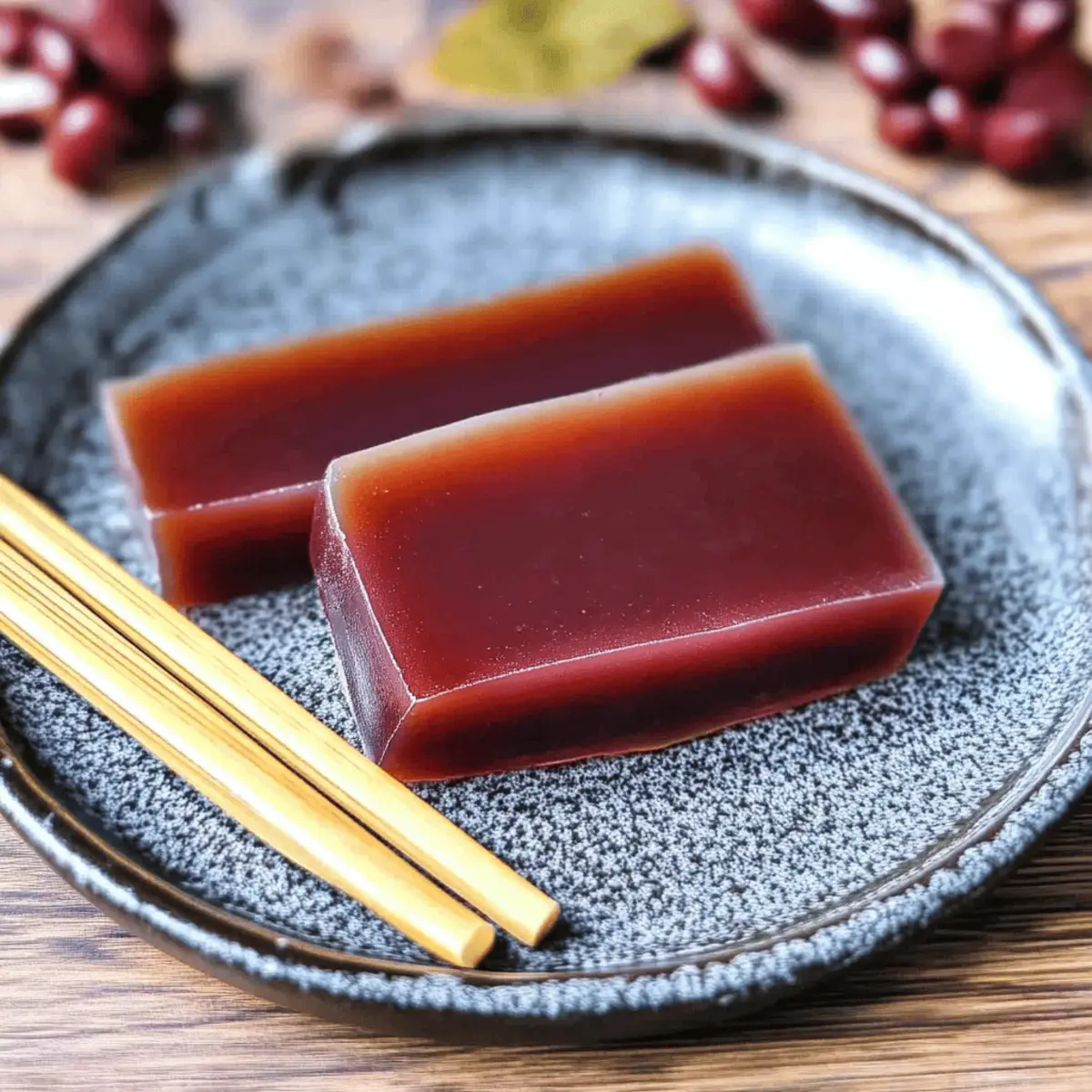 Jump to Recipe Print RecipeAs I carefully poured the shimmering mixture into the mold, I couldn’t help but feel a rush of excitement. This was the moment I’d been waiting for, a chance to create Mizu Yokan, the soft, elegant Japanese red bean jelly that’s steeped in tradition. With its delicate texture and the comforting sweetness of adzuki bean paste, this gluten-free dessert embodies the spirit of Japanese culinary artistry. Plus, it’s quick to make, requiring just a few simple ingredients—a perfect remedy for anyone craving a homemade treat without the fuss. Pair it with a warm cup of green tea, and you’ve got a delightful way to treat yourself or impress your guests. Are you ready to dive into this delightful and refreshing dessert? Let’s get started! Why is Mizu Yokan Special? Delicate Texture: The soft, melt-in-your-mouth consistency of Mizu Yokan makes it a unique treat, perfect for hot summer days. Cultural Delight: This traditional Japanese dessert celebrates seasonal flavors, bringing a touch of Japan right to your kitchen. Easy to Prepare: With minimal ingredients and a straightforward process, anyone can master this elegant dish in no time! Versatile Flavor: Feel free to experiment with different fillings or flavors, like matcha or chestnuts, to make it your own. Gluten-Free Indulgence: Enjoy this sweet delight without worry, as it’s gluten-free and a healthier choice compared to typical desserts. Pair this Mizu Yokan with a refreshing cup of green tea for a delightful experience, showcasing the beauty of traditional culinary methods in a modern kitchen. Mizu Yokan Ingredients For the Jelly • Kanten Agar Powder – A jelling agent that ensures your Mizu Yokan has that luscious structure; use half the amount compared to regular agar for ultimate softness. • Granulated Sugar – This sweetener balances the earthy notes of the red bean paste; consider coconut sugar or honey as delightful substitutes. • Water – The main liquid component that hydrates the kanten and holds everything together; no substitutions are needed here. • Smooth Red Bean Paste (Koshian) – The star of the show, this sweet adzuki bean puree is the foundation of your jelly; feel free to swap it with white bean paste (Shiroan) for a lighter experience. • Salt – A pinch enhances the overall sweetness and flavor complexity; sea salt or kosher salt works beautifully. With these ingredients on hand, you’re all set to create a mesmerizing Mizu Yokan (Japanese Red Bean Jelly) that will impress even the most discerning dessert lovers! Step‑by‑Step Instructions for Mizu Yokan (Japanese Red Bean Jelly) Step 1: Prepare the Dry Ingredients In a cold saucepan, mix the kanten agar powder and granulated sugar together evenly. Ensure they are fully combined, as this will prevent clumping later. This step sets the foundation for your Mizu Yokan, so take your time to create a smooth mixture, ready for the next phases of cooking. Step 2: Create the Base Mixture Gradually whisk in the water to the dry mixture, stirring continuously to create a homogeneous blend. Turn the heat to medium and bring the mixture to a boil, stirring constantly for about 2 minutes. As you stir, look for the mixture to thicken slightly, indicating that the kanten is activating and your base for Mizu Yokan is coming together. Step 3: Incorporate Red Bean Paste Lower the heat and begin to add the smooth red bean paste gradually, mixing well after each addition. This is a crucial step in achieving a silky texture in your Mizu Yokan. Continue to stir for a few minutes until the mixture is completely smooth and uniform, with no lumps, creating a delightful buttery consistency. Step 4: Final Touch with Salt Once the mixture is smooth, stir in a pinch of salt to enhance the sweetness of the red bean paste. Mix this in for another minute to ensure it is fully dissolved, releasing any remaining heat. You’ll notice the mixture becomes glossy and even more inviting at this stage, signaling that it’s ready for pouring. Step 5: Mold the Mixture Carefully pour your beautiful mixture into a heatproof mold, such as a nagashikan if you have one. Use a silicone spatula to scrape out every last bit of this sweet concoction. Allow the Mizu Yokan to cool at room temperature for approximately 20 minutes, giving it a chance to set slightly before chilling. Step 6: Chill Until Firm Once the mixture has cooled, cover the mold with plastic wrap and transfer it to the refrigerator. Let it chill for at least 30 minutes until fully set. This cooling step is essential for achieving the perfect jelly-like texture of your Mizu Yokan, where it transforms into a translucent delight. Step 7: Serve and Enjoy After the Mizu Yokan has set, gently remove it from the mold and place it on a cutting board. Cut into beautiful squares or slices as you desire. Serve chilled, possibly paired with a warm cup of green tea, allowing you to truly savor this traditional Japanese red bean jelly in all its glory. Expert Tips for Mizu Yokan Ingredient Temperature Matters: Ensure all your ingredients are at room temperature before starting. This helps prevent clumping and guarantees a smooth jelly. Mixing Technique: Use a silicone spatula when combining your ingredients. It’s gentle on the mixture and prevents it from sticking to the saucepan, ensuring your Mizu Yokan turns out perfectly silky. Boiling Attention: Keep a close eye while bringing the mixture to a boil. Stir continuously to avoid sticking, which can lead to a grainy texture instead of the desired melt-in-your-mouth experience. Chilling Time: Be patient during the refrigeration phase. Allow at least 30 minutes for the Mizu Yokan to set completely; this time is key to achieving its beautiful jelly-like consistency. Serving Presentation: For a stunning presentation, cut the Mizu Yokan into neat squares or slices. Serve it chilled with a side of green tea, enhancing the delightful flavors of this tradition