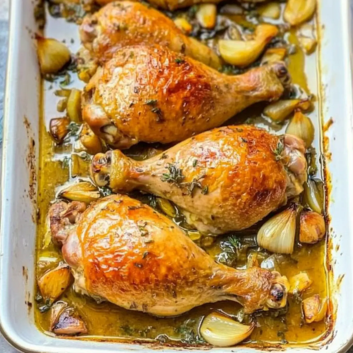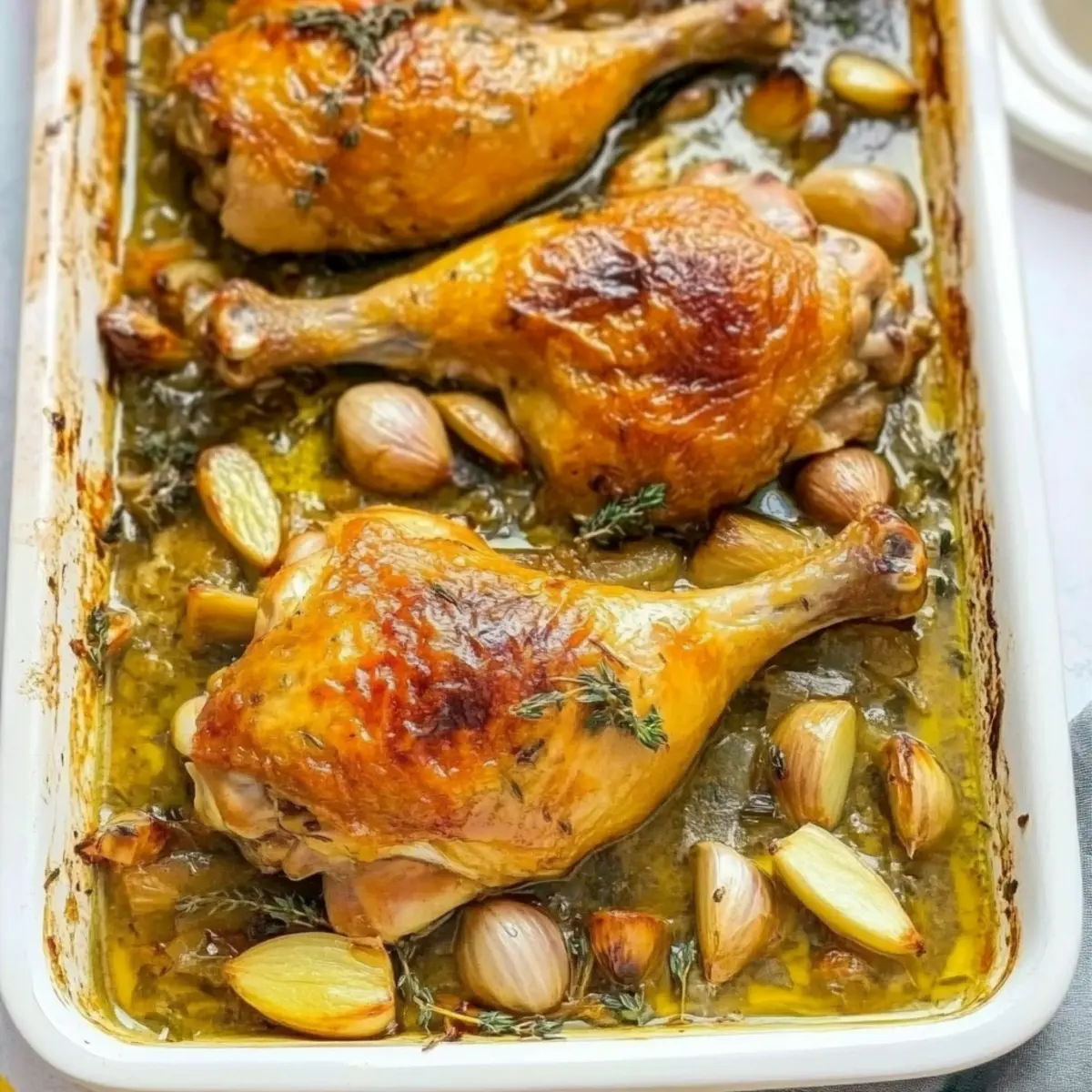 Jump to Recipe Print RecipeAs the sun sets and the comforting scent of slow-roasted goodness fills the air, I find myself savoring the playful symphony of flavors in my Easy Oven-Roasted French Garlic Chicken. This dish transforms humble ingredients—fresh garlic, aromatic herbs, and succulent chicken—into a gourmet masterpiece that’s perfect for busy weeknights. Not only is this recipe time-efficient, allowing you to spend less time in the kitchen and more time with loved ones, but it’s also a crowd-pleaser that brings the joy of restaurant dining right to your dining table. With its crispy skin and tender meat, every bite feels like a warm embrace. Curious about how to make this delectable dish? Let’s dive into the delicious details! Why is this chicken a must-try? Ease of Preparation: This Easy Oven-Roasted French Garlic Chicken requires minimal chopping and just a few straightforward steps, making it perfect for weeknight dinners. Flavor Explosion: Fresh garlic and aromatic herbs create a mouthwatering aroma that will have everyone asking for seconds! Versatile Variations: Swap chicken for turkey or add vegetables to the pan for a one-pot meal that adapts to what you have on hand. Effortless Cleanup: With the help of Reynolds Wrap® Heavy Duty Foil, you can enjoy your meal without stress about post-cooking cleanup. Crowd-Pleaser: Perfectly crisped skin and tender meat guarantee this dish will impress your family and friends, transforming any meal into a special occasion. So, if you’re looking for a dish that combines ease and flavor, look no further! Oven-Roasted French Garlic Chicken Ingredients • Get ready to create a magical meal! For the Chicken 2 1/2 to 3 lbs bone-in, skin-on chicken (thighs, drumsticks, leg quarters) – Provides rich flavor and moisture; can substitute with chicken breasts but adjust cooking time accordingly. Sea salt & ground black pepper (to taste) – Essential to enhance all flavors; adjust according to your personal preference. For the Garlic & Herbs 3 medium shallots (thinly sliced) – Adds sweetness and depth to the dish; white or yellow onions can be substituted if needed. 20 to 25 whole garlic cloves – Integral to the dish’s flavor and aroma; fresh garlic gives the best results, although garlic powder can work in a pinch. Small bunch fresh thyme – Offers a fragrant herbal note; dried thyme can substitute in smaller amounts. 3 to 4 sprigs fresh rosemary – Provides a robust flavor; if using dried rosemary, reduce the quantity for a balanced taste. For the Cooking Liquid 1/4 cup avocado or olive oil – Adds healthy fat for moisture and enhances flavor; you can use other neutral oils if desired. 1/2 cup chicken broth – Essential for adding moisture and depth to your chicken; low-sodium options or homemade broth are preferable. 1/2 cup white wine (such as Chardonnay or Pinot Grigio) – Enhances flavor complexity in your chicken; for a non-alcoholic alternative, replace with lemon juice mixed with chicken broth. For Cleanup Reynolds Wrap® Heavy Duty Foil – Helps with easy cleanup post-cooking; you can substitute with parchment paper if preferred. This Oven-Roasted French Garlic Chicken brings delightful flavors to your dinner table while ensuring a relaxing cooking experience! Step‑by‑Step Instructions for Easy Oven-Roasted French Garlic Chicken Step 1: Preheat Oven Begin by preheating your oven to 400°F (204°C). This ensures the perfect cooking temperature for the Easy Oven-Roasted French Garlic Chicken. As the oven warms up, prepare your casserole dish to make sure it’s ready when needed, setting the stage for a delicious meal. Step 2: Prepare Casserole Dish Line a large casserole dish with Reynolds Wrap® Heavy Duty Foil, which makes for an effortless cleanup later. Make sure the foil covers the bottom and sides well, so all drippings are contained. This step not only simplifies cleanup but also enhances the dish’s presentation. Step 3: Layer Ingredients Spread the thinly sliced shallots evenly across the bottom of the prepared dish, followed by half of the whole garlic cloves. Sprinkle fresh thyme and rosemary on top of the shallots, creating a flavorful base that will infuse the chicken with delicious aromas as it cooks. Step 4: Season Chicken Place the chicken pieces skin-side up on top of the herb layer, ensuring they are arranged in a single layer. Drizzle the olive oil generously over the chicken, then season liberally with sea salt and ground black pepper. Scatter the remaining garlic cloves and thyme over the chicken for an extra flavor punch. Step 5: Add Liquids Carefully pour the chicken broth and white wine along the edges of the casserole dish, avoiding the seasoned chicken skin. This technique helps to keep the seasonings intact and allows the liquids to enhance the cooking process, adding moisture and depth to your Easy Oven-Roasted French Garlic Chicken. Step 6: Roasting Slide the dish into the preheated oven and roast uncovered for approximately 1 hour. Keep an eye on it as the chicken cooks; you’re looking for a beautiful golden-brown skin that is crispy and an internal temperature reaching 165°F (74°C) for safety. Step 7: Crisp Skin (optional) For an extra crispy finish, switch on the broiler for an additional 5-7 minutes at the end of the cooking time. This step will enhance the texture of the skin, making your Easy Oven-Roasted French Garlic Chicken even more irresistible and perfect for serving. Step 8: Serve Once roasted to perfection, remove the dish from the oven and let it rest for a few minutes. Spoon the rich pan sauce over the chicken before serving, allowing the flavors to meld beautifully. Pair with your favorite sides like mashed potatoes or a fresh salad to complete your delightful meal. Make Ahead Options These Easy Oven-Roasted French Garlic Chicken are ideal for meal prep! You can season the chicken and layer it with the shallots and herbs up to 24 hours in advance; simply cove