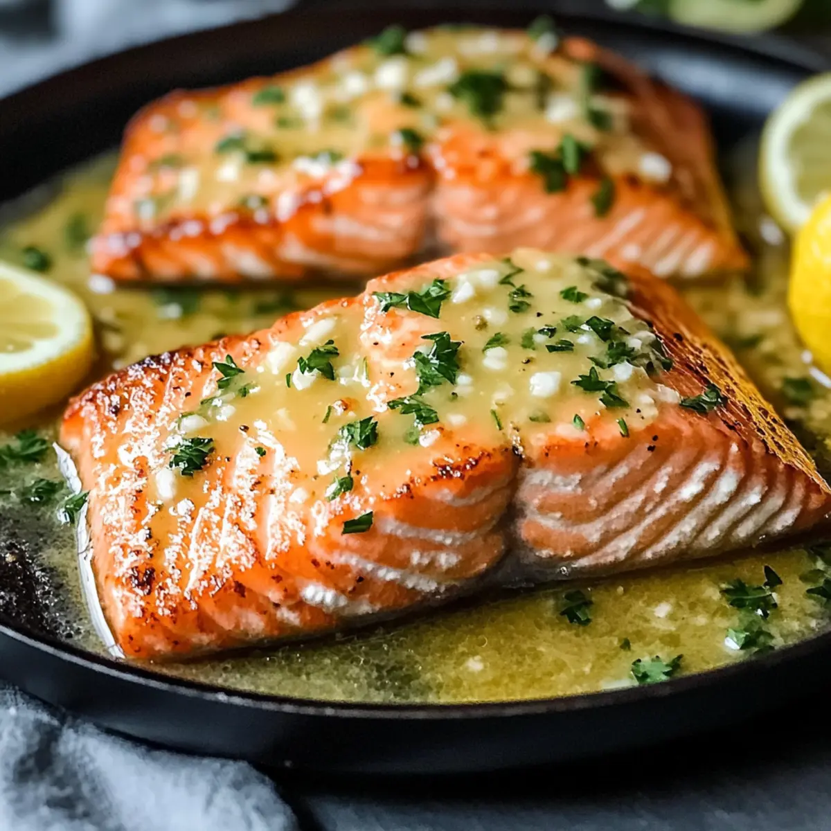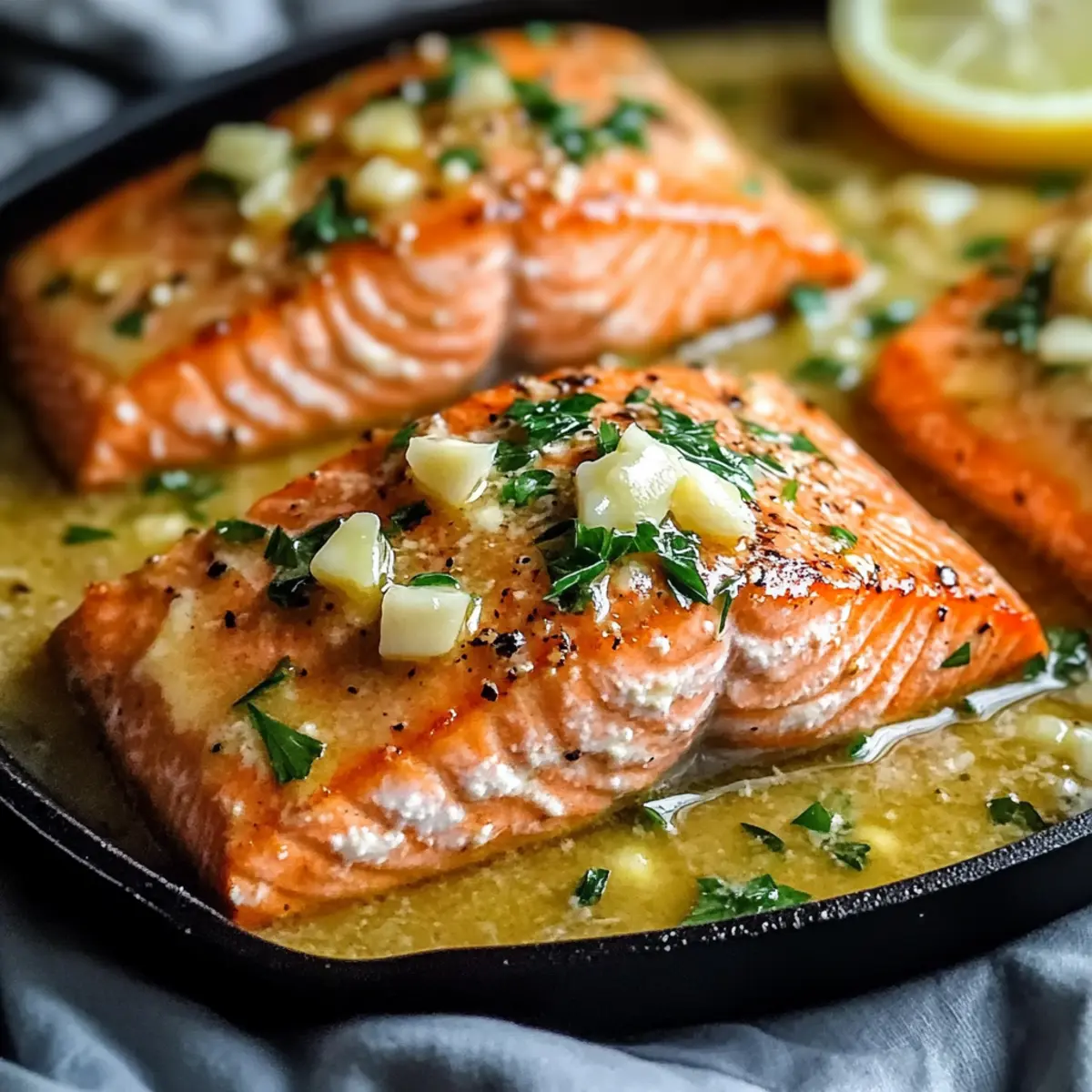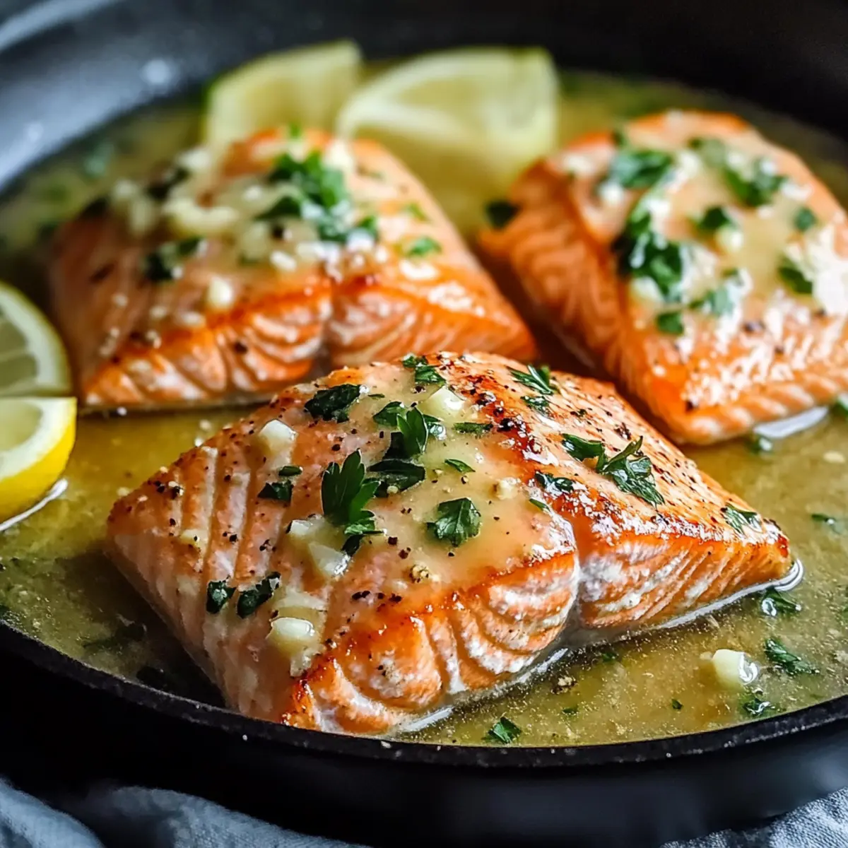 Jump to Recipe Print RecipeThe moment the skillet starts to sizzle, and the unmistakable scent of garlic fills the air, I can’t help but smile. This Quick and Easy Pan Seared Salmon with Garlic Butter is my go-to recipe for busy weeknights when I crave something special without a lot of fuss. In just 20 minutes, you can create a restaurant-quality dish that boasts crispy skin and tender, flaky salmon. Not only is this recipe a time-saver, but it’s also packed with healthy fats and high in protein—a delicious way to stay nourished and satisfied. Whether it’s an intimate dinner or a family meal, this savory seafood delight will impress, leaving everyone at the table eager for seconds. Are you ready to take your weeknight dinners to the next level? Let’s dive in! What’s so special about this salmon recipe? Simplicity at Its Best: You won’t need advanced cooking techniques; this recipe is straightforward and perfect for beginners. Quick Cooking Time: In just 20 minutes, you’ll go from ingredients to a delicious main course that rivals any restaurant dish. Rich, Buttery Flavor: The garlic butter sauce enhances the natural flavors of the salmon, making each bite an explosion of taste. Healthy and Satisfying: Packed with protein and healthy fats, this dish fits perfectly into a low-carb lifestyle without sacrificing flavor. Versatile Serving Options: Pair it with sides like roasted asparagus or a light quinoa salad to create a balanced meal everyone will love. Ready to take your cooking to the next level? Try this Quick and Easy Pan Seared Salmon with Garlic Butter and impress your family tonight! Pan Seared Salmon with Garlic Butter Ingredients For the Salmon • Salmon Fillets – A rich source of protein and healthy fats, opt for fresh, bright pieces for the best quality. • Olive Oil – Enhances the crispiness of the salmon skin; substitute with avocado oil if you prefer. • Salt – Elevates the flavor; using kosher salt provides a cleaner, more robust taste. • Pepper – Adds a nice kick; freshly cracked black pepper is recommended for the best flavor. For the Garlic Butter Sauce • Butter – Provides richness and a velvety texture; for a dairy-free version, opt for vegan butter. • Minced Garlic – Infuses the dish with an irresistible aroma; always use fresh garlic for maximum flavor. • Lemon Juice – Brightens flavors and balances the richness; always use freshly squeezed for the best taste. • Chopped Parsley – Adds a fresh, vibrant garnish to elevate the dish visually and flavor-wise. With these ingredients in hand, you’re on your way to creating a delightful Pan Seared Salmon with Garlic Butter that your loved ones will rave about! Step‑by‑Step Instructions for Pan Seared Salmon with Garlic Butter Step 1: Heat the Oil Begin by heating a large skillet over medium-high heat. Pour in enough olive oil to coat the bottom, about 1-2 tablespoons, and allow it to heat until shimmering, which will take around 2-3 minutes. This step is crucial for achieving that perfect crispy skin on your Pan Seared Salmon with Garlic Butter. Step 2: Season the Fillets While the oil is heating, season both sides of the salmon fillets generously with kosher salt and freshly cracked black pepper. This simple seasoning will enhance the natural flavors of the fish, so don’t skimp! Once the oil is hot, you’re ready to cook your beautiful salmon. Step 3: Cook the Salmon Carefully place the salmon fillets skin side up into the hot skillet. Ensure not to overcrowd the pan; the fillets should sizzle immediately. Cook undisturbed for about 5 minutes, or until they develop a golden-brown crust. This method locks in moisture and flavor while creating that irresistible pan-seared texture. Step 4: Flip and Finish Cooking After 5 minutes, gently flip the salmon fillets using a spatula. Cook for an additional 5-6 minutes until the fish turns opaque and flakes easily with a fork. For the best results, check that the internal temperature reached 145°F (63°C). The crispy skin and tender flesh combine beautifully in this Pan Seared Salmon with Garlic Butter. Step 5: Prepare the Garlic Butter Once the salmon is perfectly cooked, remove it from the skillet and place it on a plate. Lower the heat slightly and add butter to the skillet, allowing it to melt completely. Stir in the minced garlic and cook for about 30 seconds, or until the garlic turns golden and fragrant. This rich, garlicky concoction will enhance the salmon remarkably. Step 6: Combine the Flavors Add freshly squeezed lemon juice, along with salt and pepper to taste, to the melted butter and garlic mixture in the pan. Stir well to combine the flavors. Return the salmon fillets to the skillet, spooning the luscious garlic butter sauce over the top. Allow it to warm through for another minute. Step 7: Garnish and Serve Finally, sprinkle chopped parsley over the salmon for a pop of color and freshness. Serve your delightful Pan Seared Salmon with Garlic Butter immediately, perhaps accompanied by sides like roasted asparagus or creamy mashed potatoes to create a satisfying meal everyone will love. Expert Tips for Pan Seared Salmon Hot Skillet Required: Always start with a hot skillet to achieve that irresistible crispy skin on your Pan Seared Salmon with Garlic Butter. Mind the Cooking Time: Flip the salmon after 5 minutes and check for doneness at 145°F (63°C). Overcooking can lead to dry fish, so stay vigilant! Rest Before Serving: Let the salmon rest for 1 minute after cooking. This helps maintain its juiciness and allows the flavors to settle. Fresh Ingredients Matter: Use fresh garlic and lemon juice for the best flavor. Avoid pre-minced garlic and bottled lemon juice to keep your dish vibrant. Avoid Overcrowding: When placing the salmon in the skillet, make sure not to overcrowd it. This ensures even cooking and allows the skin to get that desired crispiness. Variations for Pan Seared Salmon with Garlic Butter Customize