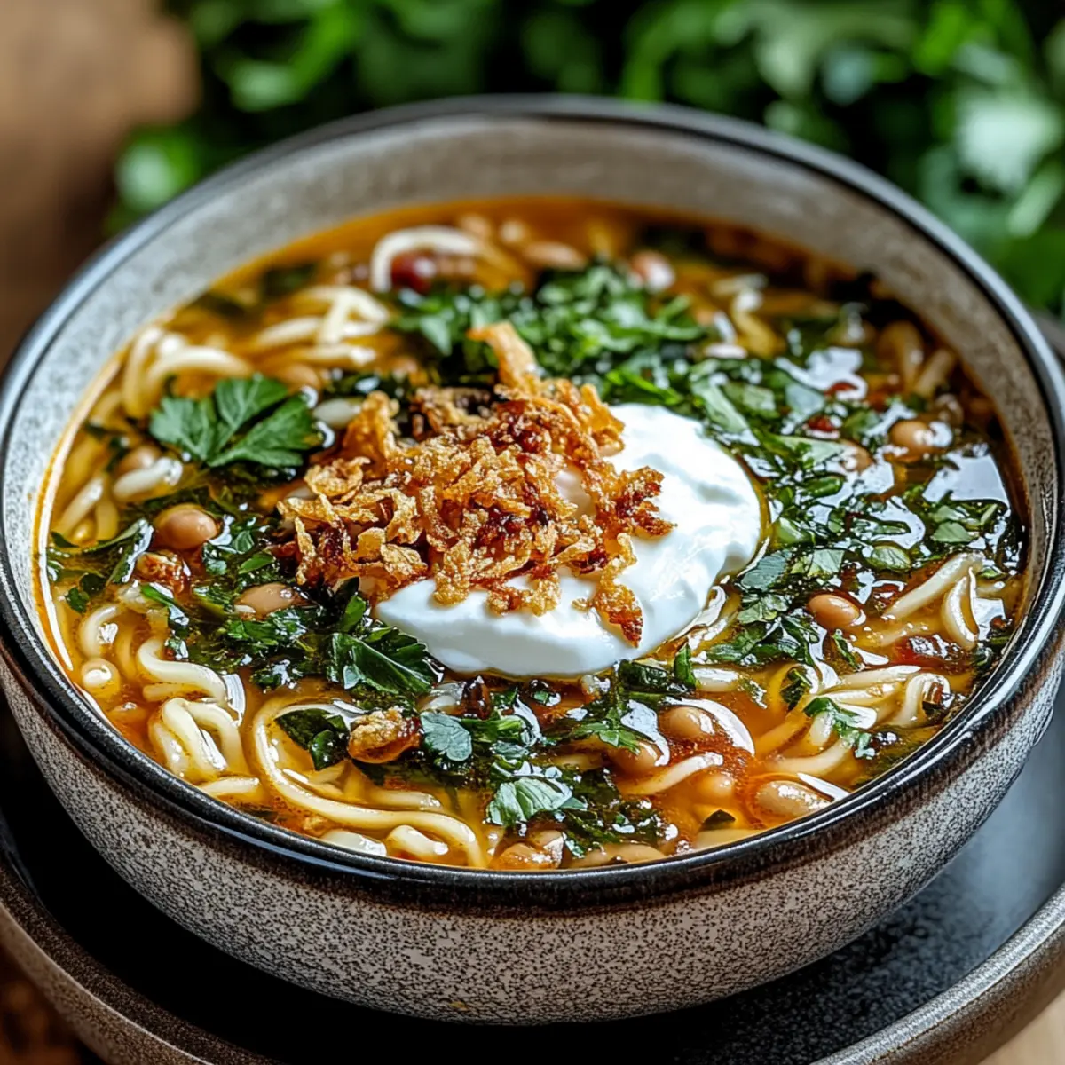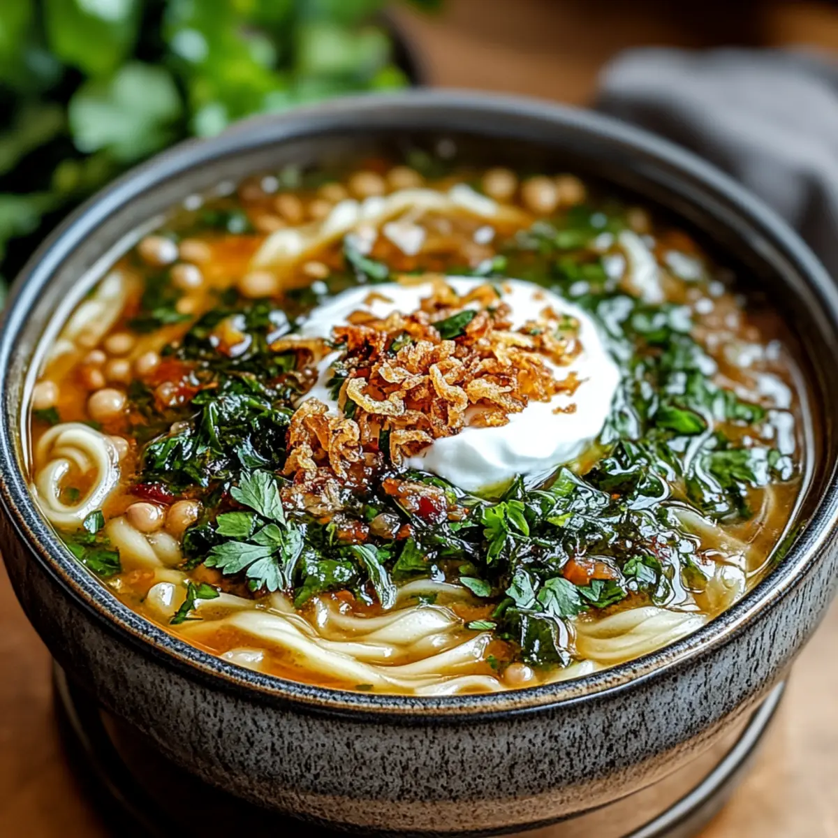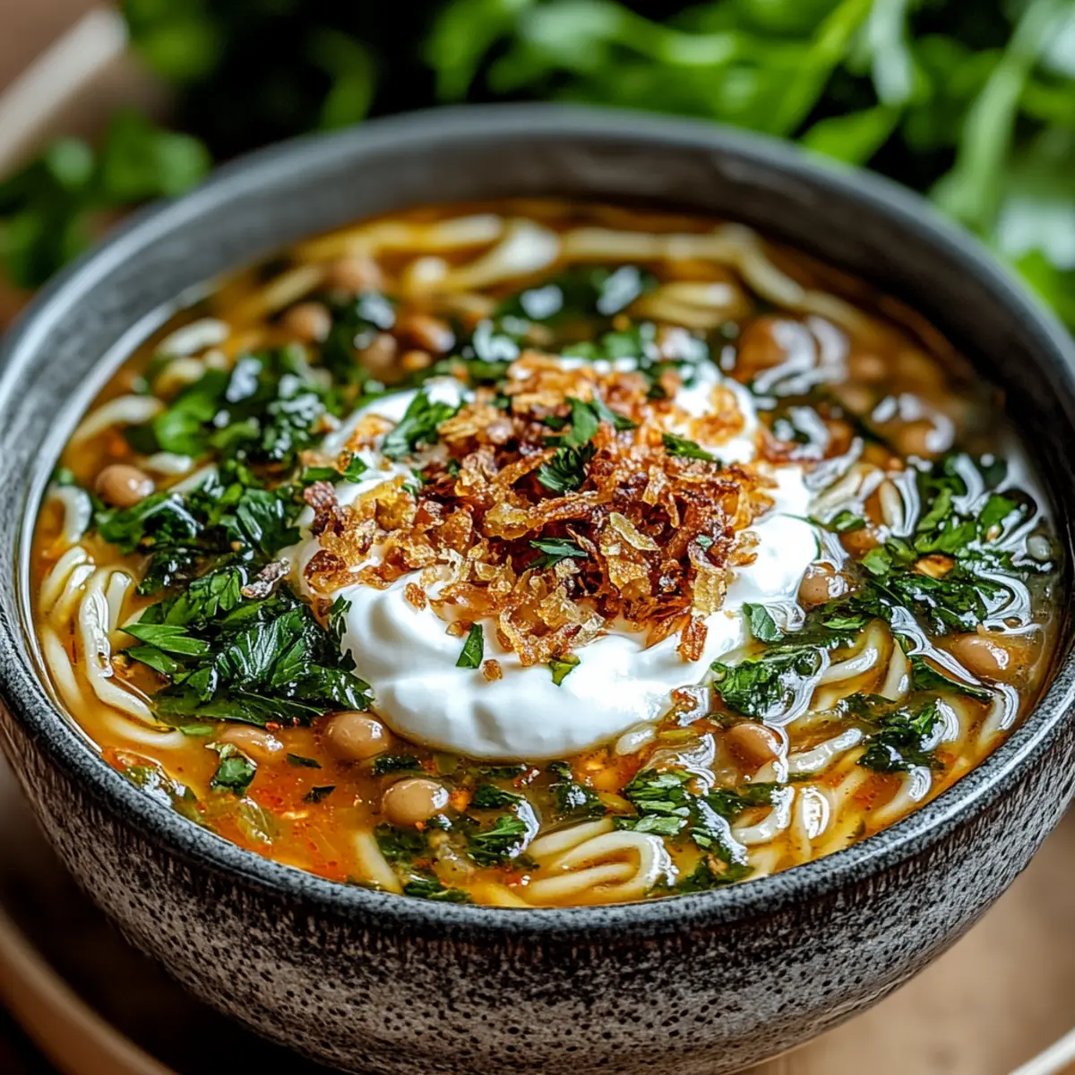 Jump to Recipe Print RecipeAs the cold weather sets in, there’s nothing more comforting than a warm, hearty bowl of Persian Noodle Soup, or Ash Reshteh. This delightful dish combines nourishing legumes with a medley of fresh herbs and spices, creating a vibrant and soul-soothing experience sure to lift spirits on even the dreariest days. Packed with protein and bursting with flavor, this vegetarian-friendly recipe is an absolute crowd-pleaser, making it perfect for family gatherings or cozy nights in. Plus, it’s relatively simple to prepare, allowing you to savor every aromatic moment without the fuss of complicated cooking. Are you ready to create a bowl of warmth that invites everyone to the table? Why is Persian Noodle Soup Special? Nourishing and Hearty: This Persian Noodle Soup is a comforting hug in a bowl, packed with protein-rich legumes that nourish your body as much as your soul. Vibrant Flavor Explosion: The medley of fresh herbs, spices, and aromatic garlic creates a robust flavor profile that dances on your palate, making every spoonful a delight. Easily Customizable: From using gluten-free pasta to adding seasonal vegetables like zucchini, this recipe allows you to tailor it to your taste and dietary needs. Quick and Simple: With straightforward steps and minimal prep time, you can whip up this heartwarming dish without stress, perfect for busy weeknights or impromptu gatherings. Crowd-Pleaser: Whether for family dinners or hosting friends, this vegetarian-friendly soup is sure to impress, encouraging seconds and happy smiles all around. Get creative in the kitchen with more vegetarian soup ideas or serve this comforting dish alongside warm flatbreads for a complete experience! Persian Noodle Soup Ingredients • Dive into the hearty world of Persian Noodle Soup with these delightful ingredients! For the Base Olive Oil – Adds richness and flavor to the base of the soup; any neutral oil can be used as a substitute. Onion (1 large, diced) – Provides essential sweetness and depth for the aromatic base. Garlic (4 cloves, minced) – Contributes a robust, pungent flavor that enhances the soup’s warmth. Turmeric (1 teaspoon) – Adds warmth and a beautiful golden color; consider substituting with curry powder for a different spice twist. Vegetable Broth (6 cups) – The heart of the soup; low-sodium broth is a healthier option. For the Legumes Lentils (1 cup, rinsed) – Offers protein and texture; red or green lentils work beautifully. Chickpeas (1 cup, cooked) – Brings creaminess and heartiness; canned or pre-cooked is perfectly acceptable. Navy Beans (1 cup, cooked) – Provides creaminess and additional protein; white beans can be swapped as needed. Kidney Beans (1 cup, cooked) – Ensures a delightful variety of textures; consider pinto beans as an alternative. For the Noodles and Greens Persian Noodles (½ pound) or Linguine – Gives structure; any long pasta can be used as a substitute. Spinach (3 cups, chopped) – Adds freshness and a pop of color; kale or Swiss chard work as replacements. Cilantro (1 cup, chopped) – Offers a fresh, grassy taste; parsley may be used if preferred. Parsley (1 cup, chopped) – Enhances freshness; feel free to substitute with extra cilantro. Dill (1 cup, chopped) – Provides a unique aromatic quality; can be omitted if unavailable. For Garnishing Salt and Pepper – For seasoning; adjust according to your taste. Sour Cream or Yogurt – Adds a creamy finish when serving; use dairy-free alternatives if desired. Fried Onions – Optional but adds a crunchy, flavorful garnish. Get ready to enjoy a bowl of comforting Persian Noodle Soup that not only warms you up but also nourishes your spirit! Step‑by‑Step Instructions for Persian Noodle Soup Step 1: Prepare the Base In a large pot, heat 2 tablespoons of olive oil over medium heat. Once hot, add the diced onion and sauté for about 5 minutes, stirring frequently, until the onion is soft and translucent. This aromatic base sets the stage for the hearty flavors in your Persian Noodle Soup. Step 2: Add Garlic and Spices Stir in 4 minced garlic cloves and 1 teaspoon of turmeric into the pot with the onions. Cook for an additional 1-2 minutes, allowing the mixture to become fragrant; you’ll notice a delightful aroma filling your kitchen. This step enhances the depth of flavor in your soup, preparing it for the next ingredients. Step 3: Add Broth and Legumes Pour 6 cups of vegetable broth into the pot, followed by 1 cup each of rinsed lentils, cooked chickpeas, cooked navy beans, and cooked kidney beans. Bring the mixture to a rolling boil before reducing the heat to a simmer. Allow it to cook uncovered for about 20 minutes, stirring occasionally until the lentils are tender and start to break down. Step 4: Add Noodles Carefully stir in ½ pound of Persian noodles (or linguine) to the simmering mix. Continue cooking on low heat for another 10 minutes or until the noodles are tender and cooked through. Keep an eye on them to ensure they don’t overcook, as the right texture is key to a lovely Persian Noodle Soup. Step 5: Stir in Greens and Herbs Add 3 cups of chopped spinach, 1 cup of chopped cilantro, 1 cup of chopped parsley, and 1 cup of chopped dill to the pot. Stir well and allow the soup to simmer for an additional 5-7 minutes until the greens are wilted and vibrant. This infusion of fresh herbs will elevate the flavors and colors in your delicious soup. Step 6: Season and Serve Taste your soup and adjust the seasoning with salt and pepper as desired. Once seasoned to your liking, ladle the warm Persian Noodle Soup into bowls. Top each serving with a dollop of sour cream or yogurt and a sprinkle of fried onions for added crunch and flavor, transforming your soup into a delightful culinary experience. What to Serve with Hearty Persian Noodle Soup? Warm up your dining experience with delicious sides that enhance the comforting flavors of this beloved dish. Warm Flatbreads: 