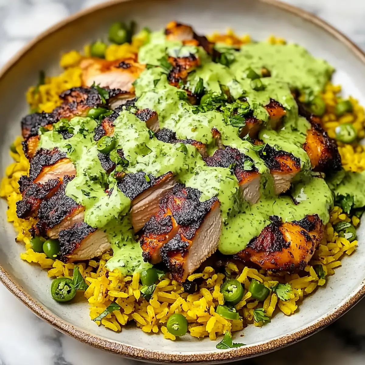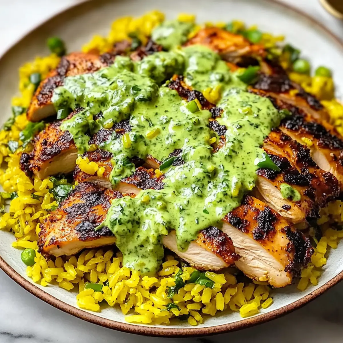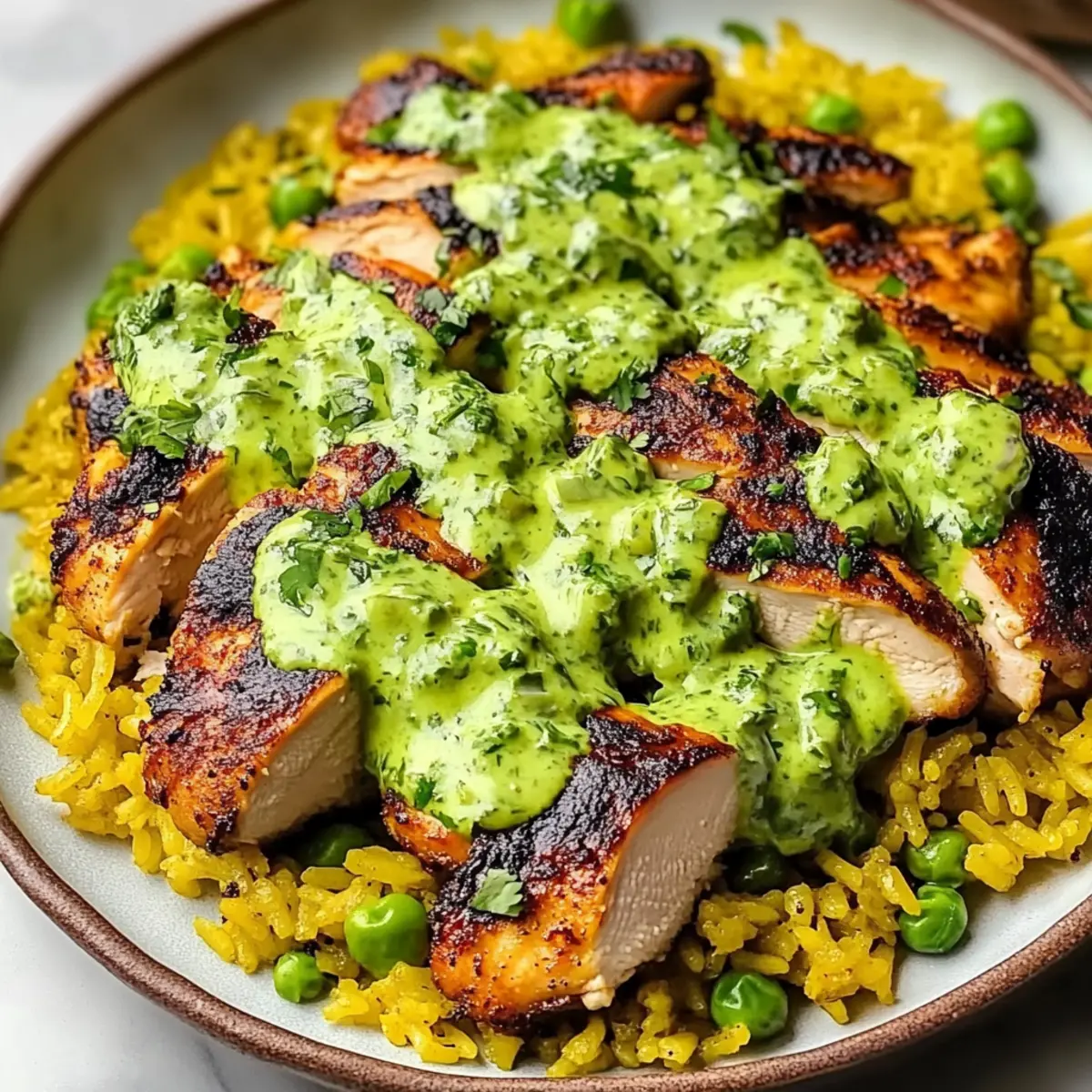 Jump to Recipe Print RecipeAs I stood in my kitchen, the fragrant aroma of marinated chicken began to weave its way through the air, instantly whisking me away to the vibrant streets of Peru. This is the magic of my Peruvian Chicken and Rice with Green Sauce—an aromatic dish that effortlessly blends rich flavors and colorful ingredients. Not only is it gluten-free, but it also boasts a quick prep time, making it a perfect weeknight dinner or an impressive meal for guests. The tender chicken mingles delightfully with the fluffy rice, all tied together by a creamy, herb-packed green sauce that adds an irresistible twist. Whether you’re a seasoned chef or just beginning your culinary journey, this recipe invites you to savor a taste of South America. Ready to transform your dinner routine? Let’s dive into this delicious adventure! Why Is This Recipe a Must-Try? Aromatic Adventure: The fragrance of marinated chicken wafting through your home will transport you straight to Peru, igniting your senses. Quick Prep: You’ll love how simple and fast this dish is, making it ideal for busy weeknights. Flavor Explosion: The vibrant green sauce, made with fresh herbs and spices, elevates each bite, offering a delightful balance of flavors. Gluten-Free Goodness: Enjoy all the deliciousness without worry, as this dish is completely gluten-free! Crowd-Pleasing Dish: Impress your guests or just enjoy a cozy night in—this meal has something for everyone, much like Oven Baked Chicken Thighs. Endless Versatility: Feel free to substitute chicken with tofu or roasted veggies for a personal twist while maintaining the enticing flavor profile! Peruvian Chicken and Rice with Green Sauce Ingredients Here’s everything you’ll need to create this delicious dish! For the Chicken Marinade Chicken – Use boneless breasts or thighs; thighs stay juicier during cooking. Garlic – Freshly minced adds depth and a savory aroma to the marinade. Lime Juice (or Vinegar) – Provides acidity to tenderize chicken and enhance flavor; lemon juice works as a great substitute. Oil – Use olive oil for marinating; avocado oil can give a different richness. Cumin – Offers warm, earthy notes—an essential flavor for authentic Peruvian taste. Smoked Paprika – Adds smokiness and vibrant color; regular paprika if you prefer milder flavor. Salt and Black Pepper – Essential for seasoning; adjust to taste as needed. For the Rice Rice – Long-grain works best for fluffiness; Arborio rice gives a creamier texture. Chicken Stock – Enhances the flavor of the rice; substitute with vegetable broth for a vegetarian version. Peas – Optional, adds sweetness and color; can be omitted if preferred. For the Green Sauce Cilantro – Essential for the sauce, bringing freshness; substitute parsley for a milder taste. Mayonnaise – Adds creaminess to the sauce; use Greek yogurt for a tangier kick. Sour Cream – Enhances creaminess and adds a touch of tang; can be omitted for a lighter sauce. Jalapeños – Provides a welcome kick of heat; adjust based on your heat tolerance, or replace with bell peppers for less heat. Olive Oil – For blending the green sauce and adding richness; canola oil is a good alternative. Lemon or Lime Juice – Brightens the sauce, enhancing overall flavor—tweak to your preferred acidity. Fresh Cilantro or Chopped Scallions (for garnish) – Adds visual appeal and extra flavor; optional but highly recommended. Now you’re all set to embark on this flavorful journey with your Peruvian Chicken and Rice with Green Sauce! Enjoy the vibrant colors and delectable taste. Step‑by‑Step Instructions for Peruvian Chicken and Rice with Green Sauce Step 1: Marinate the Chicken In a large bowl, mix together minced garlic, lime juice, oil, cumin, smoked paprika, salt, and black pepper. Add your choice of boneless chicken breasts or thighs, ensuring they’re well coated. Cover the bowl with plastic wrap and let the chicken marinate in the refrigerator for at least 1 hour, or overnight for maximum flavor. The longer, the better! Step 2: Cook the Chicken Preheat your grill to medium-high heat, around 375°F (190°C), or your oven to 450°F (232°C). If grilling, place the marinated chicken on the grill and cook for 5-7 minutes per side, basting with reserved marinade. For oven cooking, roast on a lined baking sheet for approximately 30 minutes, basting halfway, until the chicken reaches an internal temperature of 165°F (74°C). Step 3: Prepare the Rice While the chicken cooks, rinse and soak long-grain rice for 10-15 minutes in cold water, then drain. In a large pot, melt butter over medium heat and sauté diced onions and garlic until soft, about 3-4 minutes. Stir in the drained rice, spices, and chicken stock; bring to a boil, cover, and reduce heat to low. Simmer for 15 minutes or until rice is tender and liquid is absorbed. Step 4: Finish the Rice Once the rice is cooked and tender, gently stir in frozen peas for a touch of sweetness and color. Remove from heat, cover with a lid, and let it rest for 5 minutes to allow the flavors to meld. Fluff the rice with a fork before serving, ensuring it stays light and airy as the perfect base for the chicken and green sauce. Step 5: Blend the Green Sauce In a blender, combine fresh cilantro, mayonnaise, sour cream, chopped jalapeños, minced garlic, olive oil, and lemon or lime juice. Blend until smooth, adjusting the seasoning with salt and pepper to taste. The sauce should be creamy and vibrant, ready to enhance the flavors of your Peruvian Chicken and Rice with Green Sauce. Step 6: Assemble the Dish To serve, spoon a generous portion of the fluffy rice onto each plate, top with a piece of the juicy cooked chicken, and drizzle it gloriously with the vibrant green sauce. For finishing touches, garnish with additional cilantro, lime wedges, and jalapeños if desired, creating a visually stunning and flavorful presentation that’s sure to impress. How to Store and Fre