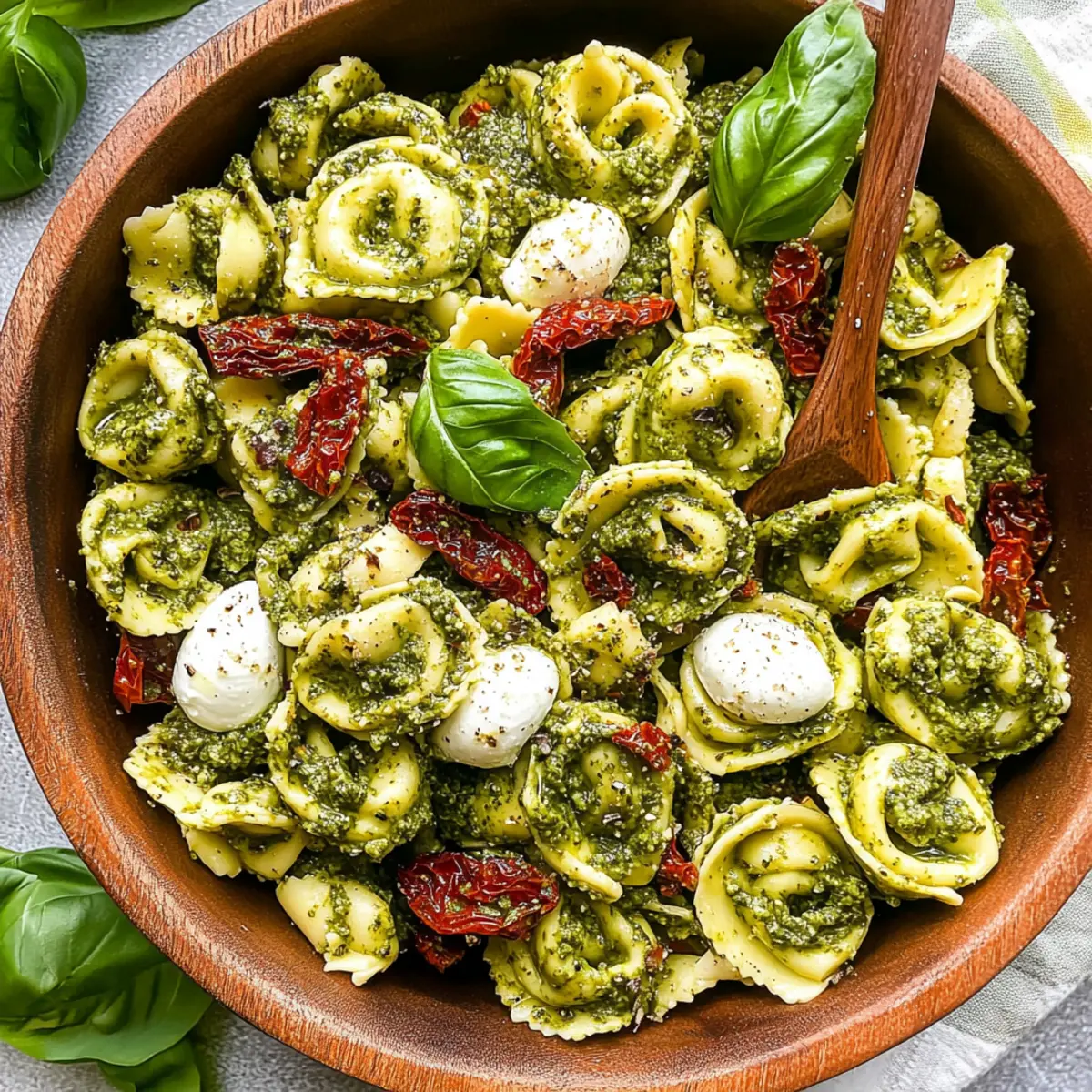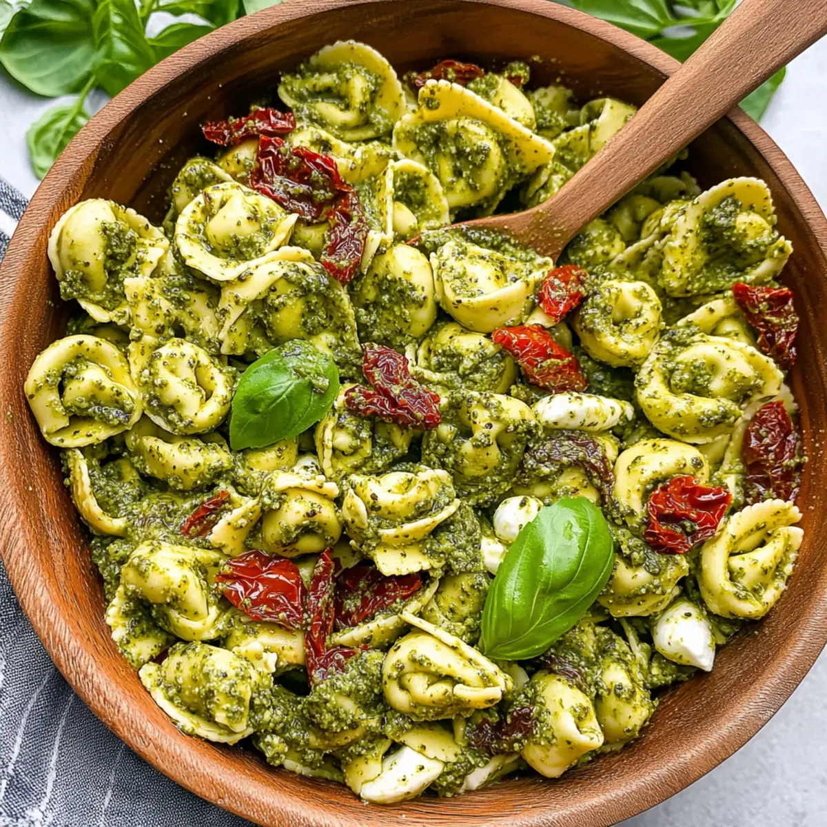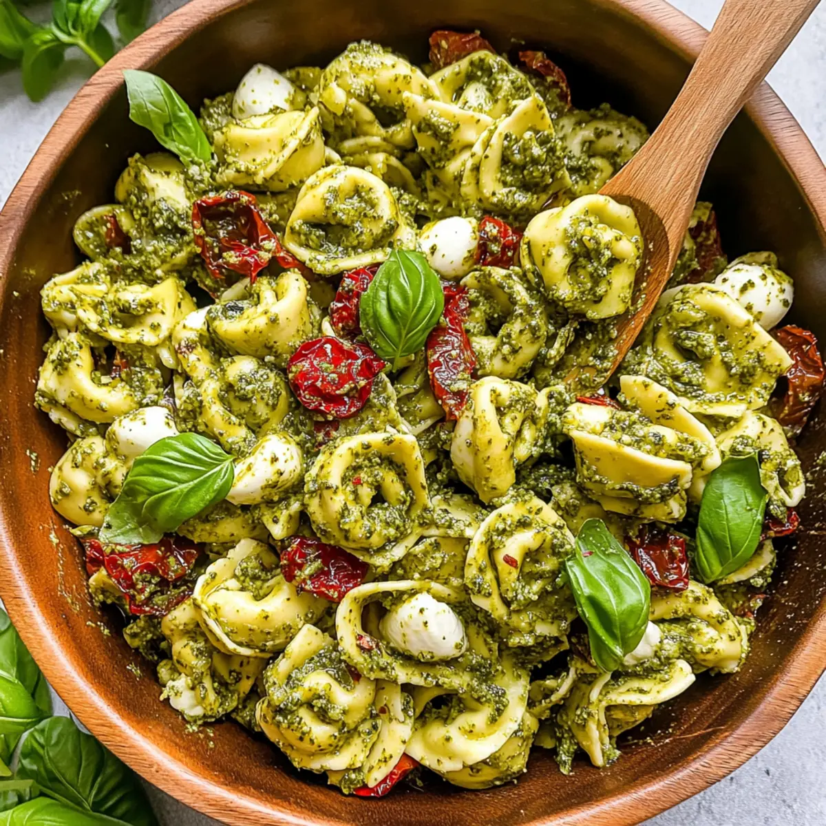 Jump to Recipe Print RecipeAs I rummaged through my pantry one sunny afternoon, I stumbled upon a package of cheese tortellini that begged to be transformed into something delightful. That’s how my Easy Pesto Tortellini Pasta Salad came to life—a vibrant mix of tender tortellini, sun-dried tomatoes, and creamy mozzarella all dressed in a beautiful, homemade pesto sauce. Not only is this dish perfect for summer picnics and parties, but it’s also a fantastic option for meal prepping; who doesn’t love a make-ahead lunch that packs a flavor punch? With the flexibility to customize it further, you can easily tailor this salad to fit any taste preference. Curious how to whip this up for your next gathering or simply for a wholesome weeknight dinner? Let’s dive right in! Why is this pasta salad a must-try? Quick and Easy: This Easy Pesto Tortellini Pasta Salad can be whipped up in 30 minutes, making it ideal for those busy weeknights or last-minute gatherings. Flavor Explosion: The fusion of creamy mozzarella, tangy artichokes, and a zesty pesto sauce creates a taste sensation that’s hard to resist! Make-Ahead Marvel: Perfect for meal prep, you can enjoy it chilled, simply pop it in the fridge, and savor delightful flavors that meld over time. Customization Options: Get creative! Want to try a variation? Check out my delicious Chickpea Salad with Grilled Vegetables or add your favorite veggies for extra crunch. Crowd Pleaser: This dish is sure to impress at barbecues, potlucks, or just a cozy dinner at home, making it a versatile pick for any occasion. Nutritional Power: Packed with wholesome ingredients, it’s not just delicious; it’s a nutrient-dense meal that you’ll feel good about serving. Pesto Tortellini Pasta Salad Ingredients Unleash flavor with these must-have ingredients! For the Salad Cheese Tortellini – A delightful base that adds heartiness; choose any cheese-filled option for extra flavor. Fresh Mozzarella Pearls – Adds a creamy texture; these pearls are easy to serve and blend beautifully with the salad. Artichoke Hearts – Contributes a tangy flavor; use quartered hearts in brine to reduce oiliness. Sun-dried Tomatoes – Imparts sweetness and umami; opt for julienned ones packed in oil for the best taste. Shredded Parmesan – Deepens the flavor profile with its nutty notes; use block cheese for greater freshness than pre-grated. Fresh Basil – Infuses freshness and aroma; feel free to adjust the amount based on your taste. Red Onion – Introduces a crisp, mild flavor; slice thinly for the best balance in the salad. Pesto – Coats the tortellini in rich flavor; whether homemade or store-bought works magic in this Pesto Tortellini Pasta Salad. Cracked Black Pepper – Enhances the taste; add to personal preference for seasoning. Optional Add-ins Toasted Pine Nuts – Adds a delightful crunch; toast them at 350°F for about 5-6 minutes to bring out their flavor. Cooked Chicken or Salami – For those craving protein; easily mix these in for a heartier meal. Dive into your cooking adventure with these fresh ingredients and savor every bite of your flavorful Pesto Tortellini Pasta Salad! Step‑by‑Step Instructions for Pesto Tortellini Pasta Salad Step 1: Cook the Tortellini Start by bringing a large pot of salted water to a rolling boil. Add the cheese tortellini and cook according to the package instructions, usually around 3-5 minutes, until they float to the surface and are al dente. Once cooked, drain the tortellini and cool them under cold running water to stop the cooking process, ensuring they maintain their perfect texture. Step 2: Prep the Ingredients While the tortellini is cooling, gather your ingredients and prepare them for the salad. Chop the artichoke hearts into smaller pieces, slice the red onion thinly, and roughly chop the fresh basil leaves. Don’t forget to grate the Parmesan if using a block. This step will set the foundation for your vibrant Pesto Tortellini Pasta Salad. Step 3: Combine the Salad Ingredients In a large mixing bowl, combine the cooled tortellini, fresh mozzarella pearls, chopped artichokes, sun-dried tomatoes, grated Parmesan, sliced red onion, and basil. Gently mix them together to ensure an even distribution of flavors and textures, creating a beautiful medley for your pasta salad. Step 4: Dress the Salad Drizzle the vibrant pesto over the tortellini mixture, using about ½ to 1 cup depending on your taste preference. Using a spatula, fold the pesto into the salad gently until every ingredient is well-coated, and you can see that delightful green hue throughout the mixture. Add cracked black pepper to taste for an extra flavor boost. Step 5: Let It Chill To enhance the flavors, cover the bowl with plastic wrap or a lid and place your Pesto Tortellini Pasta Salad in the refrigerator to chill for 30 minutes. This allows the ingredients to meld together, creating a refreshing dish that’s perfect for serving at summer gatherings or as a make-ahead lunch option. Step 6: Serve and Garnish Once chilled, remove the salad from the refrigerator. Before serving, garnish with additional grated Parmesan cheese and a few fresh basil leaves for a pop of color and flavor. This Pesto Tortellini Pasta Salad is now ready to be enjoyed, whether as a side dish or a light meal! What to Serve with Easy Pesto Tortellini Pasta Salad Imagine brightening up your gathering with a colorful spread that complements the refreshing flavors of this delightful dish. Garlic Bread: A classic pairing that soaks up every bit of pesto goodness, adding a crispy contrast to the soft tortellini. Enjoy it warm and buttery for the perfect bite! Caprese Salad: Juicy tomatoes, creamy mozzarella, and fragrant basil harmonize beautifully with the pesto pasta, offering a refreshing note to the meal. Grilled Chicken: Tender, marinated chicken breasts add protein and a smoky flavor that rounds out the dish perfectly, making it satisfying for everyone at the tabl