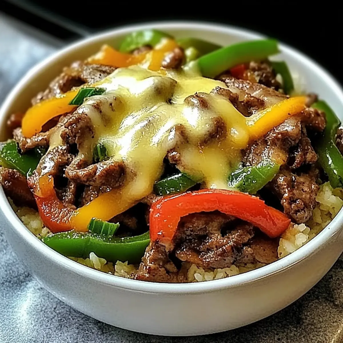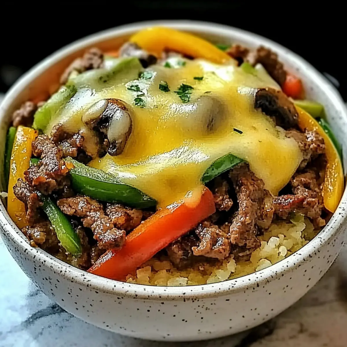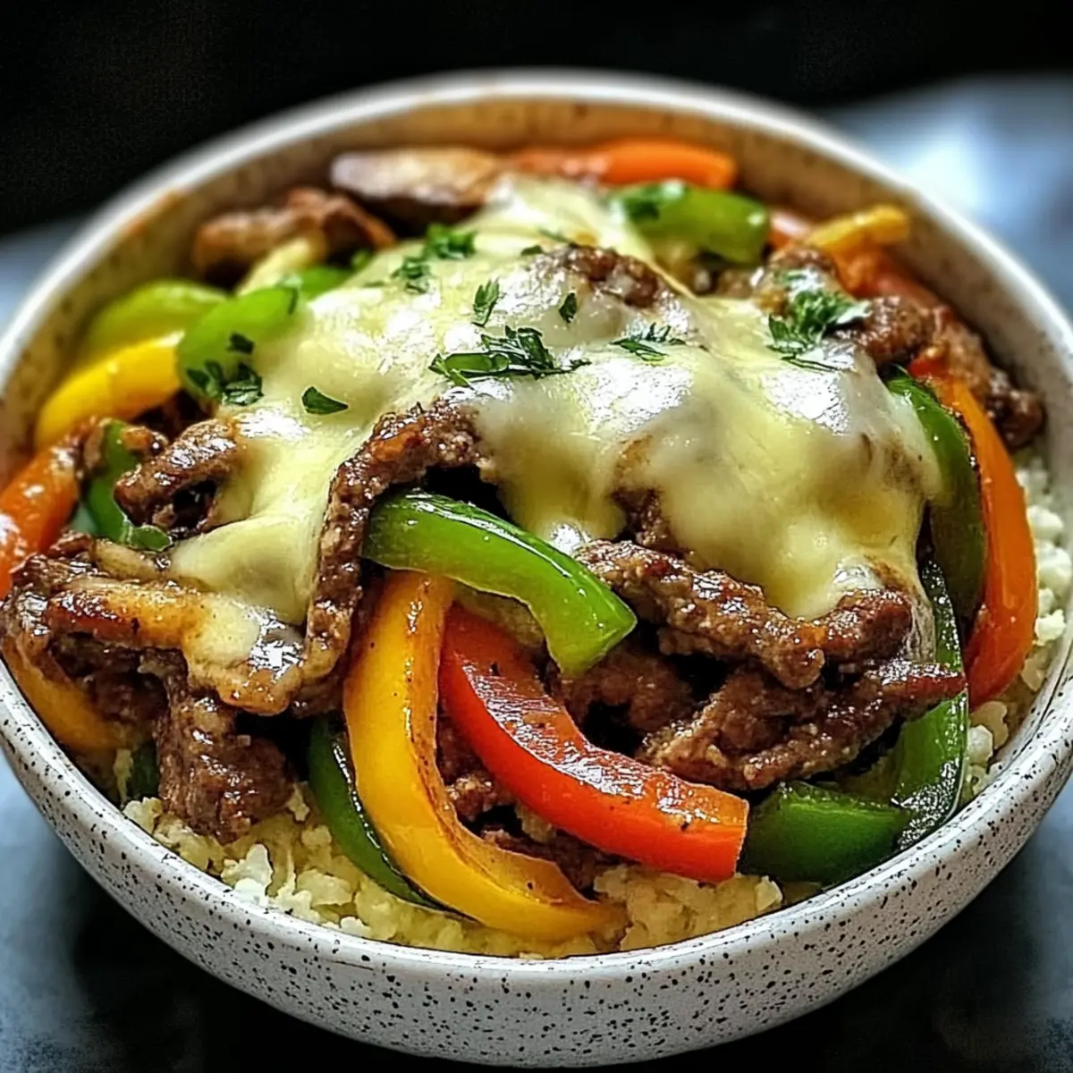 Jump to Recipe Print RecipeIn a world bustling with fast food options, finding a satisfying meal can feel like a mini crisis—especially when you’re craving something hearty yet healthy. Enter my Low-Carb Philly Cheesesteak Bowls, where you can indulge in the beloved flavors of a classic cheesesteak without guilt. Packed with a whopping 32 grams of protein per serving, this dish delivers tender beef, sautéed veggies, and gooey provolone cheese, all on a fluffy base of riced cauliflower. Perfect for meal prep or a quick weeknight dinner, these bowls are not only low in carbs but also a comforting delight that keeps your health goals intact. Ready to transform your dinner routine? Let’s dive in and whip up something delicious together! Why Are Philly Cheesesteak Bowls So Irresistible? Satisfying, Flavorful Experience: These bowls offer all the rich flavors of a classic cheesesteak without the carbs, making them perfect for your cravings. Quick Prep Time: Whip up this meal in just 30 minutes, so you can enjoy a hearty dinner even on the busiest weeknights. Meal Prep Friendly: Great for those on the go! Simply store the components separately, and you’ve got healthy lunches ready for the week. Protein-Packed Delight: With 32 grams of protein, these bowls fuel your body and keep you full longer—ideal for fitness enthusiasts or anyone wanting to maintain energy throughout the day. Versatile Add-Ons: Customize with your favorite toppings or heat things up with some hot sauce to make it truly yours! If you’re looking for more delicious meal ideas, check out my Sriracha Salmon Bowls for another flavor-packed option. Philly Cheesesteak Bowls Ingredients • Discover the perfect balance of taste and health! For the Beef Beef Sirloin – A flavorful protein source; freeze for 30 minutes to make slicing easier. Worcestershire Sauce – Adds a savory boost; soy sauce can be a great alternative. For the Vegetables Green Bell Pepper – Provides sweetness and crunch; substitute with red or yellow for a sweeter flavor. Onion – Offers a savory base; yellow or white onions work well if you want alternatives. Mushrooms (Baby Bella) – Adds rich umami and texture; button mushrooms can replace them, or omit if necessary. Garlic – Fresh garlic lends wonderful aroma; garlic powder can work in a pinch. For the Base Riced Cauliflower – The low-carb alternative to rice, keeping the dish light; quinoa can be used if you prefer more carbs. Butter – Adds richness to the riced cauliflower; use coconut oil for a dairy-free option. For the Topping Provolone Cheese – Delivers that authentic cheesesteak gooeyness; mozzarella or cheddar can be substituted. Salt and Pepper – Essential seasonings to enhance flavor; add to taste. Fresh Parsley – Perfect for garnish, contributing freshness and color. Step‑by‑Step Instructions for Philly Cheesesteak Bowls Step 1: Sear the Beef Heat 2 tablespoons of olive oil in a large skillet over medium-high heat. Once shimmering, add the thinly sliced beef sirloin in a single layer and allow it to sear without moving for 3-4 minutes until browned. This helps to lock in the juices and flavor. Once cooked, remove the beef from the skillet and set it aside on a plate. Step 2: Sauté the Vegetables In the same skillet, toss in the diced green bell pepper, sliced onion, and baby bella mushrooms. Sauté these colorful veggies for 5-7 minutes until they become tender and slightly caramelized, stirring occasionally. In the last minute of cooking, add minced garlic and stir until aromatic, enhancing the flavors for your Philly Cheesesteak Bowls. Step 3: Prepare the Riced Cauliflower While the vegetables cook, melt 1 tablespoon of butter in a separate pan over medium heat. Add the riced cauliflower and sauté for 5-7 minutes, stirring frequently until it turns golden and tender. Season the cauliflower rice with salt and pepper, ensuring it’s fluffy and flavorful as the perfect base for your bowls. Step 4: Combine Beef and Veggies Return the cooked beef to the skillet with the sautéed vegetables. Pour Worcestershire sauce over the mixture and stir well to coat everything evenly. Cook for an additional minute to combine the flavors, then sprinkle slices of provolone cheese over the top. Cover the skillet for 1-2 minutes until the cheese melts beautifully. Step 5: Assemble the Bowls To serve your delightful Philly Cheesesteak Bowls, divide the seasoned riced cauliflower among serving bowls. Generously heap the beef and vegetable mixture topped with melted cheese on each bowl. For a fresh finishing touch, garnish with chopped parsley, adding a pop of color and flavor to this satisfying dish. Make Ahead Options These Philly Cheesesteak Bowls are a lifesaver for meal prep enthusiasts! You can slice the beef sirloin (and optionally marinate it) up to 24 hours ahead, helping save time on busy nights. Additionally, the sautéed vegetables can be cooked and stored in an airtight container for up to 3 days in the refrigerator. For the riced cauliflower, prepare it fresh to ensure it remains fluffy, but you can prep the garlic and seasonings ahead. When you’re ready to serve, simply reheat the beef and vegetable mixture in a skillet (adding the cheese to melt during the last minute) over medium heat, then assemble your bowls for delicious results that stay just as flavorful. This minimizes your cooking time while still delivering hearty, comforting flavors! How to Store and Freeze Philly Cheesesteak Bowls Fridge: Store the beef and vegetable mixture in an airtight container for up to 4 days, and keep the riced cauliflower separately to maintain its texture. Freezer: For long-term storage, the beef and vegetable mixture can be frozen for up to 3 months. Ensure it’s in a freezer-safe container for best results. Reheating: When ready to enjoy, thaw the frozen mixture overnight in the fridge. Reheat in a skillet until hot, then serve over freshly prepared riced cauliflower for a d