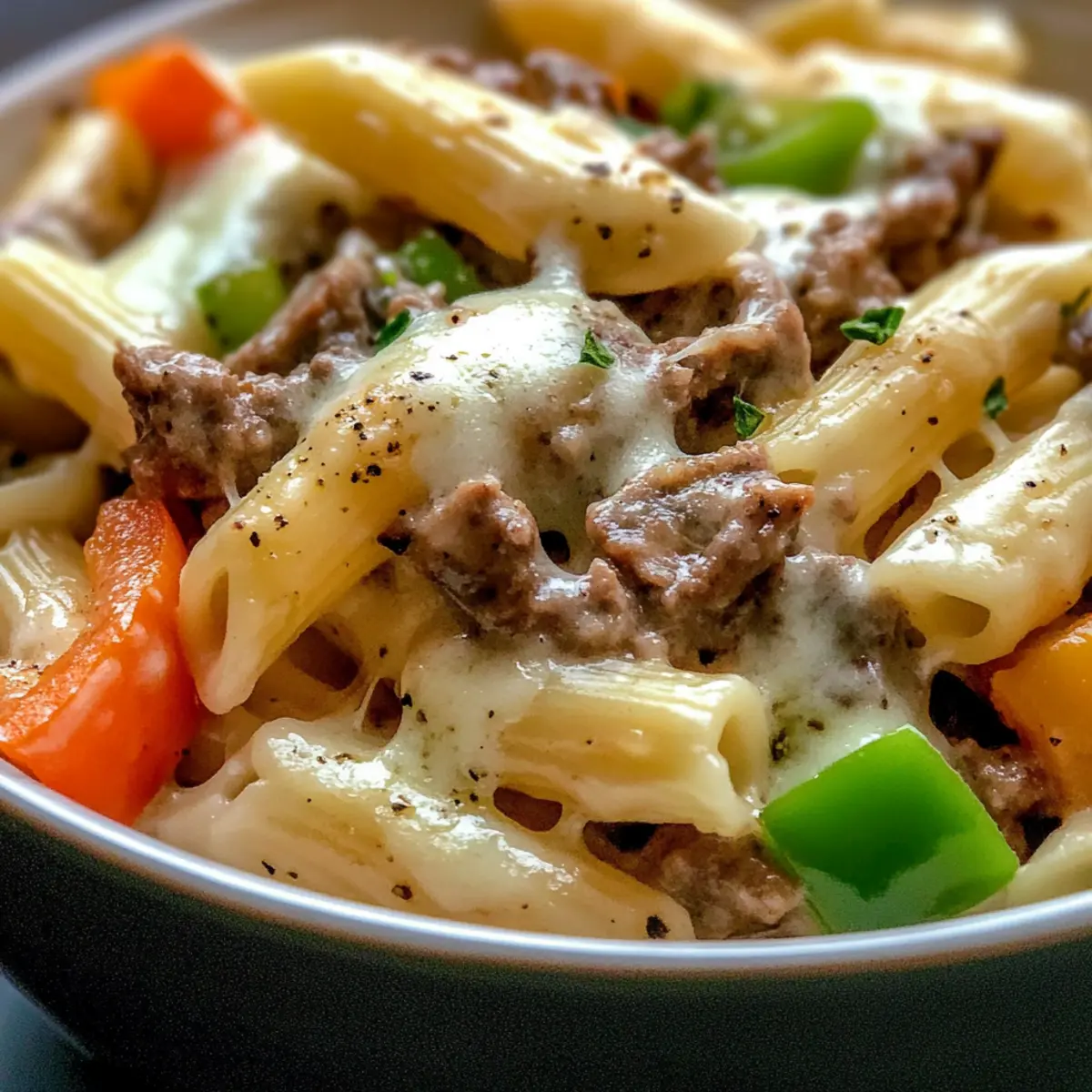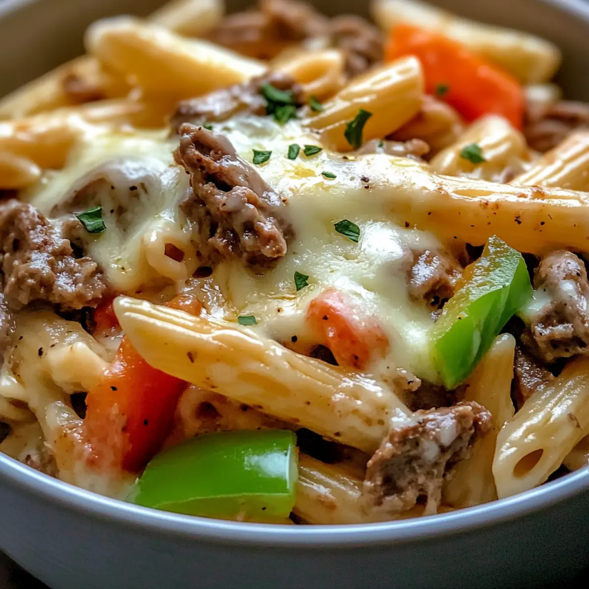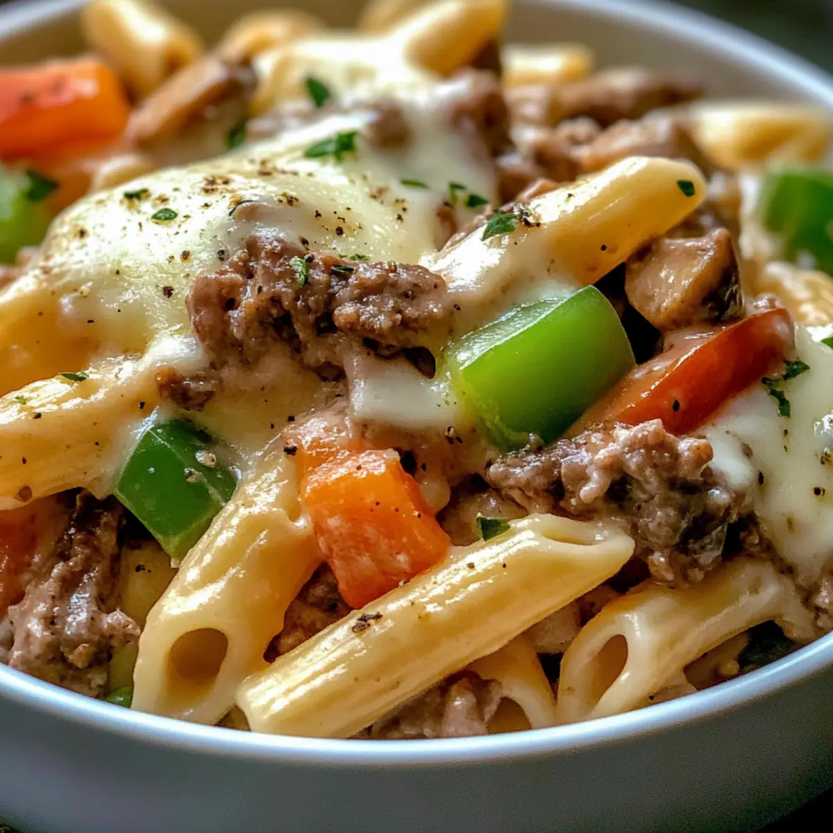 Jump to Recipe Print RecipeAs I was flipping through my old family recipes, a delightful memory sparked—a warm cheesesteak sandwich shared at our kitchen table, a hint of grilled onions and gooey cheese lingering in the air. Inspired by that timeless joy, I decided to transform that beloved classic into a scrumptious bowl of Philly Cheesesteak Pasta. This one-pan meal combines juicy ground beef, tender mushrooms, and colorful green peppers, all smothered in creamy provolone cheese alongside perfectly cooked penne. The best part? This hearty pasta dish can be whipped up in under 30 minutes, making it a fantastic option for busy weeknights or impromptu gatherings. Plus, its blend of flavors is sure to please even the pickiest eaters at your table. Curious about how to recreate this comforting classic in your own kitchen? Let’s dive in! Why is This Philly Cheesesteak Pasta Amazing? Comforting flavors: This dish brings the essence of a classic Philly cheesesteak right to your plate, melding rich beef and creamy cheese in every bite. One-pan simplicity: With just one skillet, cleanup is a breeze, making it perfect for those busy weeknights. Quick to prepare: In under 30 minutes, you can enjoy a hearty meal that rivals your favorite takeout. Family-friendly: It’s a hit with both kids and adults, ensuring no one leaves the table hungry. If you’re in the mood for something lighter afterward, try pairing it with a refreshing Lemon Arugula Pasta or enjoy it alongside some crispy garlic bread! Versatile options: Switch up the proteins or add more veggies for a personalized twist, making it adaptable for any palate. Philly Cheesesteak Pasta Ingredients Satisfy your cravings with these simple ingredients! For the Pasta Penne Pasta – This pasta shape holds the sauce beautifully; feel free to use rotini or rigatoni if you prefer. For the Filling Ground Beef – Provides rich flavor and protein; thinly sliced steak can be a delicious alternative. Mushrooms – Adds a savory, earthy touch; opt for white button or cremini mushrooms for the best flavor. Onion – Brings sweetness and depth; use one medium onion, chopped finely for even cooking. Green Bell Pepper – Offers a vibrant crunch; chop a medium pepper to brighten up the dish. For the Sauce Condensed French Onion Soup – Serves as a flavorful base; cream of mushroom soup can work well as a substitute. Worcestershire Sauce – Enhances the dish with its savory goodness. Cold Water – Necessary for mixing with cornstarch to help thicken your sauce. Cornstarch – Provides the perfect thickening agent for your creamy sauce. For the Cheesy Topping Provolone and Mozzarella Cheese – Melts beautifully and adds that creamy texture; try swapping for cheddar for a unique flavor twist. For Seasoning Kosher Salt – Essential for enhancing flavors; adjust it according to your taste preferences. Freshly Ground Black Pepper – Adds warmth and seasoning, ensuring a well-rounded dish. Now that you’re equipped with these delightful ingredients for your Philly Cheesesteak Pasta, you’re one step closer to bringing that comforting goodness to your table! Step‑by‑Step Instructions for Philly Cheesesteak Pasta Step 1: Preheat Oven Start by preheating your oven to 375°F (190°C). This ensures it’s ready when it’s time to bake your Philly Cheesesteak Pasta, allowing the cheese to melt beautifully and form that perfect golden crust on top. Step 2: Cook the Pasta In a large pot, bring salted water to a rolling boil, then add your penne pasta. Cook according to the package instructions until al dente, usually around 10-12 minutes. Once done, drain the pasta and set it aside, letting it rest while you prepare the flavorful filling. Step 3: Brown the Beef In a large ovenproof skillet over medium heat, brown the ground beef, stirring occasionally. This should take about 5-7 minutes, ensuring it’s cooked through. As it cooks, the beef should be nicely browned, offering a rich flavor base for your Philly Cheesesteak Pasta. Step 4: Add Vegetables When the beef is mostly browned, add chopped mushrooms, onion, and green bell pepper to the skillet. Continue cooking for 5-6 minutes until the veggies are tender and the onions are translucent, bringing out their natural sweetness and adding depth to the dish. Step 5: Mix in Sauce Ingredients Lower the heat to medium-low and stir in the condensed French onion soup and Worcestershire sauce. Mix thoroughly and let it simmer for about 2-3 minutes. The sauce will begin to blend with the beef and veggies, creating a deliciously rich flavor profile for your pasta dish. Step 6: Thicken the Sauce In a small bowl, whisk together cold water and cornstarch until smooth. Pour this mixture into the skillet and stir well. Allow it to simmer for an additional 5 minutes until the sauce thickens and coats the meat and vegetables nicely, creating the perfect base for your pasta. Step 7: Combine with Pasta Add the drained penne pasta to the skillet, stirring gently to ensure every piece is coated in that creamy sauce. This should take about 2 minutes. The Philly Cheesesteak Pasta is starting to come together, bursting with flavor and texture—time to prepare it for the cheese topping! Step 8: Add Cheese and Bake Sprinkle a generous amount of shredded provolone and mozzarella cheese over the top of the pasta mixture. Transfer the skillet to the preheated oven and bake for about 15 minutes, or until the cheese is melted and slightly browned, creating a delightfully crispy topping. Step 9: Serve and Enjoy Once baked, carefully remove the skillet from the oven. Allow it to sit for a minute before serving. Your creamy Philly Cheesesteak Pasta is now ready to be enjoyed, a heartwarming meal that brings the classic flavors right to your table! Make Ahead Options These Philly Cheesesteak Pasta is ideal for meal prep, allowing you to enjoy a hearty meal without the last-minute rush! You can prepare the filling (ground beef, vegetable