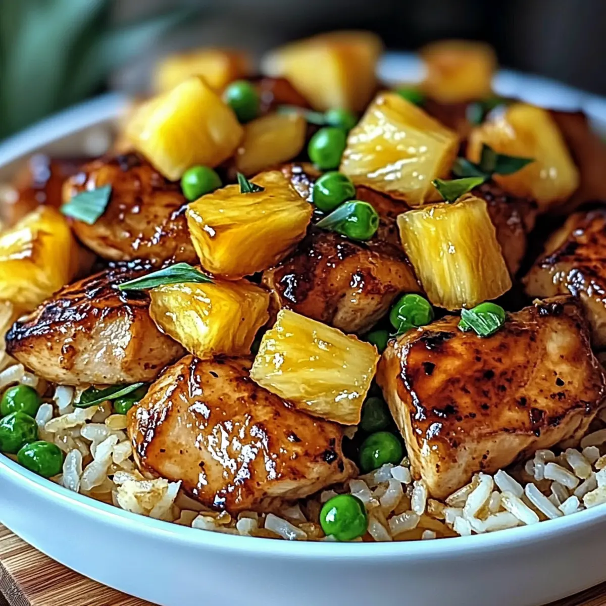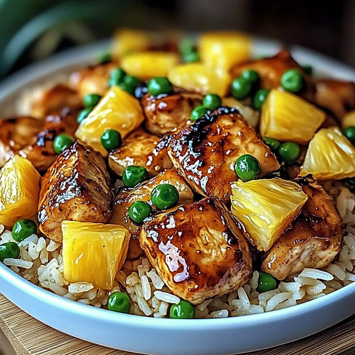 Jump to Recipe Print RecipeAs I rummaged through my pantry one busy weeknight, the contents seemed to whisper a call for something vibrant and delightful. That’s when the idea for Pineapple Chicken Rice struck me! This one-pot meal is not only a quick fix for dinner but also a celebration of sweet and savory that brings everyone to the table. Packed with tender chicken thighs, juicy pineapple, and fragrant jasmine rice, this dish transforms any mundane evening into a festive occasion. Plus, it’s family-friendly and easily adaptable to fit any dietary preference with simple swaps. Curious how to whip up this delicious creation in just one pot? Let’s dive in and make dinnertime fun again! Why is Pineapple Chicken Rice a Must-Try? Simplicity and Flavor: This vibrant dish comes together in a single pot, making cleanup a breeze and letting you focus on flavor instead of fuss. Family-Friendly Delight: The combination of sweet pineapple and savory chicken appeals to both kids and adults, ensuring a hit at family dinners. Adaptable Ingredients: With easy swaps like chicken breast or tofu, it caters to various dietary needs, reassuring every guest can enjoy the meal. Quick Preparation: In under 30 minutes, you’ll have a delicious meal ready to serve, perfect for busy weeknights when time is tight. Enhance your dinner rotation with this delightful dish, and if you’re looking for more delicious chicken options, check out Oven Baked Chicken Thighs or elevate your meals with Pineapple Adobo Chicken. Pineapple Chicken Rice Ingredients • Here’s everything you need to create this delightful dish! For the Rice Jasmine Rice – The base of the dish providing a light and fluffy texture; brown rice makes a healthier substitution. For the Chicken Boneless, Skinless Chicken Thighs – Tender and juicy, perfect for this recipe; chicken breast or tofu can be used for a lighter option. For the Sweetness and Color Pineapple – Adds a burst of sweetness; fresh pineapple elevates the flavor, but canned works in a pinch. Red Bell Pepper – Offers a pop of color and crunch; feel free to swap with any sweet pepper or snap peas. Frozen Peas – Contributes a vibrant color and protein boost; fresh peas or shelled edamame are good alternatives. For the Flavor Soy Sauce – Adds essential umami; tamari is a great gluten-free swap. Oyster Sauce – Deepens the flavor profile; vegetable oyster sauce works for vegetarian versions. Sesame Oil – Infuses a nutty aroma; olive oil is a substitute if necessary. Garlic – Enhances overall goodness; fresh is best, but garlic powder can be a quick stand-in. Fresh Ginger – Brings warmth and spice; replace with ground ginger when fresh isn’t on hand. Salt and Pepper – Fundamental seasonings; adjust to suit your taste. For Garnish Green Onions – Adds a fresh bite and vibrant color; chives can be used as an alternative. For Cooking Vegetable Oil – Used for frying; any neutral oil will suffice. Now that you have all the ingredients for the perfect Pineapple Chicken Rice, let’s move on to making this delicious meal come to life! Step‑by‑Step Instructions for Pineapple Chicken Rice Step 1: Prepare the Rice Rinse 1 cup of jasmine rice under cold water until the water runs clear, ensuring no excess starch. In a medium saucepan, combine the washed rice with 1½ cups of water and a pinch of salt. Bring to a boil, then reduce the heat to low, cover, and simmer for about 15 minutes or until the rice is tender and the water is absorbed. Step 2: Cook the Chicken In a large skillet, heat 2 tablespoons of vegetable oil over medium-high heat. Add 1 pound of boneless, skinless chicken thighs, seasoned with salt and pepper. Sear the chicken until golden brown, about 6-7 minutes per side. The chicken should be cooked through, reaching an internal temperature of 165°F. Remove and set aside to rest before slicing. Step 3: Add Aromatics In the same skillet, stir in 2 minced garlic cloves and 1 tablespoon of freshly grated ginger. Cook for approximately 1-2 minutes, stirring frequently, until the garlic is fragrant and golden, being careful not to burn it. This step lays the flavorful foundation for your Pineapple Chicken Rice. Step 4: Combine Vegetables Next, add 1 diced red bell pepper and 1 cup of frozen peas to the skillet. Stir everything together and sauté for about 3-4 minutes until the bell pepper is vibrant and just tender, retaining some crunch. This colorful mixture will enhance the dish and introduce a fresh texture. Step 5: Incorporate Pineapple Gently fold in 1 cup of diced pineapple, making sure to mix it through carefully. Cook for an additional 1-2 minutes until the pineapple warms up slightly and infuses its sweetness into the mixture. This step ensures that those sweet flavors meld beautifully with the savory components of your Pineapple Chicken Rice. Step 6: Create the Sauce In a small bowl, whisk together 3 tablespoons of soy sauce, 2 tablespoons of oyster sauce, and 1 tablespoon of sesame oil. Pour the sauce over the chicken and vegetable mixture in the skillet, stirring to evenly coat the ingredients. Allow it to simmer for about 2 minutes to let all the flavors combine perfectly. Step 7: Combine Rice and Chicken Mixture Once the sauce has coated everything, carefully add the cooked jasmine rice to the skillet. Use a spatula to fold the rice into the mixture, ensuring it’s well-coated without breaking the grains. Cook for another 2-3 minutes, allowing the rice to absorb the vibrant flavors of the Pineapple Chicken Rice. Step 8: Final Touches Remove the skillet from the heat, and garnish with chopped green onions for a fresh burst of flavor. Serve your Pineapple Chicken Rice hot and enjoy a delightful balance of sweet and savory tastes that will bring everyone to the table! How to Store and Freeze Pineapple Chicken Rice Fridge: Store leftovers in an airtight container for up to 3 days. This keeps your Pineapple Chicken Rice fresh and ready for a qu