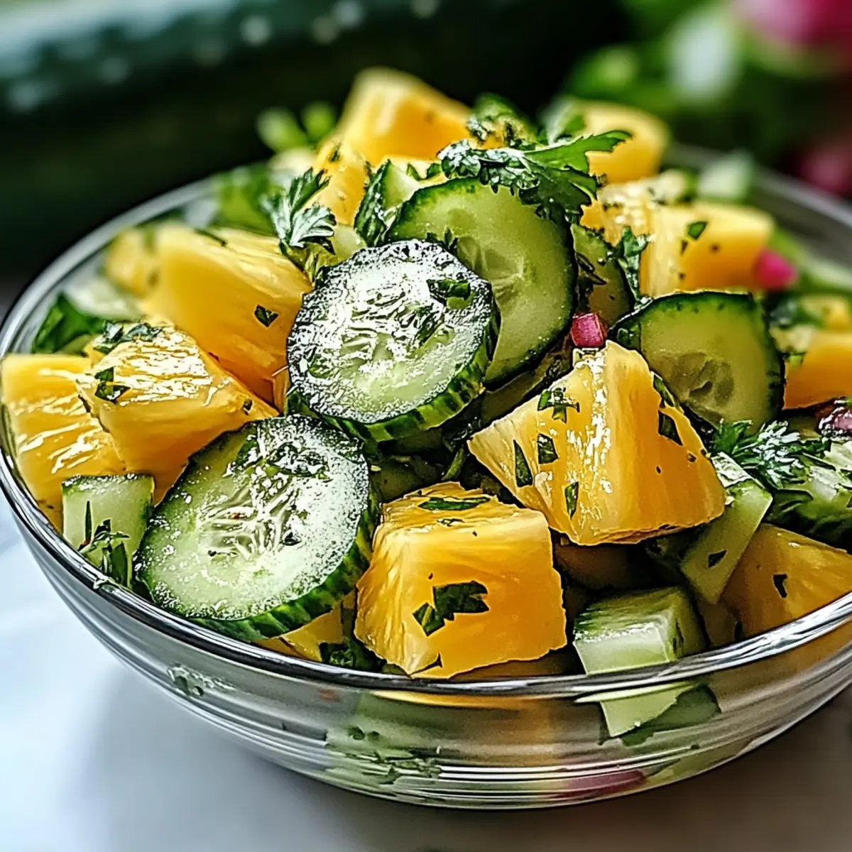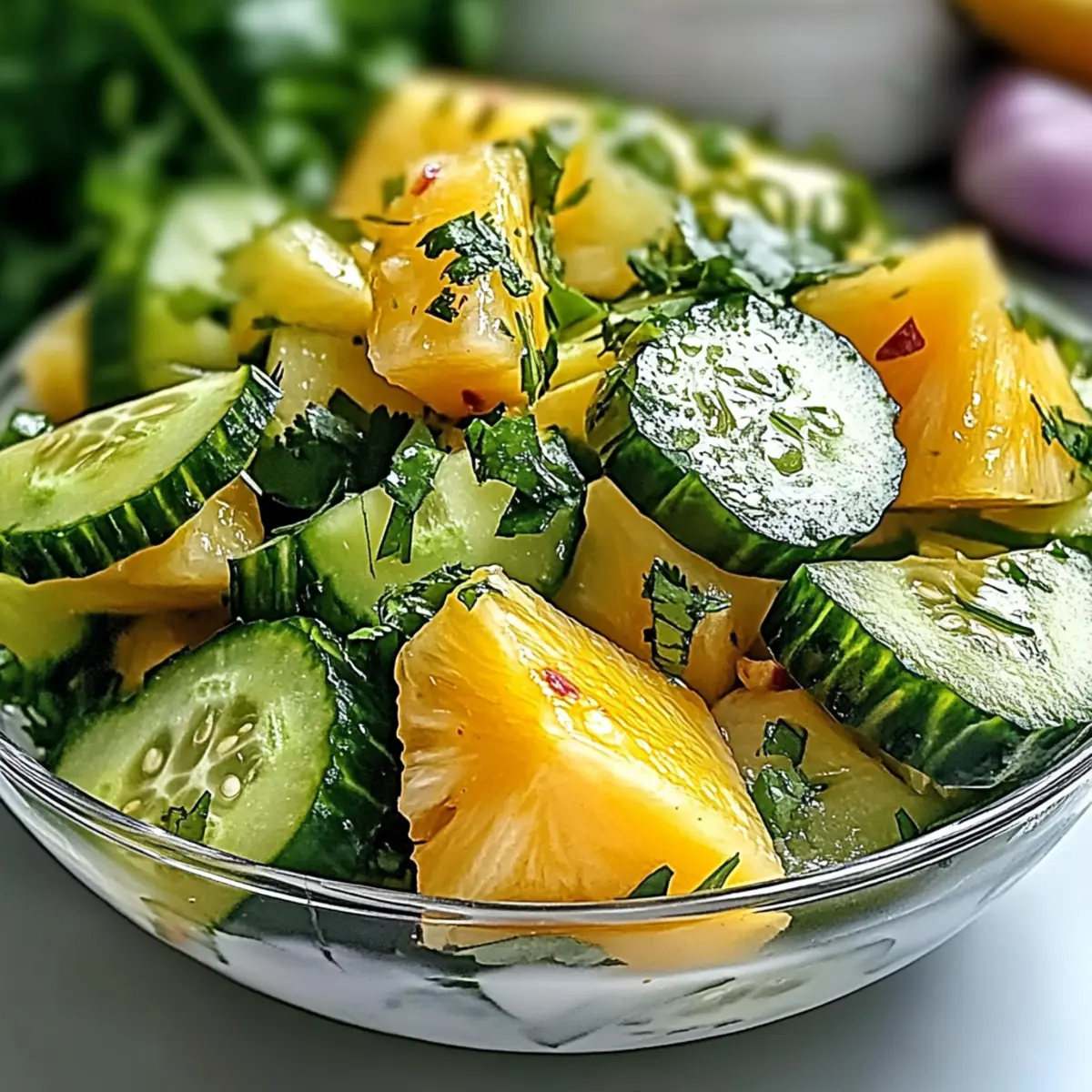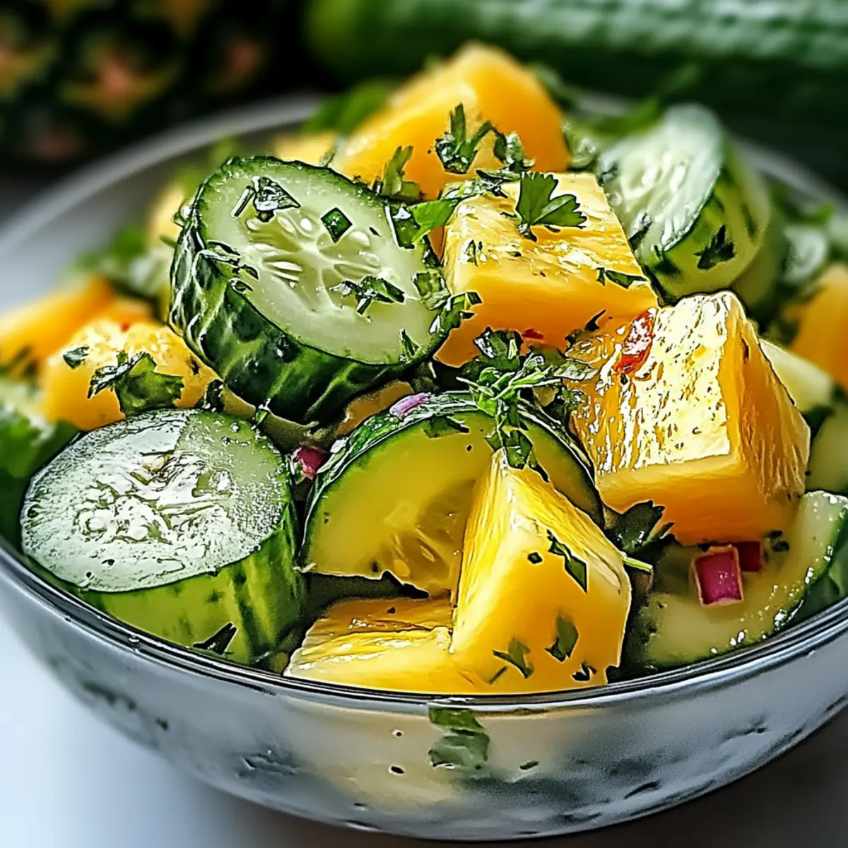 Jump to Recipe Print RecipeAs the warm sun kisses your skin and the sound of laughter fills the air, there’s nothing quite like a taste of paradise to elevate your summer days. Enter the Tropical Pineapple Cucumber Salad, where the vibrant colors and enticing flavors create a refreshing escape from the mundane. This delightful dish not only showcases juicy pineapple and crisp cucumber, but it’s also a quick, healthy option that fits perfectly into your busy lifestyle. Whether you’re prepping for a picnic or looking for a light post-workout treat, this salad is a guilt-free pleasure that packs a punch of nutrients. Curious about how a hint of chili-lime dressing can transform your fresh ingredients into a tropical feast? Let’s dive in! Why is Pineapple Cucumber Salad a Must-Try? Freshness at Your Fingertips: This salad combines juicy pineapple and crisp cucumber, providing an invigorating taste that’s perfect for hot days. Quick to Make: With minimal prep time, you can whip this up in minutes, making it a fabulous choice for impromptu gatherings or healthy snacks. Nutrient Powerhouse: Packed with vitamins and low in calories, this salad supports your wellness goals while satisfying your taste buds. Endless Customization: Feel free to toss in avocado for creaminess or switch it up with mango for added sweetness—this dish adapts to your cravings! Perfect Partnership: Pair it with grilled chicken or seafood for a delightful summer meal, or enjoy it solo as a refreshing snack, just like in a Cucumber Strawberry Salad or Thai Chicken Salad. Pineapple Cucumber Salad Ingredients • Discover the fresh components that bring your salad to life! For the Salad Fresh Pineapple – Provides natural sweetness and tropical flavor; optional canned pineapple in juice can save time. Cucumber – Adds refreshing crunch and hydration; zucchini is a great substitute if you want a different flavor profile. Red Onion – Contributes mild sharpness balancing sweetness; green onions can be used for a milder taste. For the Dressing Chili Powder – Adds heat and a hint of smokiness; consider cayenne for an extra kick. Lime Juice – Provides acidity to brighten flavors; lemon juice is an alternative if lime is not available. Honey or Maple Syrup – Enhances overall sweetness; switch to maple syrup for a vegan option. Salt – Balances and enhances the flavors beautifully. For Garnish (Optional) Fresh Cilantro or Mint – Adds a fragrant herbal finish; feel free to omit or replace with parsley if preferred. Indulge in the vibrant, refreshing experience of this Pineapple Cucumber Salad, perfect for your summer gatherings! Step‑by‑Step Instructions for Pineapple Cucumber Salad Step 1: Combine Ingredients In a large mixing bowl, add 2 cups of diced fresh pineapple, 1 cup of sliced cucumber, and ½ cup of finely chopped red onion. Gently toss the ingredients together using a spatula until they’re evenly mixed. You should notice the vibrant colors and sweet scents starting to blend, creating a tantalizing foundation for your Pineapple Cucumber Salad. Step 2: Prepare Dressing In a small bowl, whisk together 1 teaspoon of chili powder, the juice of 1 lime, 1 tablespoon of honey (or maple syrup), and a pinch of salt. Make sure the mixture is smooth and well-combined, with no lumps. This zesty dressing will beautifully elevate the flavors of your salad, promising that refreshing kick every bite deserves. Step 3: Dress the Salad Pour the prepared dressing over the salad mixture in the large bowl. Using your spatula, gently toss the ingredients to ensure everything is well-coated in the zesty dressing. You should see the bright colors of the pineapple and cucumber glistening with the flavorful dressing, promising a delicious bite of your Pineapple Cucumber Salad. Step 4: Let it Rest Cover the bowl with plastic wrap and let the salad sit for about 10-15 minutes at room temperature. This short rest period allows the flavors to meld beautifully, enhancing the taste of the salad as the sweetness of the pineapple mingles with the zesty dressing. You’ll notice the aromas filling the air, beckoning you to dig in. Step 5: Garnish and Serve Just before serving, sprinkle freshly chopped cilantro or mint over the top of the salad for a pop of herbal freshness. After garnishing, present the Pineapple Cucumber Salad in a colorful serving bowl, allowing the bright hues to shine through. This final touch adds both visual appeal and an aromatic finish, making your dish even more inviting. Make Ahead Options These Tropical Pineapple Cucumber Salad preparations are a fantastic way for busy cooks to save time during hectic weeknights! You can dice the fresh pineapple, slice the cucumber, and chop the red onion up to 24 hours in advance, storing them in airtight containers in the refrigerator to maintain their crispness. Additionally, the chili-lime dressing can be made ahead and stored for up to 5 days; just remember to shake or whisk it well before dressing your salad. When you’re ready to serve, simply combine the prepped ingredients with the dressing and let it rest for about 10-15 minutes for the flavors to meld beautifully. This simple approach ensures your Pineapple Cucumber Salad is just as delicious while giving you the gift of time! What to Serve with Tropical Pineapple Cucumber Salad? Elevate your summer meals with delightful pairings that complement the fresh, vibrant flavors of this tropical salad. Grilled Chicken: Juicy and smoky, grilled chicken adds protein to balance the salad’s refreshing taste. Shrimp Tacos: The spiciness of shrimp tacos pairs wonderfully, turning your meal into a festive flavor fiesta. Quinoa: Nutty and hearty, quinoa brings a satisfying texture that complements the crispness of the salad. Avocado Toast: Creamy avocado spread on warm toast creates a comforting contrast to the crunchy salad. Mango Salsa: Sweet and tangy, mango salsa echoes the salad’s tropical notes, creating a vibra