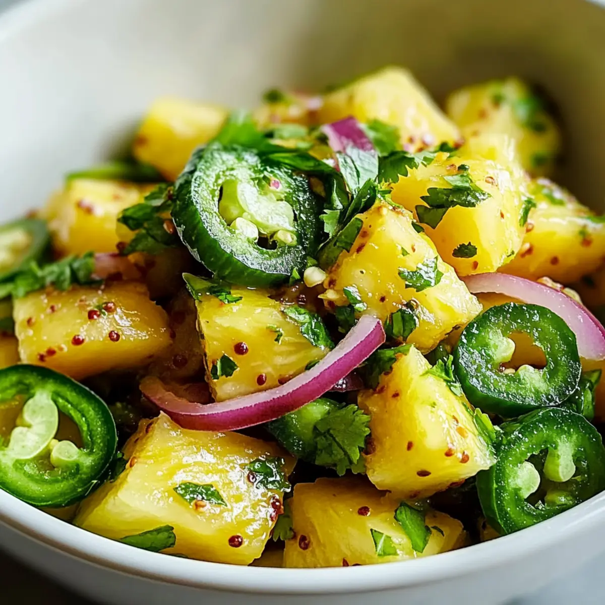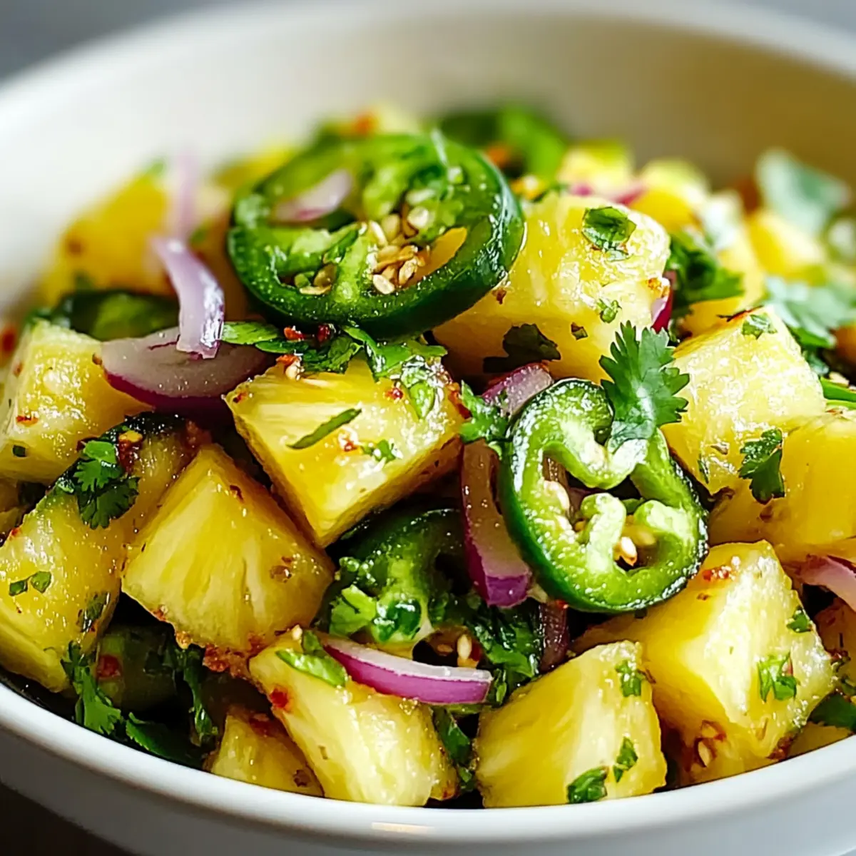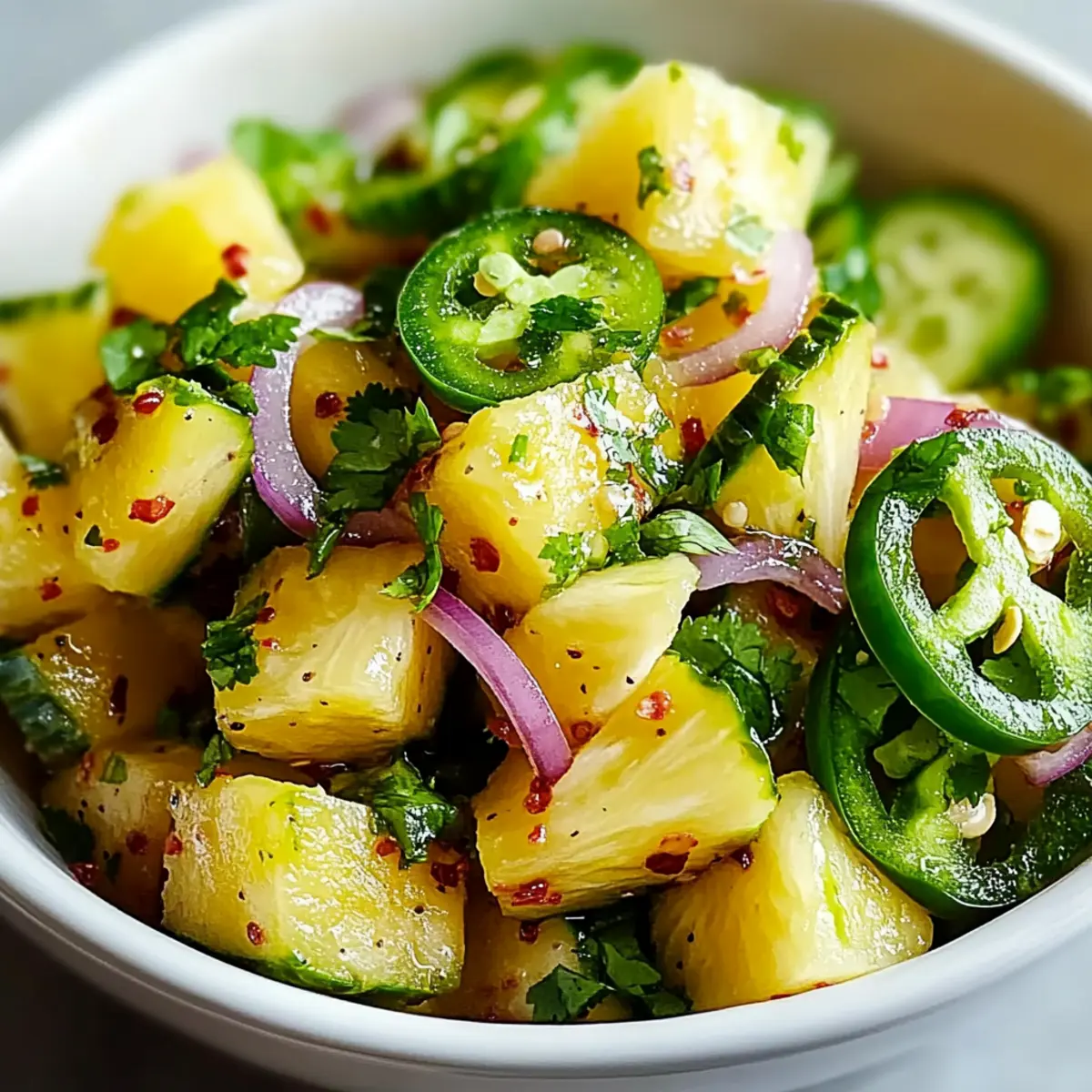 Jump to Recipe Print RecipeThe first bite of this Pineapple Cucumber Salad immediately transports me to sunshine and ocean breezes, making it the perfect companion for warm days and lively gatherings. Crisp cucumbers and juicy pineapple collide in this vibrant dish, perfectly balanced with a zesty lime dressing that awakens the senses. In just 15 minutes, you can whip up a colorful, gluten-free, and dairy-free side that not only complements your meals but also stands out on its own. With its quick prep time and an irresistible combination of sweetness and spice, this salad is ideal for everything—from casual lunches to festive barbecues. Ready to discover how to elevate your next meal with this refreshing blend? Let’s dive in! Why is this salad a must-try? Refreshing, this Pineapple Cucumber Salad is the perfect antidote to a hot day, combining juicy pineapple with crisp cucumber for a delightful crunch. Quick prep means you can have a stunning side dish ready in just 15 minutes! Versatile and healthy, it easily complements grilled chicken or seafood, making it ideal for any meal. Easily customizable, swap in other flavors like mint or add avocado for extra creaminess. For even more exciting sides, consider pairing it with a light Cucumber Strawberry Salad or a hearty Chickpea Salad Grilled. Each bite bursts with vibrant flavor, making it a crowd-pleaser sure to impress guests! Pineapple Cucumber Salad Ingredients • Here’s what you need for a vibrant dish! For the Salad Fresh Pineapple – Provides the main sweetness and juiciness; opt for a ripe one for the best flavor. English Cucumber – Adds a refreshing, crisp texture; choose this variety for fewer seeds and less bitterness. Red Onion – Brings sharpness and depth to the dish; green onions can be used for a milder flavor. Jalapeño – Adds just the right amount of heat; adjust to your spice preference by removing seeds for less kick. Fresh Cilantro – Introduces a bright herbal note that complements the salad; fresh mint can be a refreshing alternative. For the Dressing Fresh Lime Juice – The zesty base of the vinaigrette; freshly squeezed is ideal for bright flavor. Olive Oil – Adds richness; using extra virgin offers superior taste. Honey or Agave Nectar – Balances the acidity with a hint of sweetness; adjust based on taste, or omit for a sugar-free version. Salt and Pepper – Essential for flavor enhancement; season according to your palate. Dive into this deliciously refreshing Pineapple Cucumber Salad and enjoy a delightful taste experience today! Step‑by‑Step Instructions for Pineapple Cucumber Salad Step 1: Prepare the Salad Ingredients In a large mixing bowl, combine 2 cups of diced pineapple, 1 large English cucumber (sliced), ¼ cup of finely chopped red onion, 1 minced jalapeño (adjust for spice), and ¼ cup of freshly chopped cilantro. Gather all ingredients beforehand for a smooth prep process. The vibrant colors of the pineapple and cucumber should invite you into the refreshing world of this Pineapple Cucumber Salad. Step 2: Make the Dressing In a small bowl, whisk together the juice of 2 fresh limes, 3 tablespoons of extra virgin olive oil, and 1 tablespoon of honey or agave nectar. Add a pinch of salt and freshly ground black pepper to taste. The dressing should be well-combined and slightly thickened, providing a zesty backdrop that enhances the salad’s flavors. Step 3: Toss the Salad with Dressing Pour the prepared dressing over the pineapple and cucumber mixture in the large bowl. Gently toss the salad with a spatula or large spoon until every piece is evenly coated with dressing. You’ll notice the juicy pineapple and crunchy cucumber glistening with the dressing, creating an inviting and colorful Pineapple Cucumber Salad. Step 4: Chill Before Serving To enhance the delicious flavors, cover the salad and refrigerate for at least 15 minutes before serving. This resting time allows the vibrant ingredients to meld, resulting in a refreshing burst of taste. The salad should be cold and slightly marinated, making every bite an enjoyable experience. Step 5: Serve and Enjoy Once chilled, serve the Pineapple Cucumber Salad as a delightful side dish alongside grilled meats or as a light standalone appetizer. Enjoy the luscious combination of sweet, spicy, and zesty notes as enticing flavors come together, brightening up your meal. Expert Tips for Pineapple Cucumber Salad Ripeness Check: Use a ripe pineapple for optimal flavor; it should feel slightly soft to the touch and have a sweet aroma at the base. Texture Preservation: Chop salad ingredients and store them separately if preparing in advance. Combine and dress just before serving to keep cucumbers crisp. Adjust Spice Level: If you prefer a milder taste, remove all seeds and membranes from the jalapeño. For spice lovers, add some seeds back for an electric kick. Flavor Boost: Enhance the dressing by adding a pinch of cumin or a splash of orange juice for a unique twist on the classic lime vinaigrette. Mix and Match: Feel free to experiment with other ingredients! Mixing in avocado or bell peppers introduces new textures and flavors to your Pineapple Cucumber Salad. Serving Suggestions: Pair this refreshing salad with grilled seafood or chicken for a delightful meal. It also makes an excellent, light snack on its own! How to Store and Freeze Pineapple Cucumber Salad Room Temperature: To keep your salad fresh, it’s best to serve it immediately after preparation. If left out, consume within 2 hours to maintain its flavor and texture. Fridge: Store any leftovers in an airtight container in the refrigerator for up to 2 days. Note that cucumbers may release water, but the salad’s flavor will remain delicious. Freezer: It’s not recommended to freeze the Pineapple Cucumber Salad, as the texture of cucumbers and pineapple may become mushy upon thawing. Reheating: This salad is best enjoyed cold. If you want to refresh it before serving, simpl