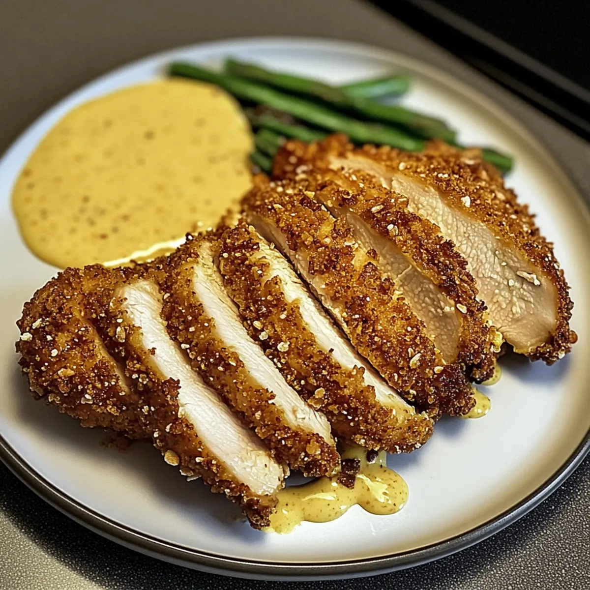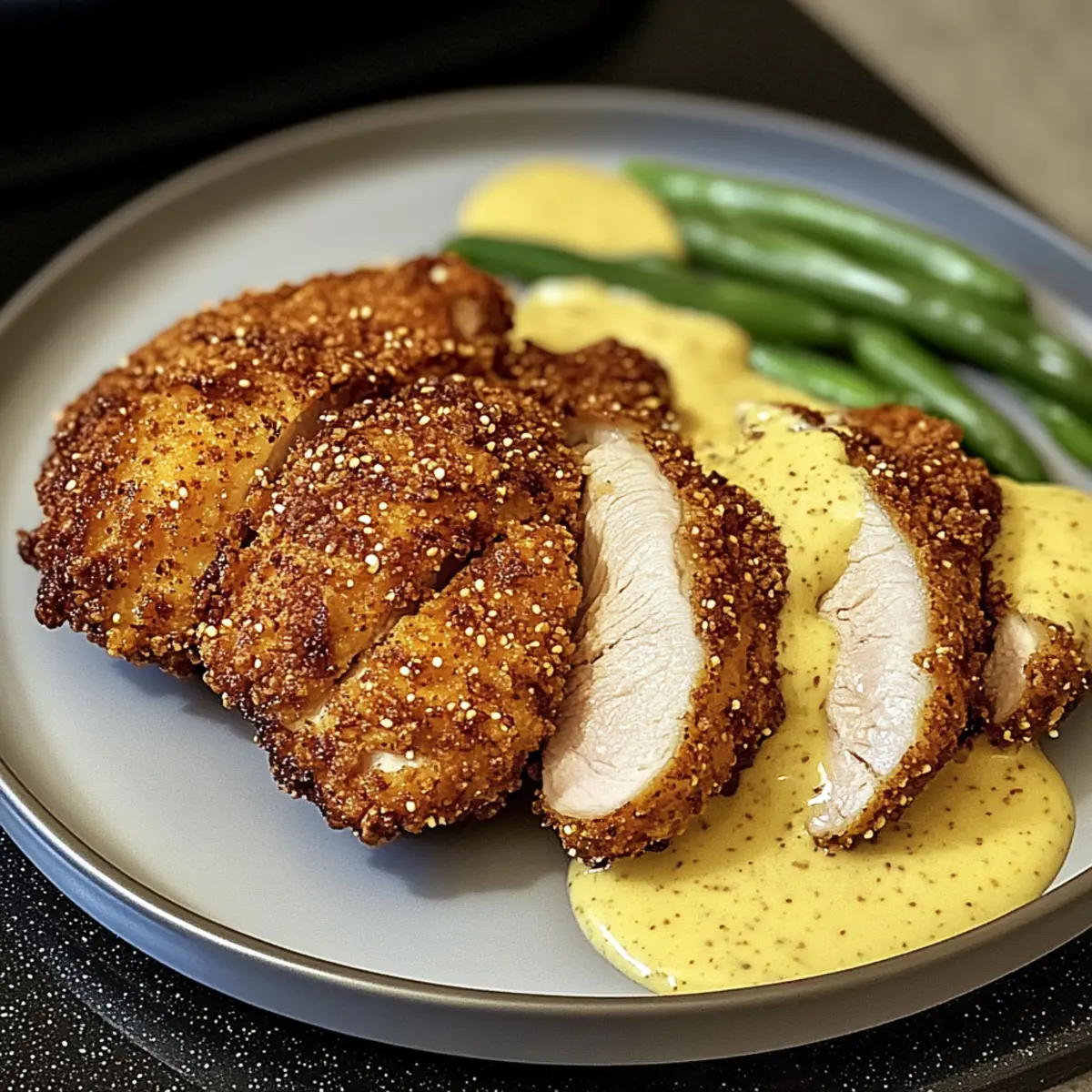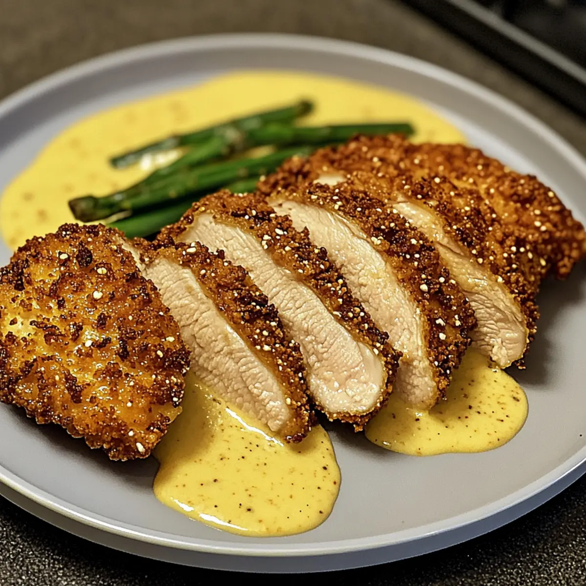 Enjoy a gourmet experience with Crispy Pretzel Crusted Chicken with Cheddar Mustard Sauce, perfect for busy nights.