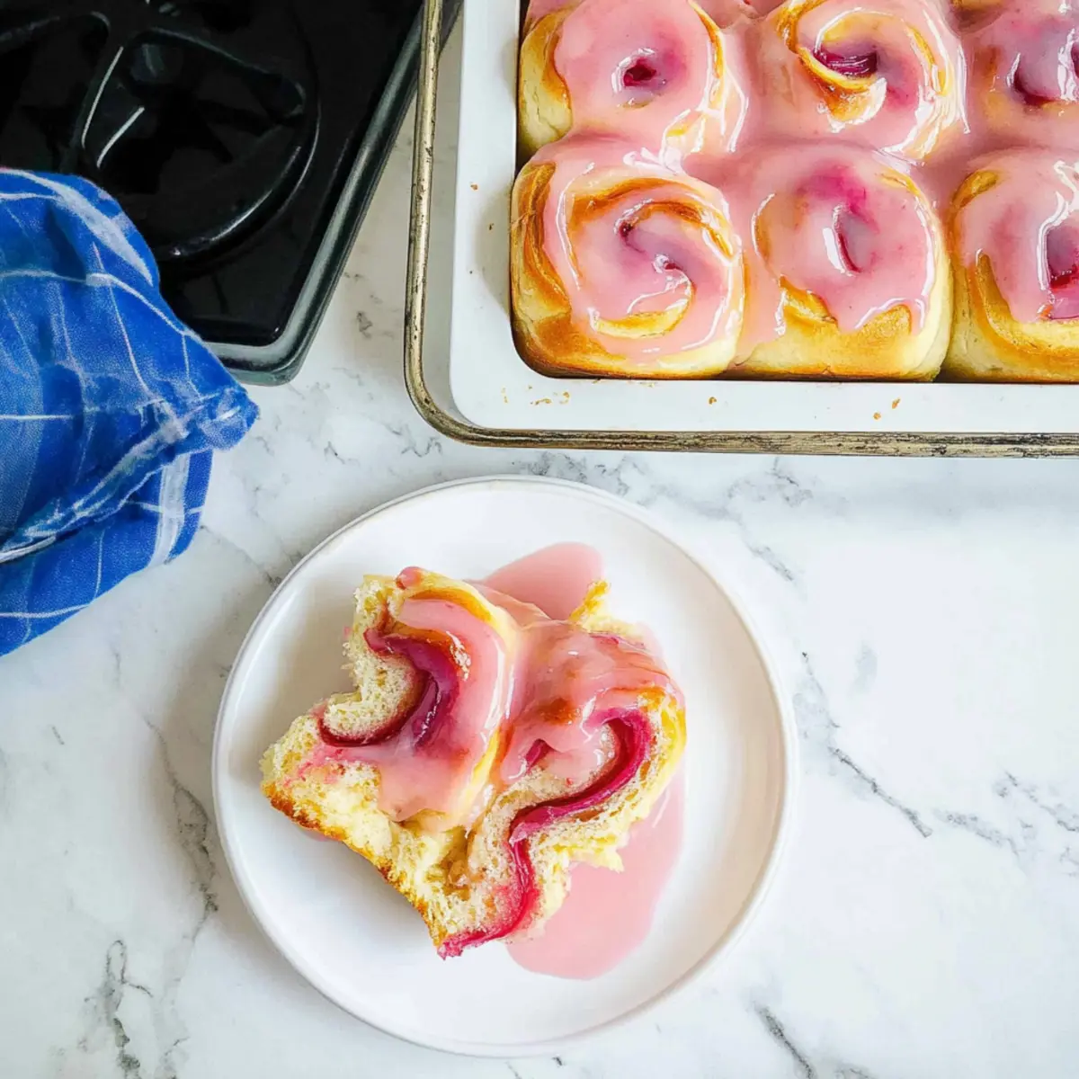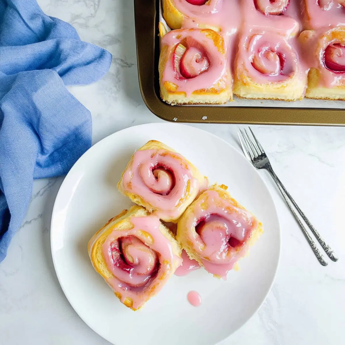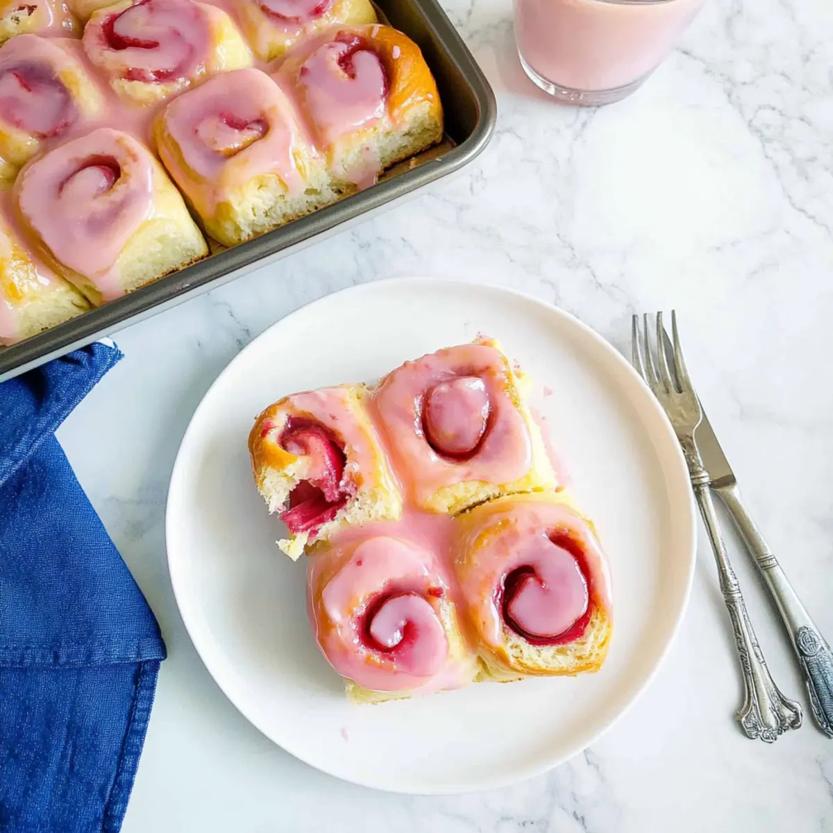 Jump to Recipe Print RecipeAs the rich aroma of freshly baked bread wafts through my kitchen, I can’t help but feel a rush of excitement as I prepare to share my delicious Tart Rhubarb Rolls with Pink Glaze. These rolls are a beautiful blend of sweet and tart, featuring a fluffy, pillowy texture that’s simply irresistible. Perfect for those cozy mornings or delightful gatherings, they offer a unique twist on traditional rolls by celebrating the often-overlooked rhubarb. With just a bit of patience, you can create these delightful treats that not only look stunning but also serve as a healthier alternative to store-bought pastries. Ready to embark on a baking adventure? Trust me, your taste buds will thank you! Why Are Rhubarb Rolls So Special? Delightful Combination: These tart rhubarb rolls combine sweet, pillowy dough with a unique filling that surprises and delights the palate. Beautiful Glaze: The pink glaze not only adds a pop of color but also a refreshing sweetness that perfectly balances the tangy filling. Perfect for Sharing: Great as a brunch option, these rolls are sure to impress friends and family, making any gathering feel special. Simple Ingredients: With common pantry items, whipping up these rolls is a breeze, so you can skip the drive-thru and enjoy homemade goodness! Versatile Treat: You can easily experiment by swapping in different fruits or spices, giving you endless ways to enjoy these rolls. If you’re in the mood for more creative baking, check out my tasty Raspberry Cinnamon Rolls or my quick 4-Ingredient Chocolate Oat Cookies! Rhubarb Rolls Ingredients For the Dough • Whole Milk – Provides moisture and richness; substitute with any dairy or non-dairy milk. • Unsalted Butter – Adds richness and flavor; use margarine as a non-dairy alternative. • Instant Yeast – Critical for dough rise, but you can use active dry yeast with slight adjustments. • Granulated Sugar – Sweetens the dough and filling; can be replaced with honey or maple syrup (adjust quantity). • Large Egg – Contributes to the dough’s structure and richness; use a flaxseed or chia egg for an egg-free version. • Salt – Essential for balancing sweetness and enhancing flavor, plus it helps yeast activity. • All-Purpose Flour – Provides structure to the rolls; mix in whole wheat flour for added nutrition. For the Filling • Sliced Rhubarb – The star ingredient adding tartness; can be replaced with other tart fruits like sour cherries. • Lemon Juice – Adds acidity to balance flavors; crucial for both the filling and the glaze. • Cornstarch – Thickens filling to a jam-like consistency; all-purpose flour can be used if cornstarch is unavailable. For the Glaze • Powdered Sugar – Sweetens and thickens the glaze; reduce the quantity for a less sweet option. These delightful Rhubarb Rolls are a treat that will surely brighten your day! Step‑by‑Step Instructions for Rhubarb Rolls Step 1: Dough Preparation Start by warming 1 cup of whole milk and 4 tablespoons of unsalted butter in a saucepan over medium heat until the butter melts, about 3-5 minutes. Remove from heat and let cool until warm (about 110°F). Sprinkle in 2 teaspoons of instant yeast and 2 tablespoons of granulated sugar, stirring lightly. After 5 minutes, whisk in 1 large egg, then mix in 4 cups of all-purpose flour and 1 teaspoon of salt until a soft dough forms. Step 2: Knead the Dough Transfer the dough onto a lightly floured surface and knead for about 8-10 minutes until it becomes smooth and elastic. You’ll know it’s ready when it’s soft to the touch and springs back when poked gently. Shape the dough into a ball and place it in a greased bowl, covering it with a clean kitchen towel. Allow it to rise in a warm space until doubled in size, approximately 1 to 1.5 hours. Step 3: Filling Preparation While the dough rises, prepare the rhubarb filling. In a medium saucepan, combine 2 cups of sliced rhubarb, 1 cup of granulated sugar, 2 tablespoons of lemon juice, and 2 tablespoons of cornstarch. Cook over medium heat, stirring frequently, until the rhubarb breaks down and the mixture thickens into a jam-like consistency, about 10 minutes. Remove from heat and let it cool. Step 4: Roll and Assemble Once the dough has risen, punch it down and roll it out on a floured surface into a rectangle about ¼ inch thick. Spread the cooled rhubarb filling evenly over the dough. Starting from one long edge, roll the dough tightly into a log. Cut the log into 12 equal pieces and place them cut-side up in a greased baking pan, leaving space between each roll. Step 5: Second Rise Cover the pan with a kitchen towel and let the rolls rise again in a warm place for about 30-45 minutes. They should puff up significantly and look soft and pillowy. This step ensures your Rhubarb Rolls will be light and airy when baked. Step 6: Baking Preheat your oven to 350°F (175°C). Once the rolls have risen, gently brush the tops with an egg wash made from one beaten egg and a splash of water. Bake in the preheated oven for 25-30 minutes until golden brown and fragrant. A toothpick should come out clean from the center. Step 7: Glazing While the rolls are still warm, prepare the glaze by mixing 1 cup of powdered sugar with reserved rhubarb filling and 1 tablespoon of lemon juice until smooth. Drizzle the glaze over the warm Rhubarb Rolls, allowing it to soak in for a lovely sweet-tart finish. Serve warm and enjoy! What to Serve with Tart Rhubarb Rolls Imagine a cozy gathering with friends, where the sweet-tart aroma of freshly baked rolls fills the air, inviting everyone to the table. Fresh Fruit Salad: A medley of seasonal fruits adds a refreshing, bright contrast to the sweet rolls, enhancing the overall experience. Nutty Granola: Crunchy homemade granola brings a delightful texture that complements the soft, fluffy rolls while providing an energizing start to your day. Creamy Yogurt: A dollop of thick Greek yogurt provide