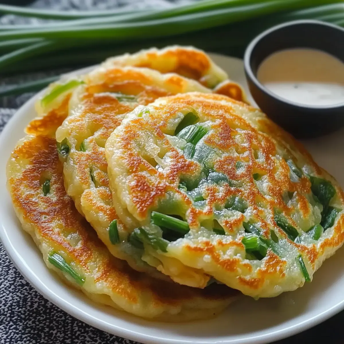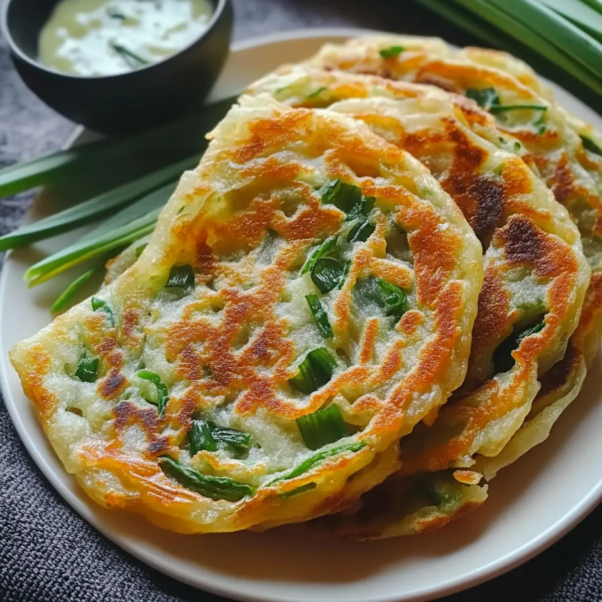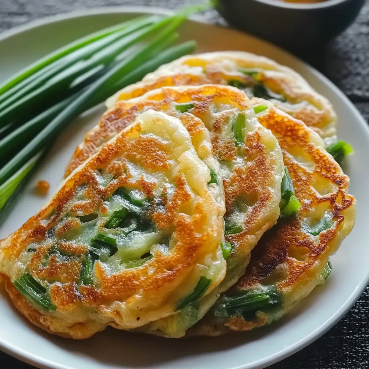 Jump to Recipe Print RecipeThe sizzling sound of pancakes crisping in a hot pan is music to my ears, a reminder of cozy kitchen moments that bring people together. Today, I’m excited to share my delightful recipe for Rice Paper Scallion Pancakes, a quick and gluten-free snack that you can whip up in no time! These pancakes are not only incredibly easy to make but also customizable to suit your taste—whether you want to load them up with fresh veggies, tuck in some savory seafood, or keep it simple and vegetarian. With their delightful texture and versatility, they’re the perfect choice for a party appetizer or a satisfying snack at home. What fillings will you choose to make your own version of this culinary delight? Why are Rice Paper Scallion Pancakes so special? Crispy Delight: The texture of these pancakes is a delightful contrast—crispy on the outside, and soft, chewy inside! Customize It: With endless filling options, from veggies to seafood, each batch can be uniquely yours. Quick Prep: Whip them up in no time—perfect for busy weeknights or last-minute entertaining. Gluten-Free Goodness: Made with rice paper, they’re a delicious option for those following a gluten-free or vegetarian diet. Great for Sharing: Serve them as appetizers at your next gathering, and watch your friends devour every bite. Try pairing them with a zesty dipping sauce for an irresistible flavor boost! Looking for more ideas? Check out my recipes for Fried Rice Savor or Kimchi Rice Fritters for a tasty meal or snack! Rice Paper Scallion Pancakes Ingredients • For the Pancake Base Rice Paper Sheets – Essential for forming the pancakes, adjust the number of sheets based on your preferred thickness. Eggs – Acts as a binding agent; for a vegan option, mix cornstarch with water instead. Cooking Oil – Used for pan-frying; aim for a neutral oil such as vegetable or canola for the best results. • For the Filling Scallions – Adds a fresh, savory flavor; you can substitute with garlic chives or leeks if needed. Salt – Enhances the overall flavor; opt for kosher or sea salt for a more refined taste. White Pepper – Offers a subtle hint of heat; feel free to use regular black pepper as a substitute. Sesame Oil – Provides a rich, nutty aroma; if unavailable, you can replace it with other cooking oils. • For the Dipping Sauce Soy Sauce – Contributes a delicious umami flavor; use tamari to keep it gluten-free. Rice Vinegar – Adds a delightful tanginess; apple cider vinegar can also be a suitable alternative. Chili Oil – Brings a punch of heat and flavor; adjust the amount based on your spice preference. These Rice Paper Scallion Pancakes are not just tasty but also incredibly versatile—perfect for fitting your personal culinary style! Enjoy the journey of crafting your unique variation! Step‑by‑Step Instructions for Rice Paper Scallion Pancakes Step 1: Prepare Filling In a mixing bowl, combine chopped scallions, salt, white pepper, and sesame oil. Mix well until the scallions are evenly coated and the flavors meld together. The aroma should be enticing! Set this filling aside as you continue with the preparation. Step 2: Prep Rice Paper Lay two sheets of rice paper on a clean, flat surface, slightly overlapping them to create a sturdy base. Brush the overlapping areas with beaten egg to ensure they stick together. This will help prevent tearing during the assembly of your Rice Paper Scallion Pancakes. Step 3: Assemble Pancakes Spread the scallion filling evenly over the rice paper sheets, covering them generously for flavor. Carefully roll the sheets from one end to the other, tightly shaping them into a log. Twist the ends to seal your pancakes, ensuring the filling is secure for frying. Step 4: Pan-fry Heat a tablespoon of cooking oil in a non-stick skillet over medium heat. Once hot, gently place the rolled pancakes into the pan. Fry them for about 2 minutes per side, or until they turn golden brown and develop a crispy exterior. Keep an eye on them to avoid burning! Step 5: Make Dipping Sauce In a small bowl, whisk together soy sauce, rice vinegar, and chili oil until well combined. Taste your sauce and adjust as needed—add more chili oil for a spicier kick or more vinegar for tanginess. This zesty dipping sauce will perfectly complement your Rice Paper Scallion Pancakes. Step 6: Serve Once the pancakes are crisp and golden, remove them from the skillet and place them on a paper towel to absorb excess oil. Cut them into manageable slices and serve hot with the prepared dipping sauce. Enjoy the delightful crunch and savor every bite of these Rice Paper Scallion Pancakes! Rice Paper Scallion Pancakes: Variations & Substitutions Feel free to unleash your creativity in the kitchen with these delightful pancake twists that are sure to brighten your snacking experience! Herb-Infused: Add finely chopped herbs like cilantro or dill for a fresh twist. The aromatic notes will elevate your pancakes and bring a burst of flavor in each bite. Veggie Boost: Incorporate shredded vegetables, such as bell peppers or carrots, into the filling. Not only do they add color, but they’ll also give a delightful crunch to every mouthful. Vegan Delight: Replace eggs with a mixture of cornstarch and water for a plant-based option. This swap retains the texture and ensures everyone can enjoy a crispy treat! Spicy Kick: Include red pepper flakes or a splash of sriracha in the filling for added heat. Spice lovers will adore the extra punch in flavor that makes every bite exciting. Seafood Twist: Add cooked shrimp or crab meat for a sumptuous variation. This addition transforms the pancakes into a seafood lover’s delight, perfect for elevating your appetizer game. Cheesy Variation: Sprinkle shredded cheese into the filling before rolling. As it melts, it creates a gooey, savory center that complements the crispy rice paper beautifully. Nutty Surprise: Drizzle with sesame oil or sprinkle crushed peanuts b